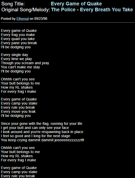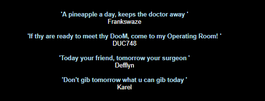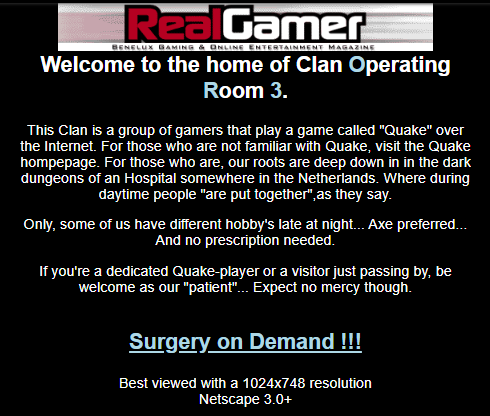 “This Clan is a group of gamers that play a game called ‘Quake’ over the Internet. For those who are not familiar with Quake, visit the Quake homepage. For those who are, our roots are deep down in in the dark dungeons of an Hospital somewhere in the Netherlands. Where during daytime people ‘are put together,’ as they say. Only, some of us have different hobby’s late at night… Axe preferred… And no prescription needed. If you’re a dedicated Quake-player or a visitor just passing by, be welcome as our ‘patient’… Expect no mercy though.”