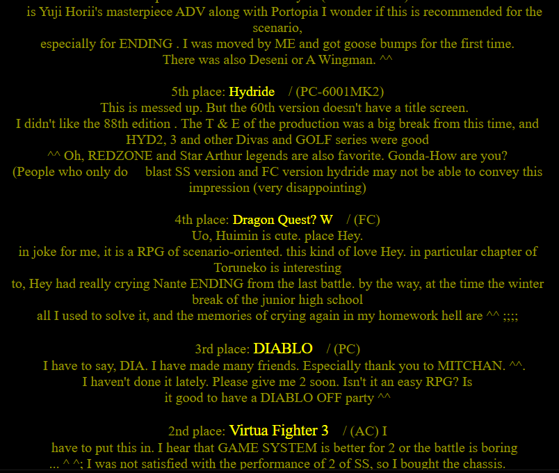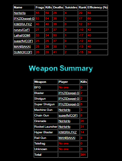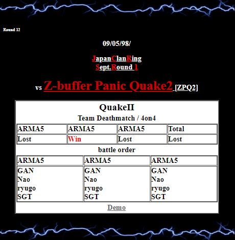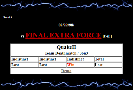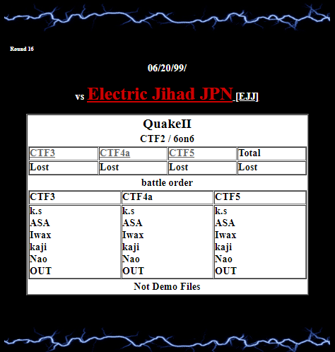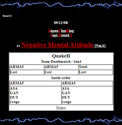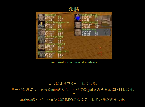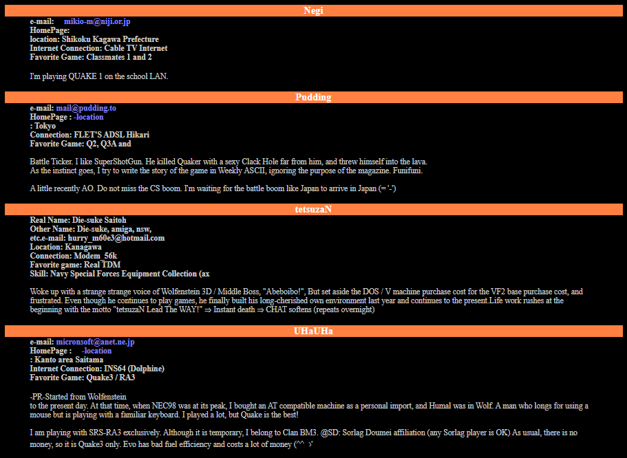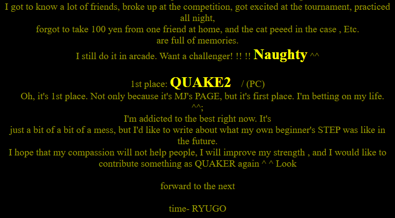From the diary of Aruichi. “Title” I miss the recent status of the NQ1 server. ........................This word is exhausted. “I do not do that! I’m always! EXA not put something’s full!” . ..surely. ..Both EXA and OZSW are still thriving. .. But I’m lonely, I’m missing something , so I’m missing something. ..!! ...!! That’s it! It’s crap! There is no wig! Those hot people! !! !! !! There is no “yatsura” who has been active since the early days of QUAKE and has always raised the QUAKE scene! Majin, caveman, AP9, waist, MRC, FeF, excitement, free strong people, etc. .. The strong men who line up like a star. ...Wow, it’s hot! It was hot! It was so hot as to burn! A hot battle where the spirit is transmitted even within the server! (Although it was an eagle but it is still a tiny fish (^^)) “It’s still hot! Everybody’s fighting hot every night!” Sure, yes, NQ is still hot, but I affirm! NQ was even hotter then! was fun! !! On the Web, QUAKE theory was unfolding every night, and there were fierce men who were willing to spend money to win QUAKE. Today, the world is excited by Q2 and UO. ..Is it the flow of the times? .. The feeling of DOOMR at the time of migrating from DOOM to QUAKE was probably like this. .. It may be a stray firefly. ..But fight as long as there is an NQ1 server! Dreaming of the return of that hot battle. .. “End”