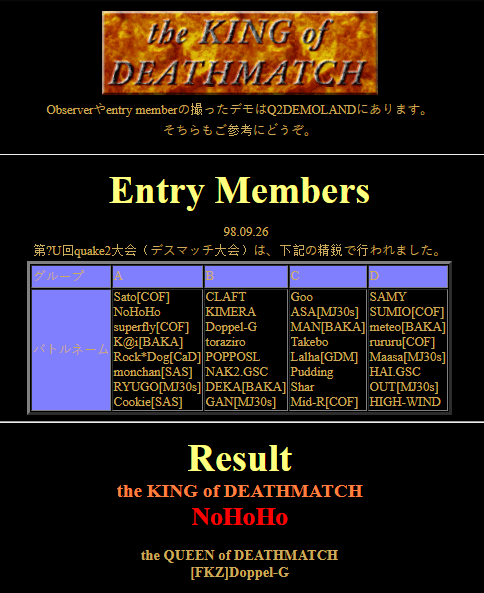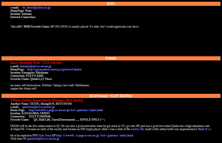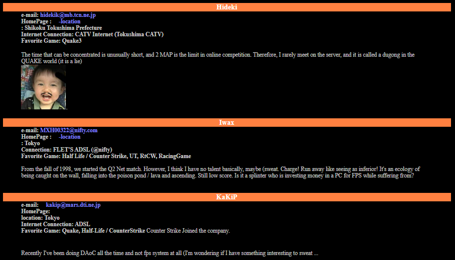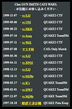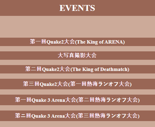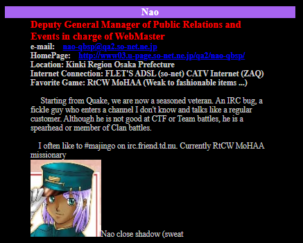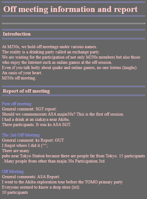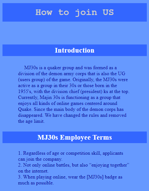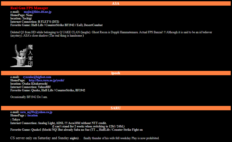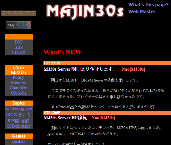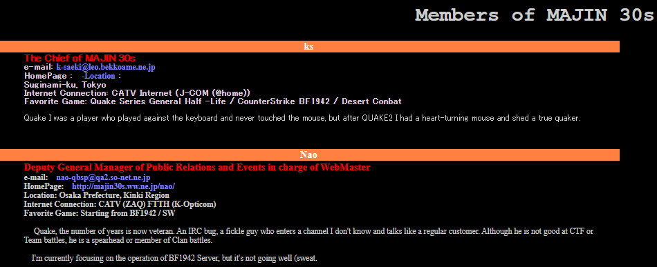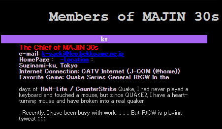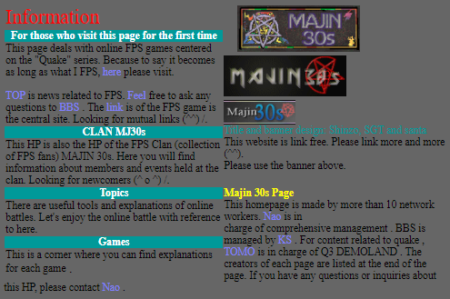 “This page deals with online FPS games centered on the ‘Quake’ series. This HP is also the HP of the FPS Clan (collection of FPS fans) MAJIN 30s. Here you will find information about members and events held at the clan. Looking for newcomers (^ o ^) /. Majin 30s homepage is made by more than 10 network workers. Nao is in charge of comprehensive management. BBS is managed by KS. For content related to quake, TOMO is in charge of Q3 DEMOLAND. The creators of each page are listed at the end of the page. If you have any questions or inquiries about this HP, please contact Nao.”