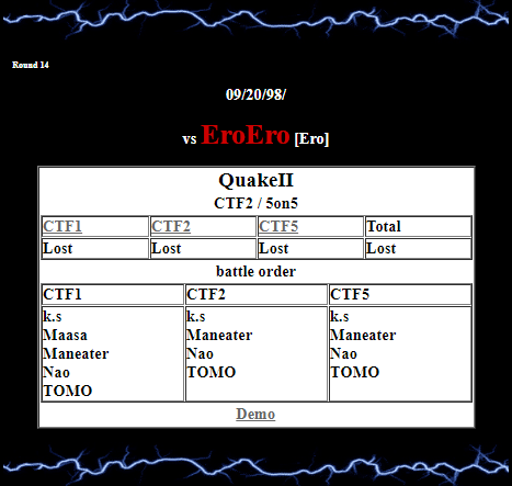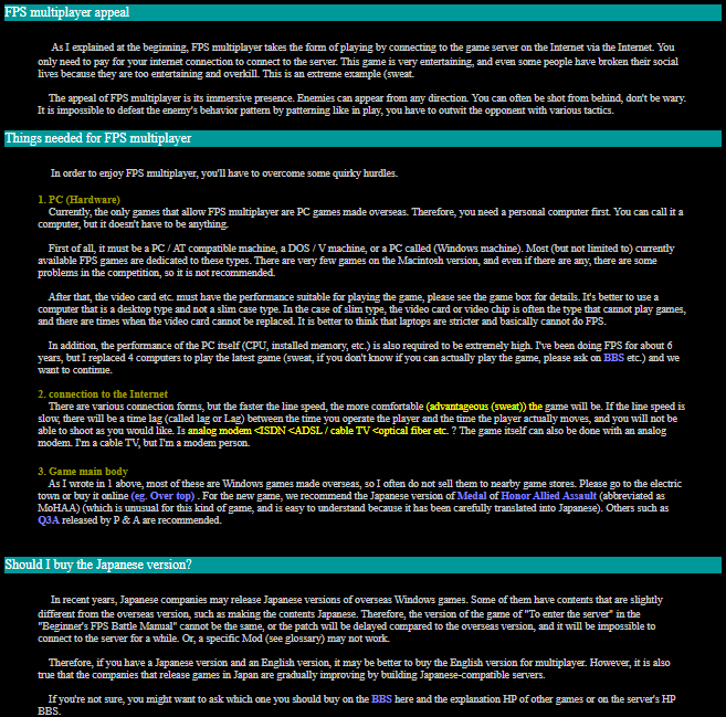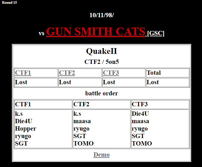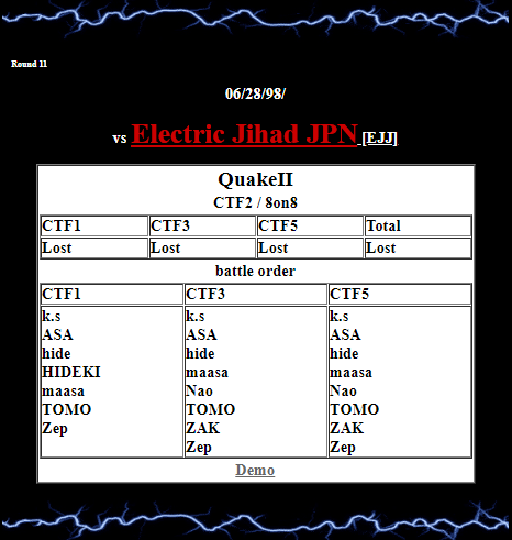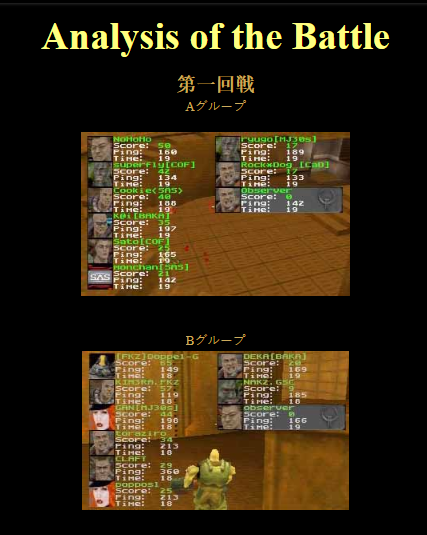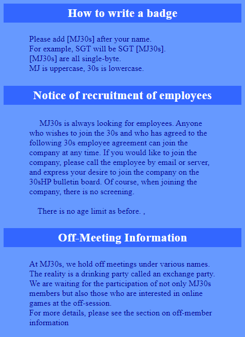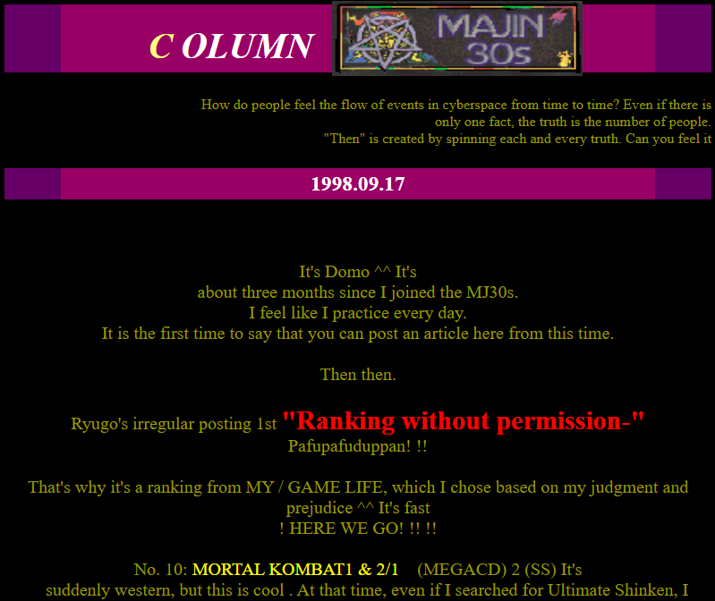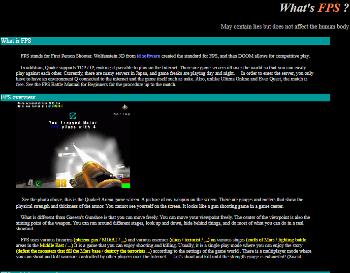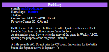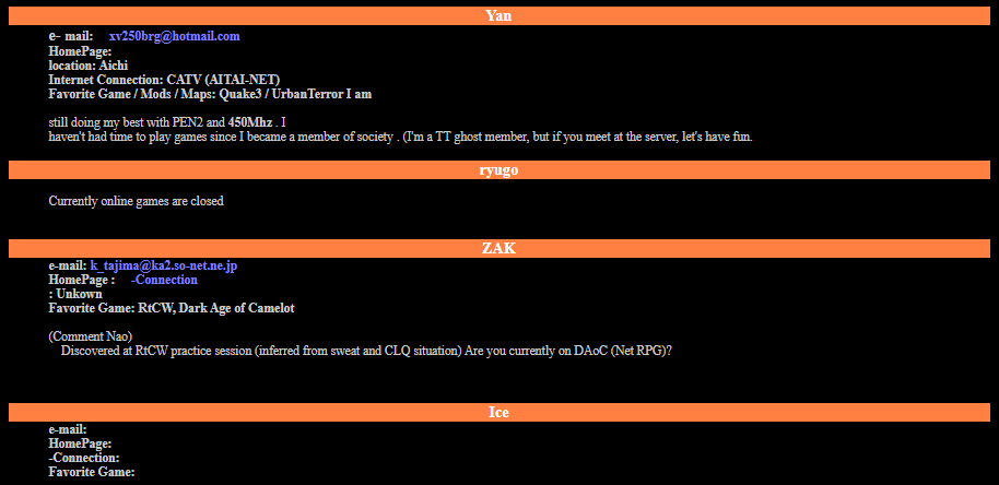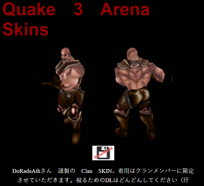 “This page deals with online FPS games centered on the ‘Quake’ series. This HP is also the HP of the FPS Clan (collection of FPS fans) MAJIN 30s. Here you will find information about members and events held at the clan. Looking for newcomers (^ o ^) /. Majin 30s homepage is made by more than 10 network workers. Nao is in charge of comprehensive management. BBS is managed by KS. For content related to quake, TOMO is in charge of Q3 DEMOLAND. The creators of each page are listed at the end of the page. If you have any questions or inquiries about this HP, please contact Nao.”