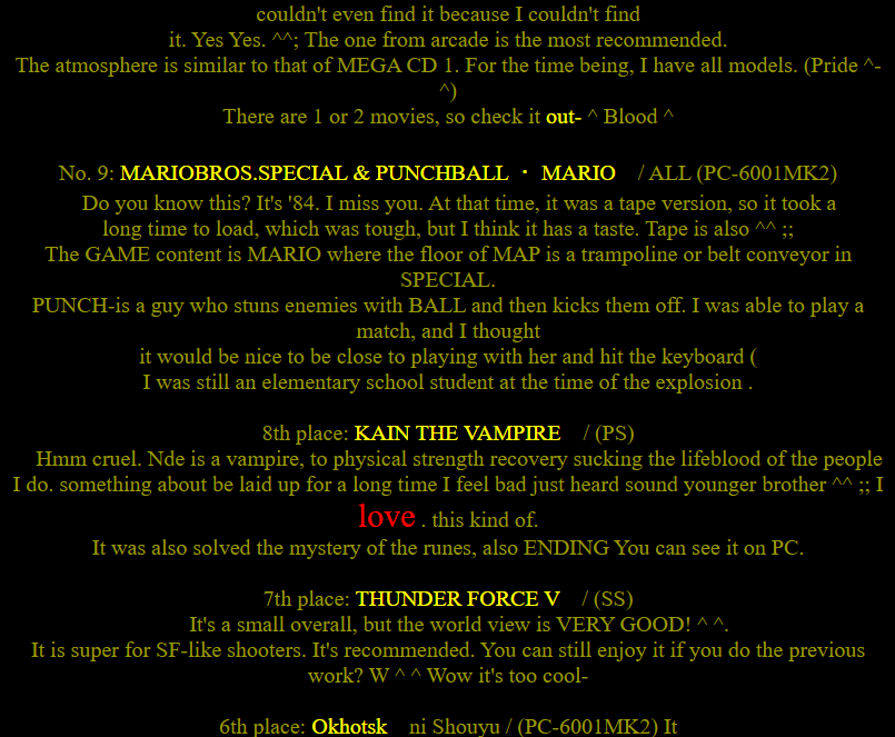 “Well, as you can see [note from Donde: actually, you can’t see, because no photo.], it goes down in a mess (it seems to be more amazing where you can’t see it). Furthermore, vacuum cleaners are used only a few times a year. Therefore, a cover is always put on the PC to prevent dust. A tank with a total weight of more than 300 hundred kilograms sits on the right side and descends, but this is exhausted in daily QUAKE net battles. I got it to heal my dead heart. (Usususu is the 6th year nature aquarium installed in this year) Looking at this guy while switching the map, I feel refreshed and challenge the battle, but everyone knows the effect. I can’t find the mouse pad, but don’t worry. The table is pat (^^;”