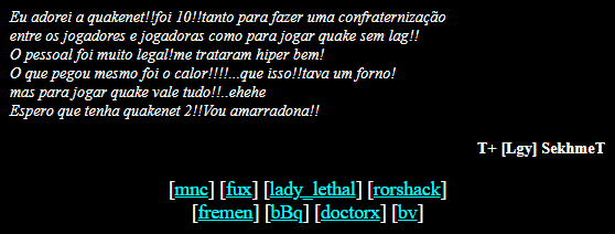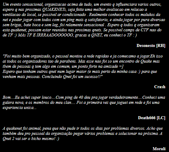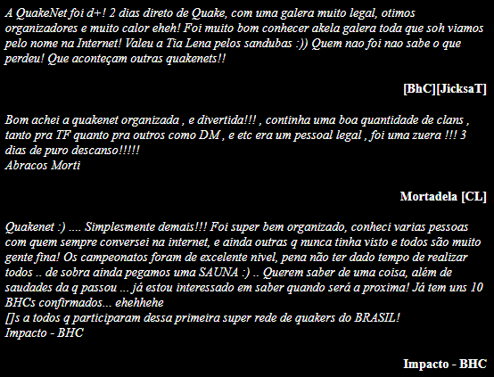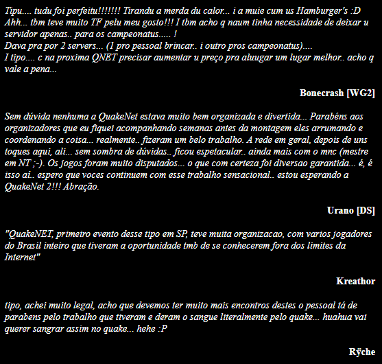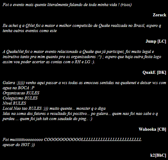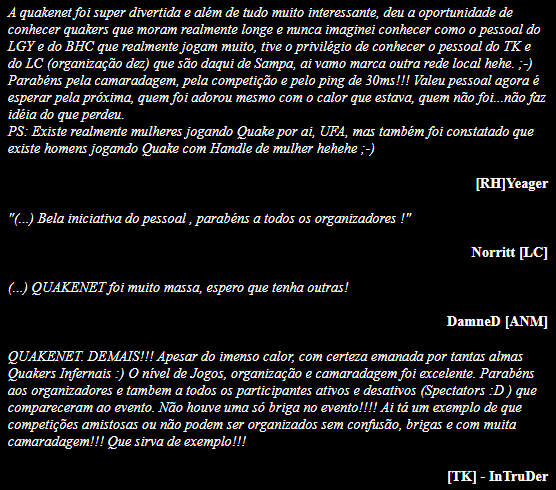 Apesar dessa mudança de última hora, e do calor infernal que pôde ser sentido na QuakeNet devido ao calor pelo qual estamos passando em São Paulo ultimamente (é a QuakeNet dando novo sentido para a expressão “Inferno na Terra”), acreditamos que a QuakeNet foi uma experiência mais do que recompensadora, sob quase todos os pontos de vista. Esperamos que esse evento venha a se repetir muitas vezes no futuro; aprendemos muito com essa primeira edição, e as outras serão ainda melhores.