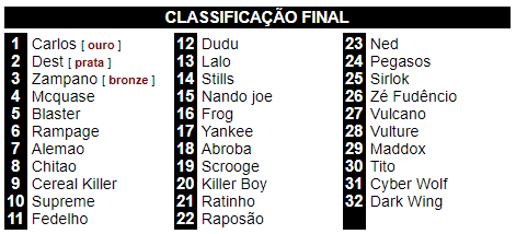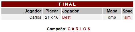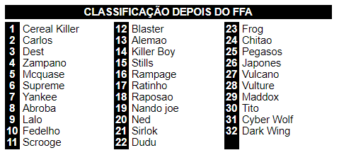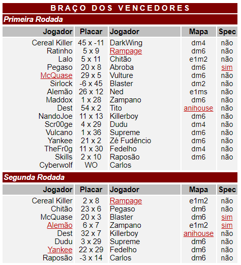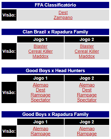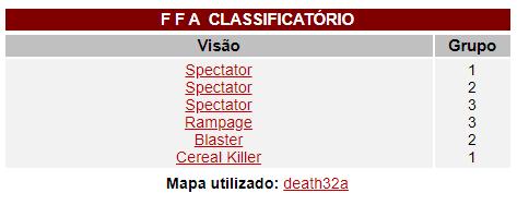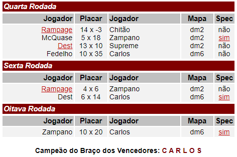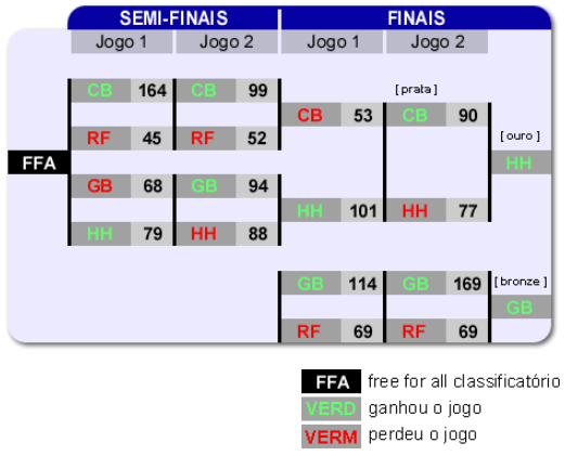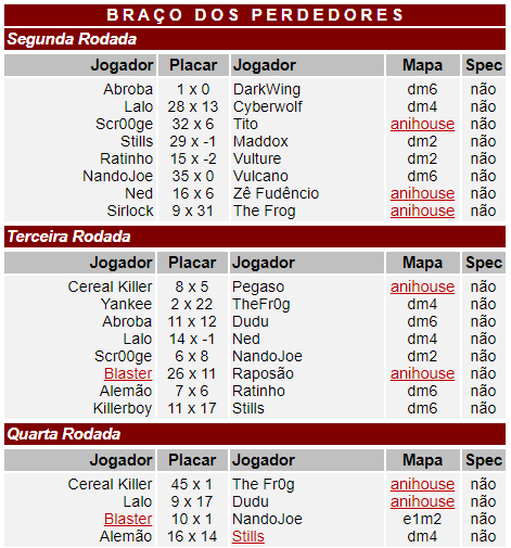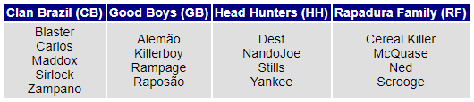 Está é a “árvore” do torneio de Teamplay. Abaixo dela, você encontrará a relação dos jogadores de cada clã. Foram eliminados os 2 últimos colocados na partida de FFA classificatória, sendo eles o Sétimo Apocalipse (7A) e o Improviso Quake Clã (IQ), restando apenos o Clan Brazil (CB), o Head Hunters (HH), o Rapadura Family (RF) e o Good Boys (GB).