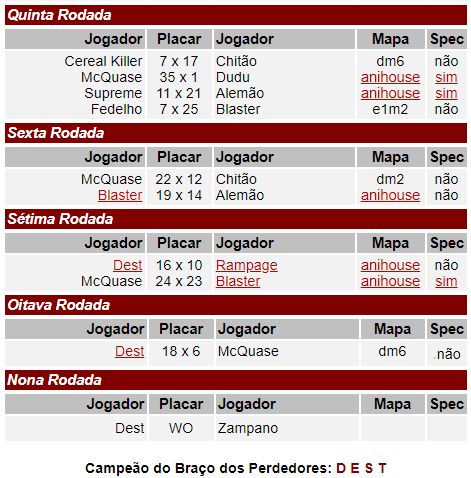 1000 desculpas, mas VÁ PRA *$%#&@ quem inventou Double Elimination. Quem conseguir fazer a árvore (ou melhor, trepadeira, pois nunca vi tanto galho) do Braço dos Perdedores ganha meu computador, meu carro, minha casa… Para facilitar, em vez de uma árvore, segue mais abaixo uma tabela de todos os jogos.