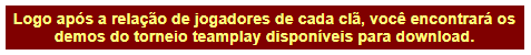 Na seção Inscrições disponibilizaremos a lista dos jogadores inscritos, com seus respectivos e-mails e se eles estão ou não em algum clã. Nós recomendamos aos jogadores que estão sem clã conversar com outros que também estão nesta situação e tentar formar um time para o Teamplay. Lembramos que o time tem que ser de 4 jogadores.
