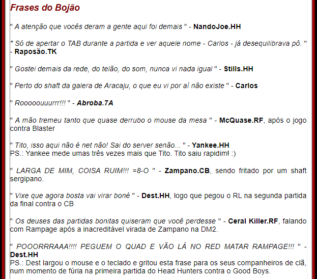 Mas o que vai ficar em nossas mentes será tudo de bom que aconteceu. E não foi pouco. A nível de Quake, numa Internet infestada de bots, proxys e cheaters, fica praticamente impossível saber quem realmente joga e quem fica apenas babando na frente do monitor, comendo pipoca enquanto seu “robozinho” faz o serviço em seu nome. É – também – pra isso que um grande campeonato em rede como esse serve, e comentários sarcásticos como ” Pô, esse cara não sabia jogar na net?? >) ” foram bastante ouvidos.