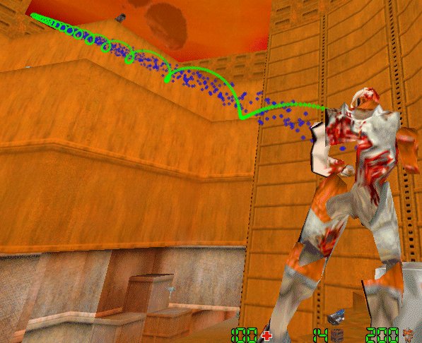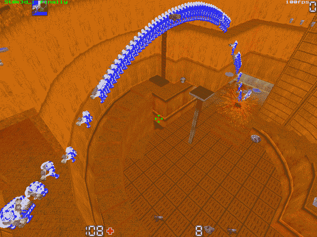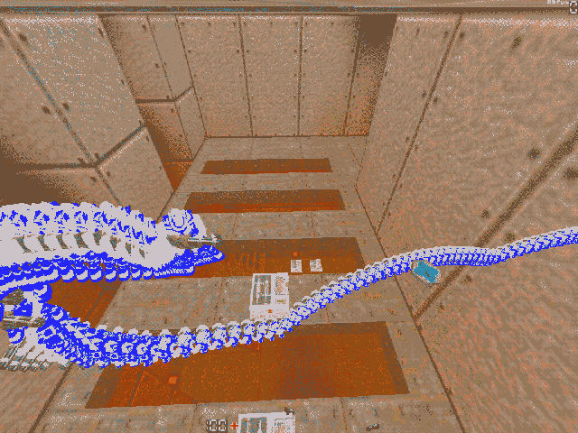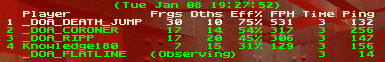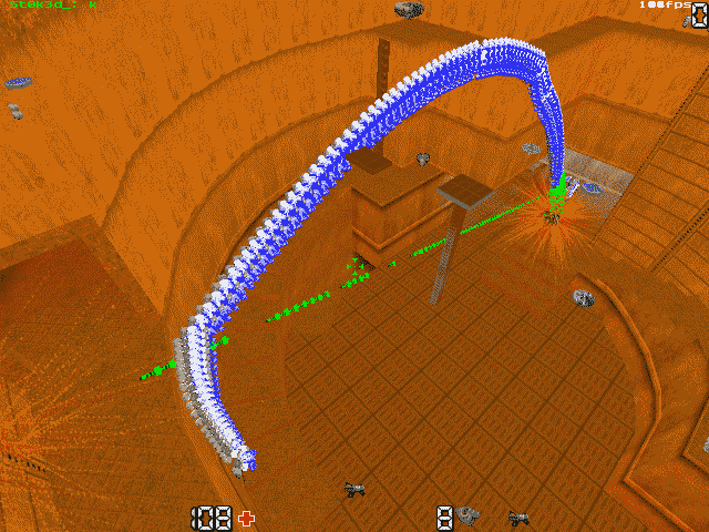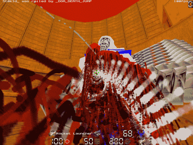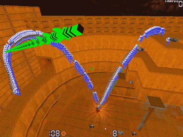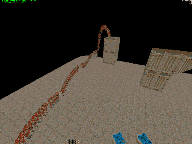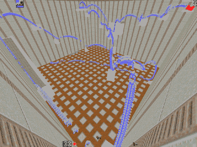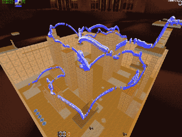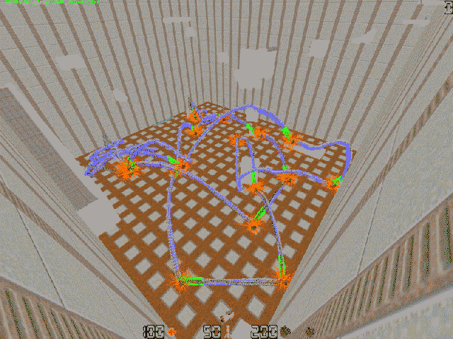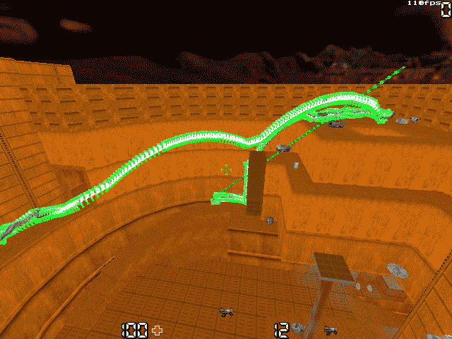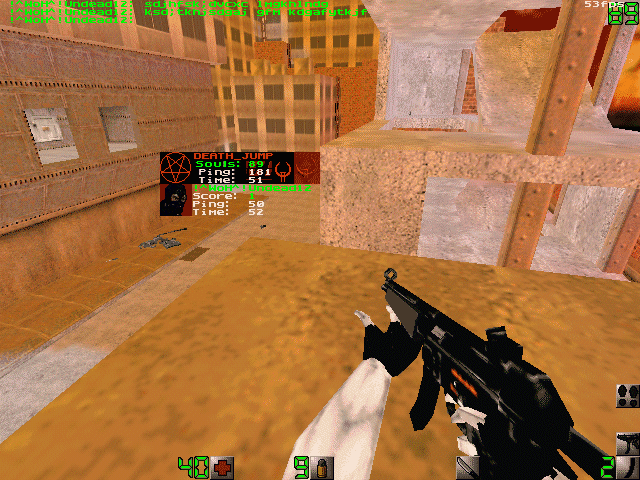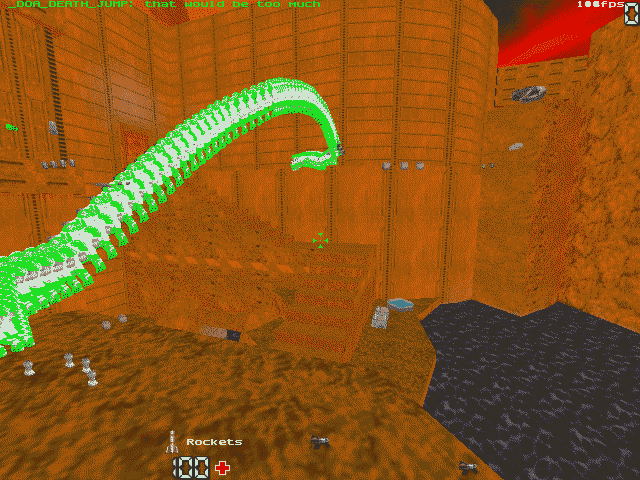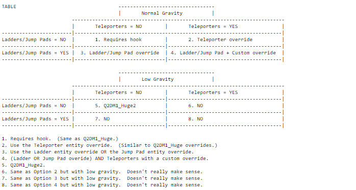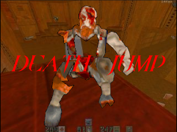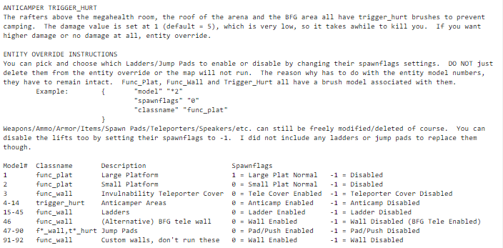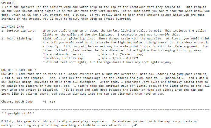 “The first thing you will notice is that your grenade bounces when you shoot it, LOL. I have never seen this in any map before, so I hope that I was the first one to do this. This strange twist makes the map more interesting because your grenade will travel further than normal and when dead bodies get blown up, the gibs will bounce around the level too! The way that this grenade and gib bouncing effect is accomplished is by using 2 trigger_gravity layers in the map. The lower layer is only 32 units thick and has the gravity set to 0. The upper layer extends all the way up to the sky brush and has the gravity set to 20 which means that it is 20 times normal gravity or (20 X 800) 16,000. The lower layer needs to have a gravity of 0 or the grenade would instantly go down and stick to the floor. Because the map might be ran with the WoD 8.0 mod and someone could use the Jetpack to float up above all of the grenades, I included a single shotgun in the middle of the map. The flare gun could be used to take someone out of mid-flight, but the shotgun would be more effective. There is only one shotgun for the center of the map so it will make it harder to get the shotgun as well. When you walk over the shotgun, you get to hear the DOA sound play.” -_DOA_DEATH_JUMP