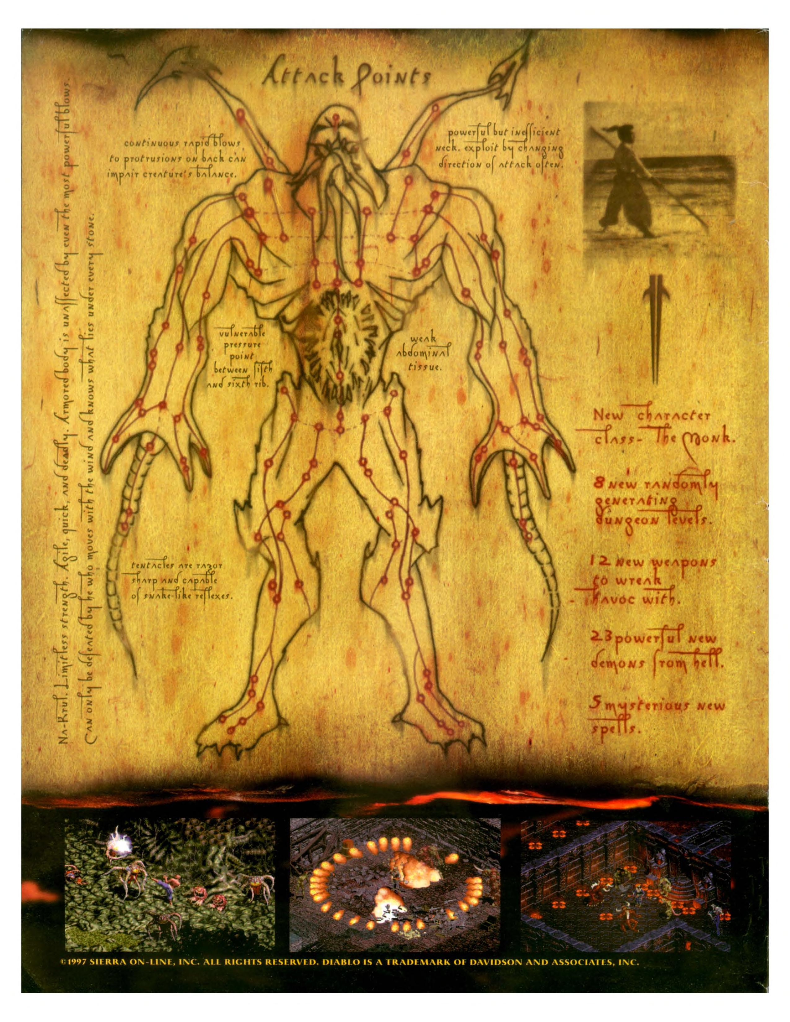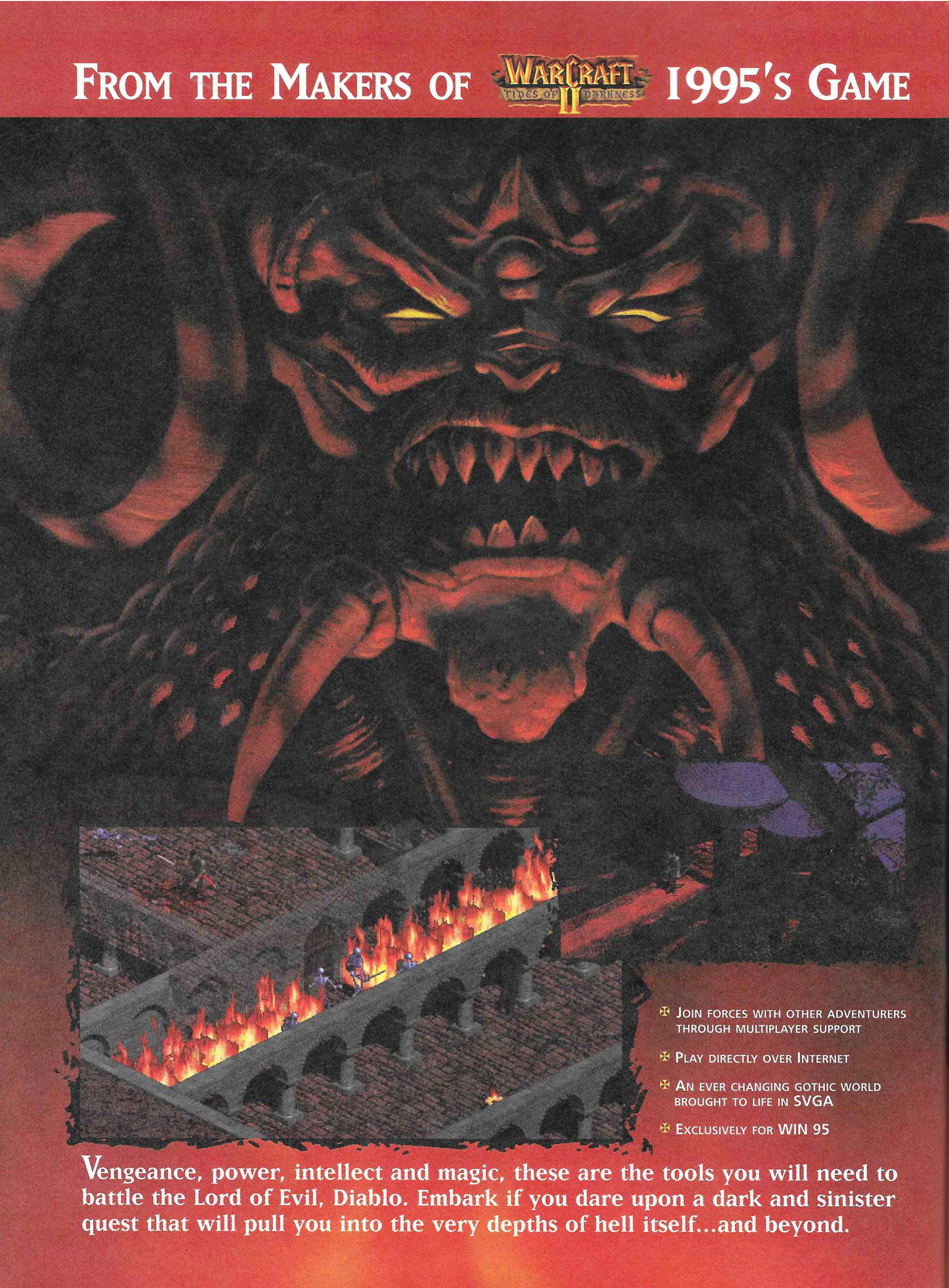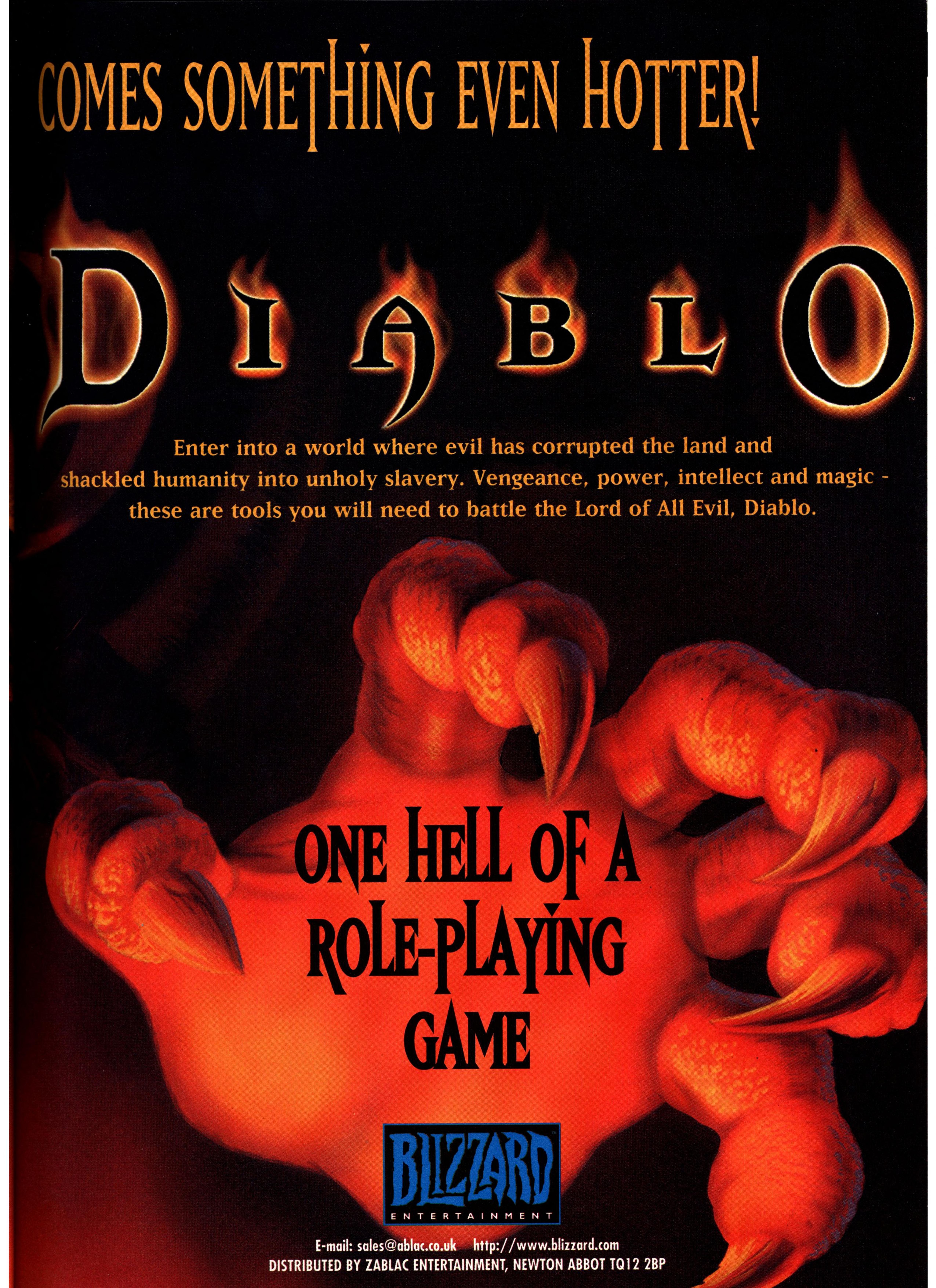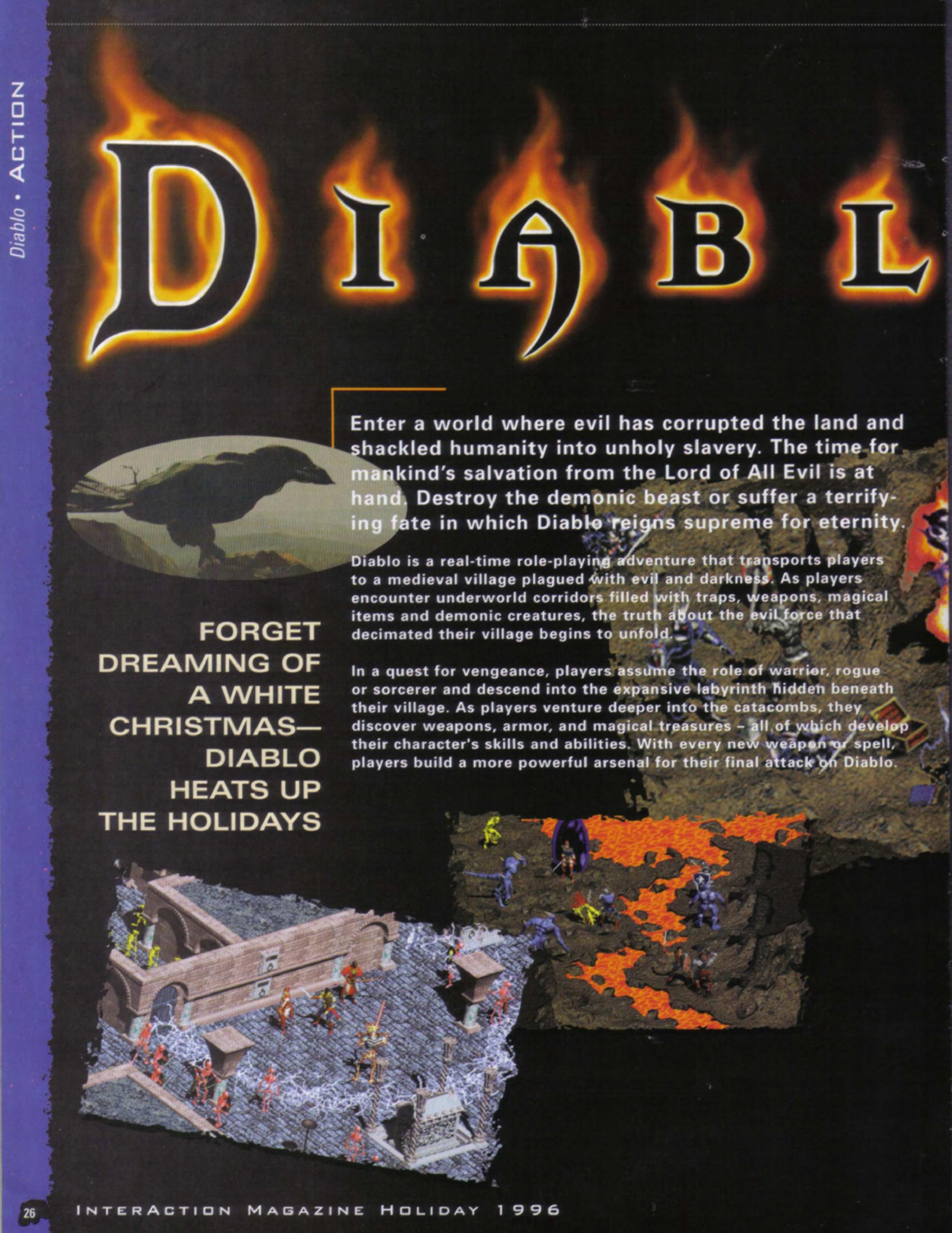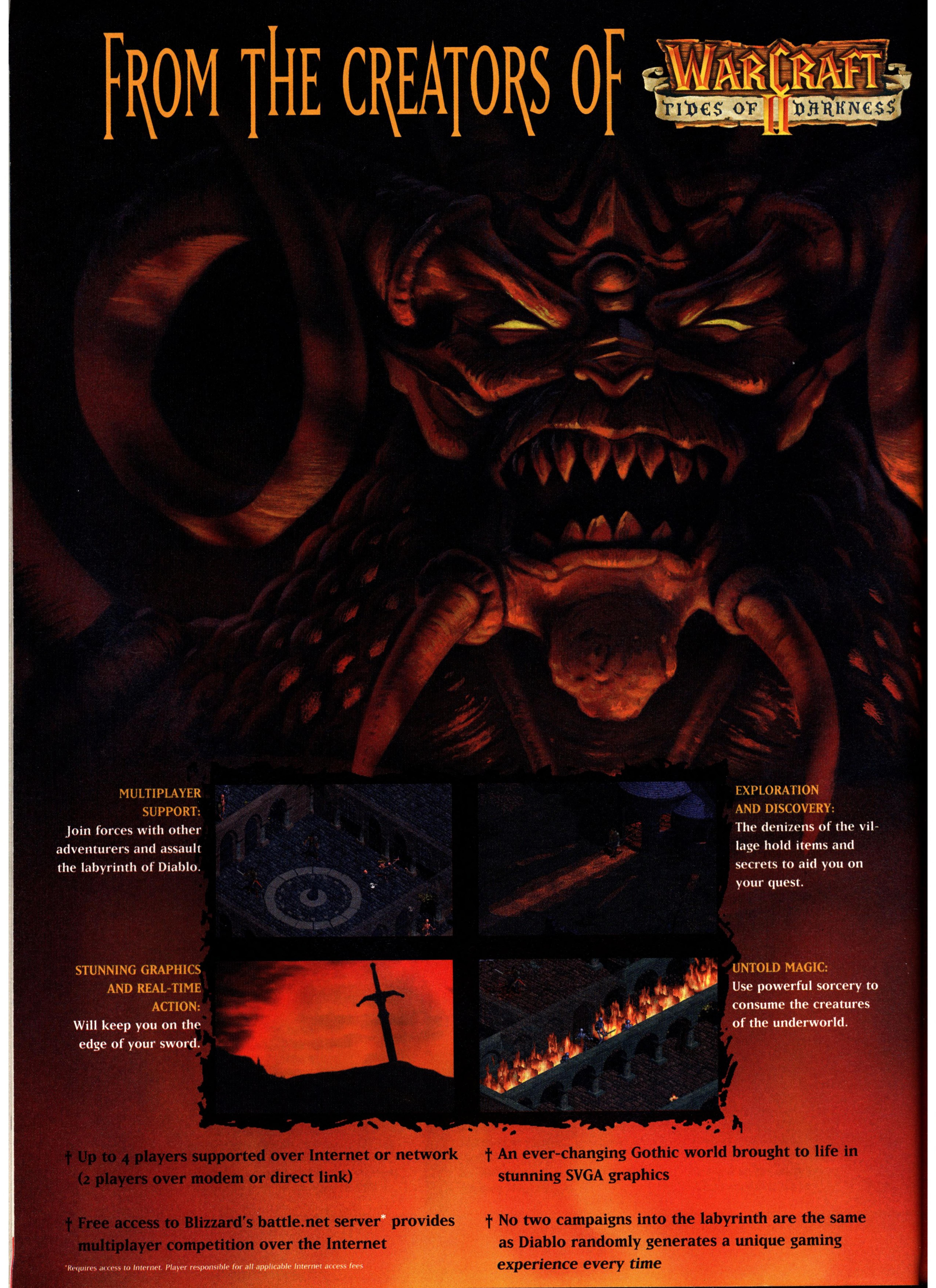 “In a quest for vengeance, players assume the role of warrior, rogue or sorcerer and descend into the expansive labyrinth hidden beneath their village. As players venture deeper into the catacombs, they discover weapons, armor, and magical treasures — all of which develop their character’s skills and abilities. With every new weapon or spell, players build a more powerful arsenal for their final attack on Diablo.”