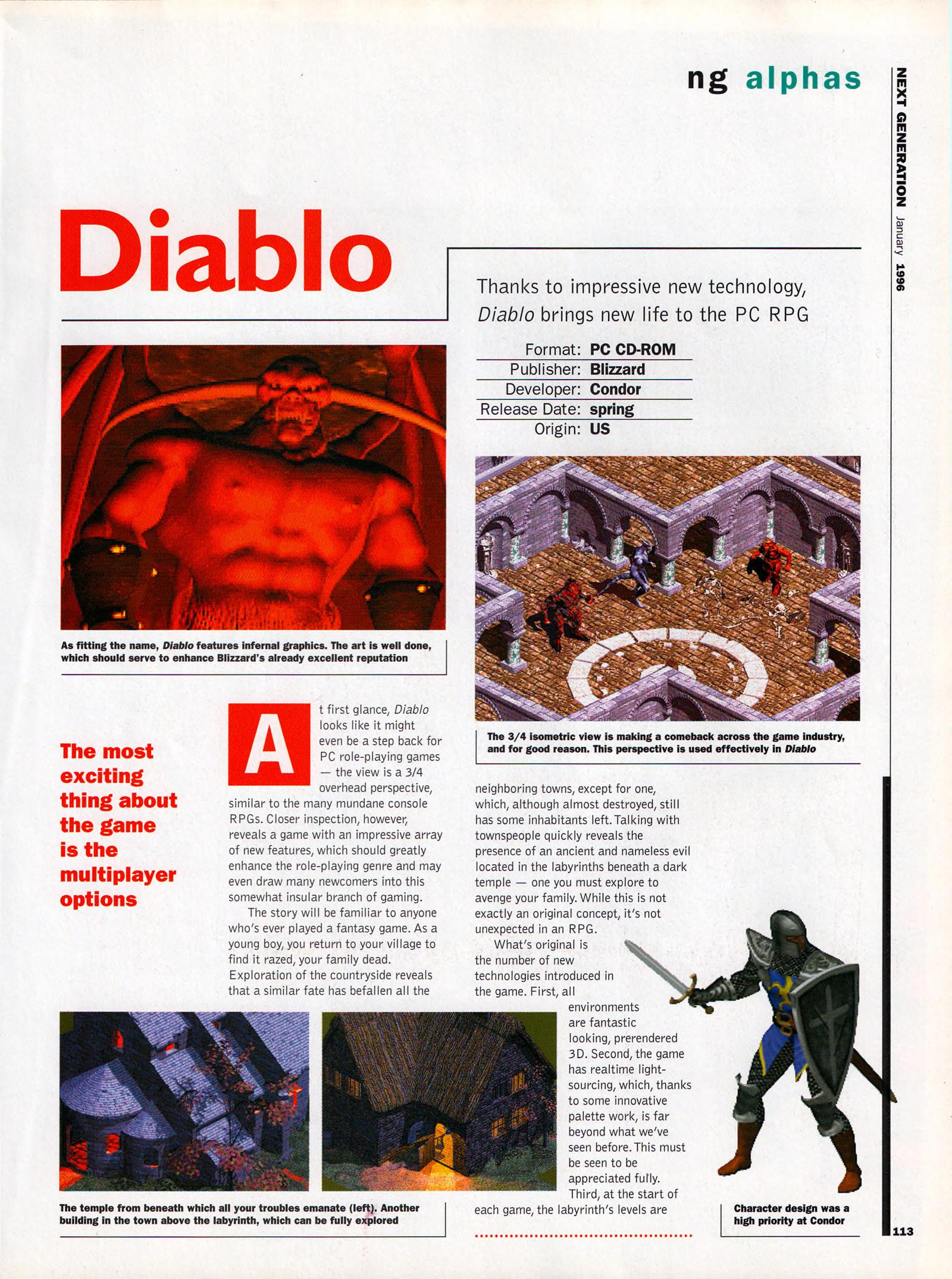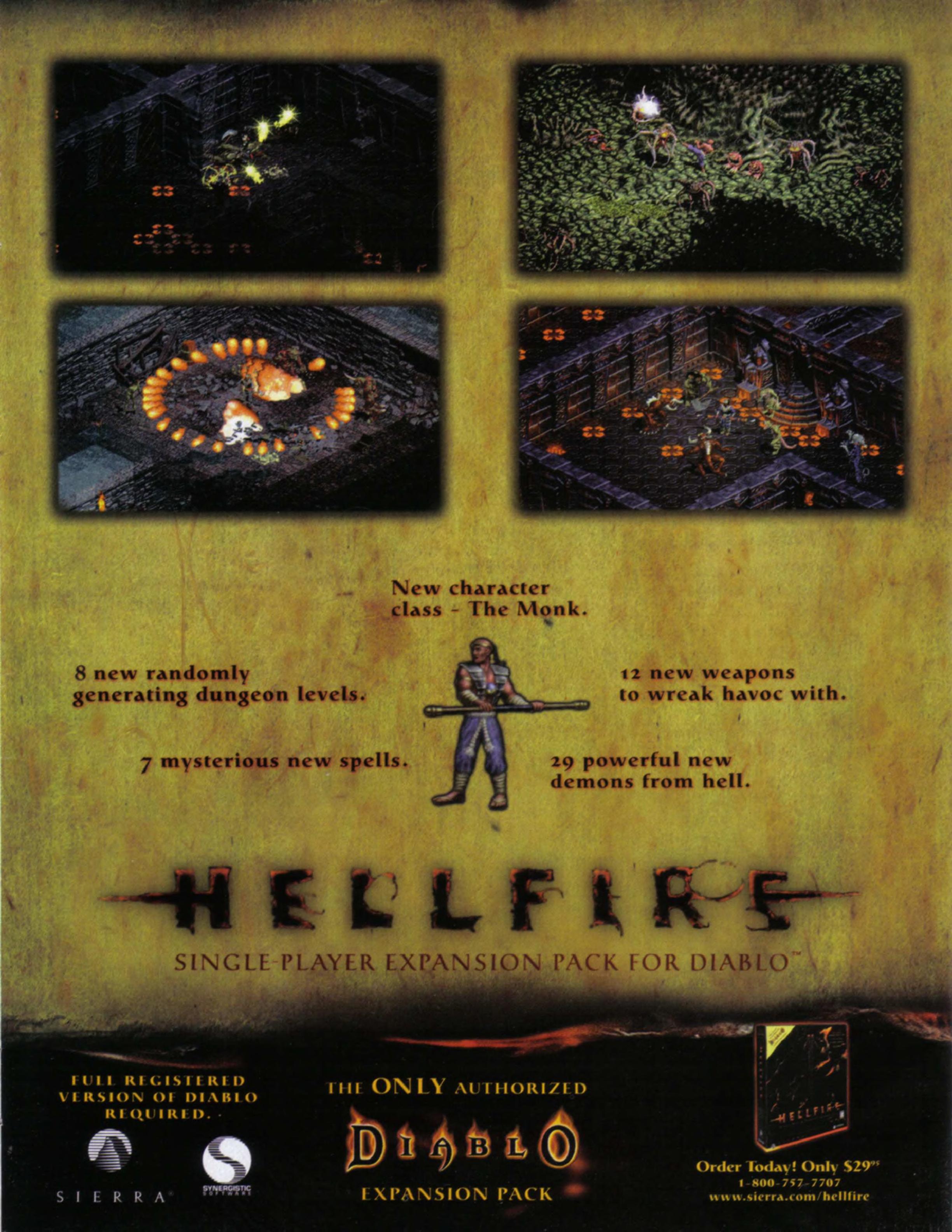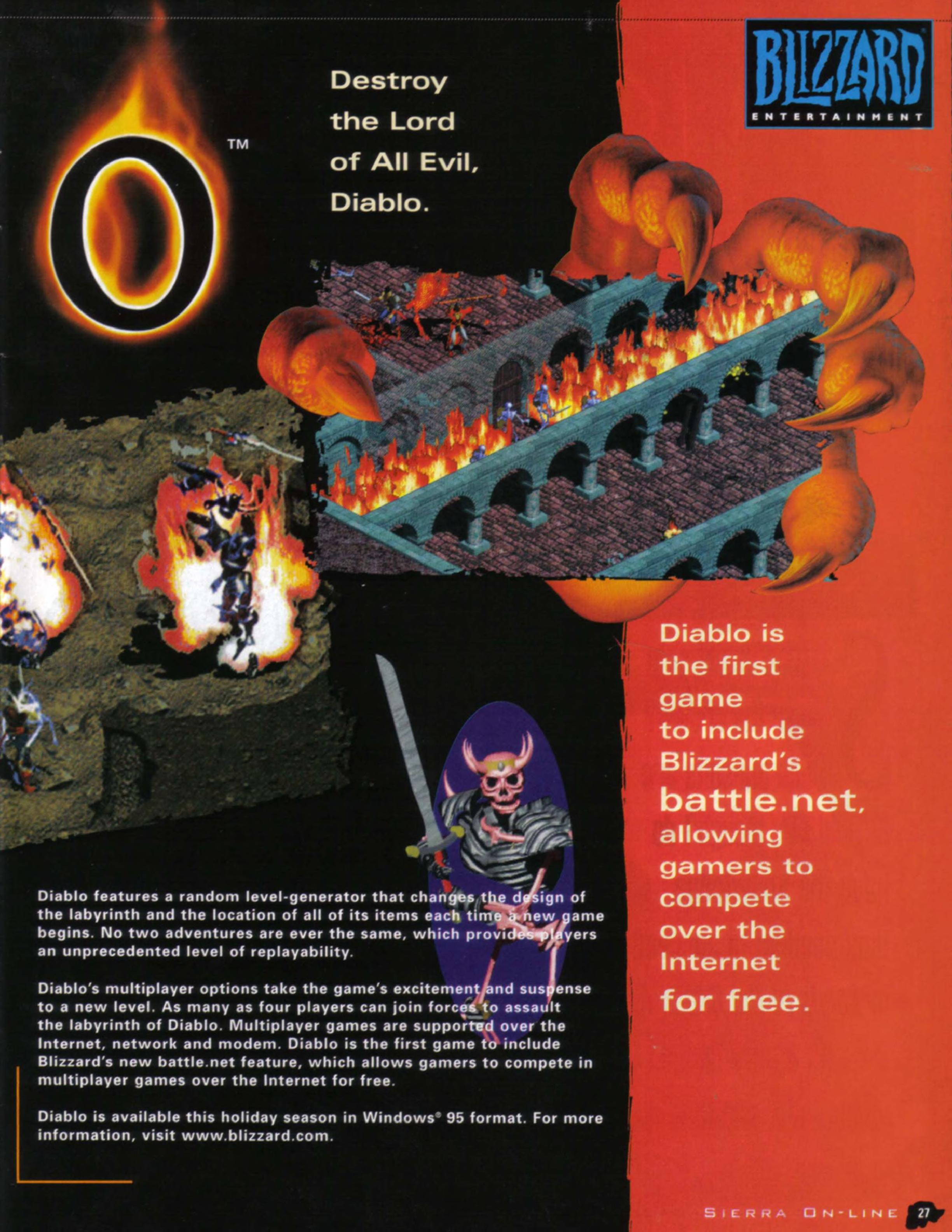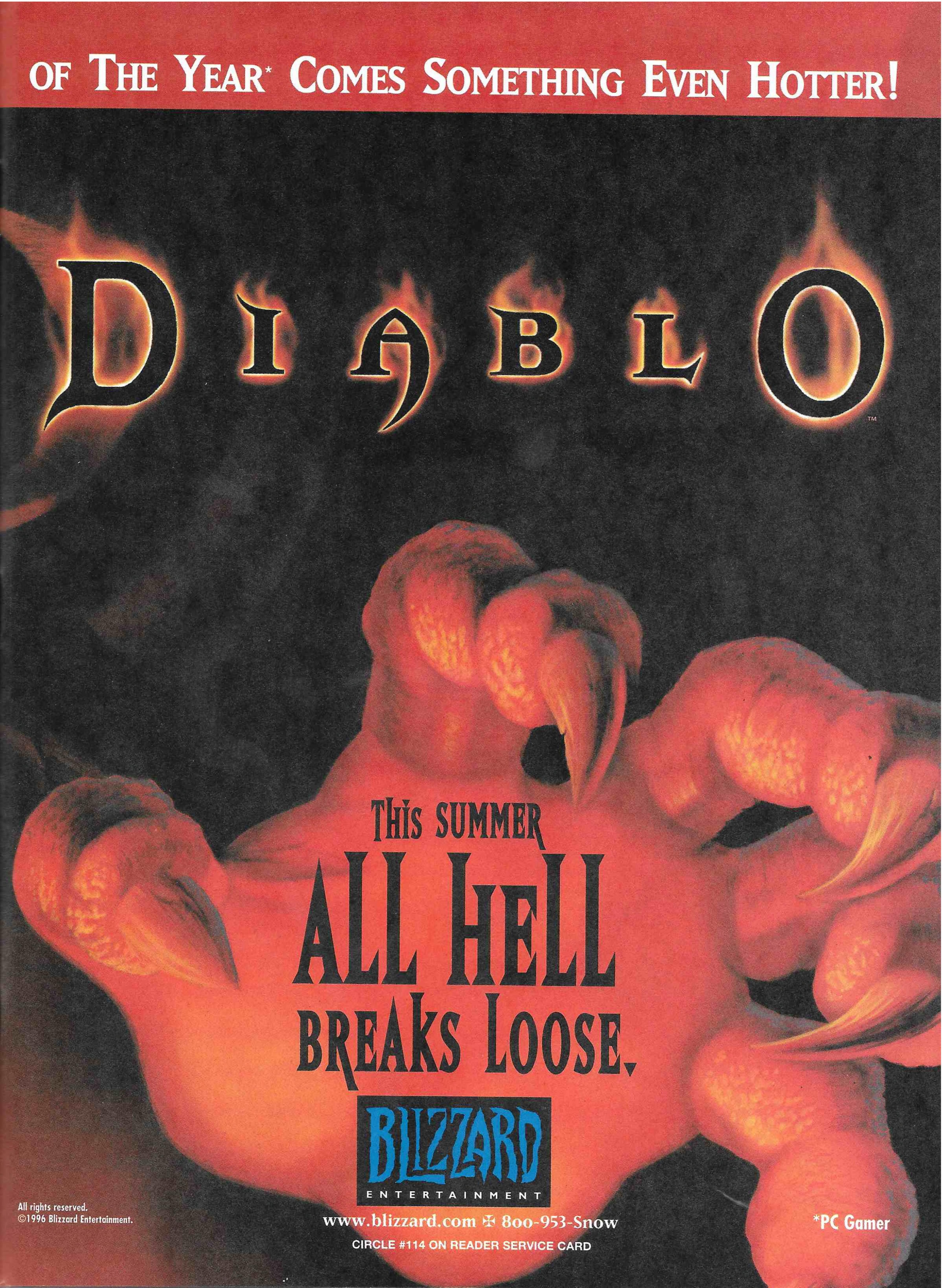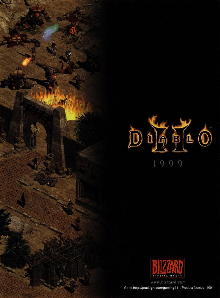 “In a quest for vengeance, players assume the role of warrior, rogue or sorcerer and descend into the expansive labyrinth hidden beneath their village. As players venture deeper into the catacombs, they discover weapons, armor, and magical treasures — all of which develop their character’s skills and abilities. With every new weapon or spell, players build a more powerful arsenal for their final attack on Diablo.”