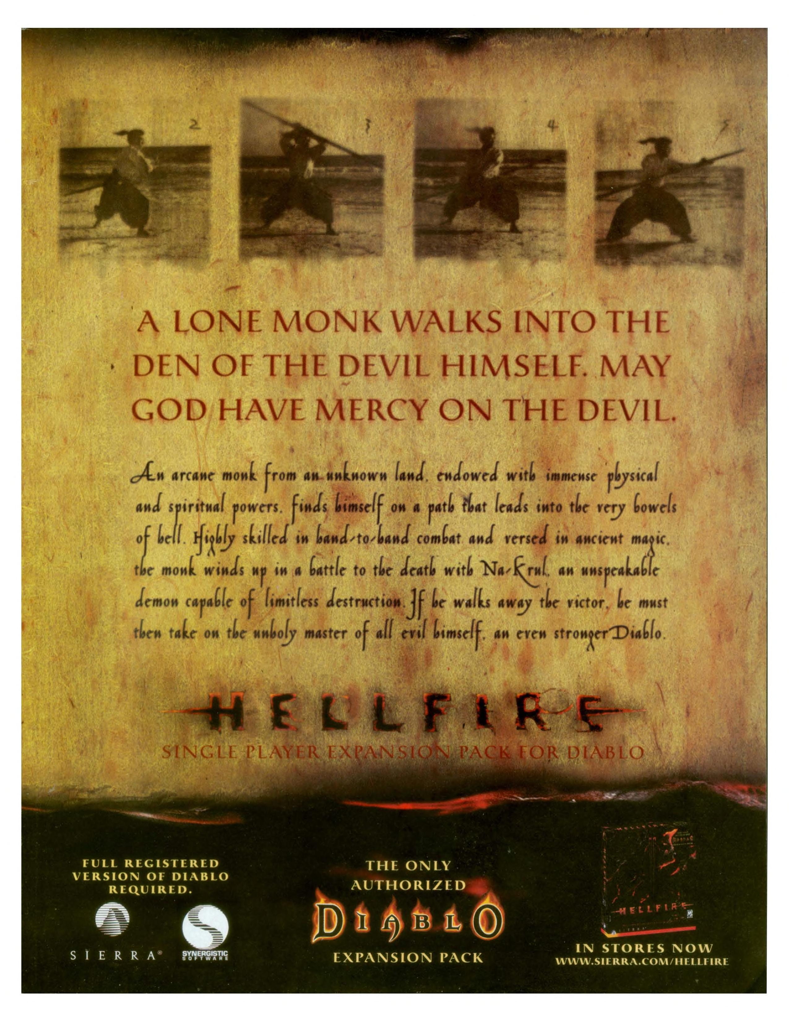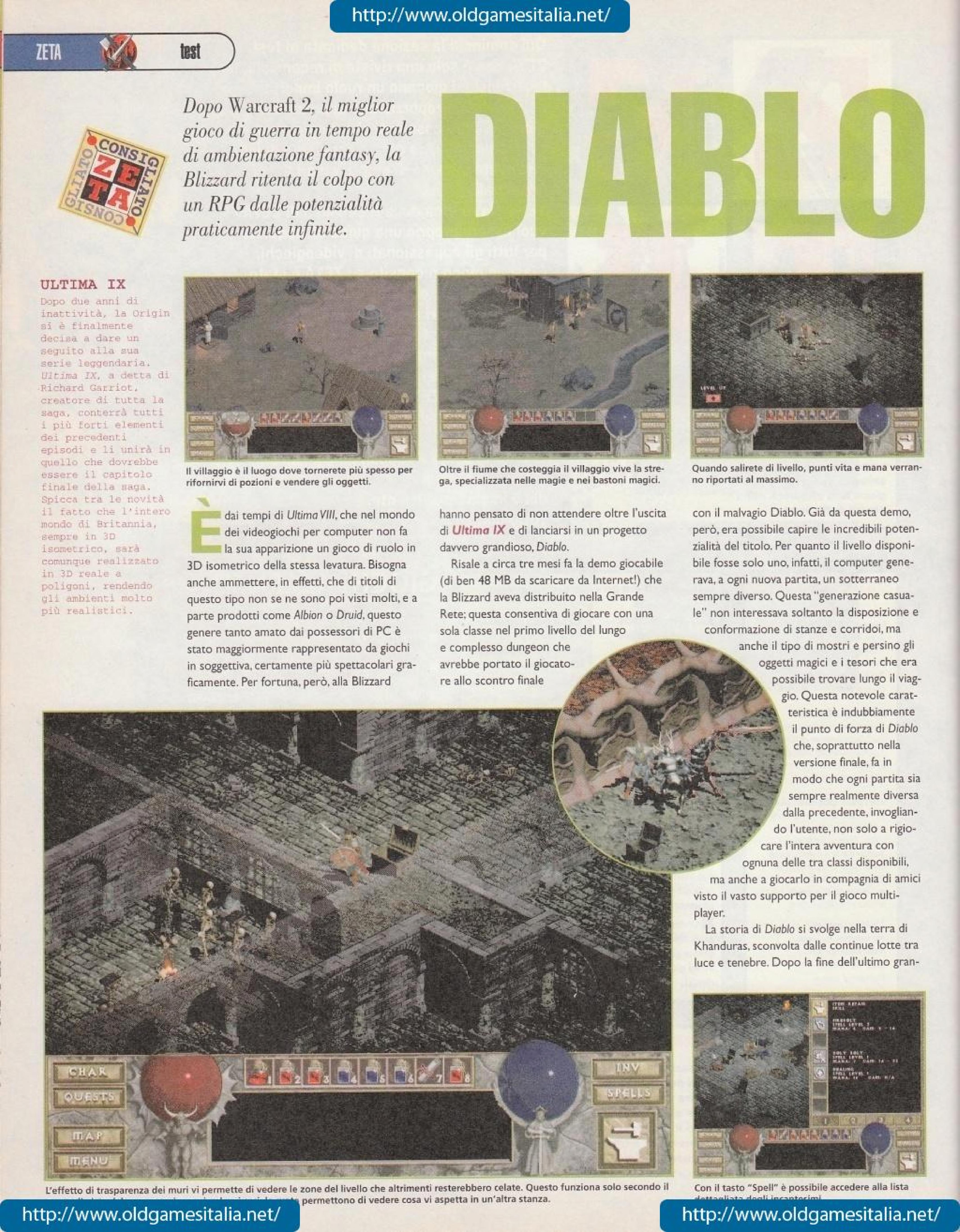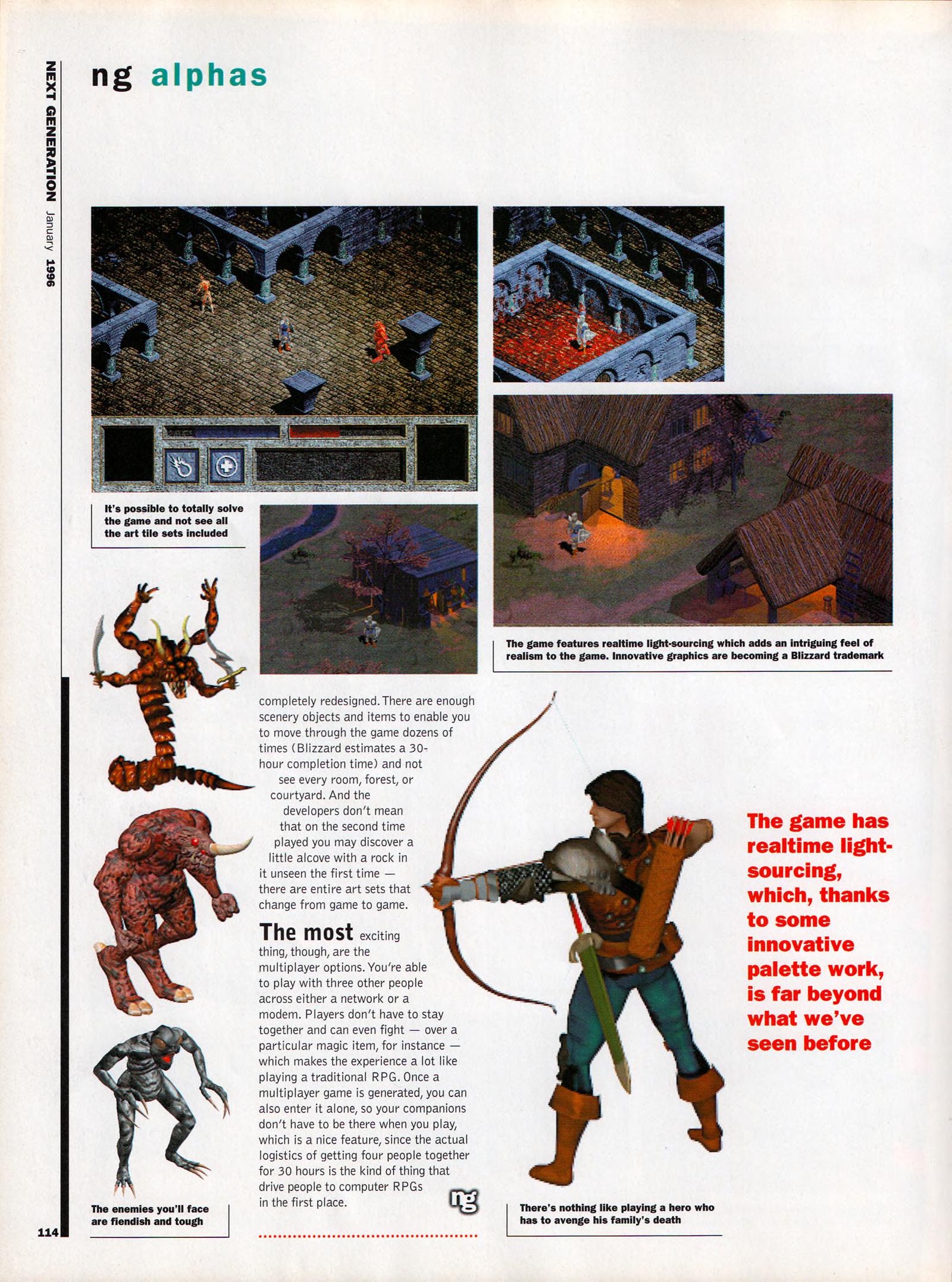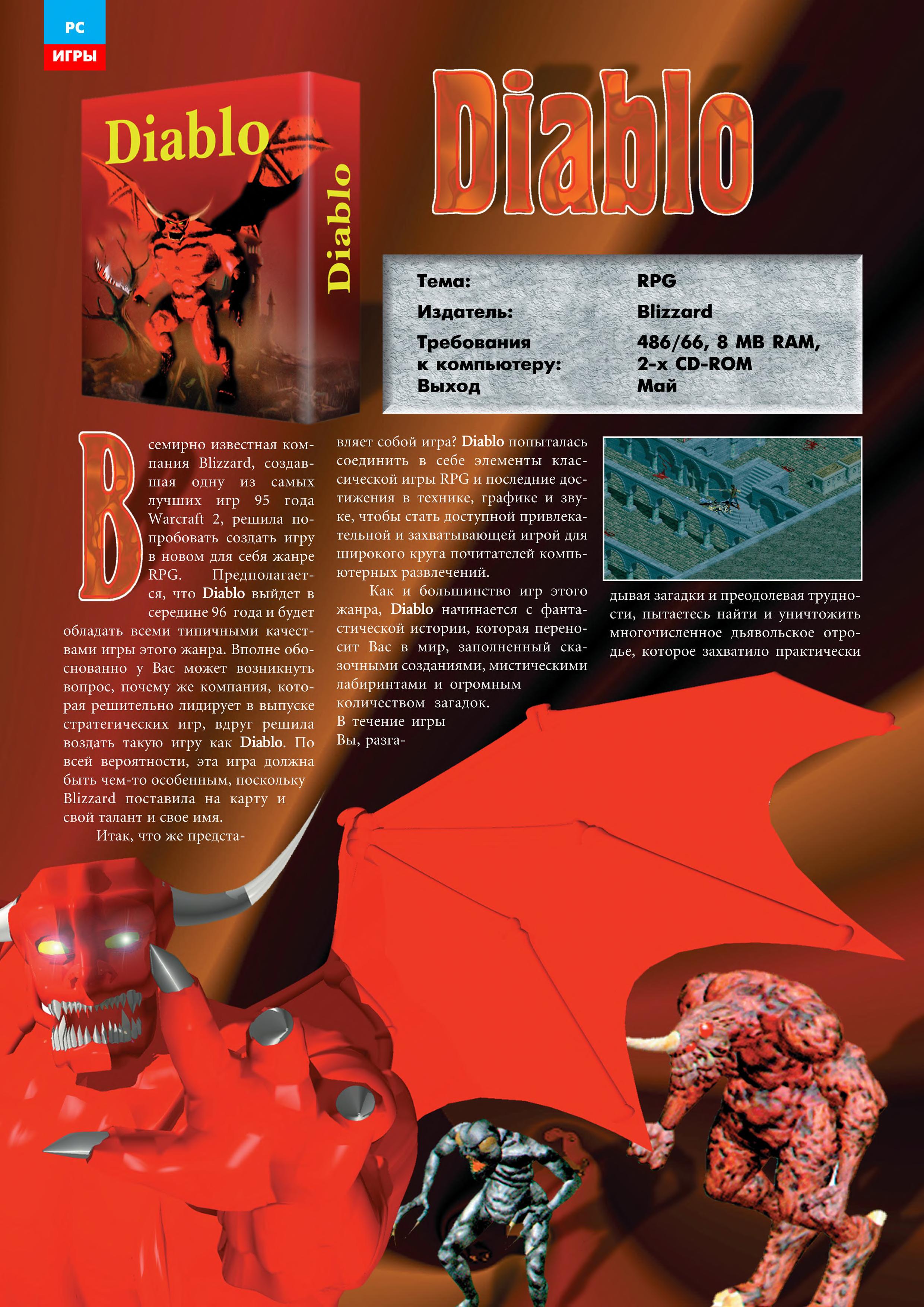 “In a quest for vengeance, players assume the role of warrior, rogue or sorcerer and descend into the expansive labyrinth hidden beneath their village. As players venture deeper into the catacombs, they discover weapons, armor, and magical treasures — all of which develop their character’s skills and abilities. With every new weapon or spell, players build a more powerful arsenal for their final attack on Diablo.”