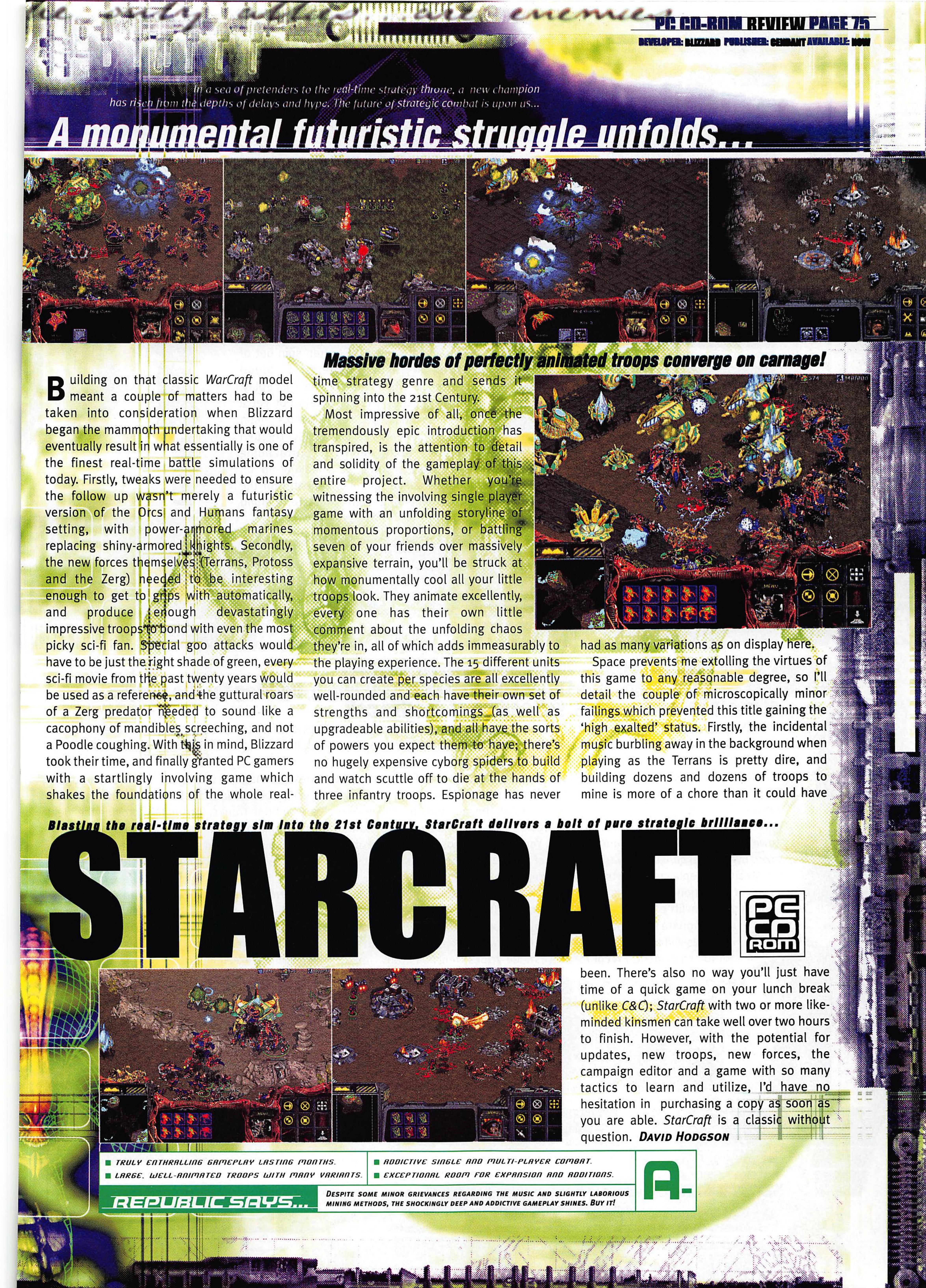 “In the tradition of the Warcraft series comes a quest into the far reaches of space and the realms of Starcraft. In Starcraft, the newest real-time strategy game under development by Blizzard Entertainment, players journey deep into space to restore order to a galaxy on the brink of interstellar warfare.”