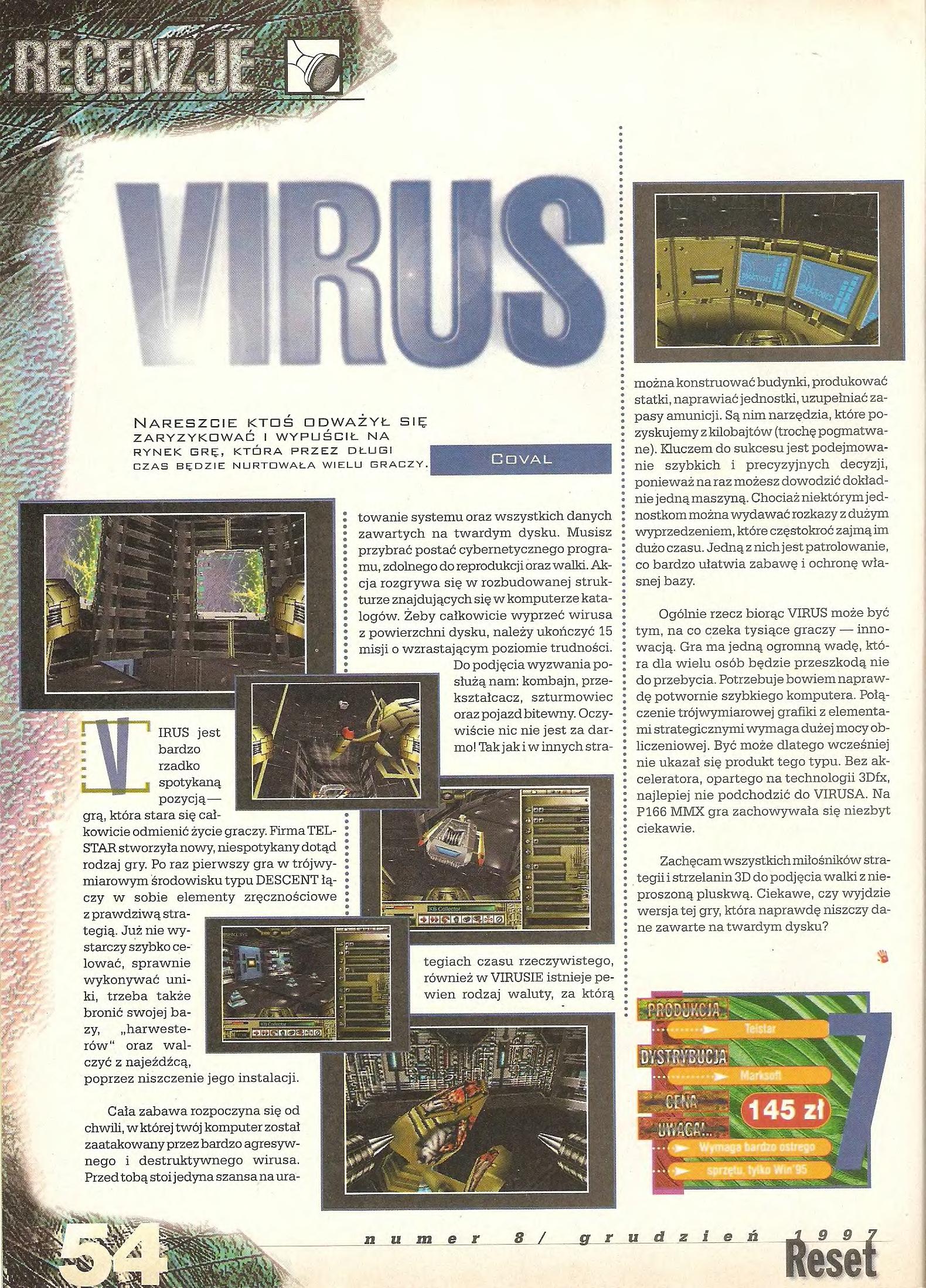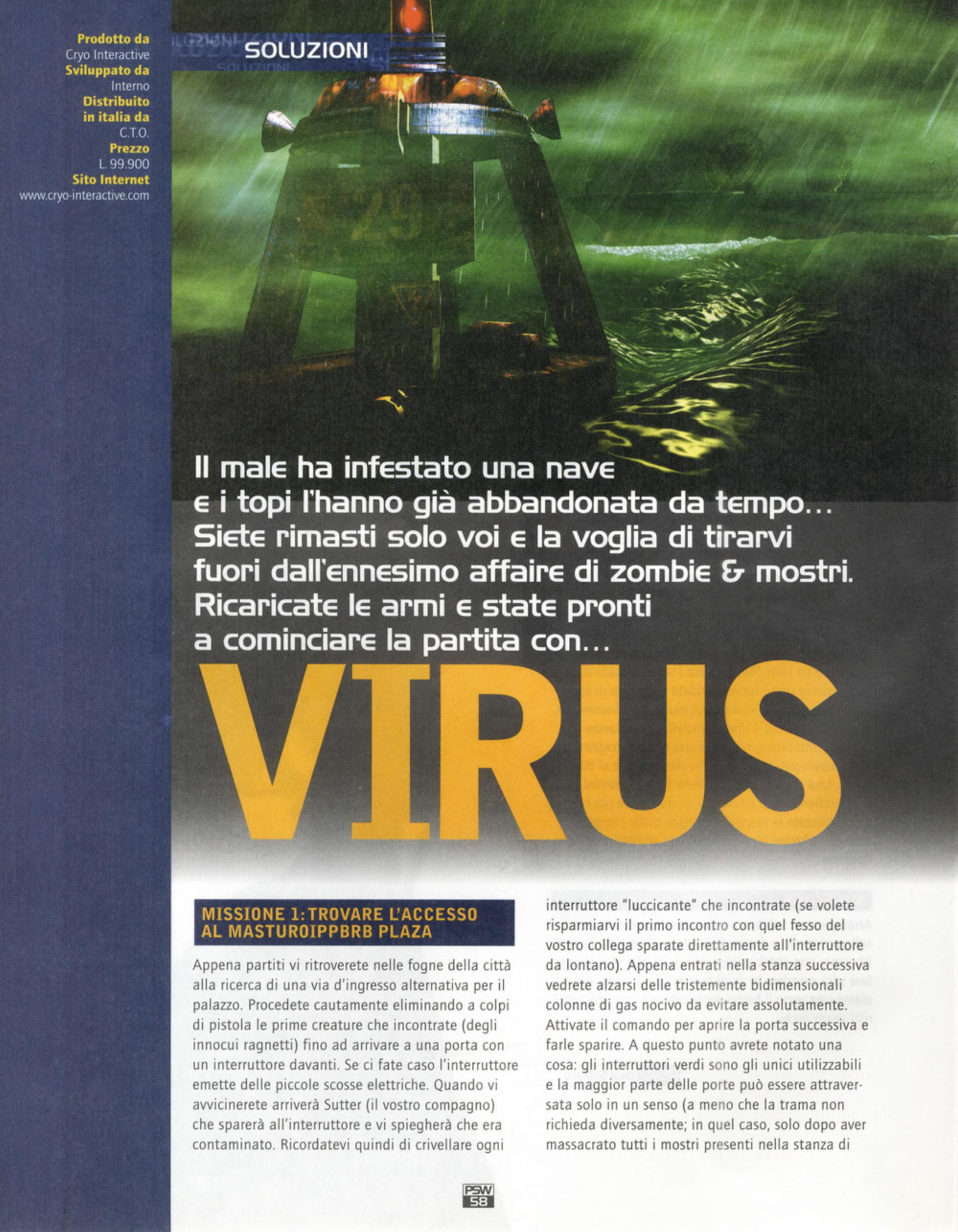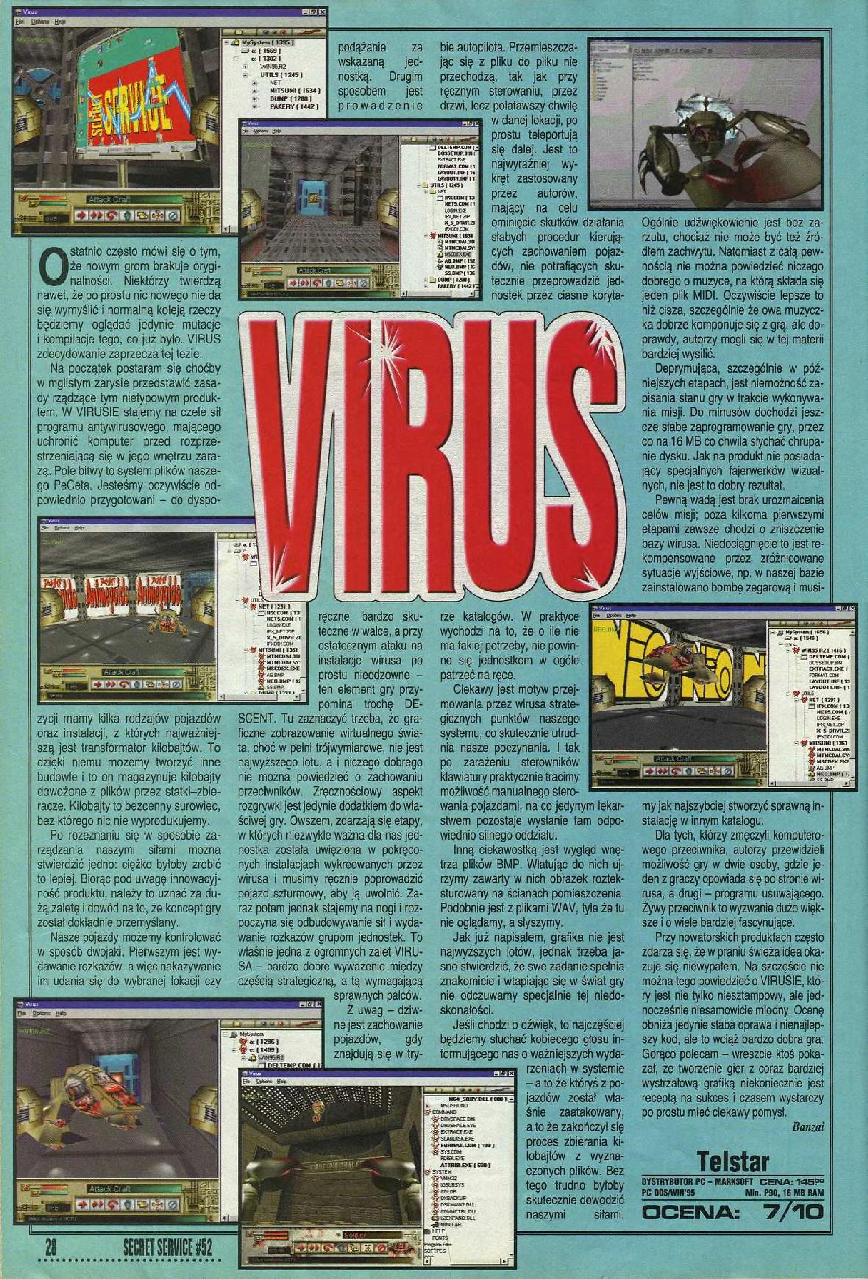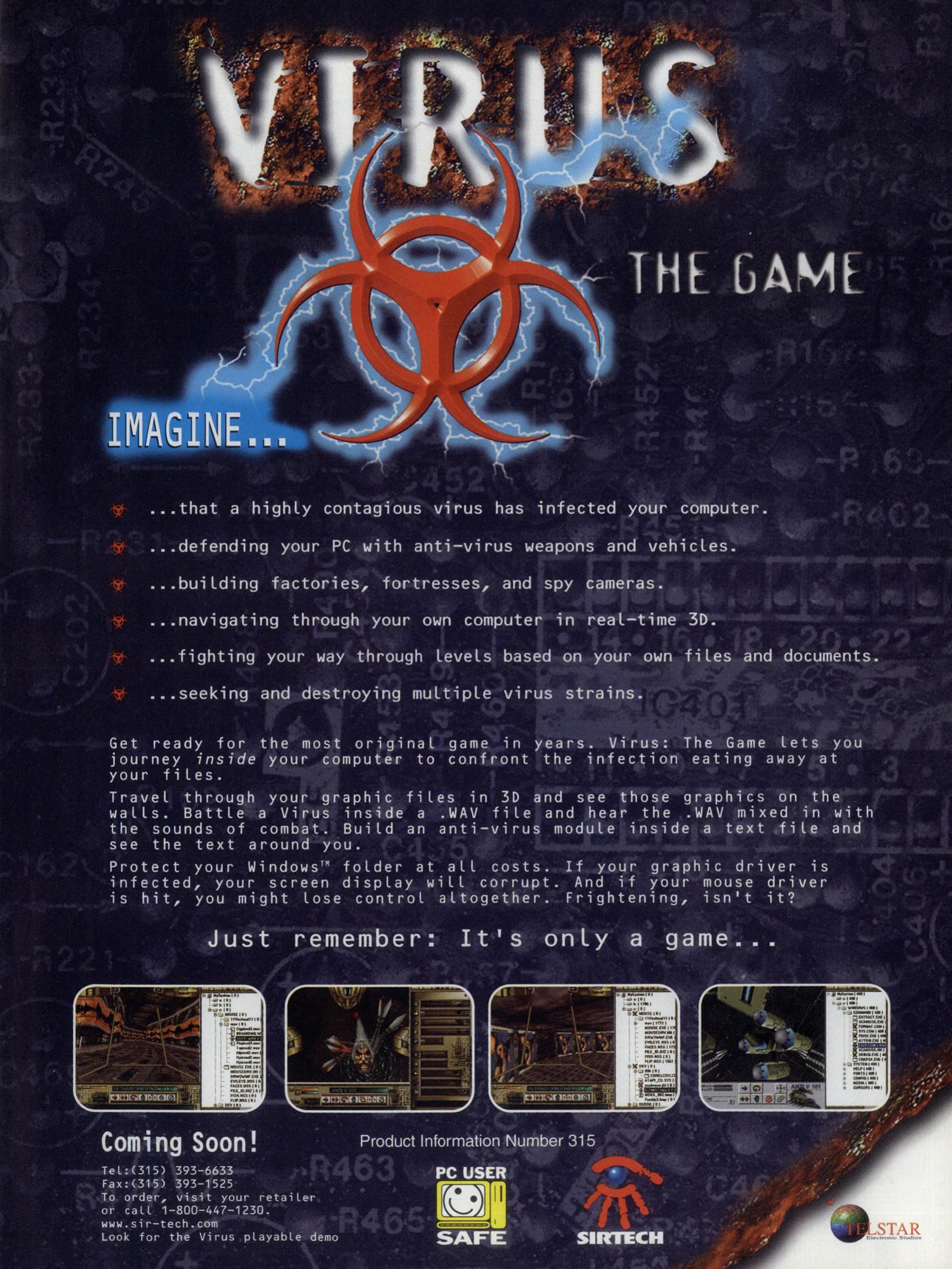 “Image that a highly contagious virus has infected your computer. Defending your PC with anti-virus weapons and vehicles; building factories, fortresses, and spy cameras; navigating through your own computer in real-time 3D; seeking and destroying multiple virus strains…. Get ready for the most original game in years. Virus: The Game lets you journey inside your computer to confront the infection eating away at your files.”