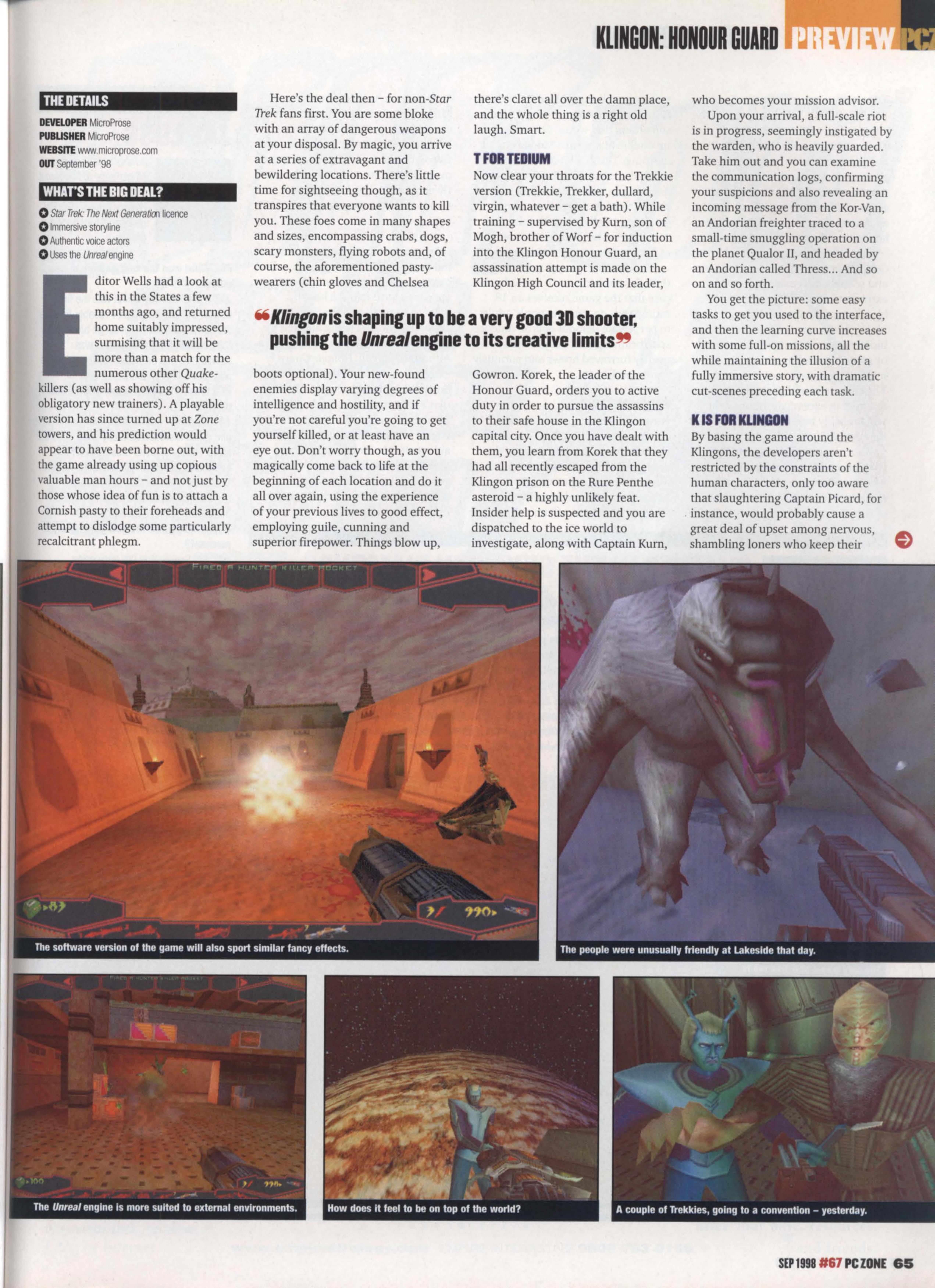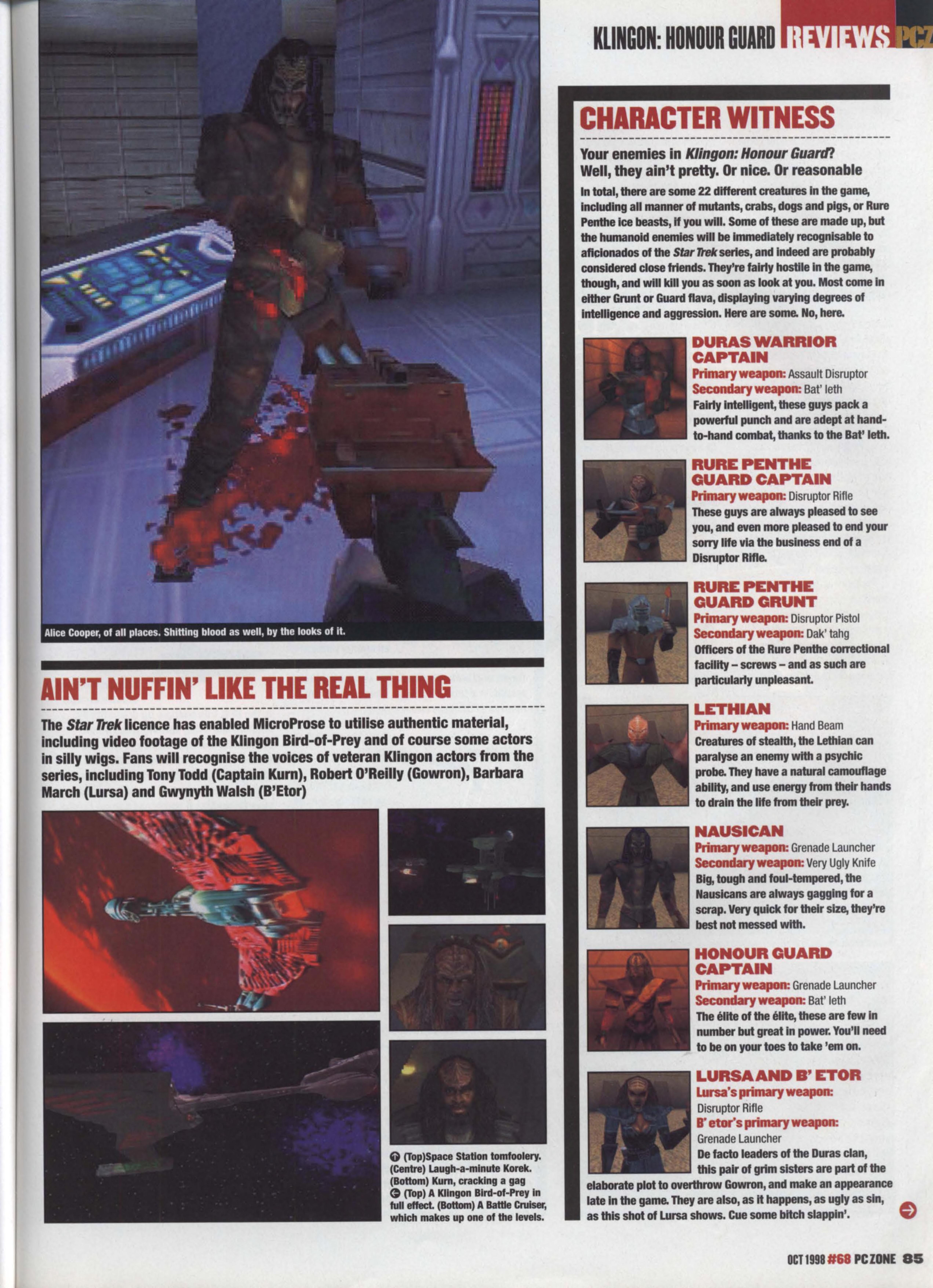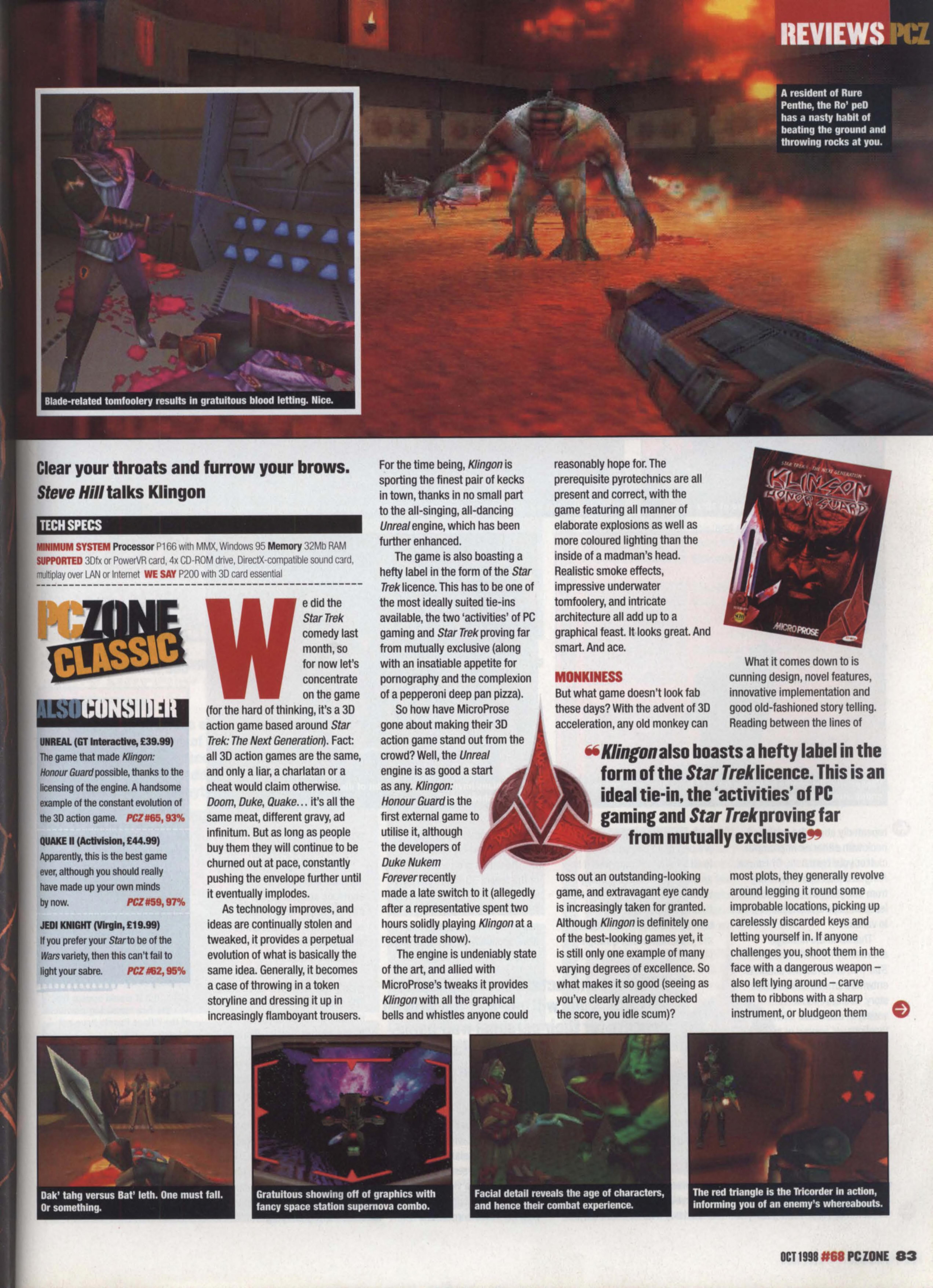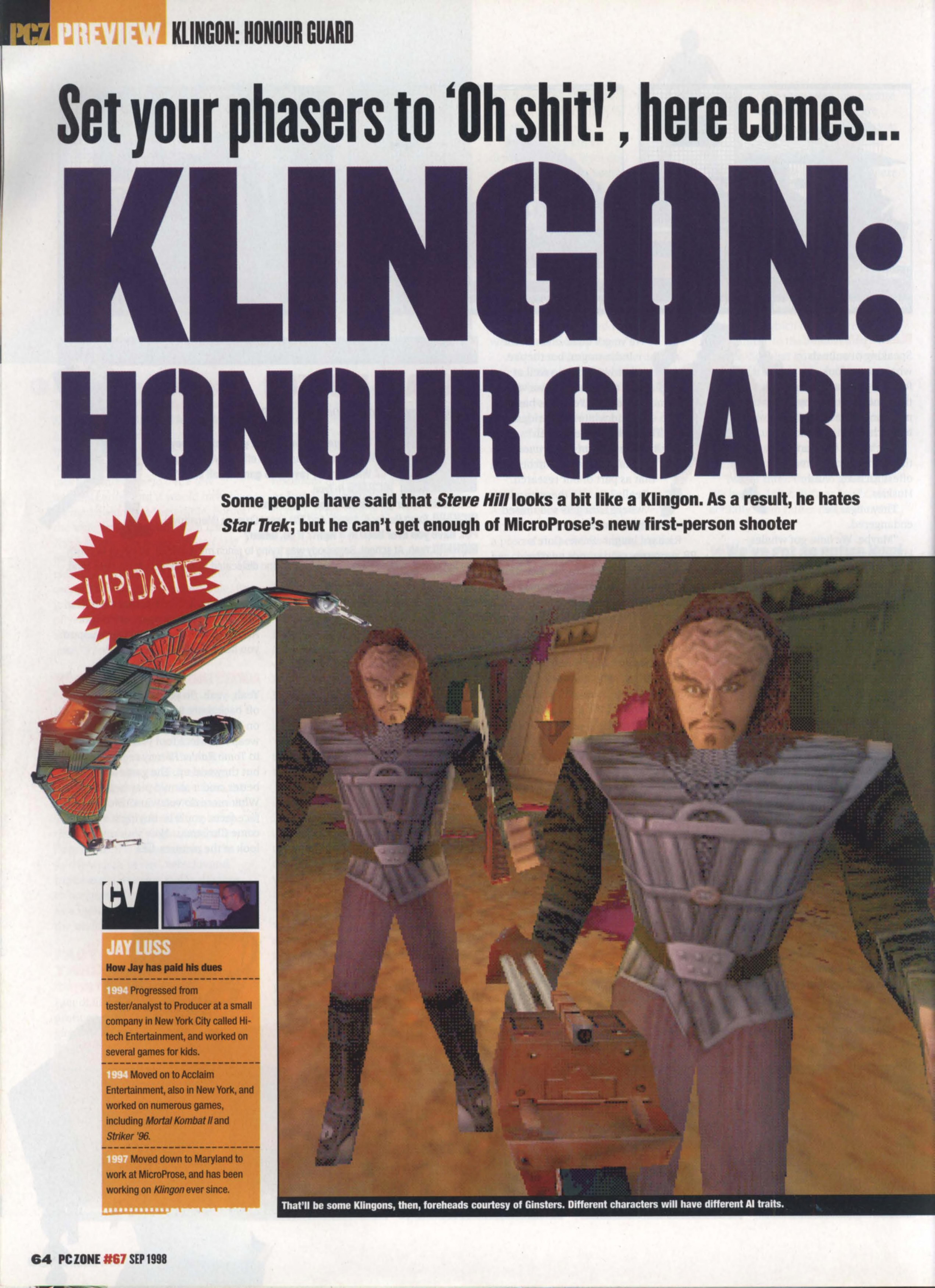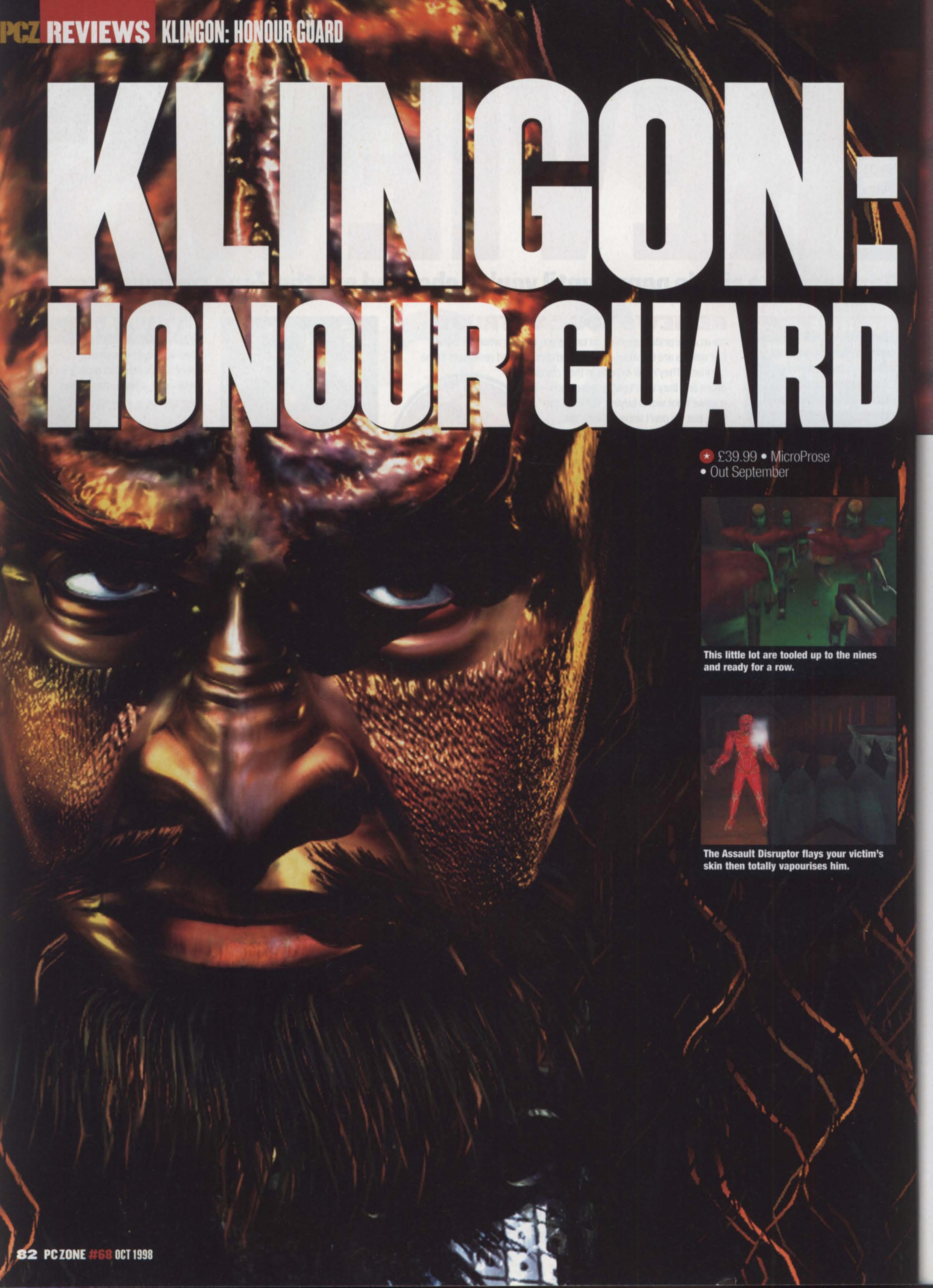 “Set your phasers to ‘Oh shit!’, here comes Klingon Honour Guard. Some people have said that PC Zone writer Steve Hill looks a bit like a Klingon. As a result, he hates Star Trek; but he can’t get enough of MicroProse’s new first-person shooter.”