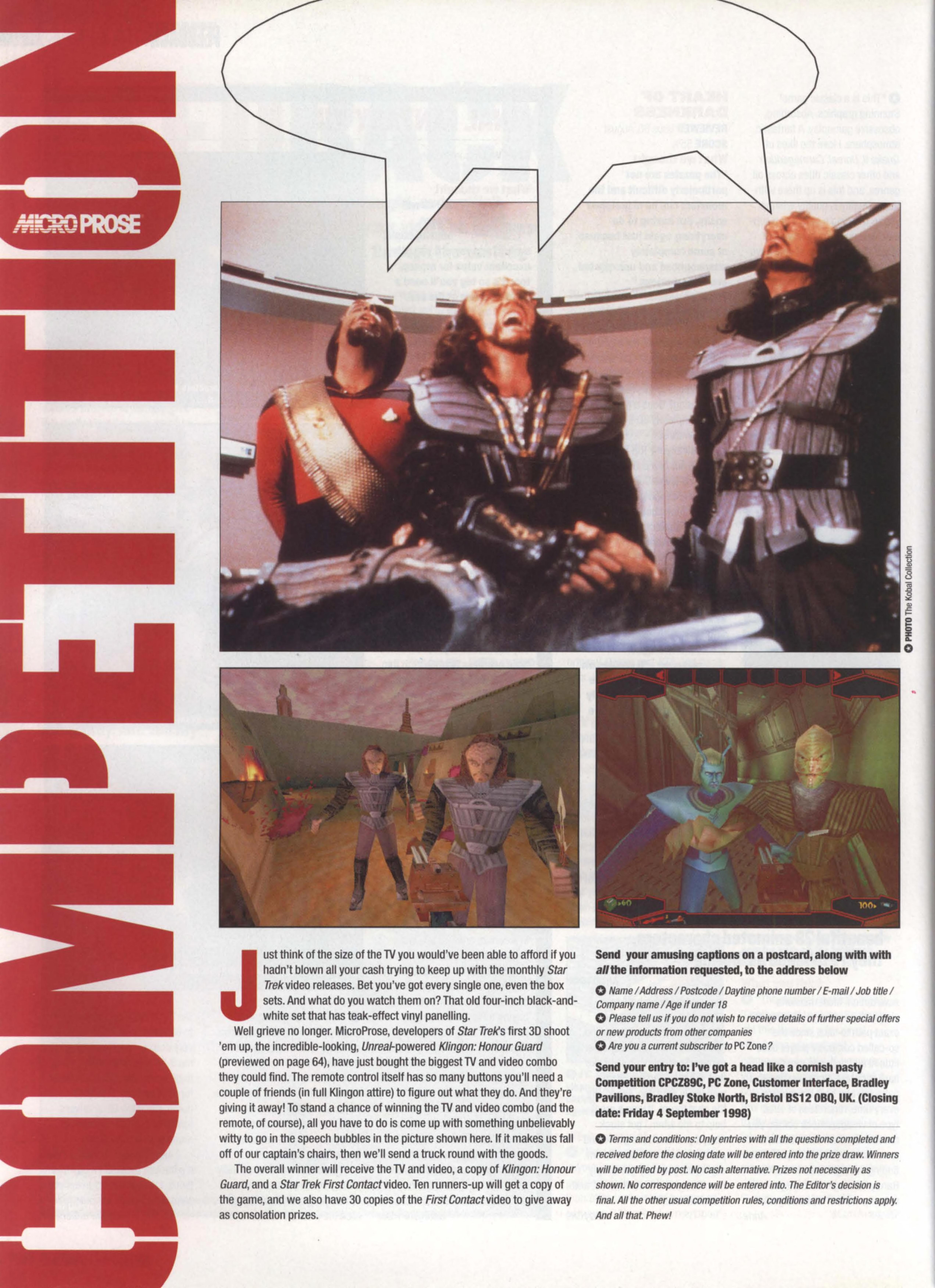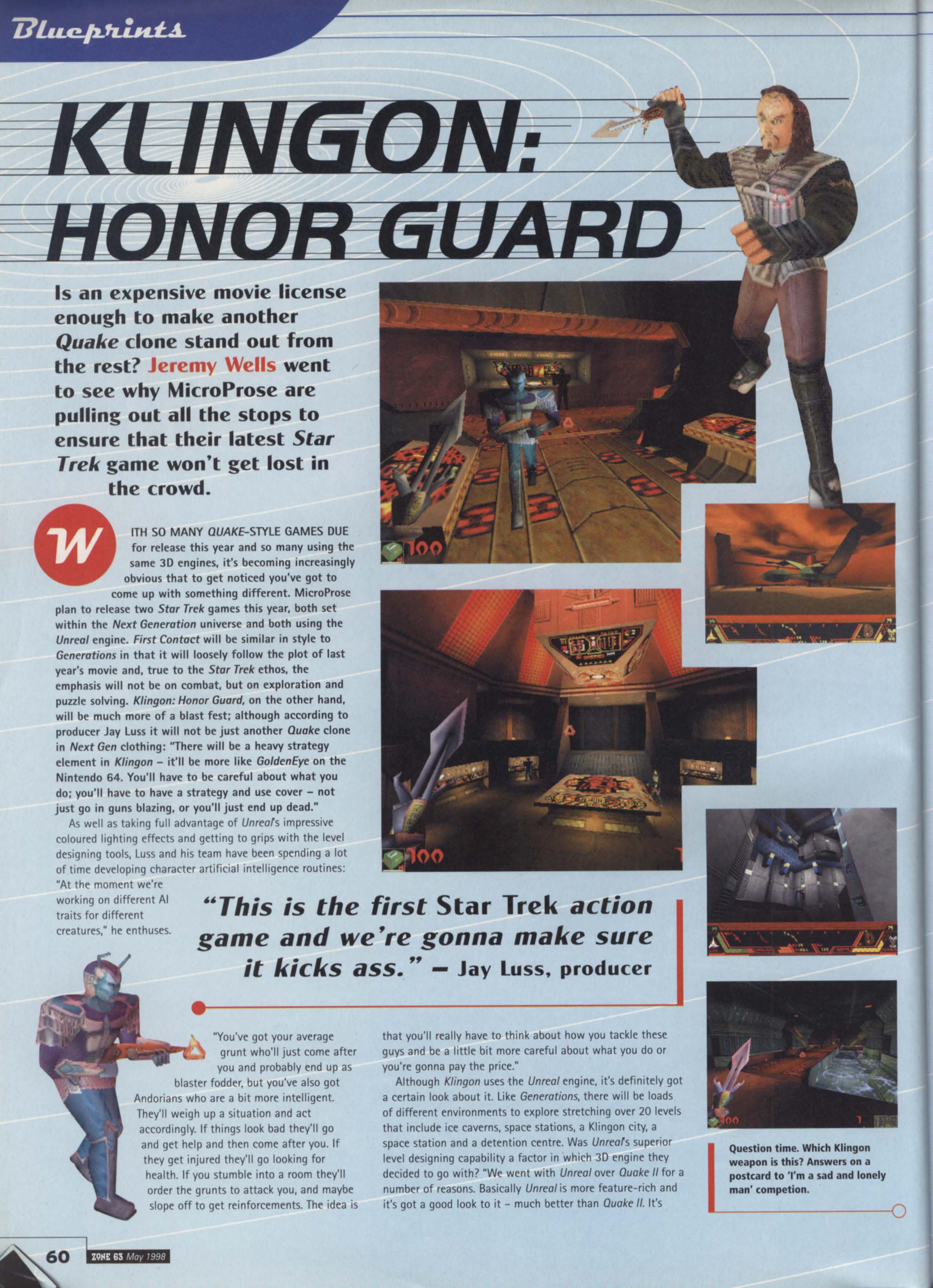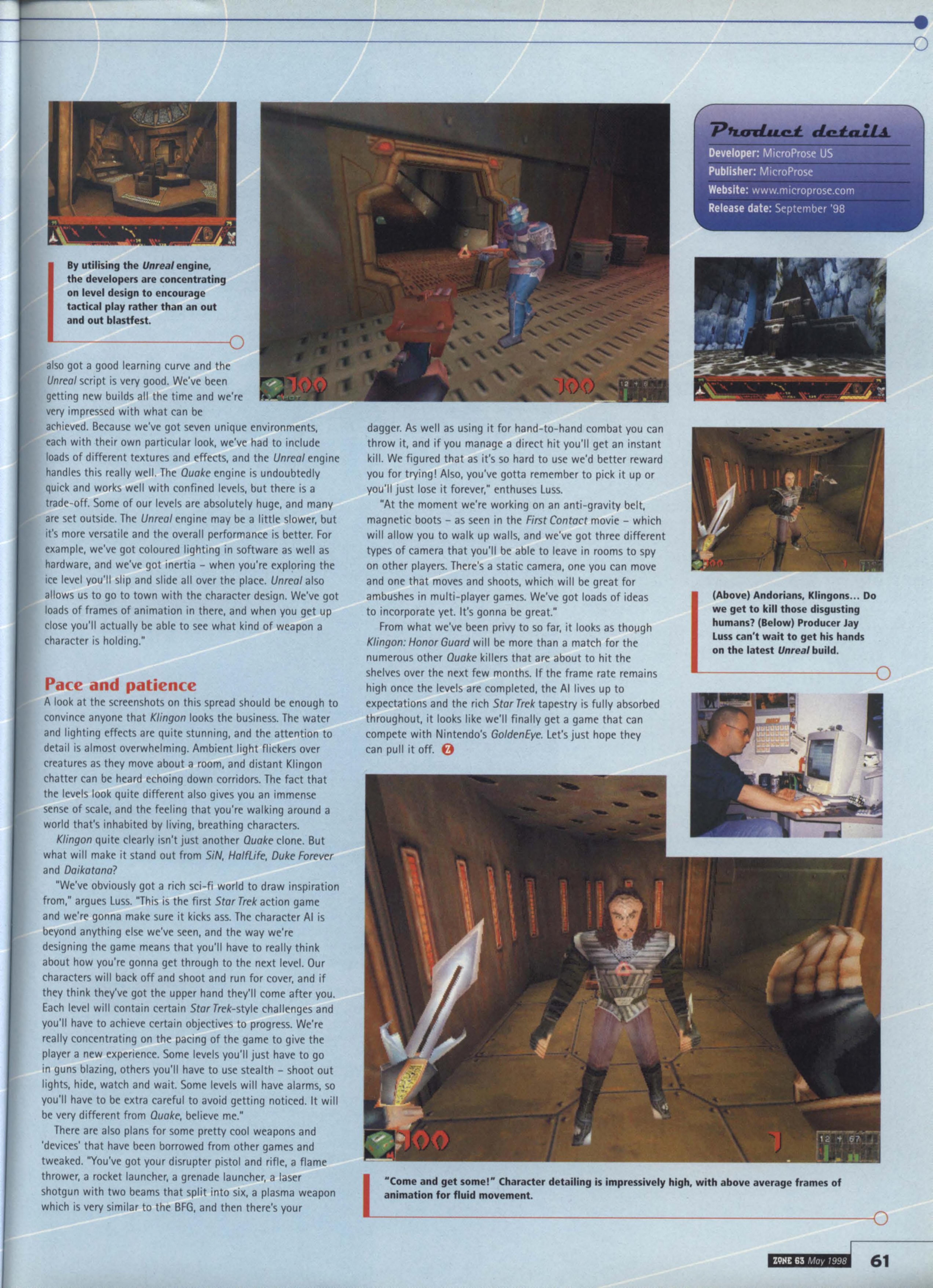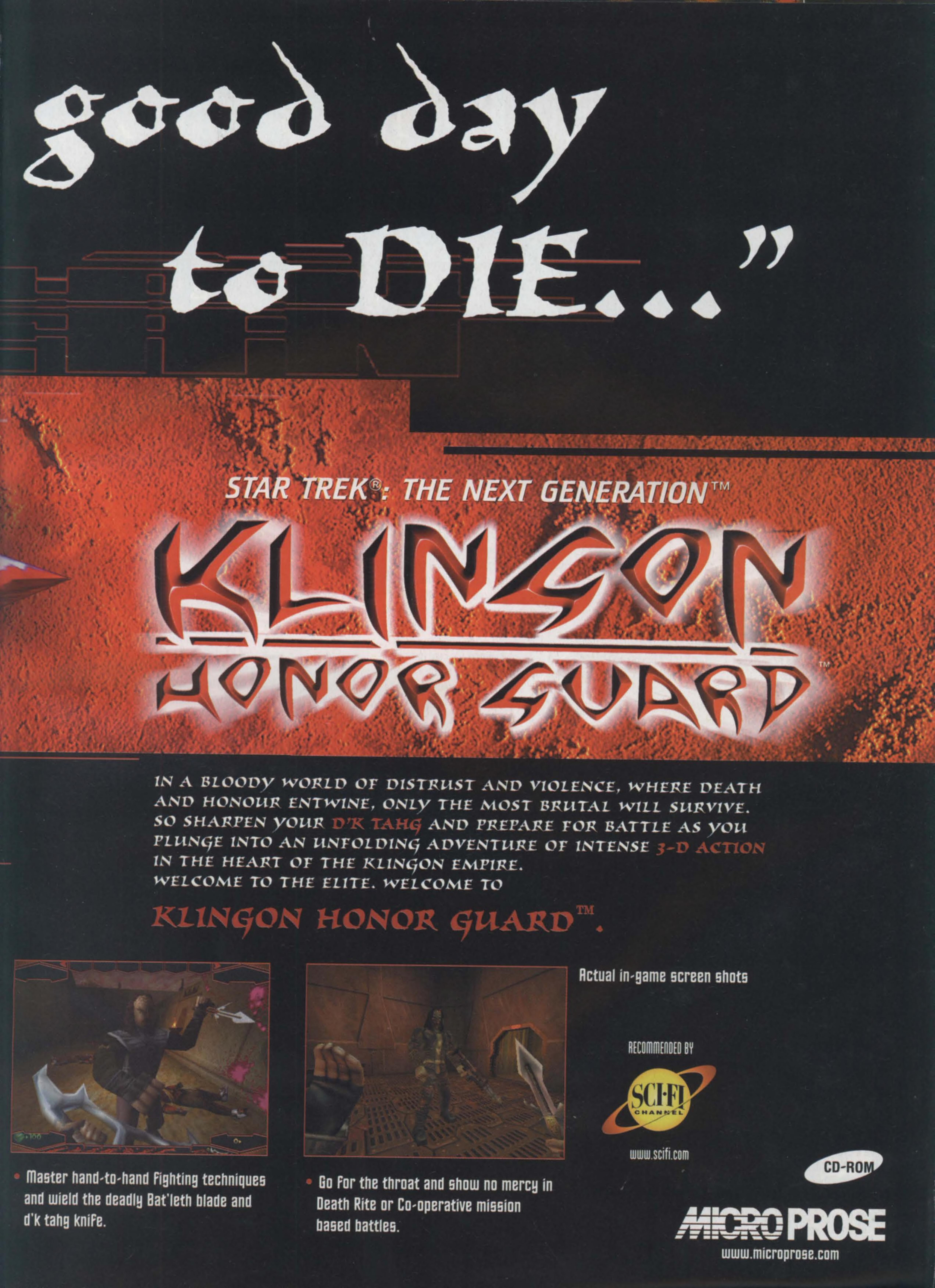 “Set your phasers to ‘Oh shit!’, here comes Klingon Honour Guard. Some people have said that PC Zone writer Steve Hill looks a bit like a Klingon. As a result, he hates Star Trek; but he can’t get enough of MicroProse’s new first-person shooter.”
