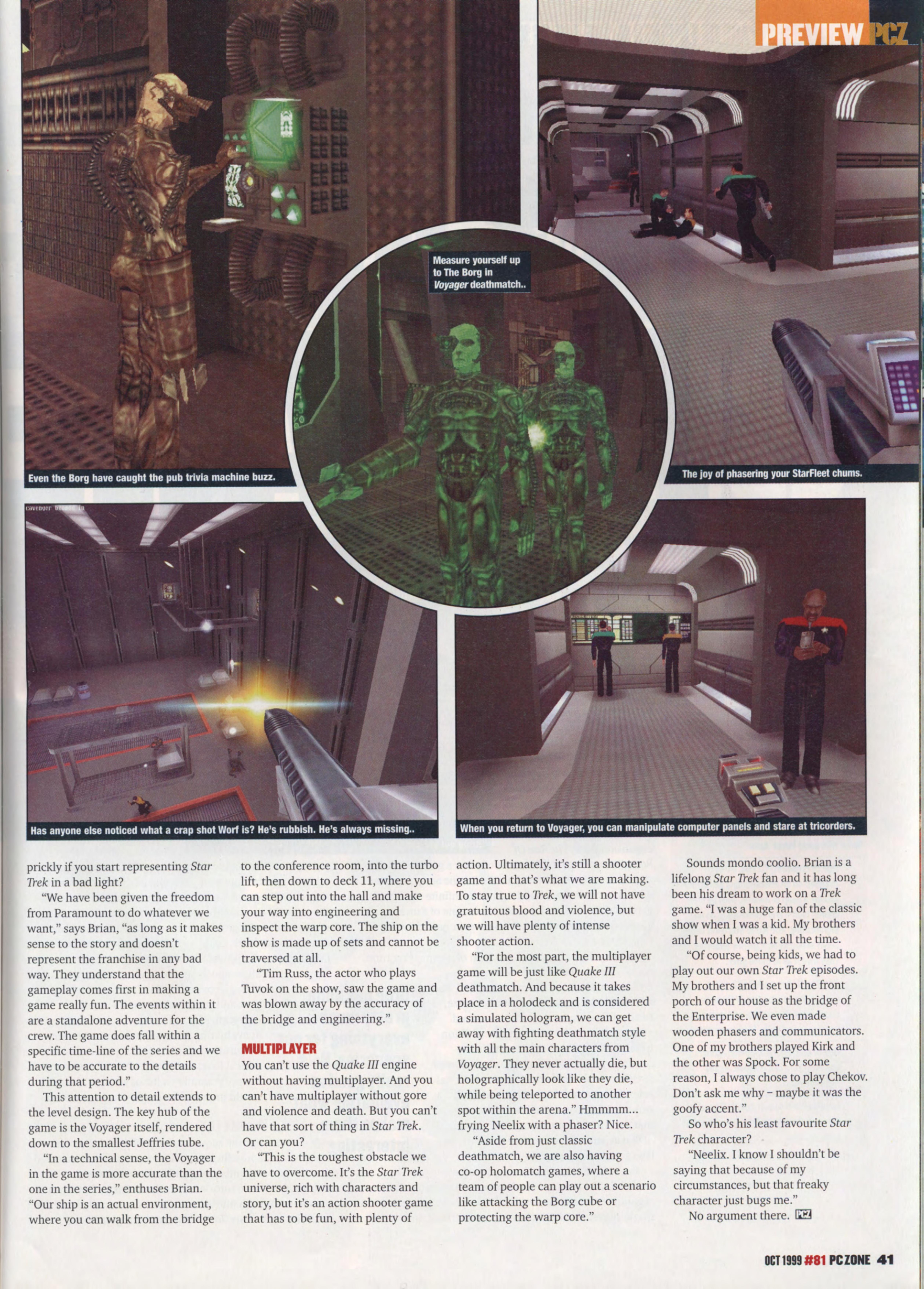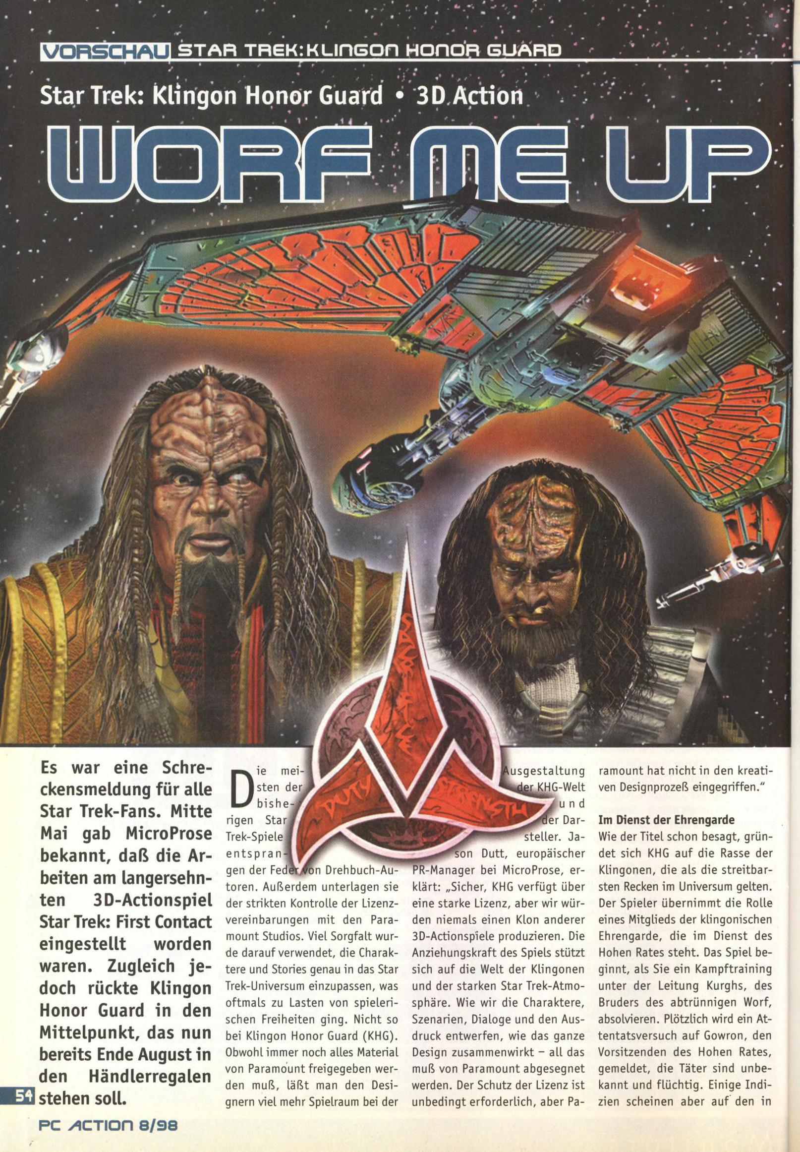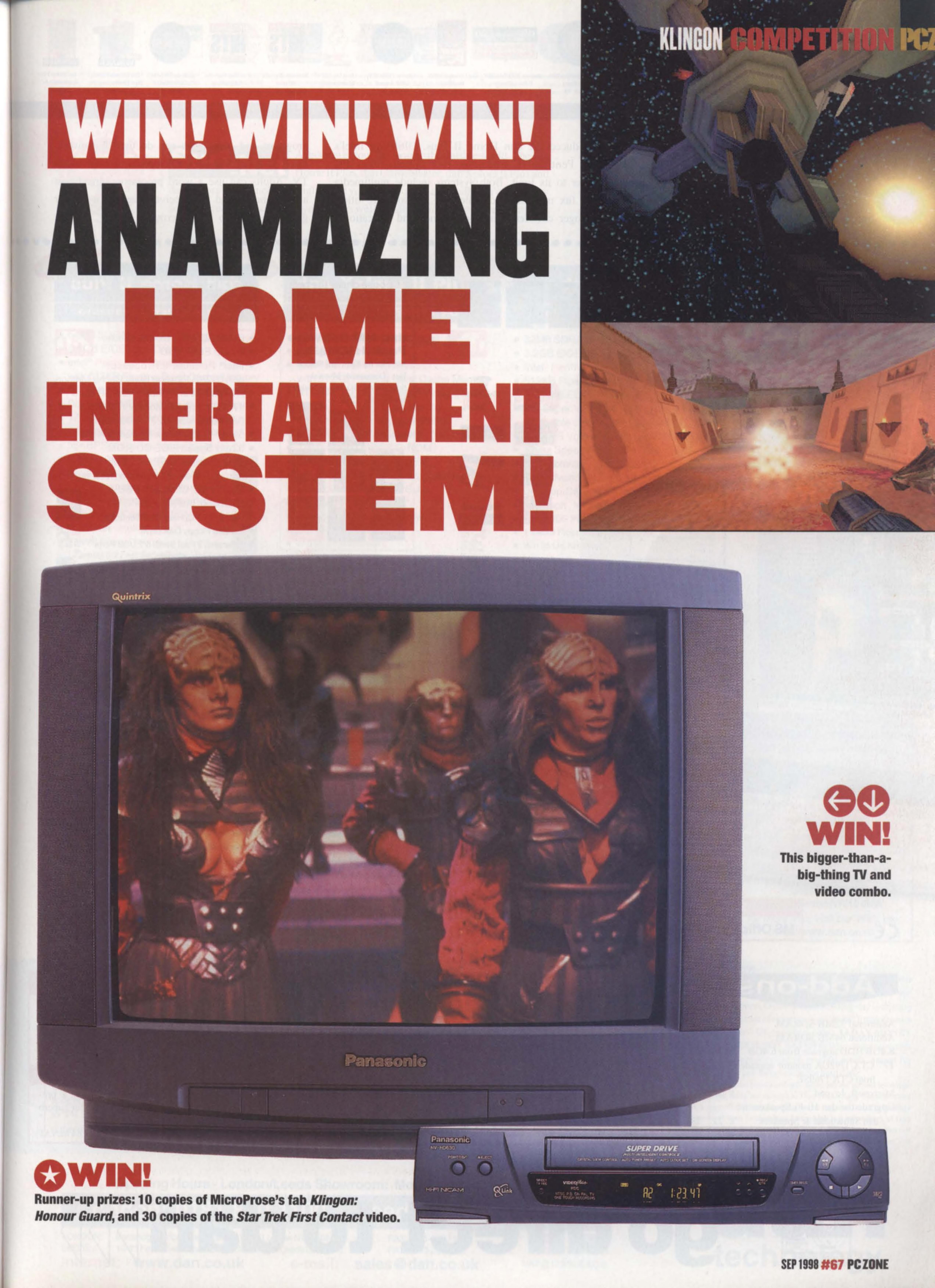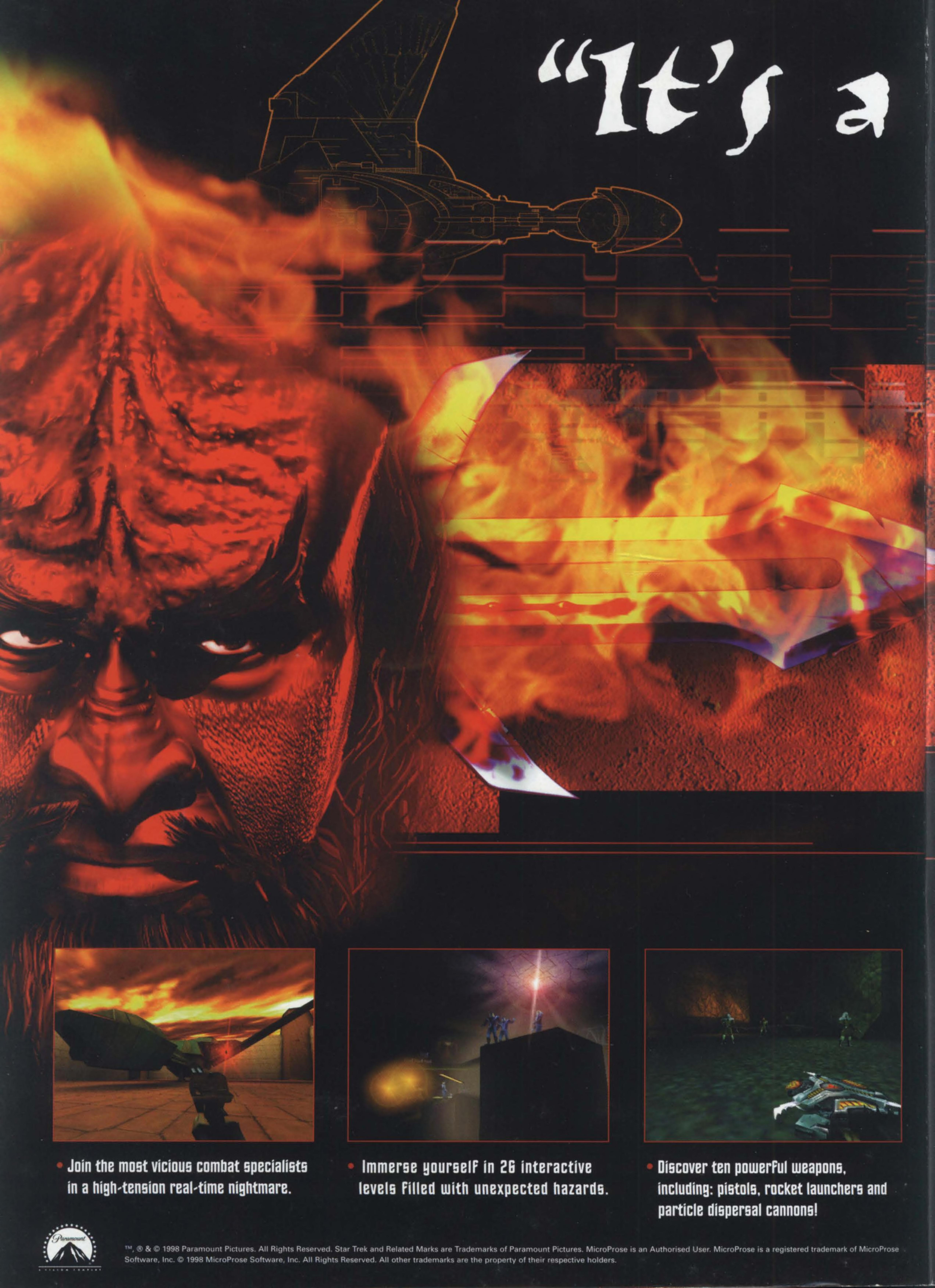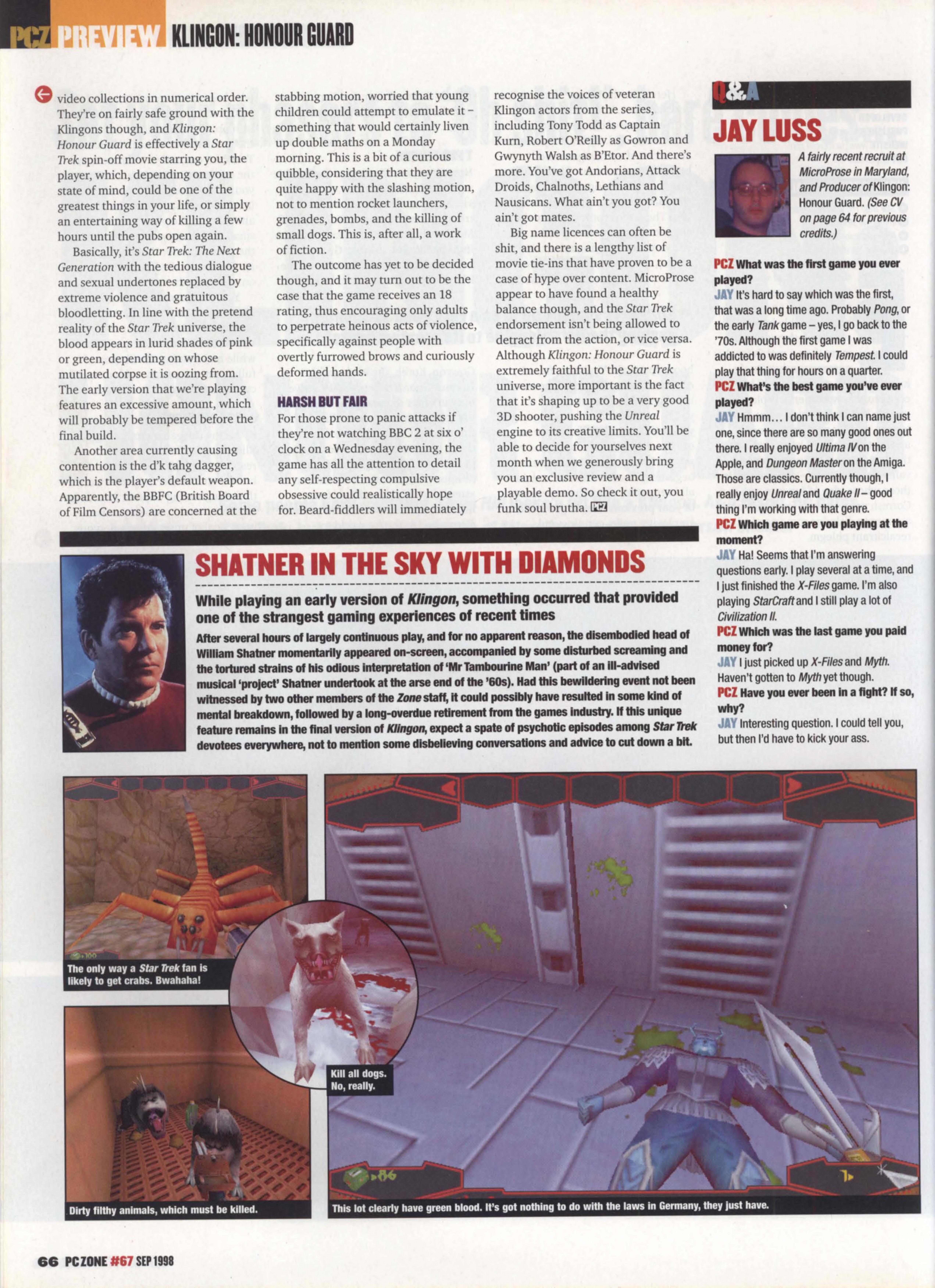 “Set your phasers to ‘Oh shit!’, here comes Klingon Honour Guard. Some people have said that PC Zone writer Steve Hill looks a bit like a Klingon. As a result, he hates Star Trek; but he can’t get enough of MicroProse’s new first-person shooter.”