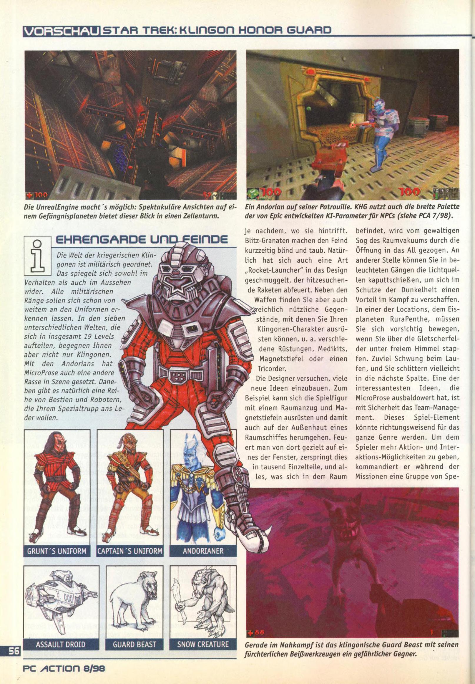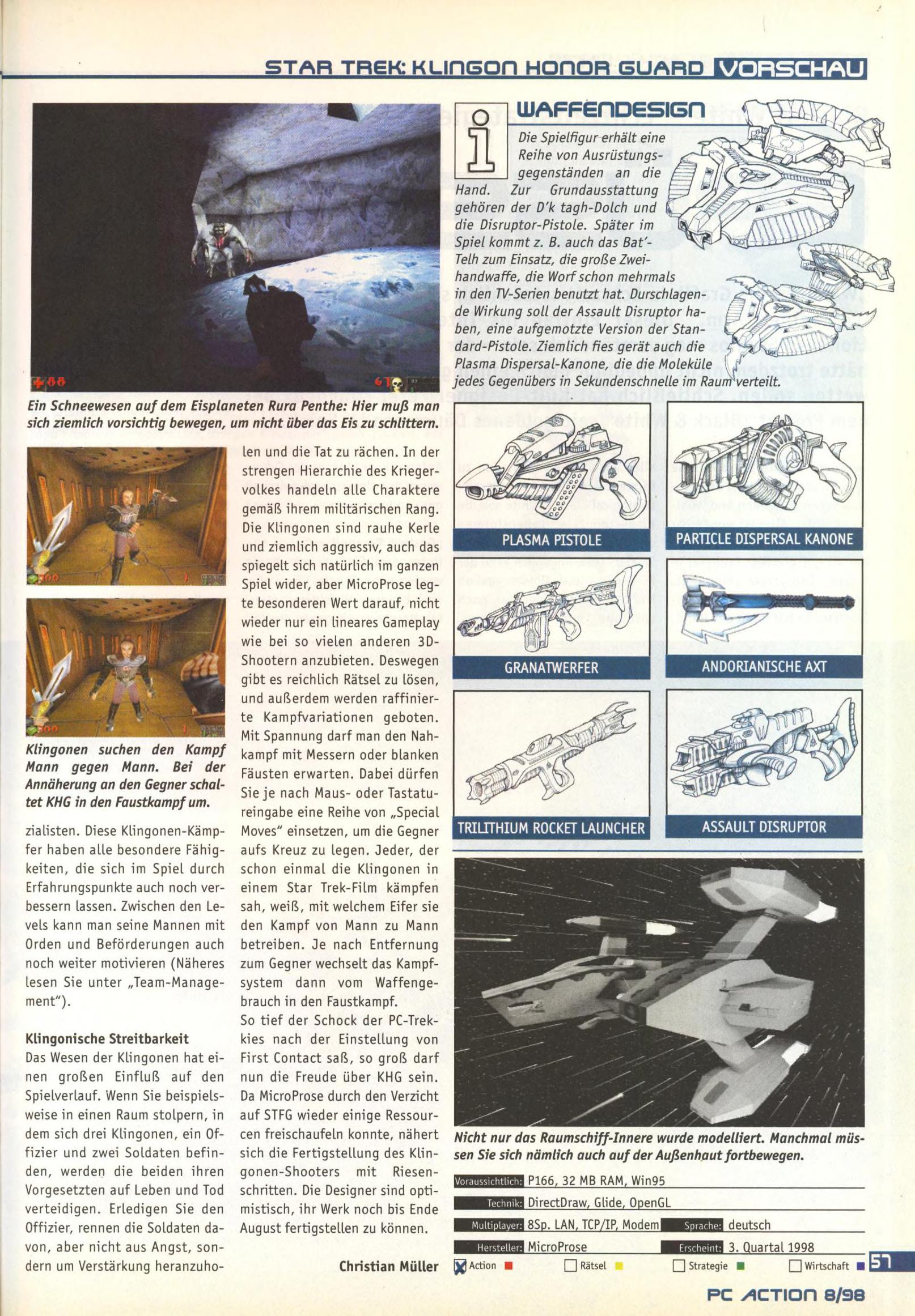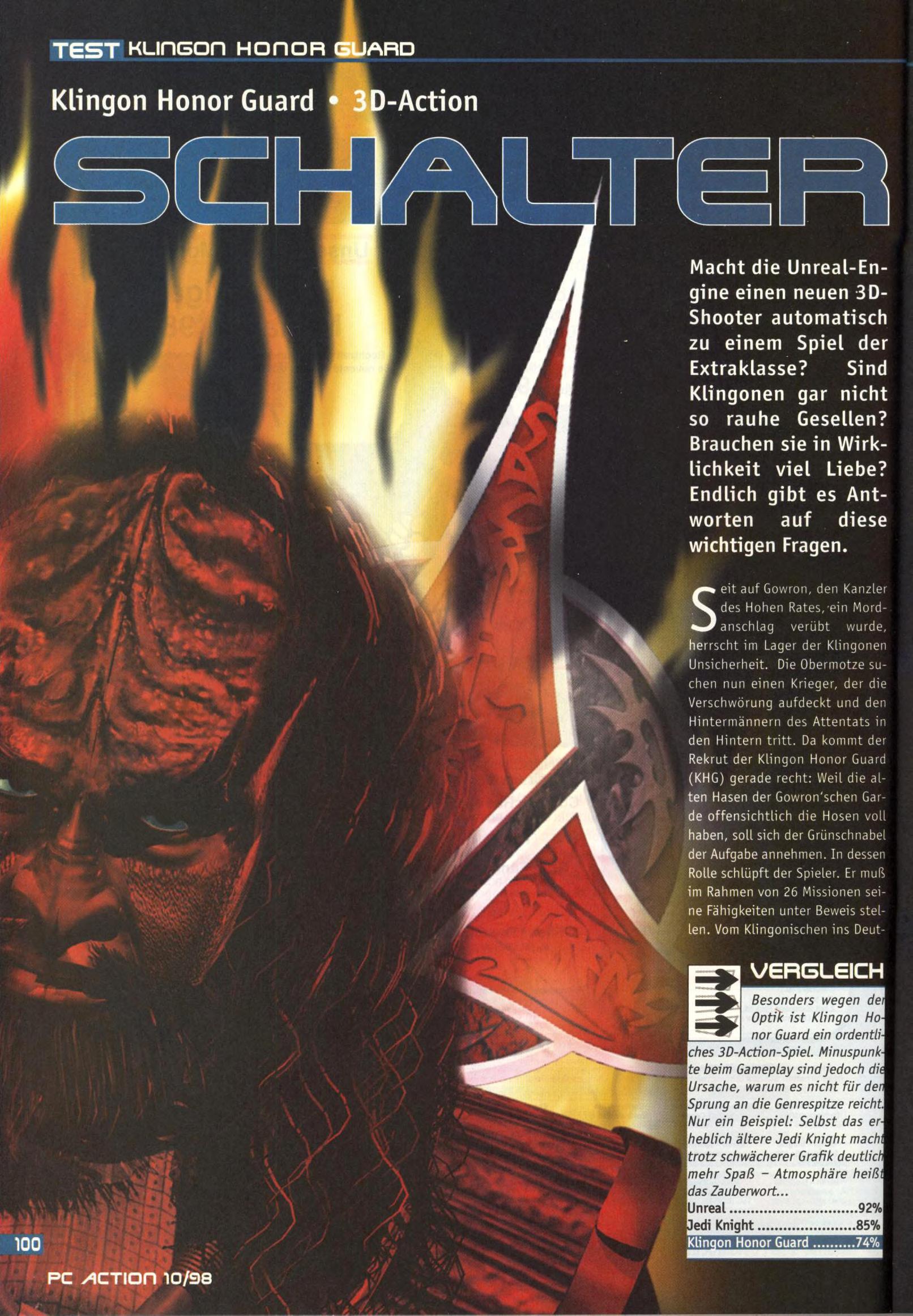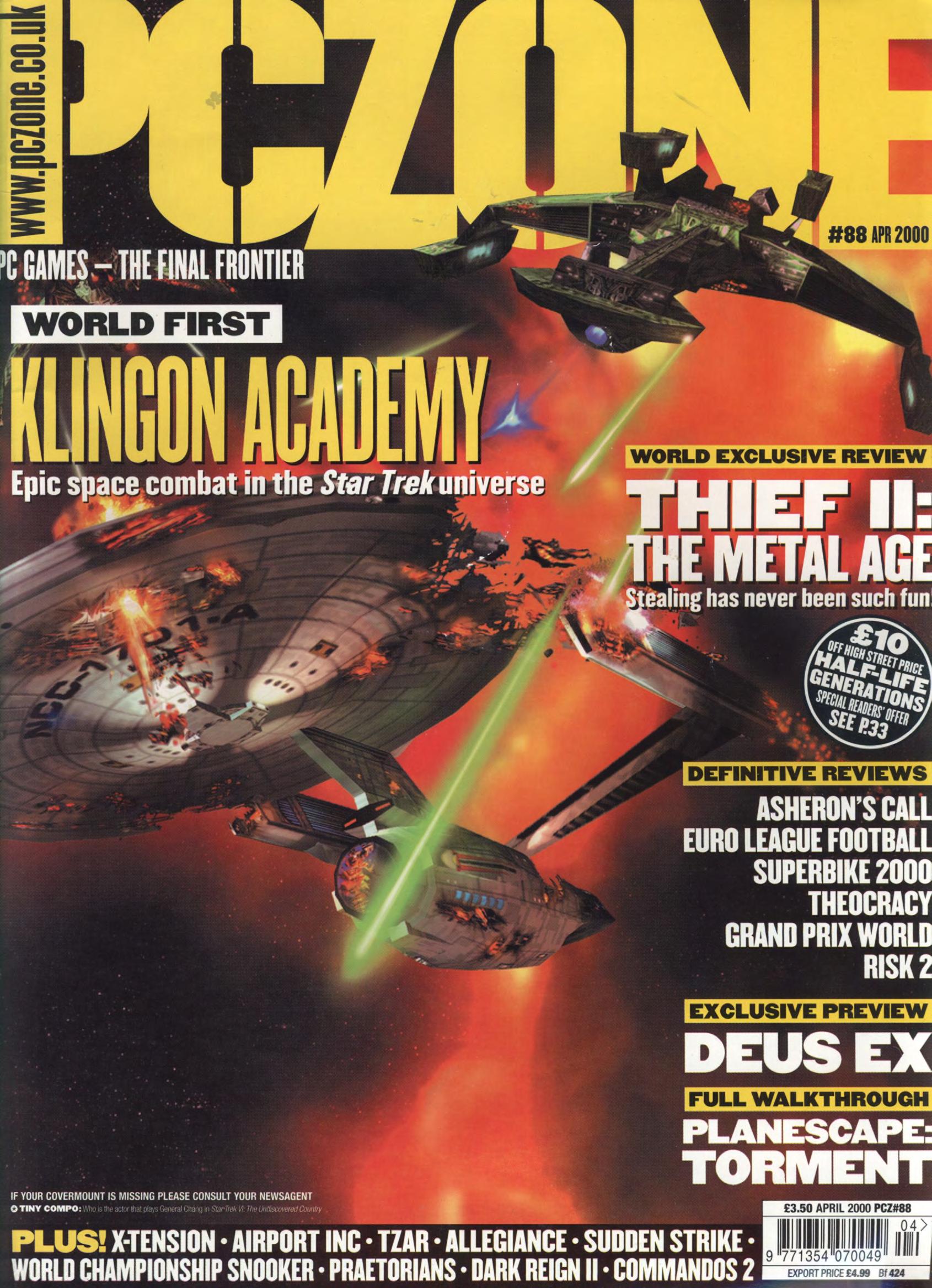 “Set your phasers to ‘Oh shit!’, here comes Klingon Honour Guard. Some people have said that PC Zone writer Steve Hill looks a bit like a Klingon. As a result, he hates Star Trek; but he can’t get enough of MicroProse’s new first-person shooter.”