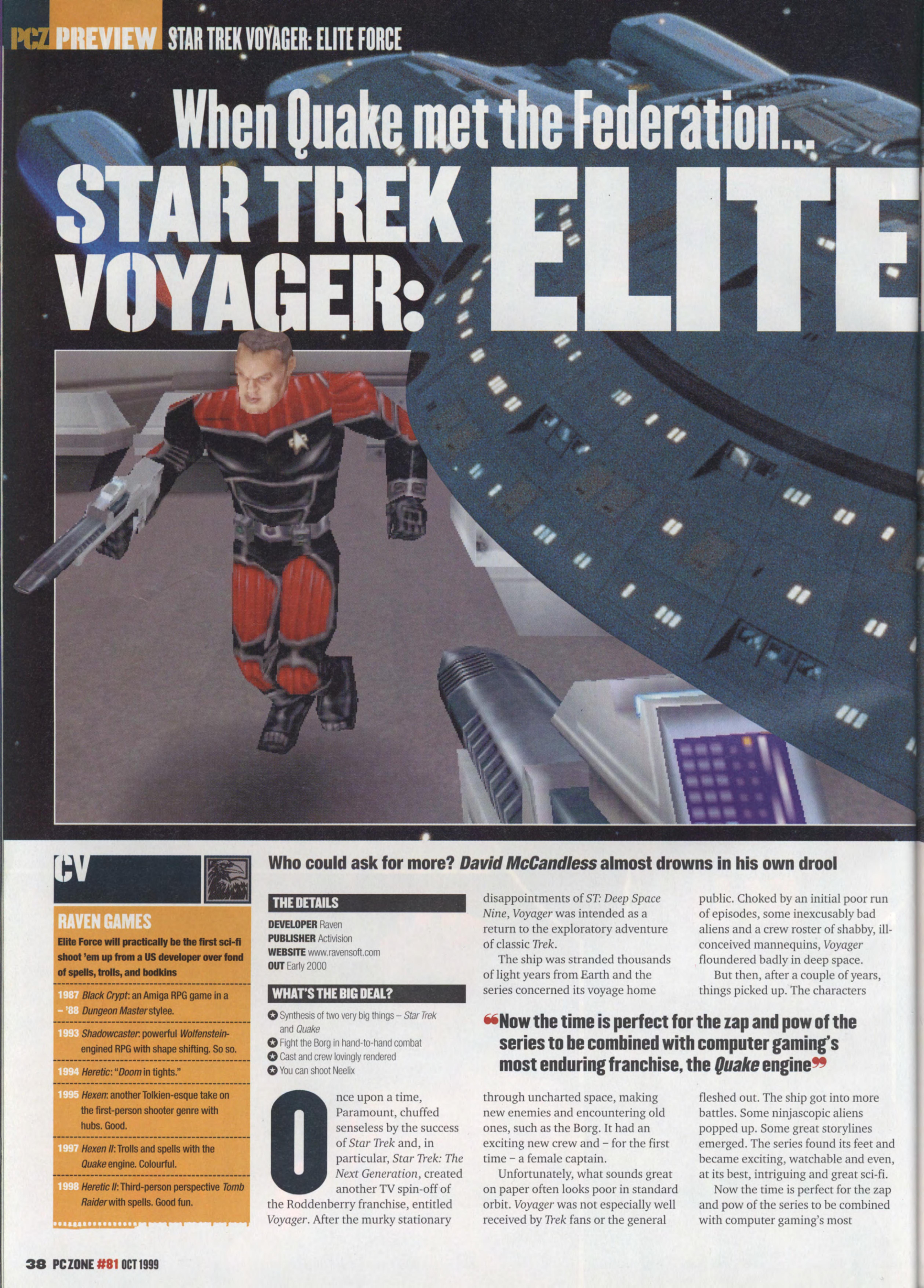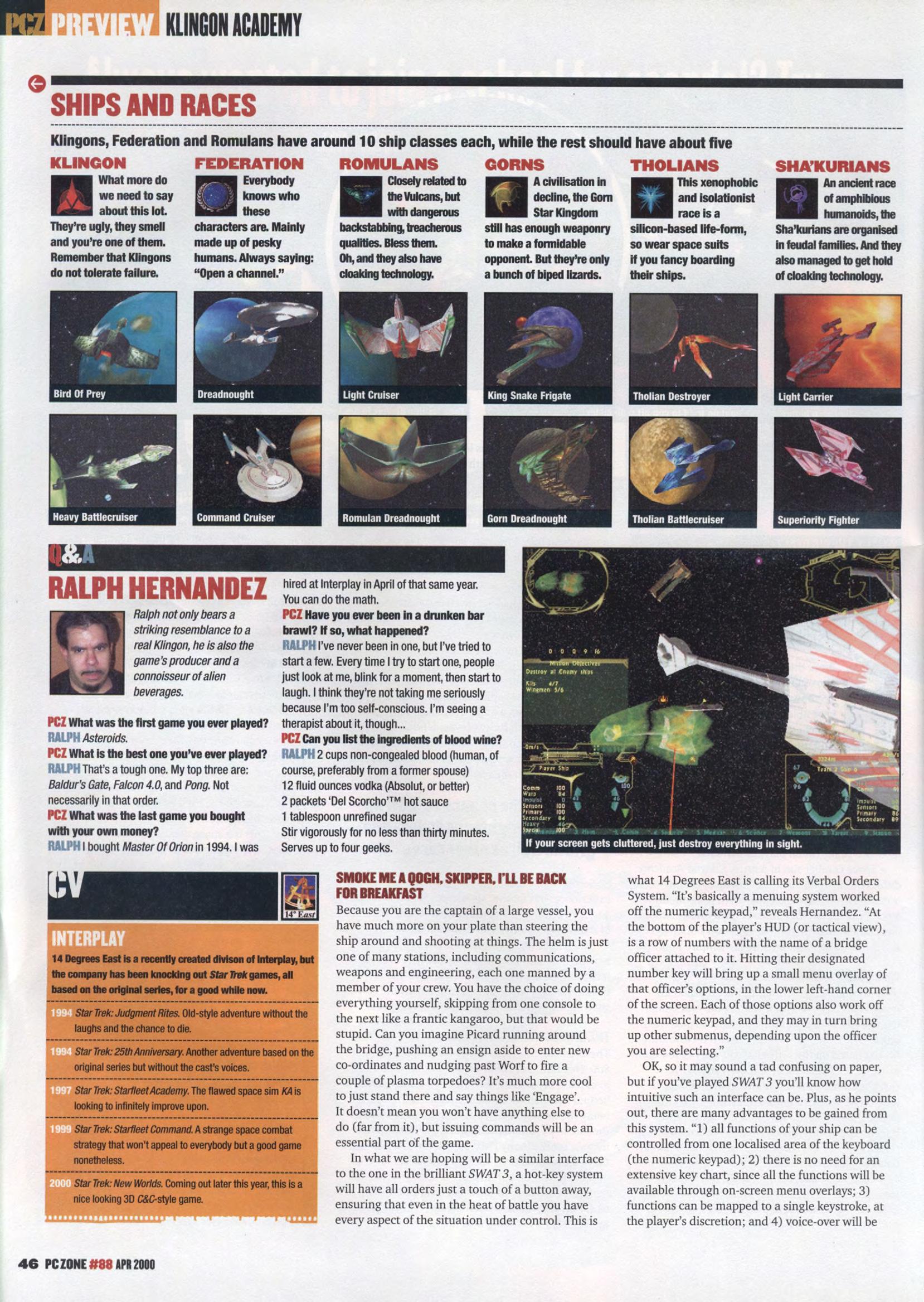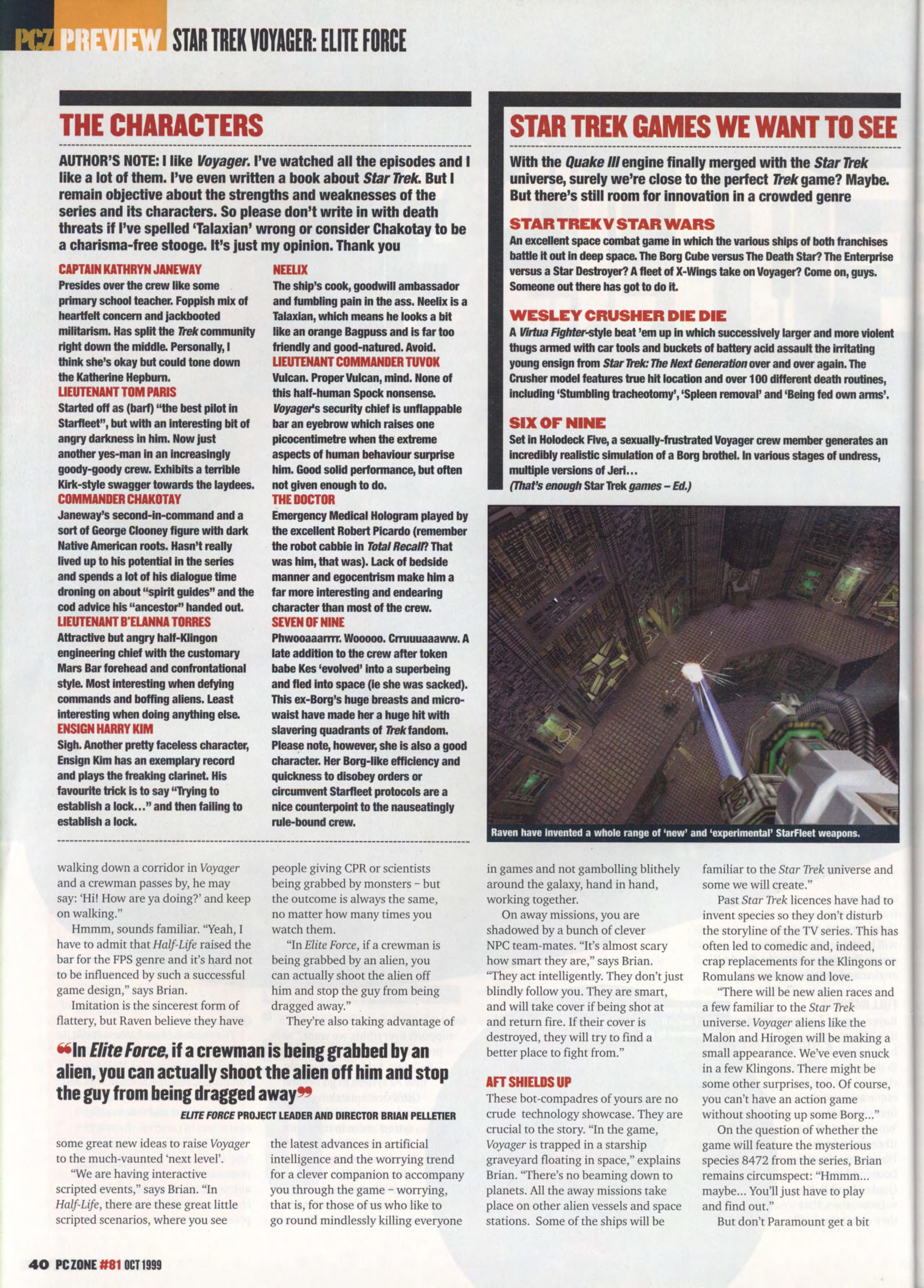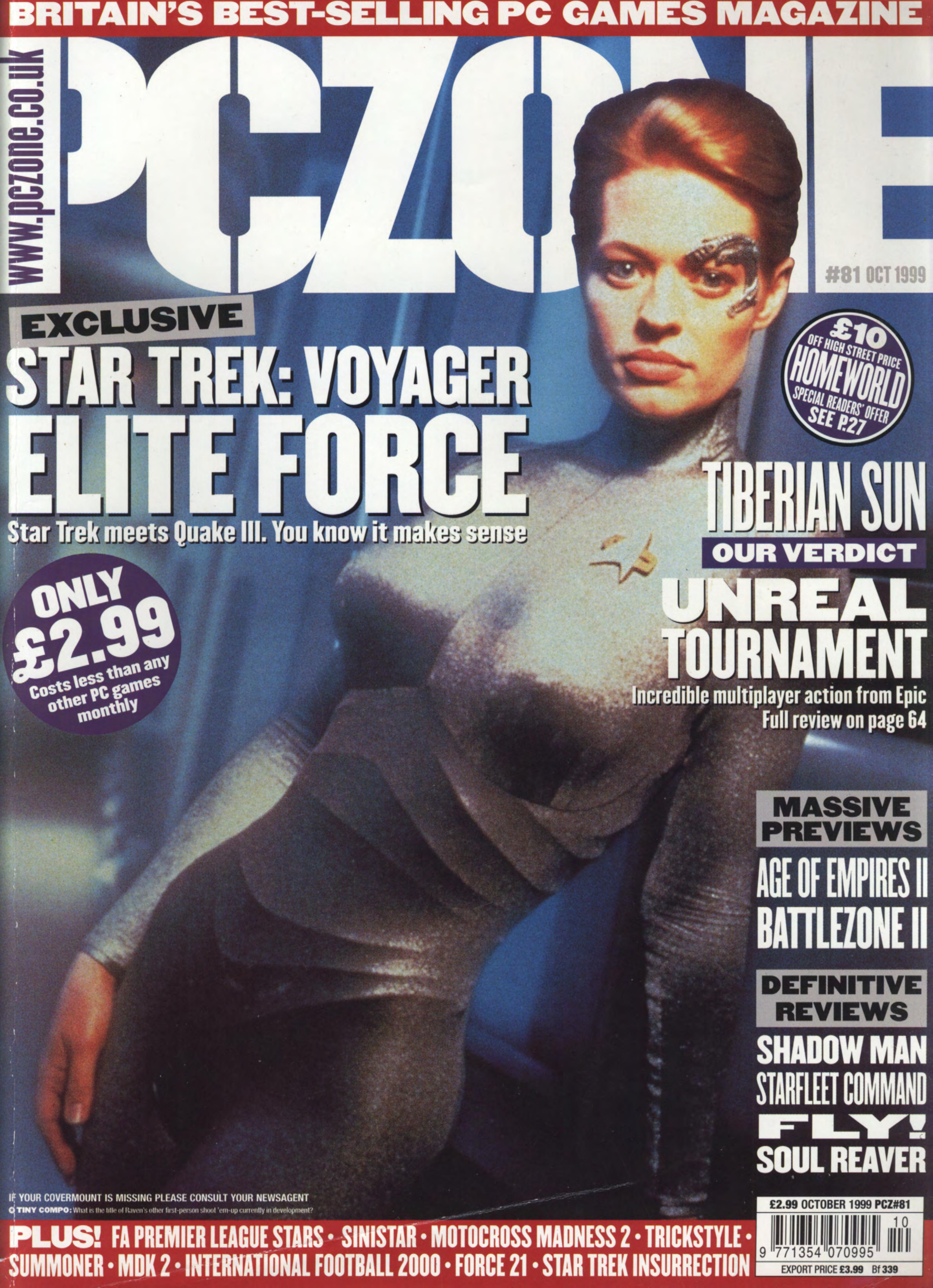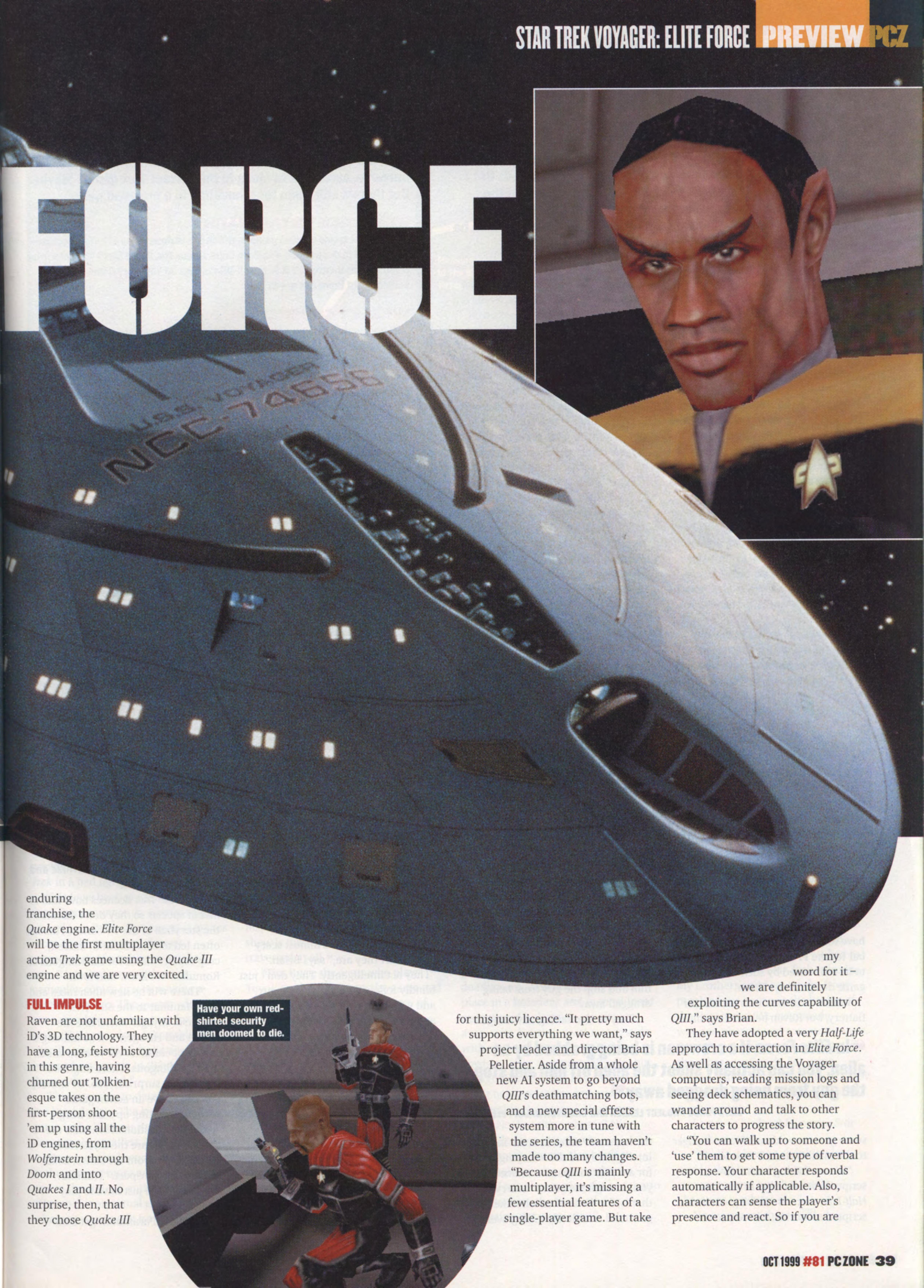 “Set your phasers to ‘Oh shit!’, here comes Klingon Honour Guard. Some people have said that PC Zone writer Steve Hill looks a bit like a Klingon. As a result, he hates Star Trek; but he can’t get enough of MicroProse’s new first-person shooter.”