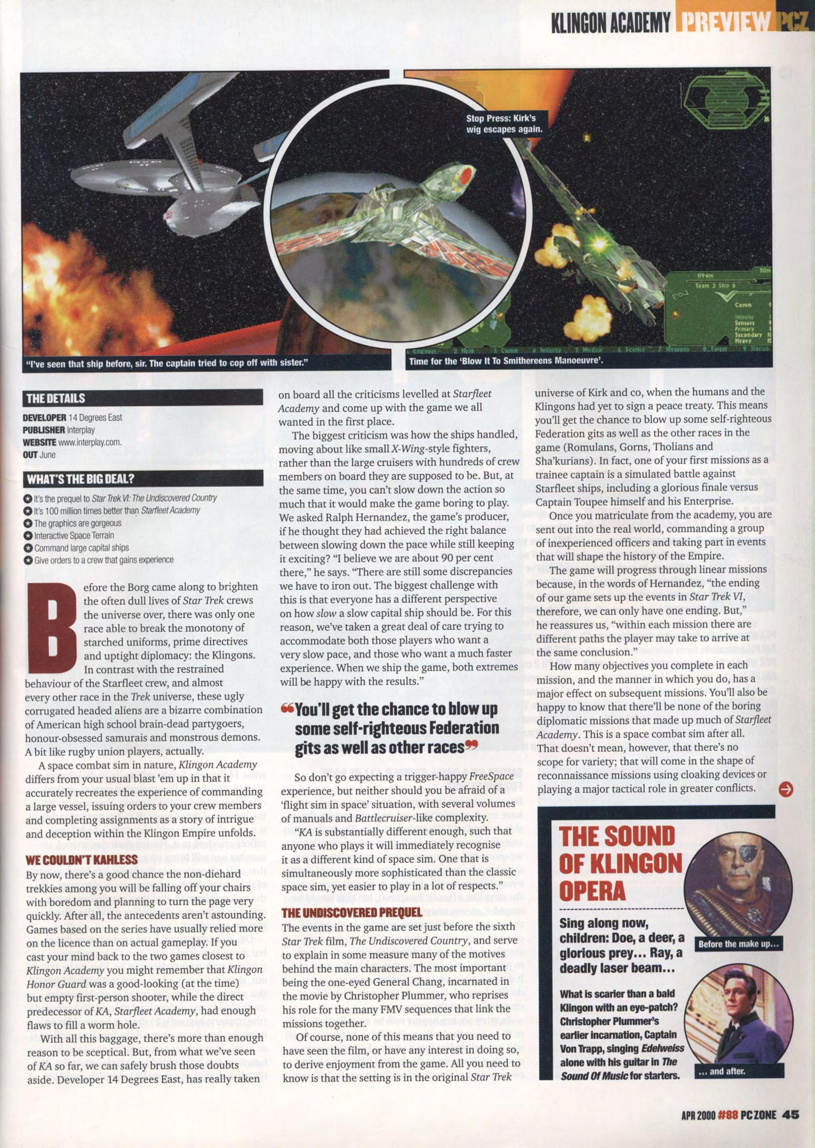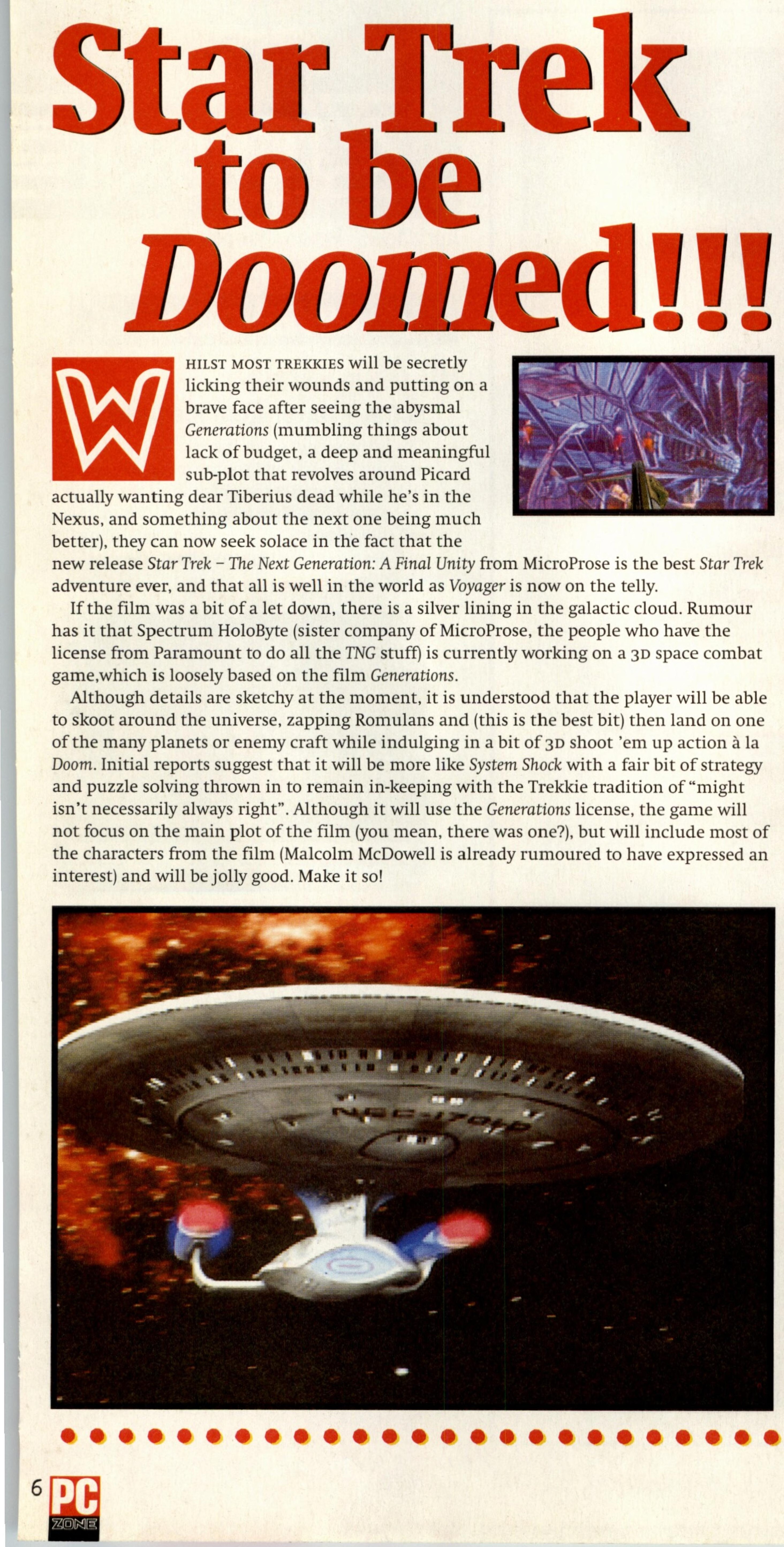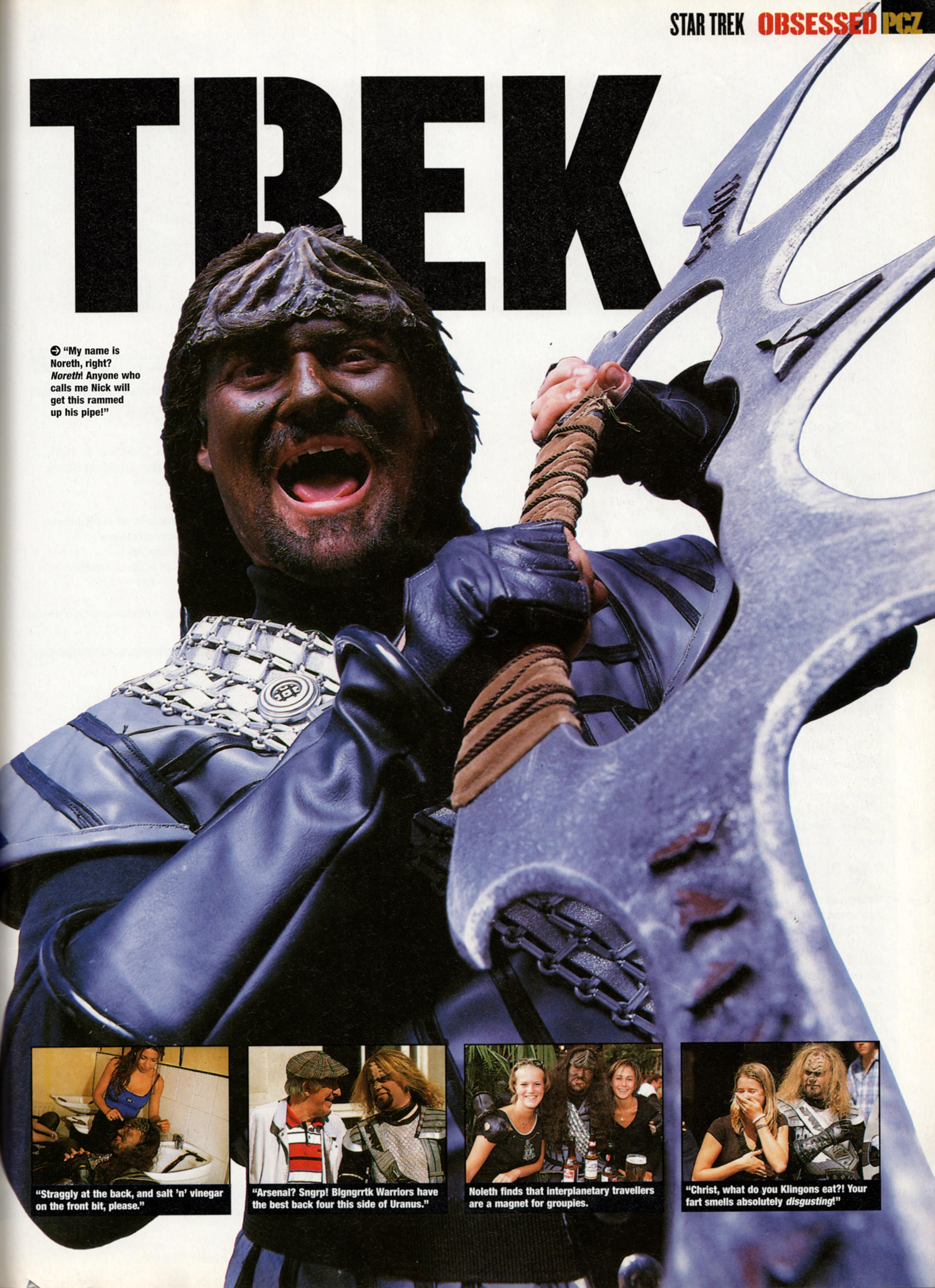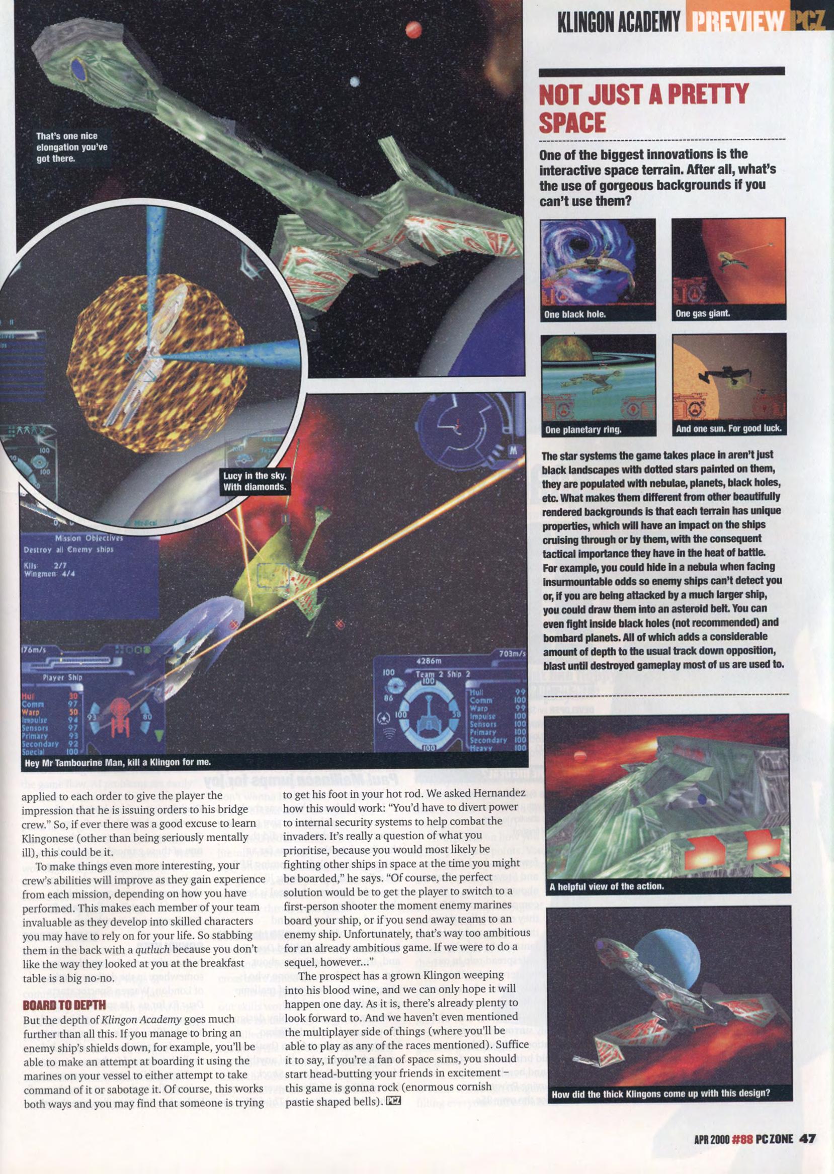 “Set your phasers to ‘Oh shit!’, here comes Klingon Honour Guard. Some people have said that PC Zone writer Steve Hill looks a bit like a Klingon. As a result, he hates Star Trek; but he can’t get enough of MicroProse’s new first-person shooter.”