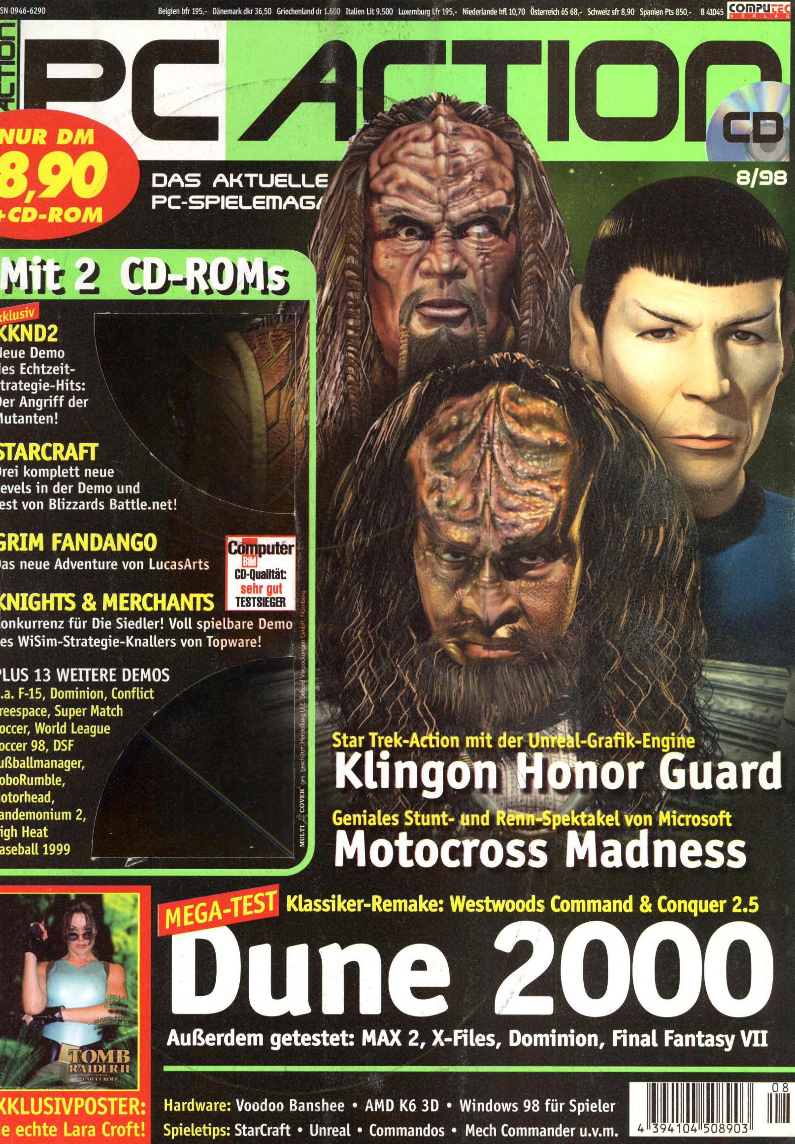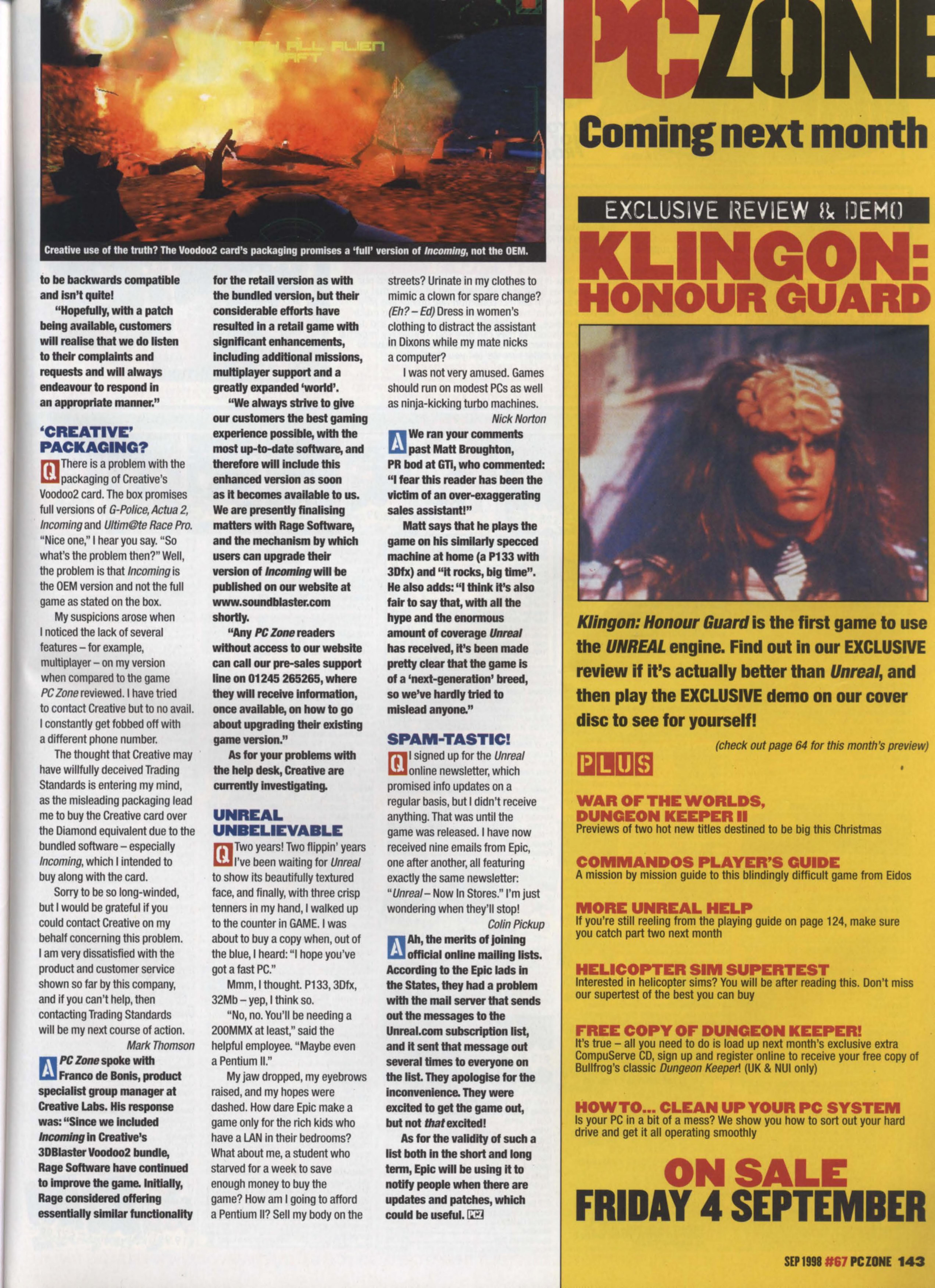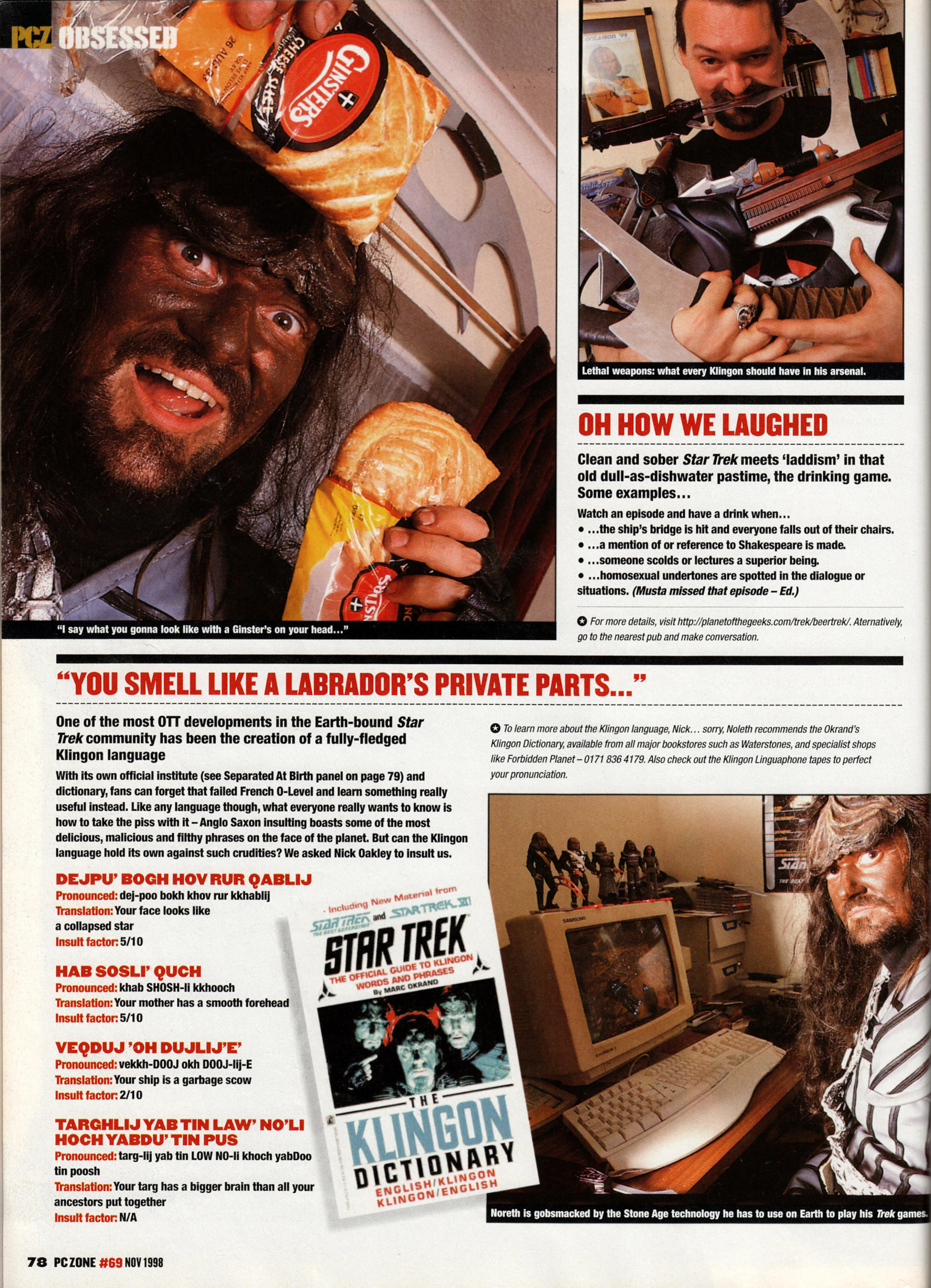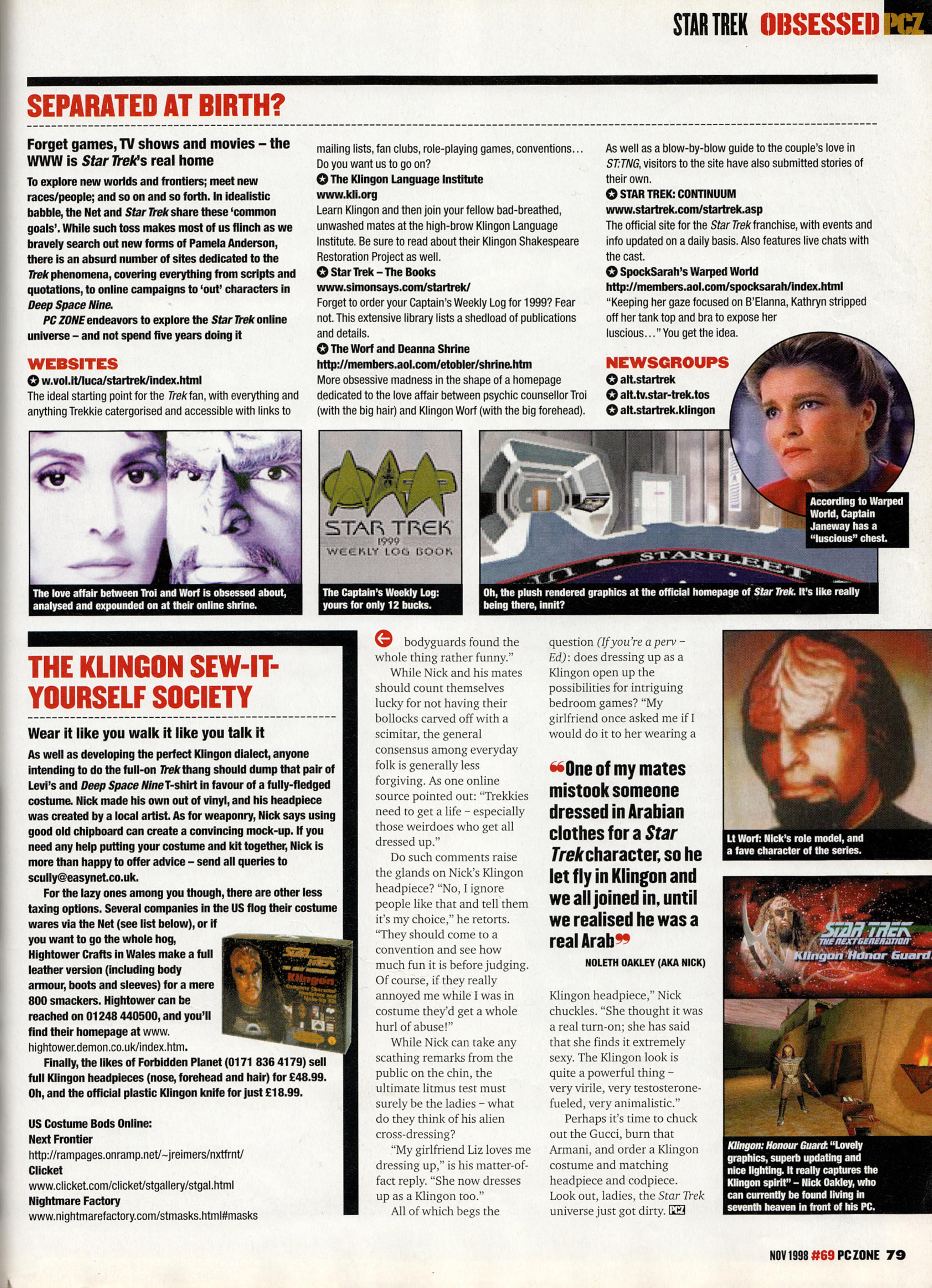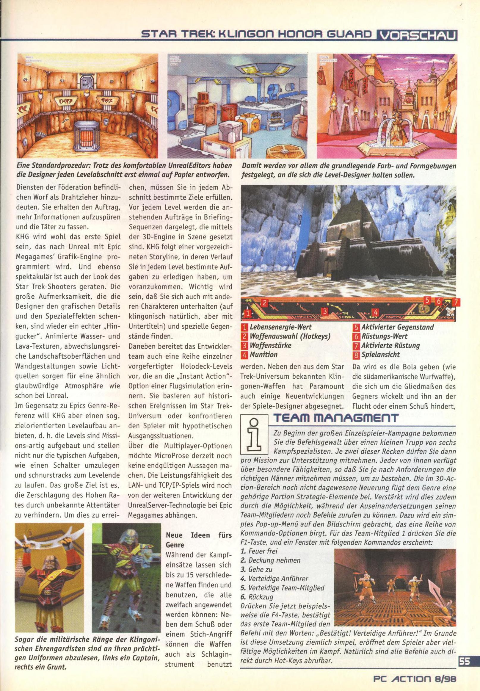 “Set your phasers to ‘Oh shit!’, here comes Klingon Honour Guard. Some people have said that PC Zone writer Steve Hill looks a bit like a Klingon. As a result, he hates Star Trek; but he can’t get enough of MicroProse’s new first-person shooter.”
