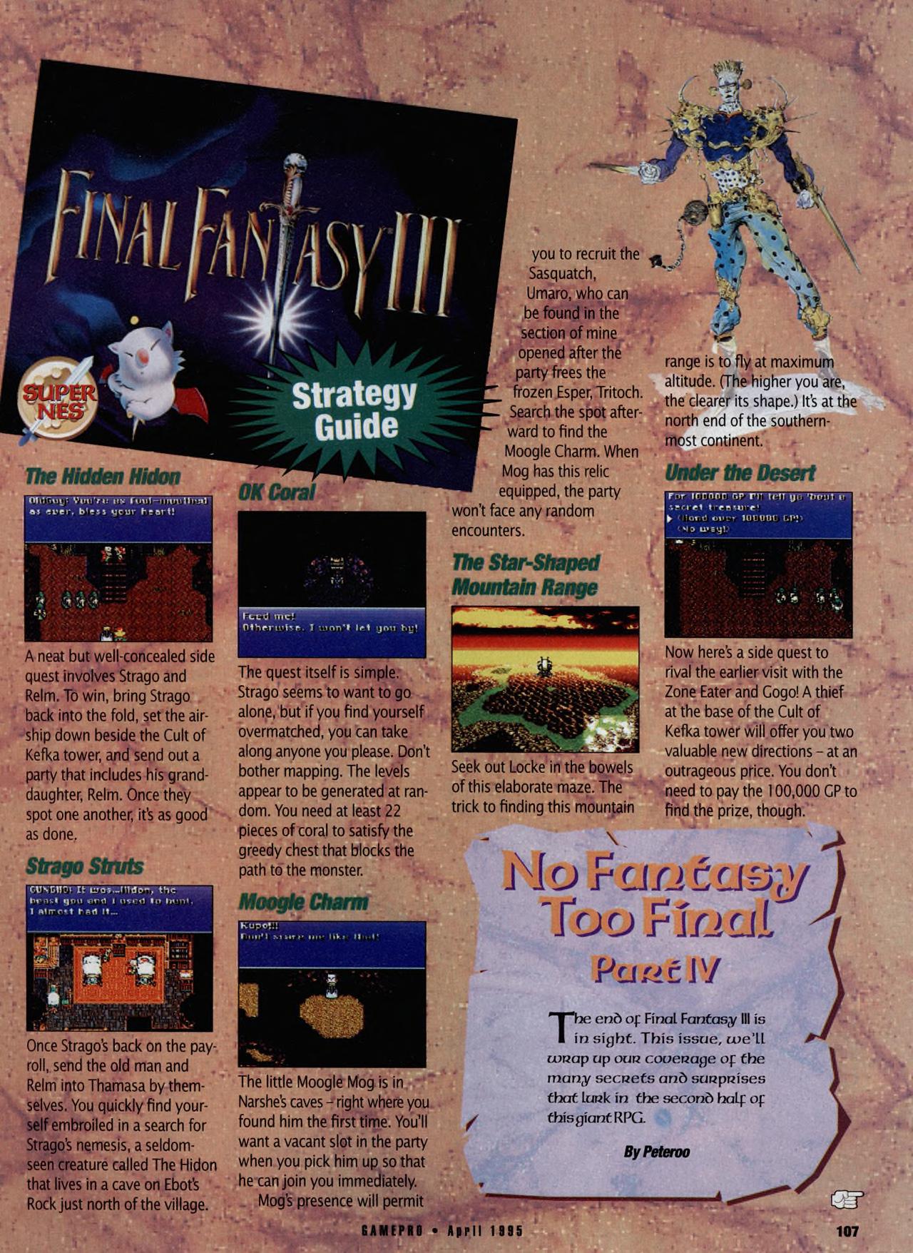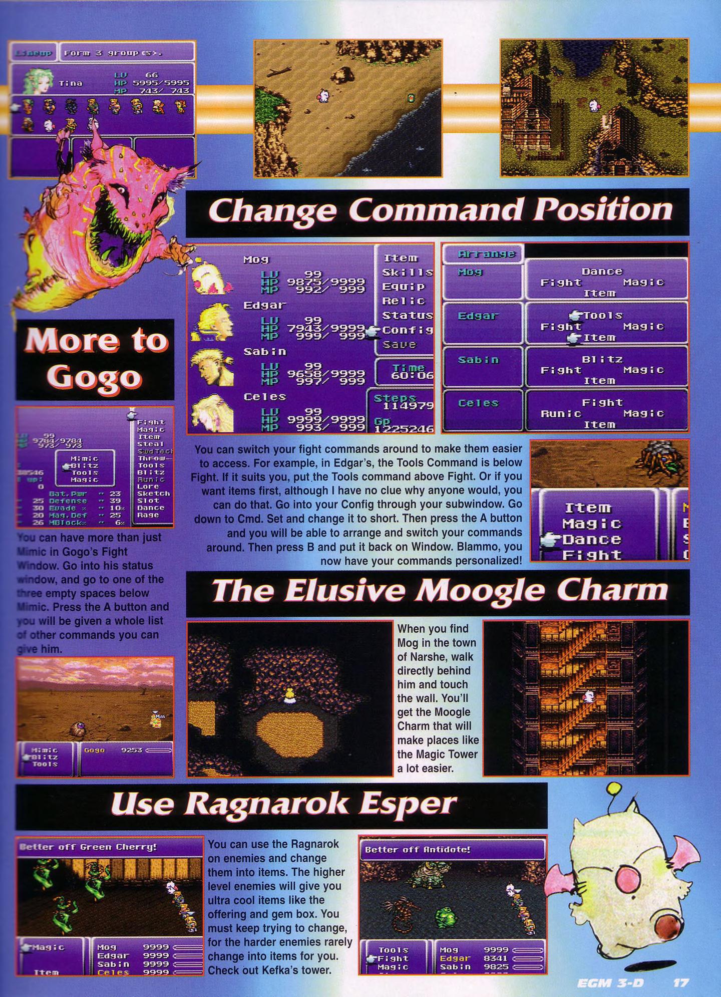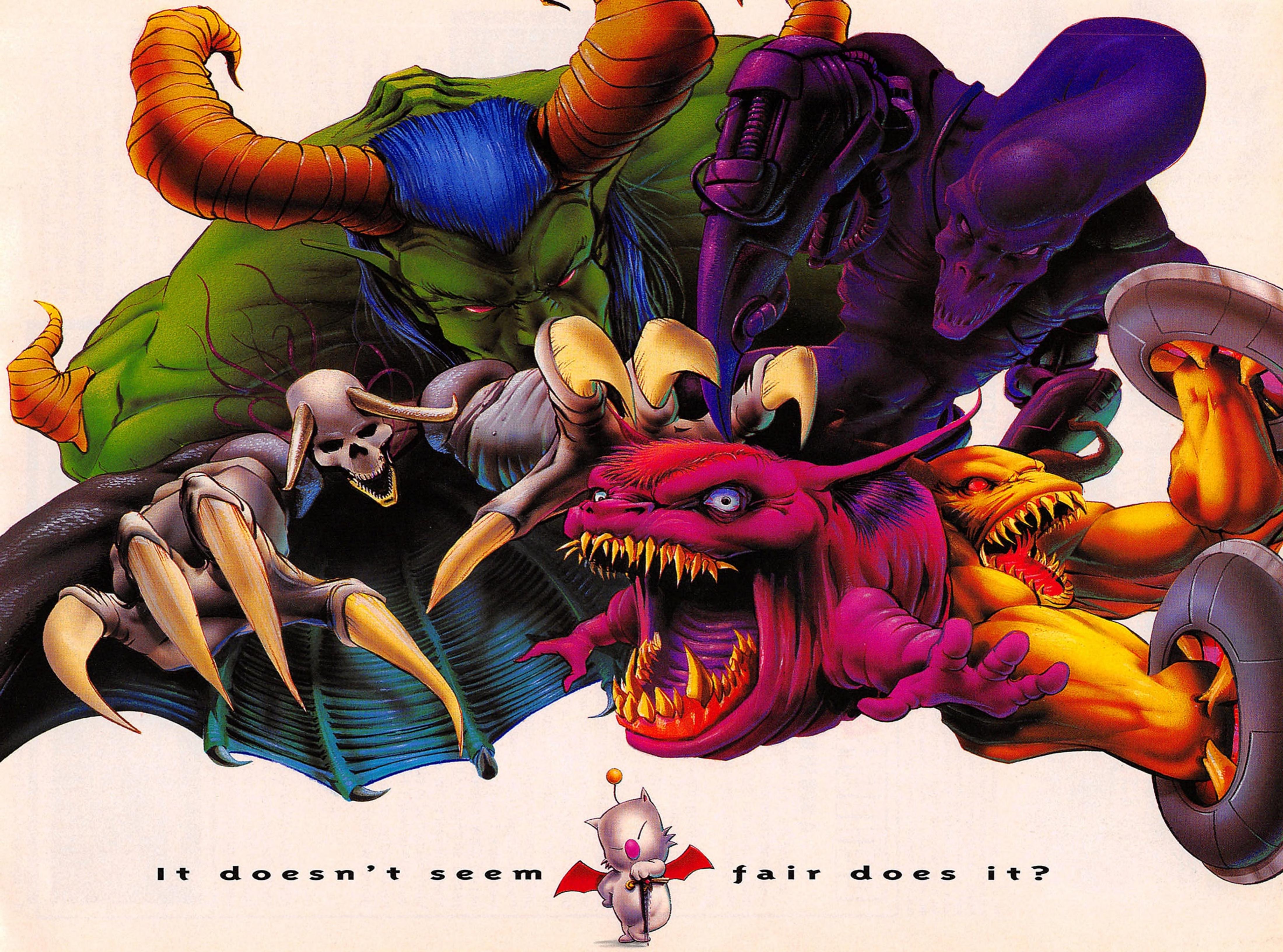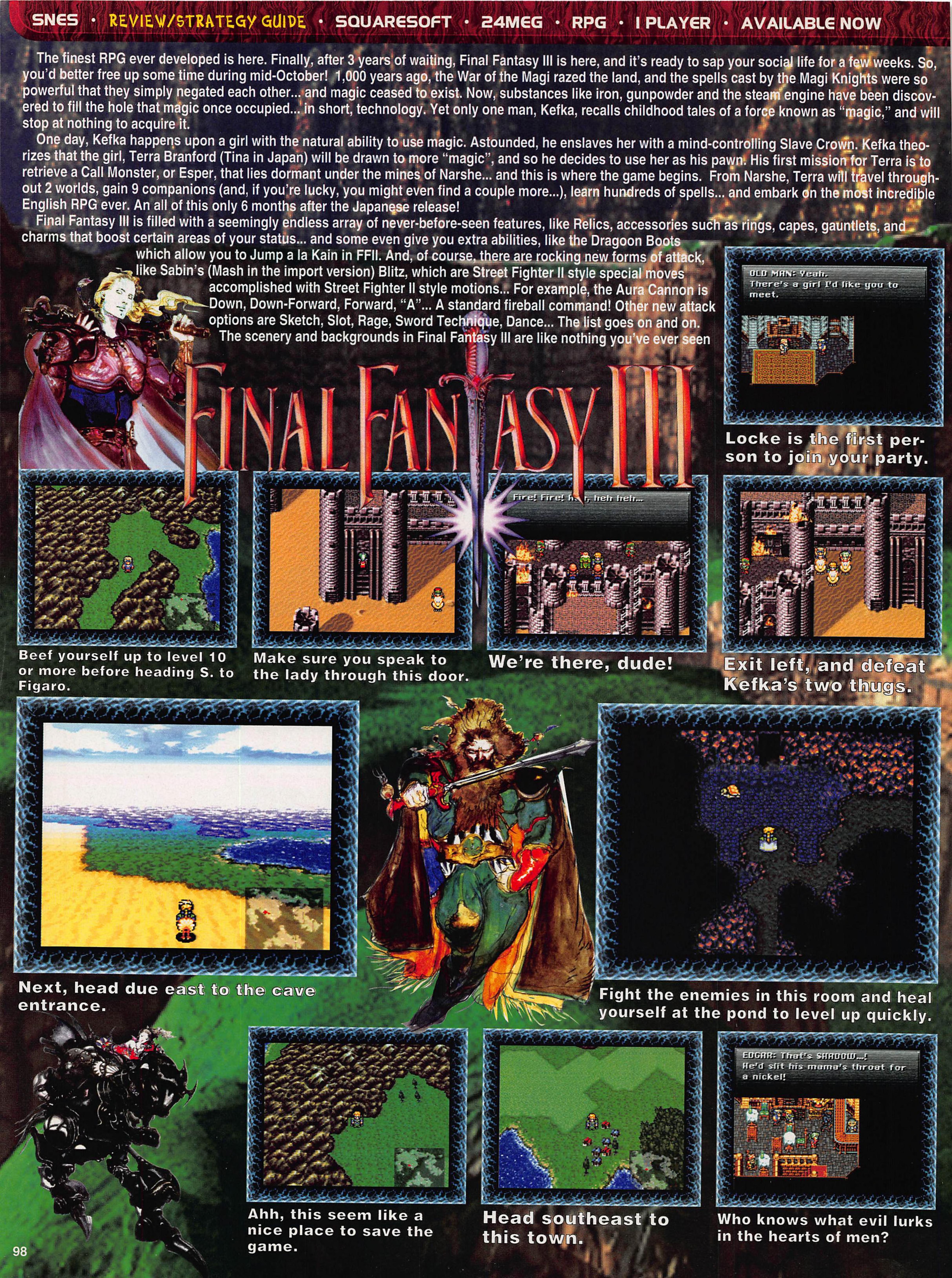 “The finest RPG ever developed is here. Finally, after 3 years of waiting, Final Fantasy III is here, and it’s ready to sap your social life for a few weeks. So, you’d better free up some time during mid-October! 1,000 years ago, the War of the magi razed the land, and the spells cast by the Magi Knights were so powerful that they simply negated each other… and magic ceased to exist. Now, substances like iron, gunpowder and the steam engine have been discovered to fill the hole that magic once occupied… in short, technology. Yet only one man, Kefka, recalls childhood tales of a force known as ‘magic,’ and will stop at nothing to acquire it.”