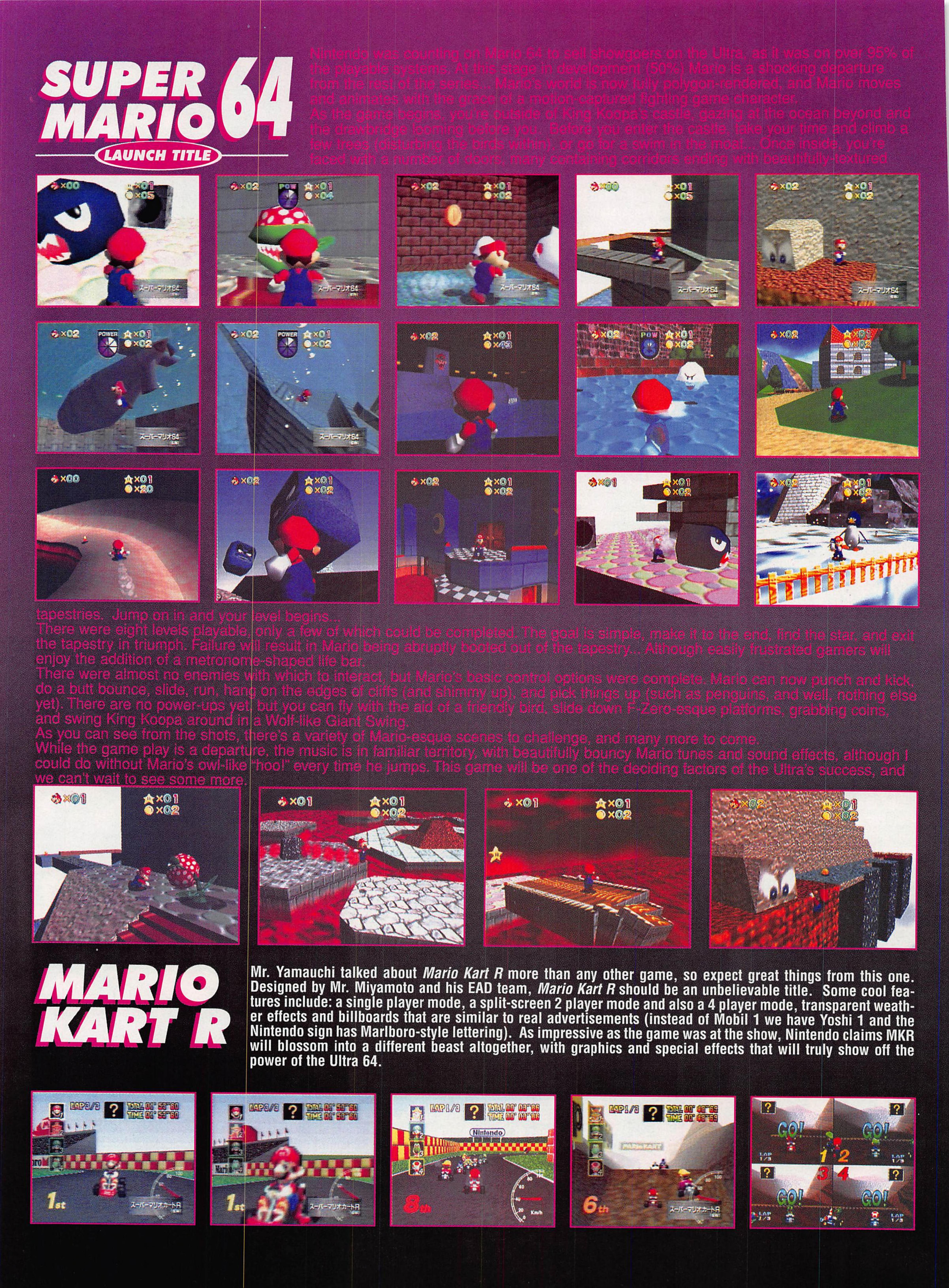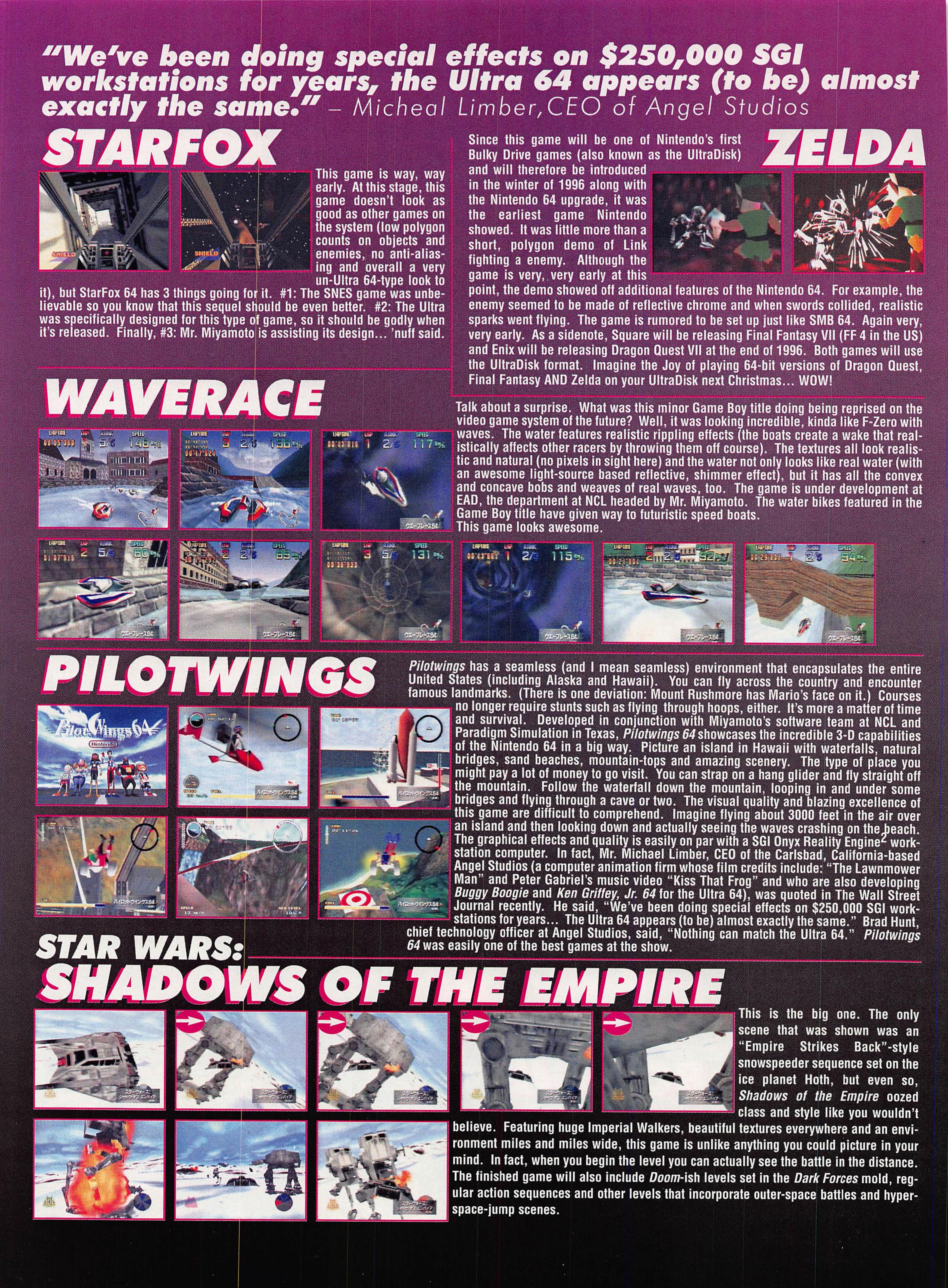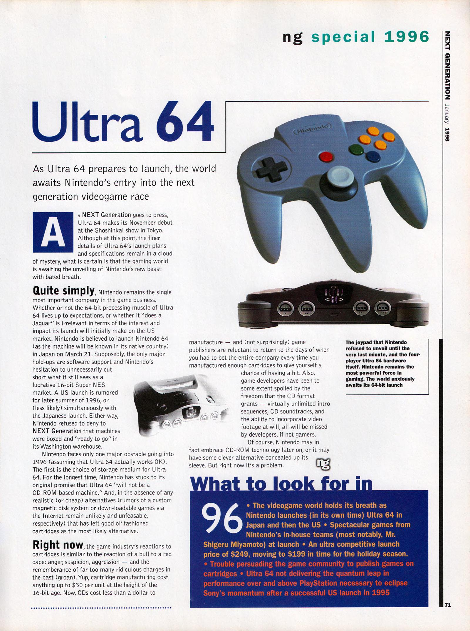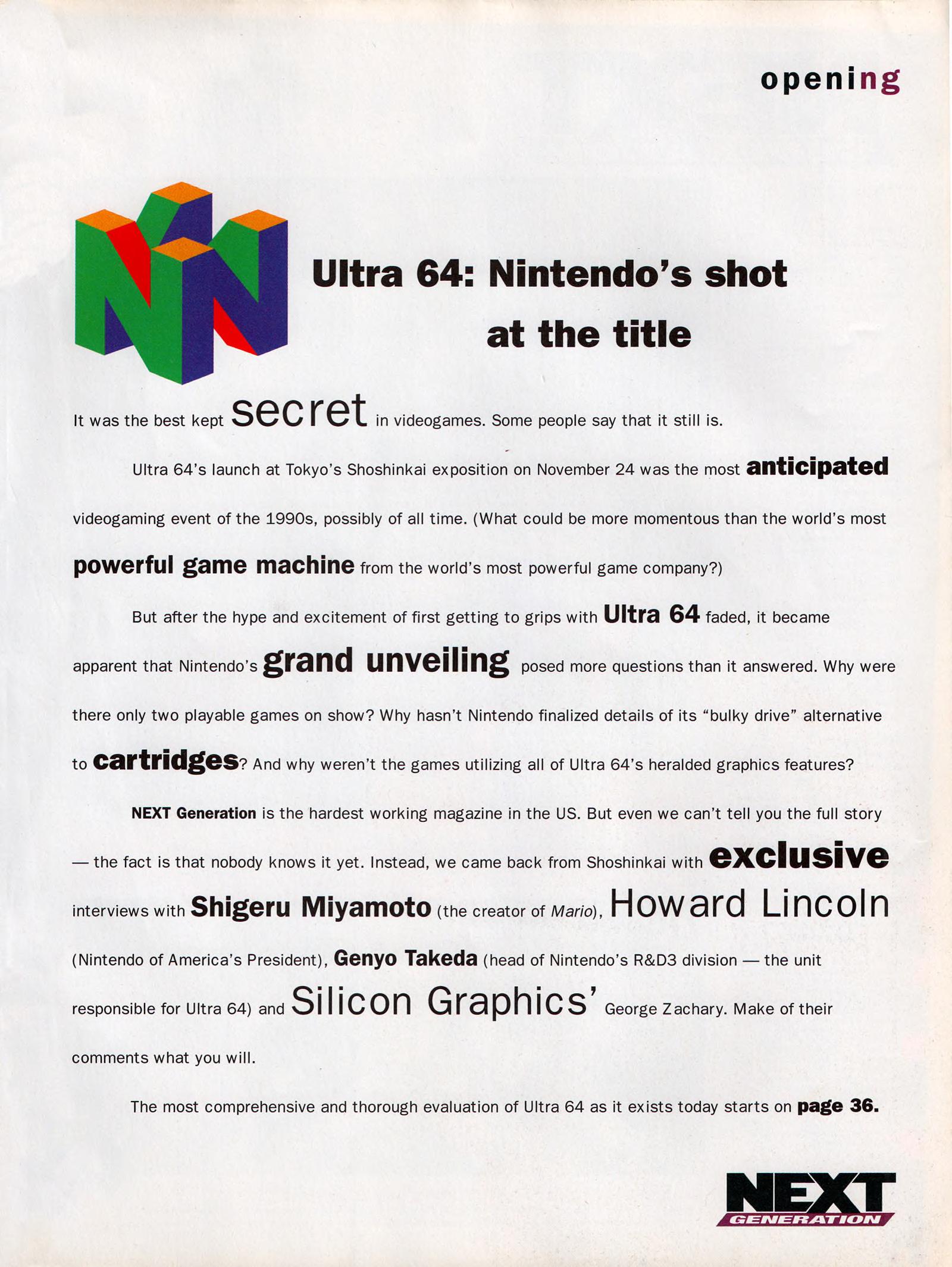 “Ultra 64: Nintendo’s shot at the title. It was the best kept secret in videogames. Some people say that it still is. Ultra 64’s launch at Tokyo’s Shosinkai exposition on November 24 was the most anticipated videogaming event of the 1990’s, possibly of all time. What could be more momentous than the world’s most powerful game machine from the world’s most powerful game company?”