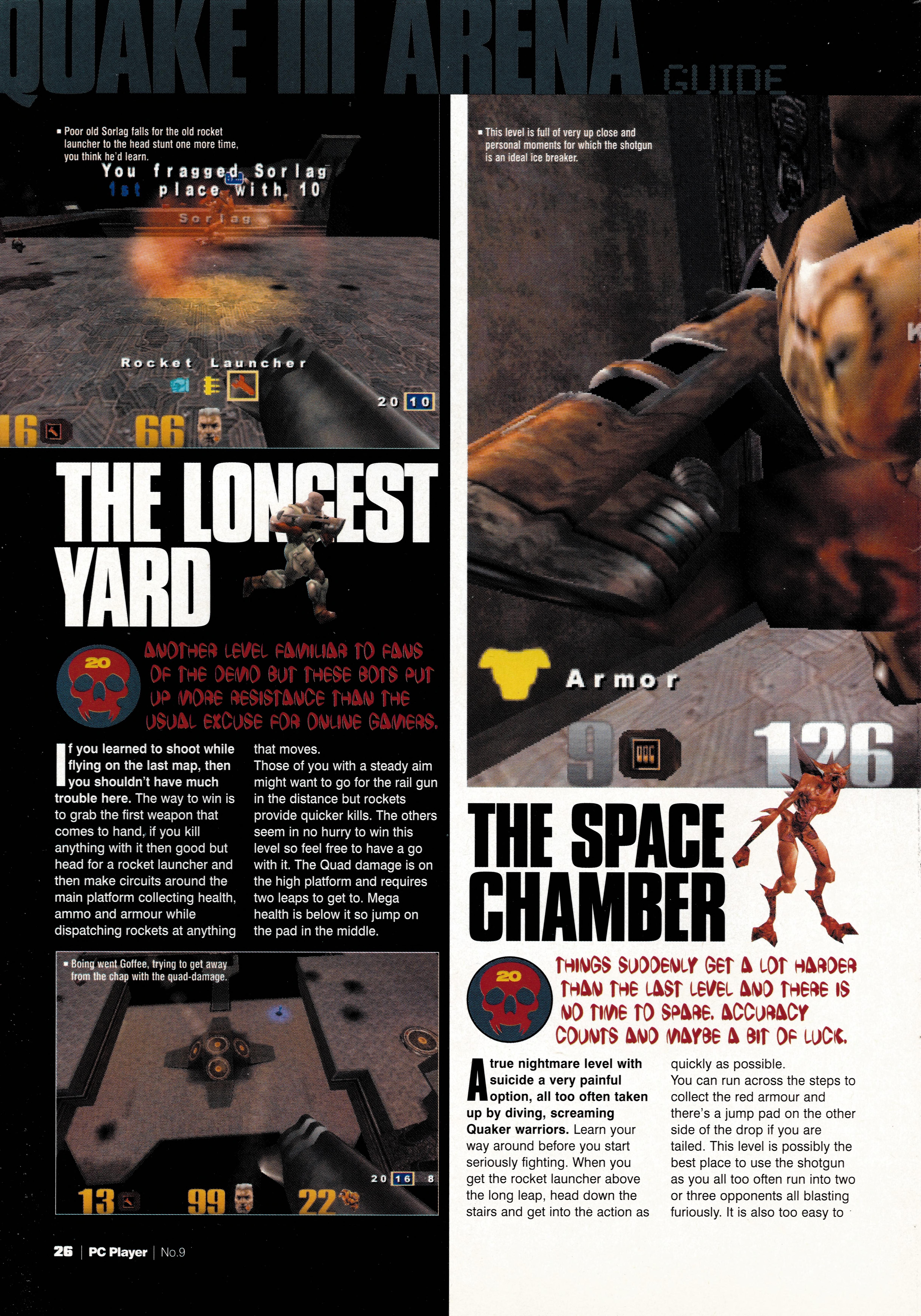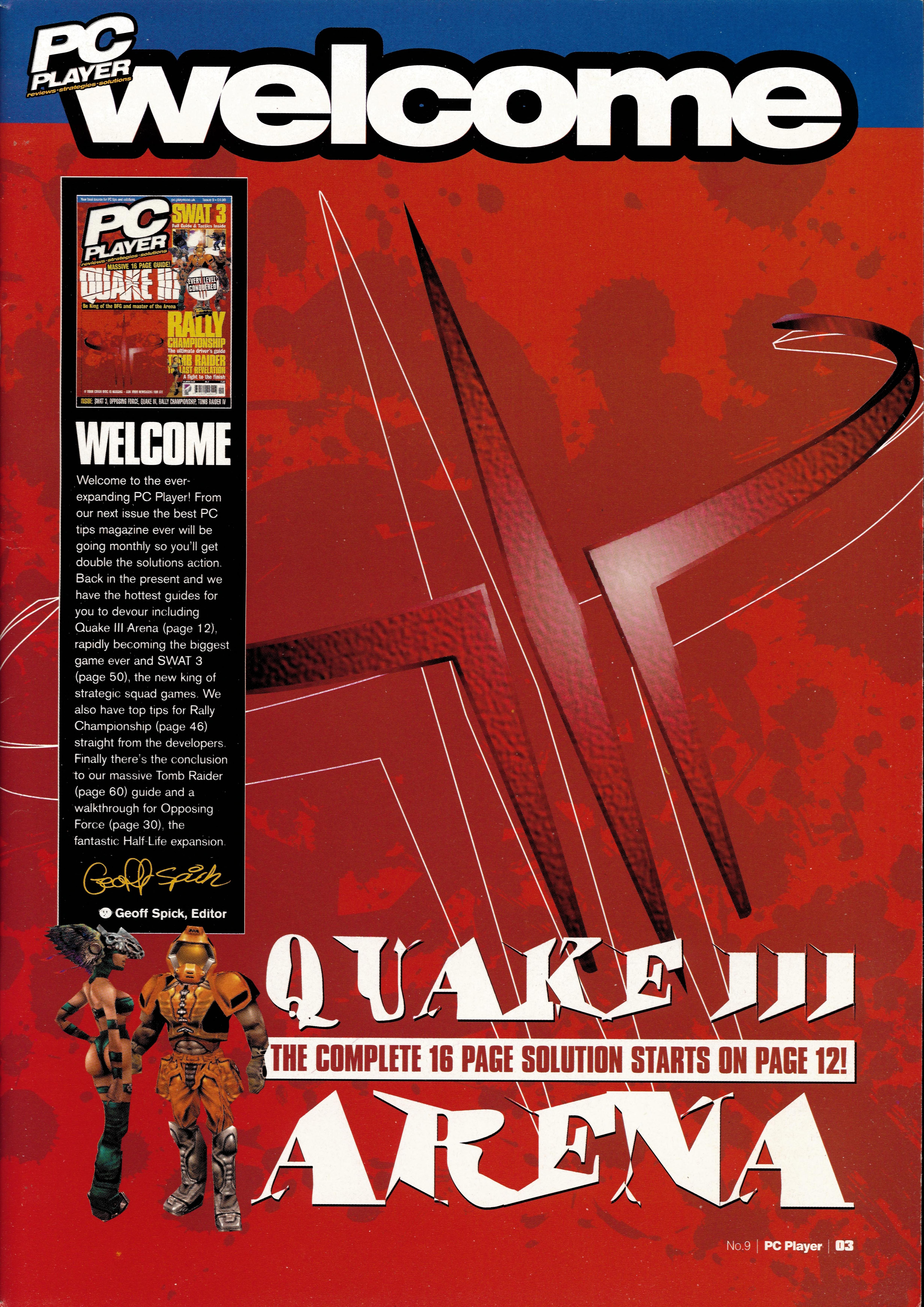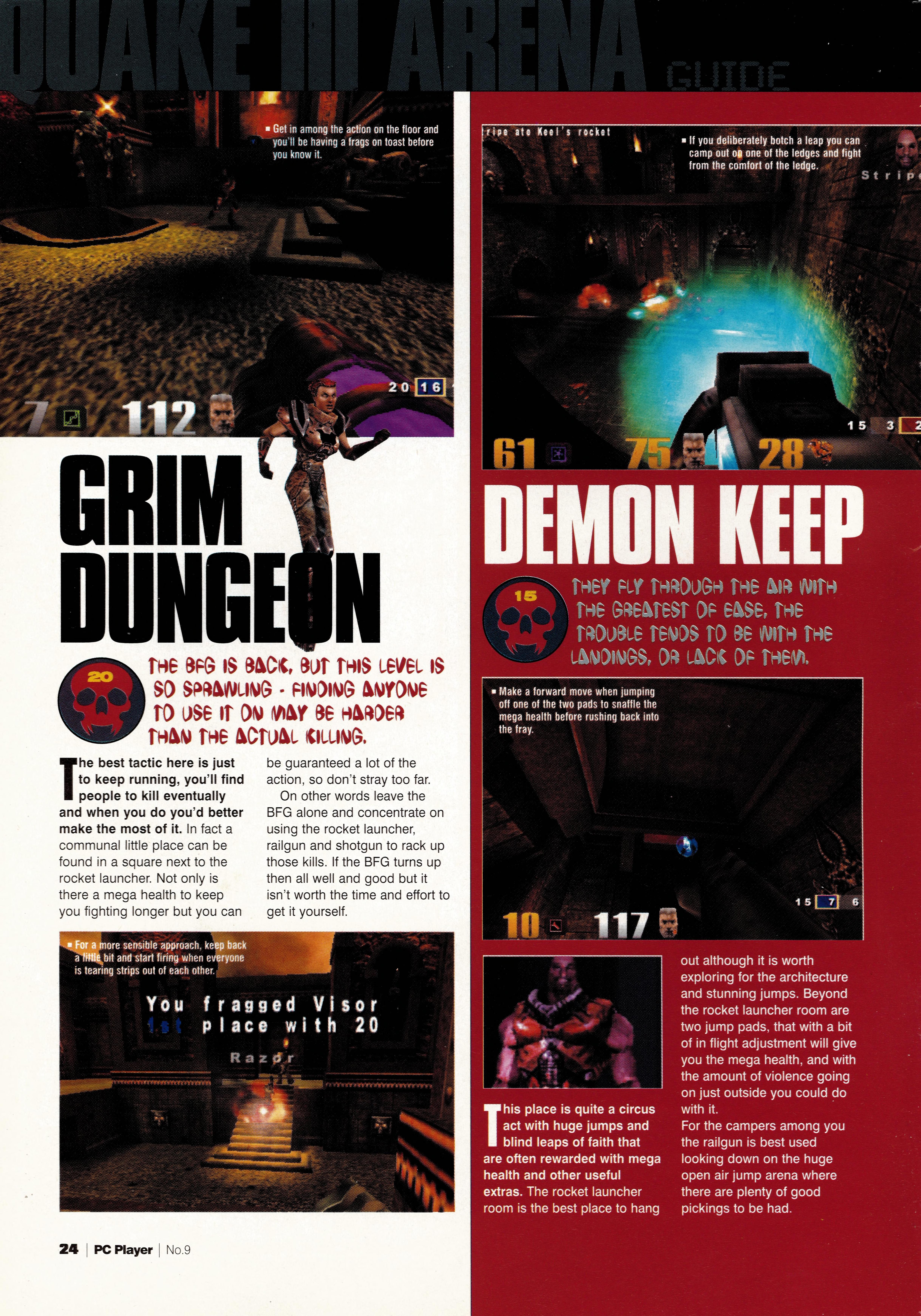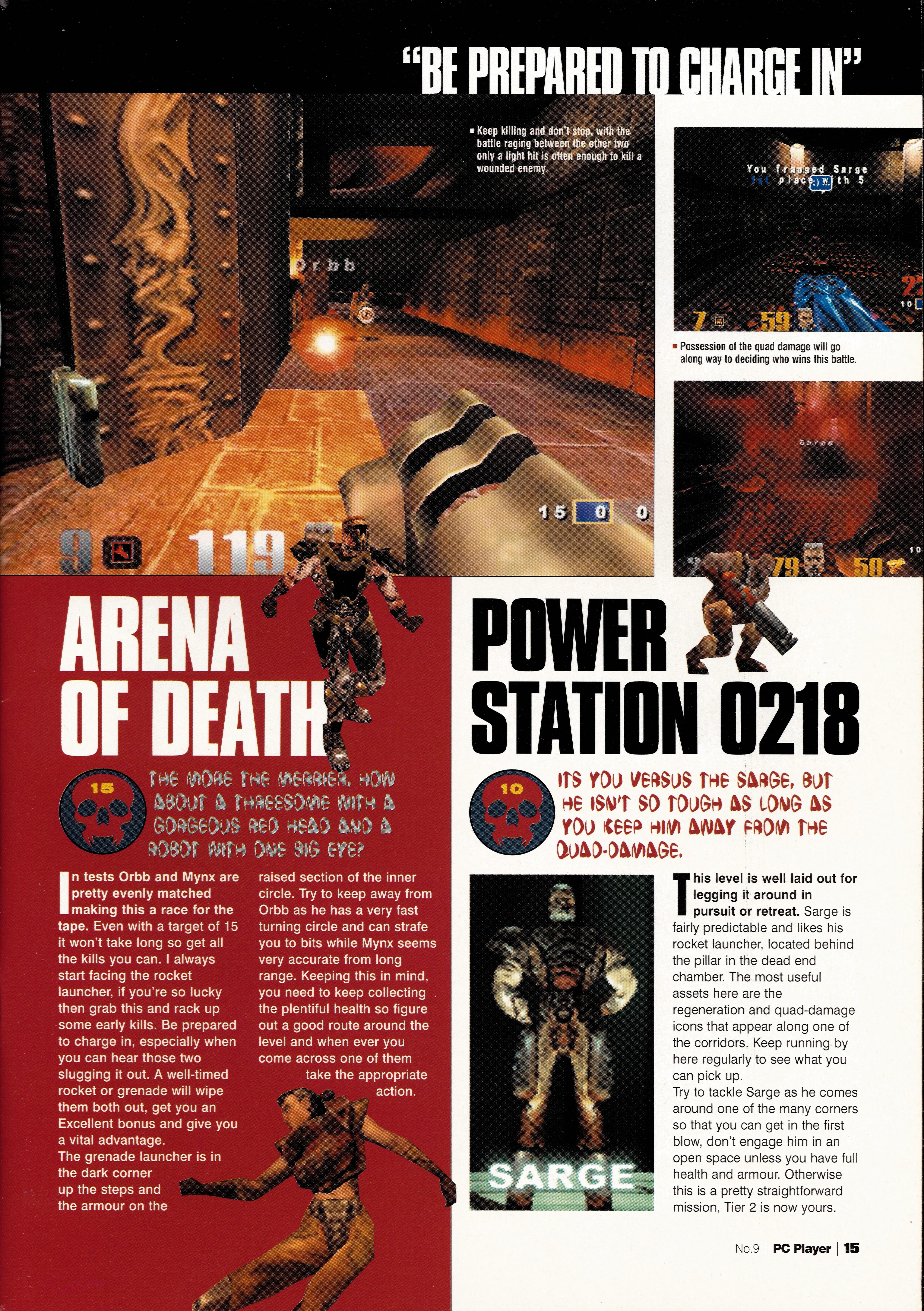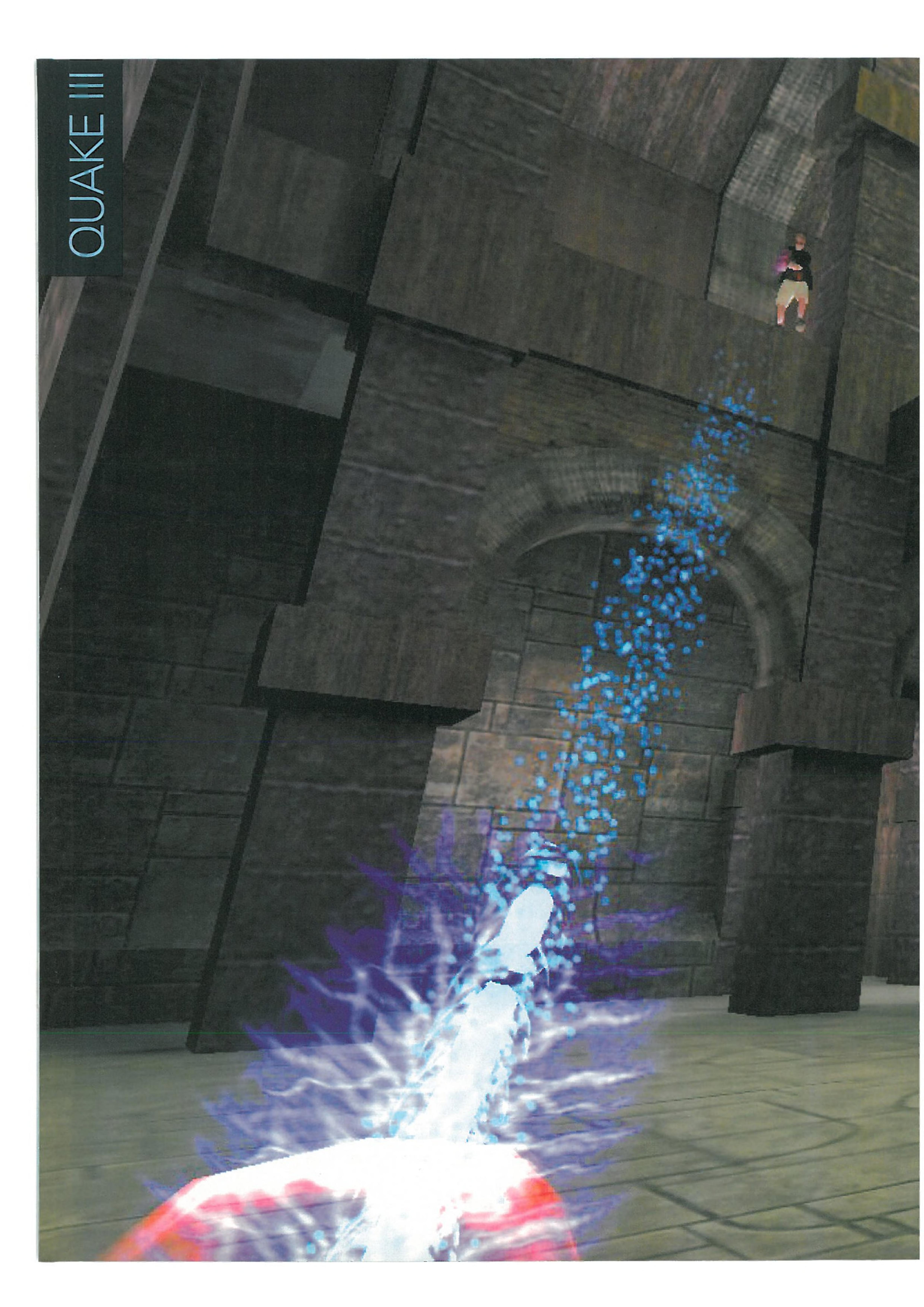 “The sound of footsteps, the smell of burning… you’d be a fool to fire a point blank rocket. Oh, you’re dead! Quake III Arena has been the most awaited game of the year and doesn’t disappoint those looking for the ultimate in deathmatch gaming. Load up, get online, and fight back with your very own BFG — that’s Big Fragging guide.”
