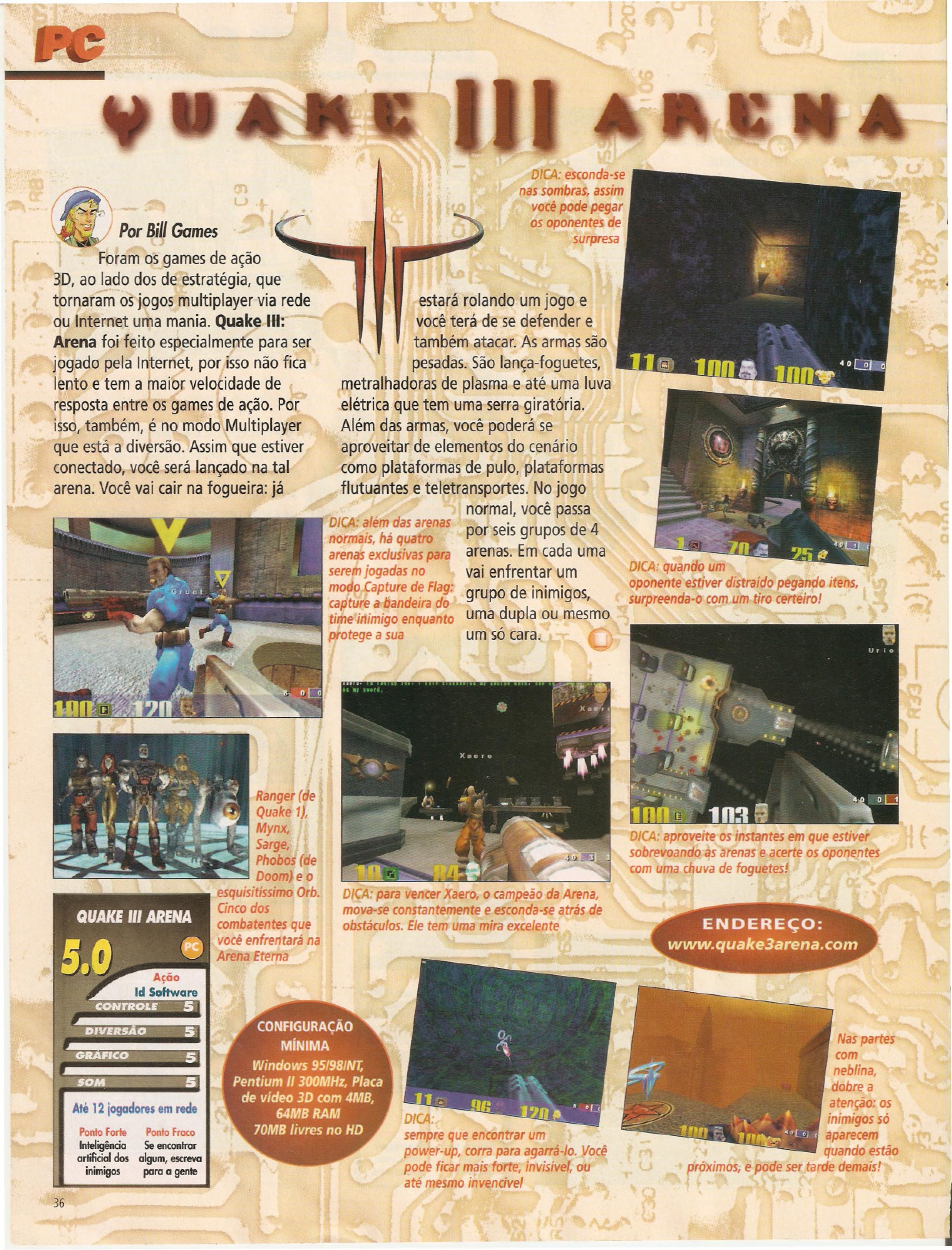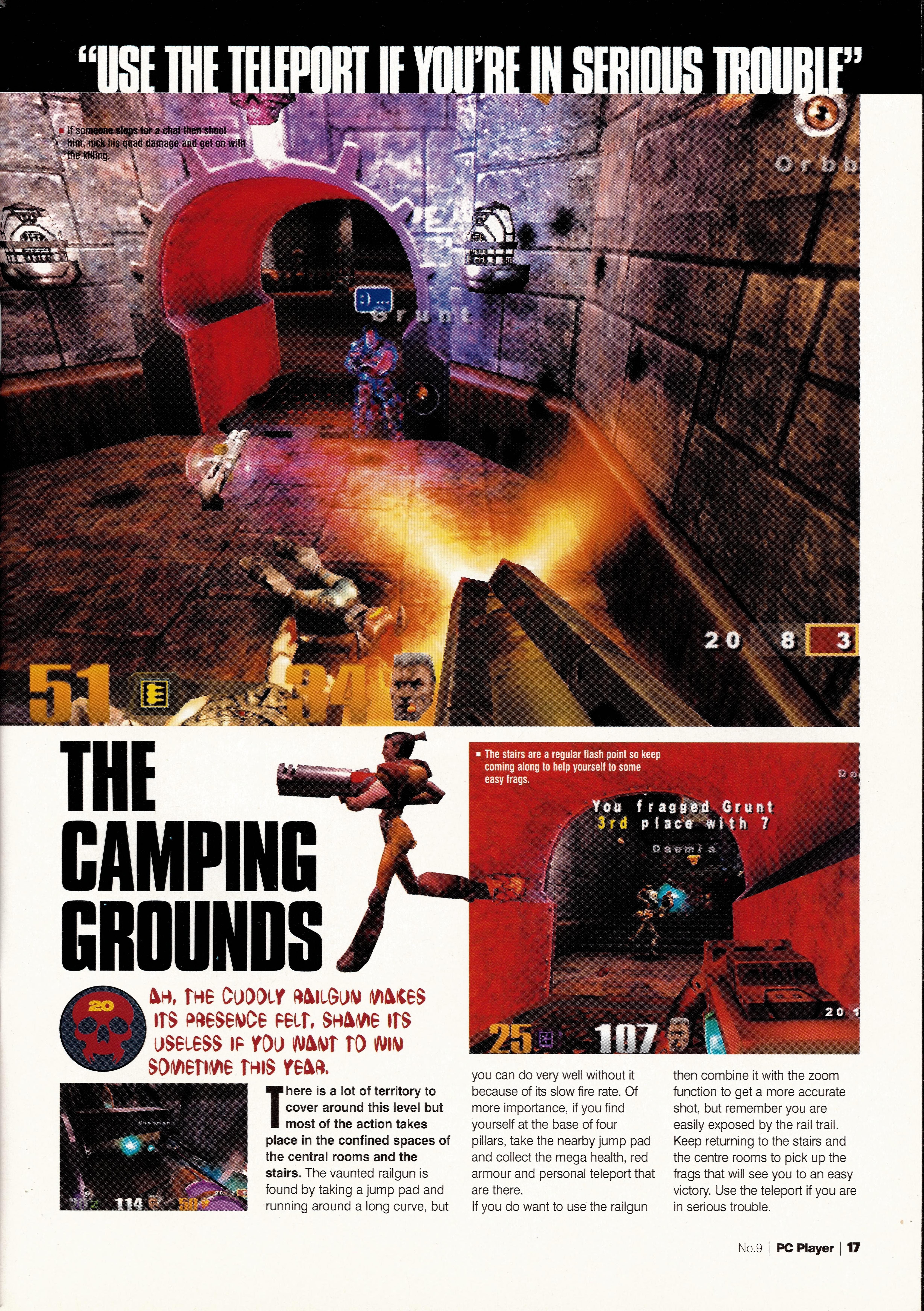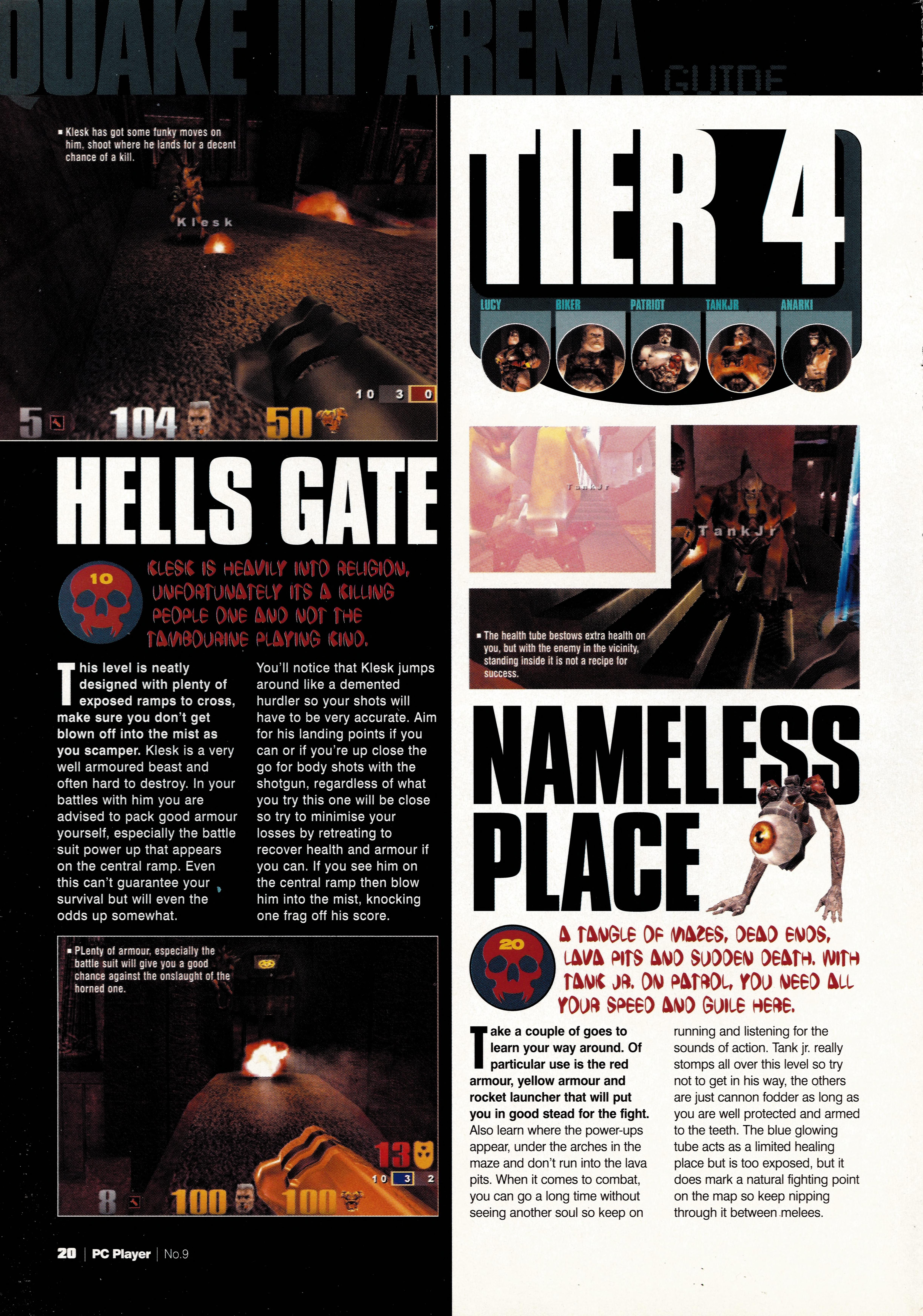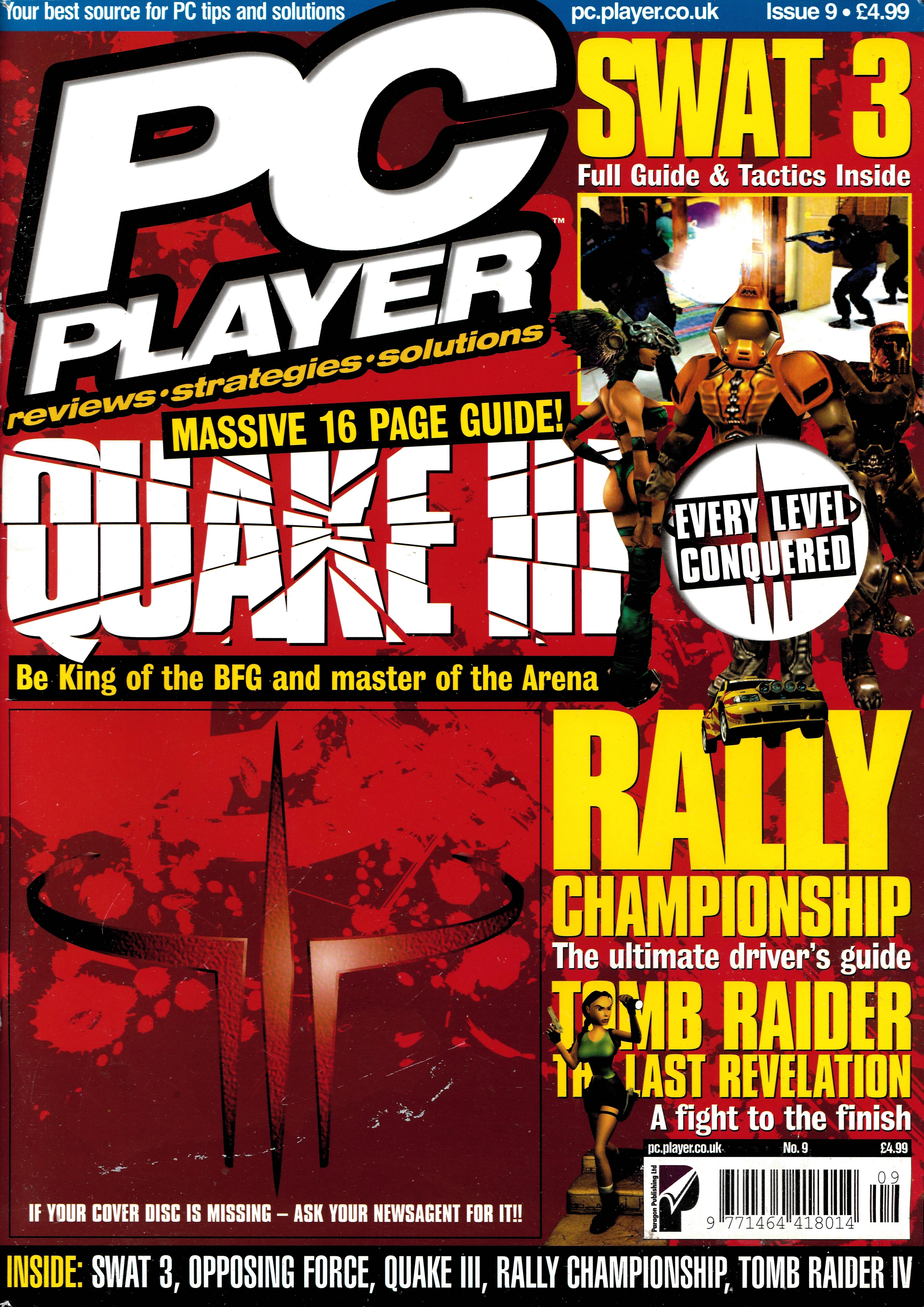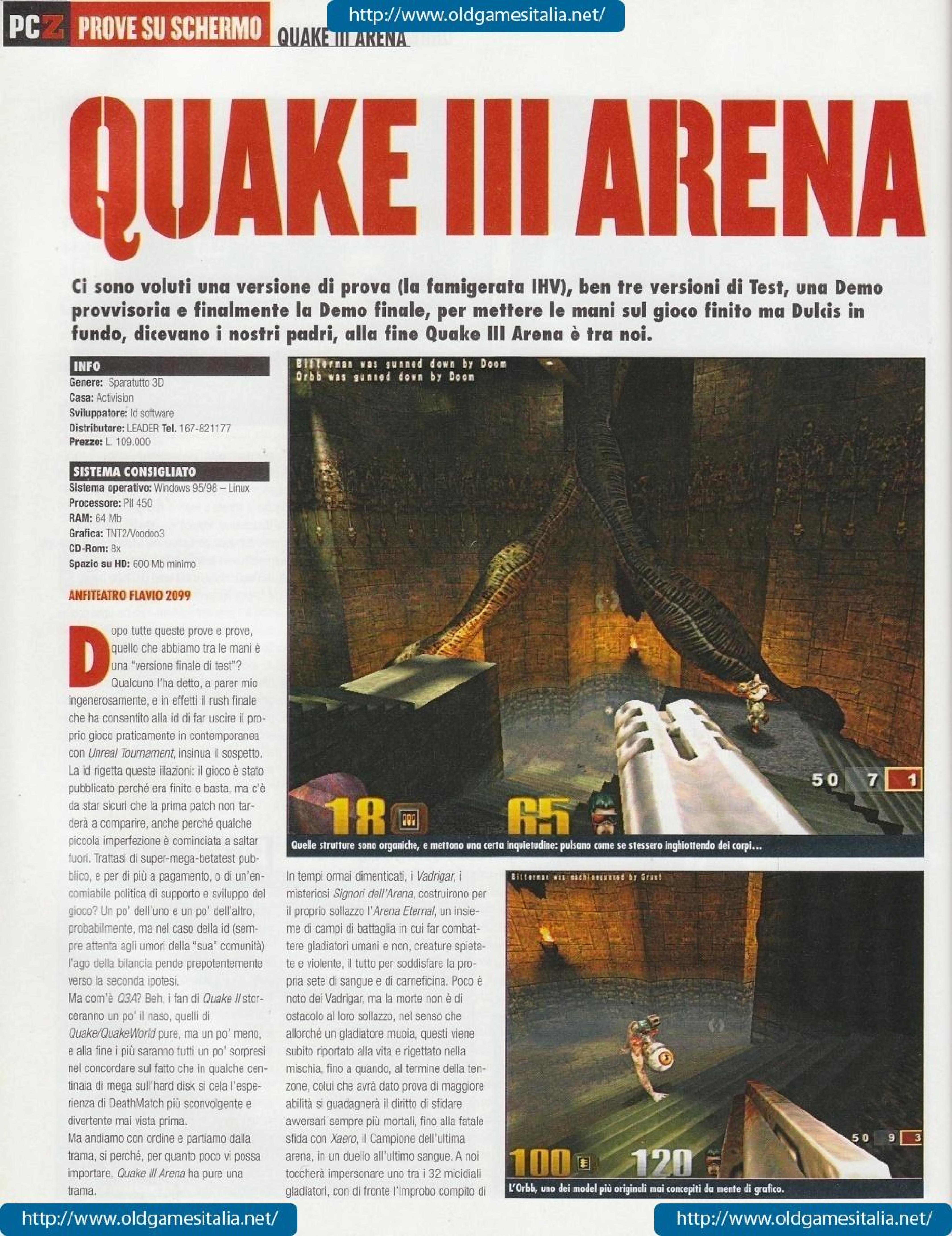 “The sound of footsteps, the smell of burning… you’d be a fool to fire a point blank rocket. Oh, you’re dead! Quake III Arena has been the most awaited game of the year and doesn’t disappoint those looking for the ultimate in deathmatch gaming. Load up, get online, and fight back with your very own BFG — that’s Big Fragging guide.”