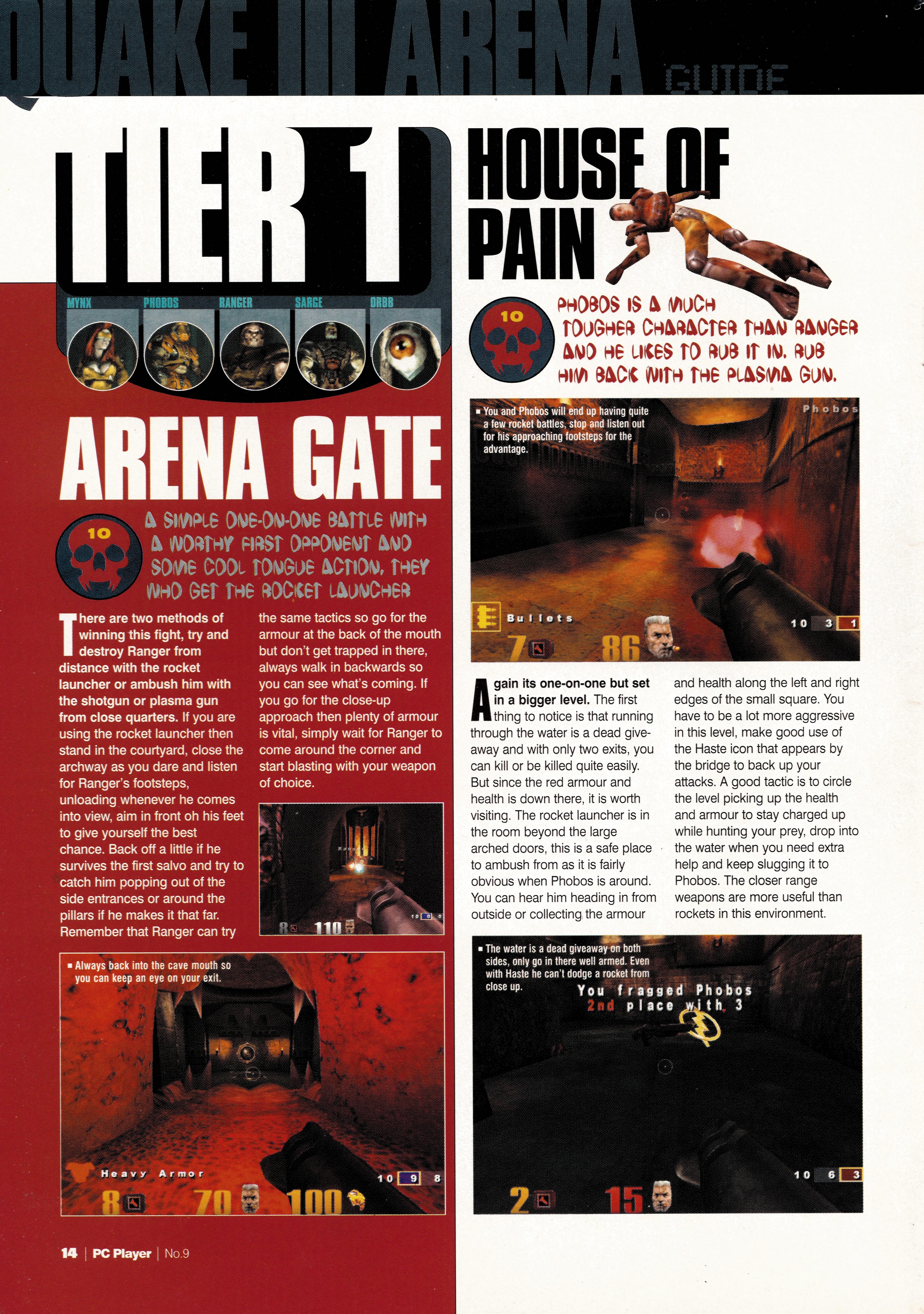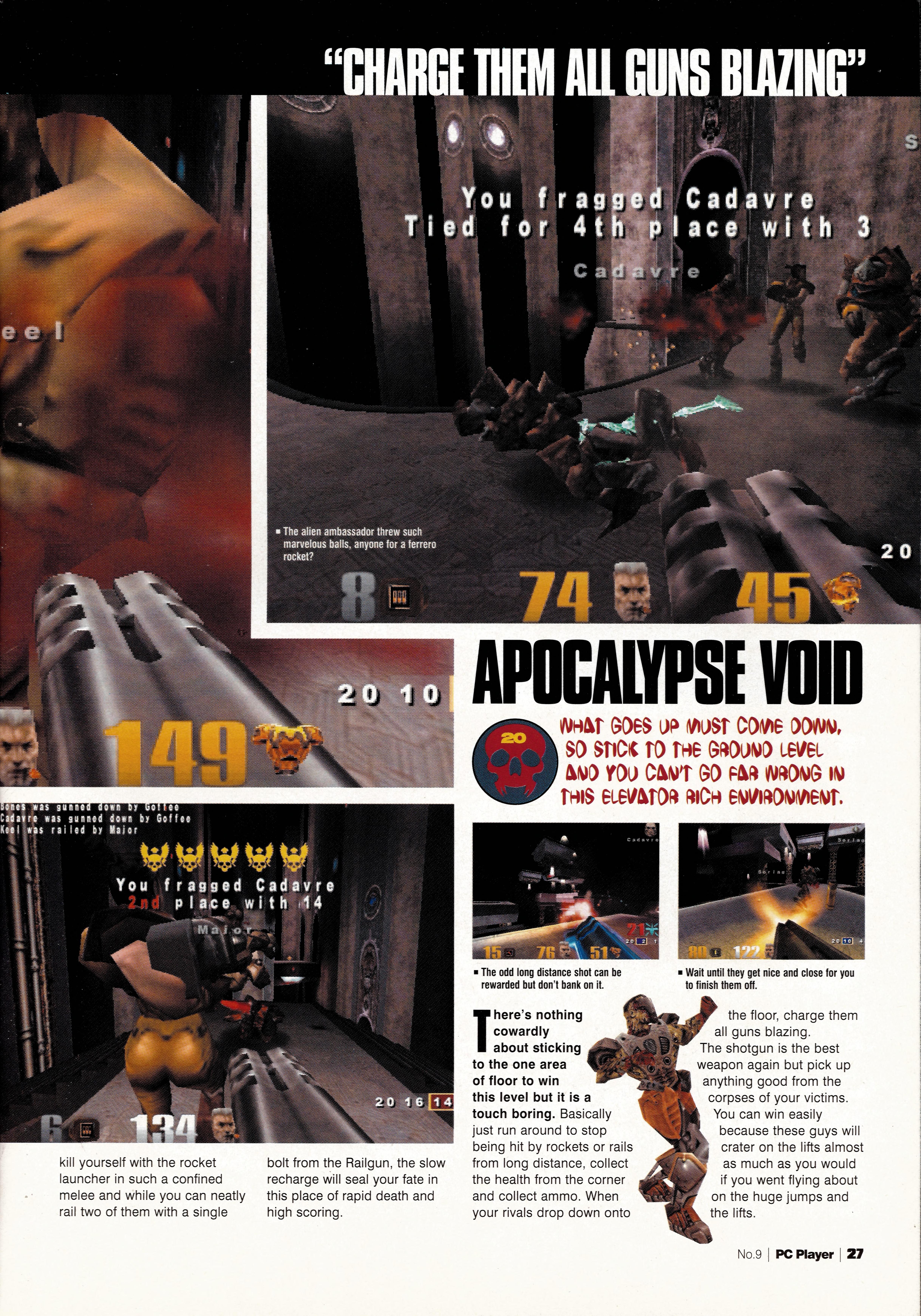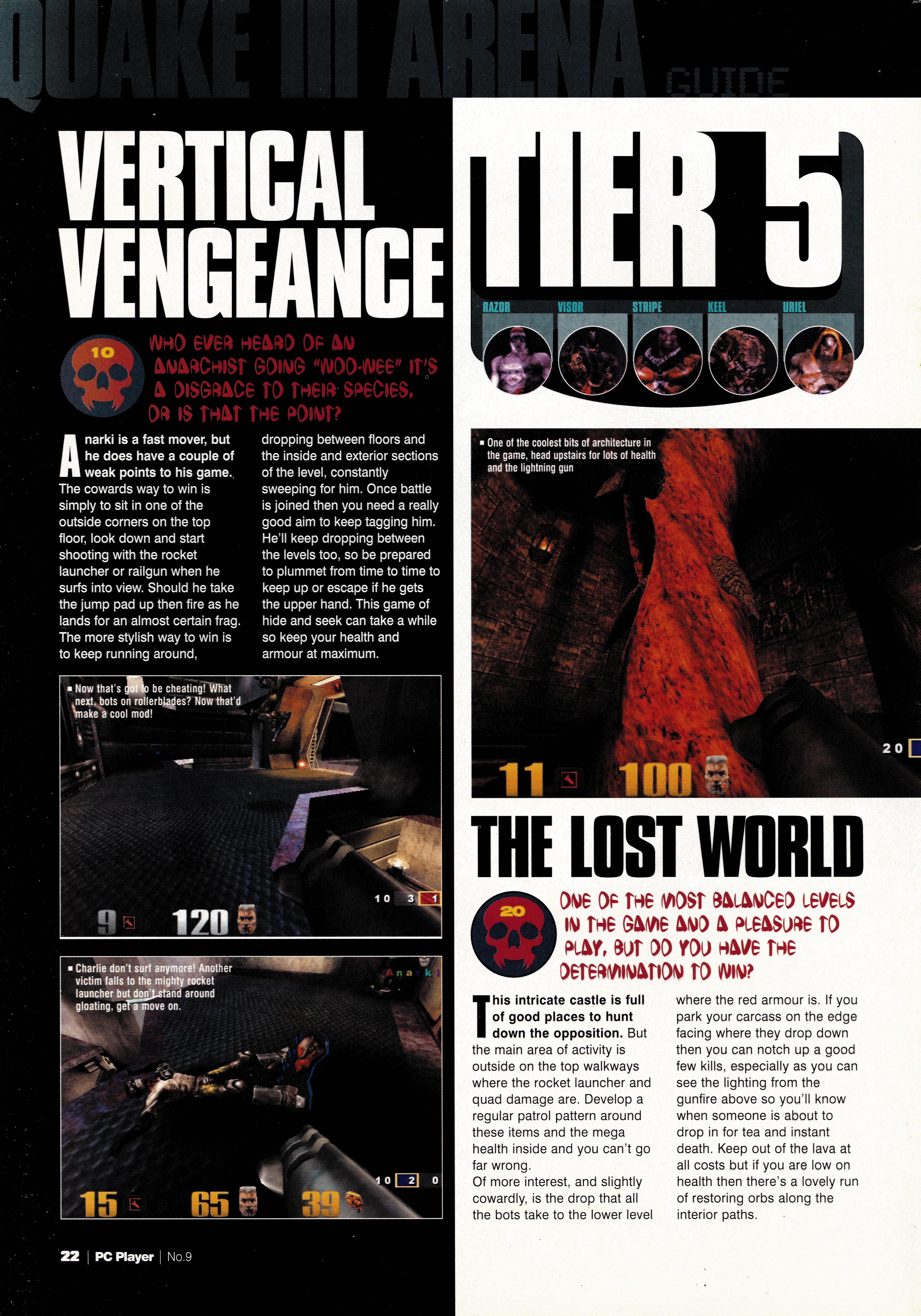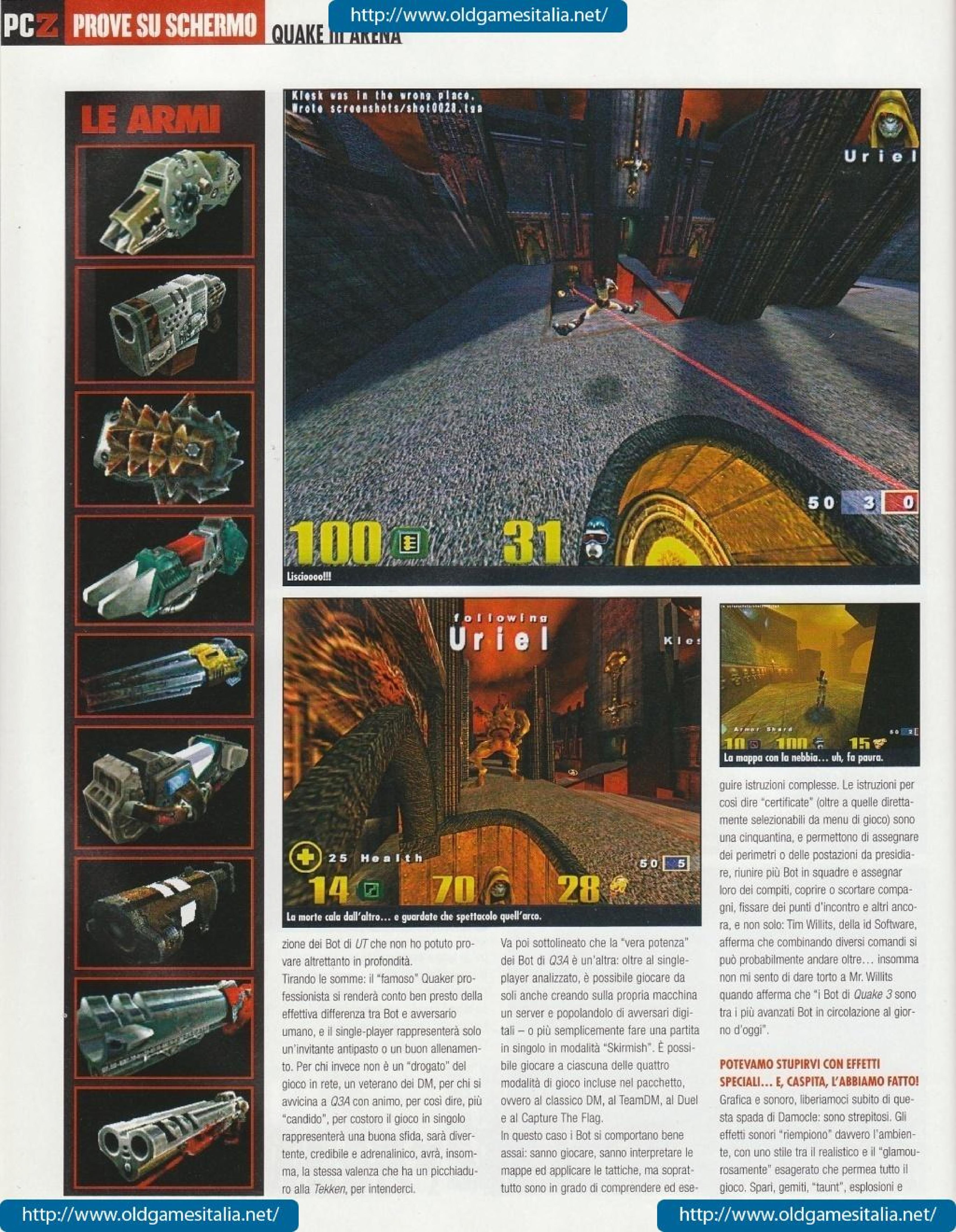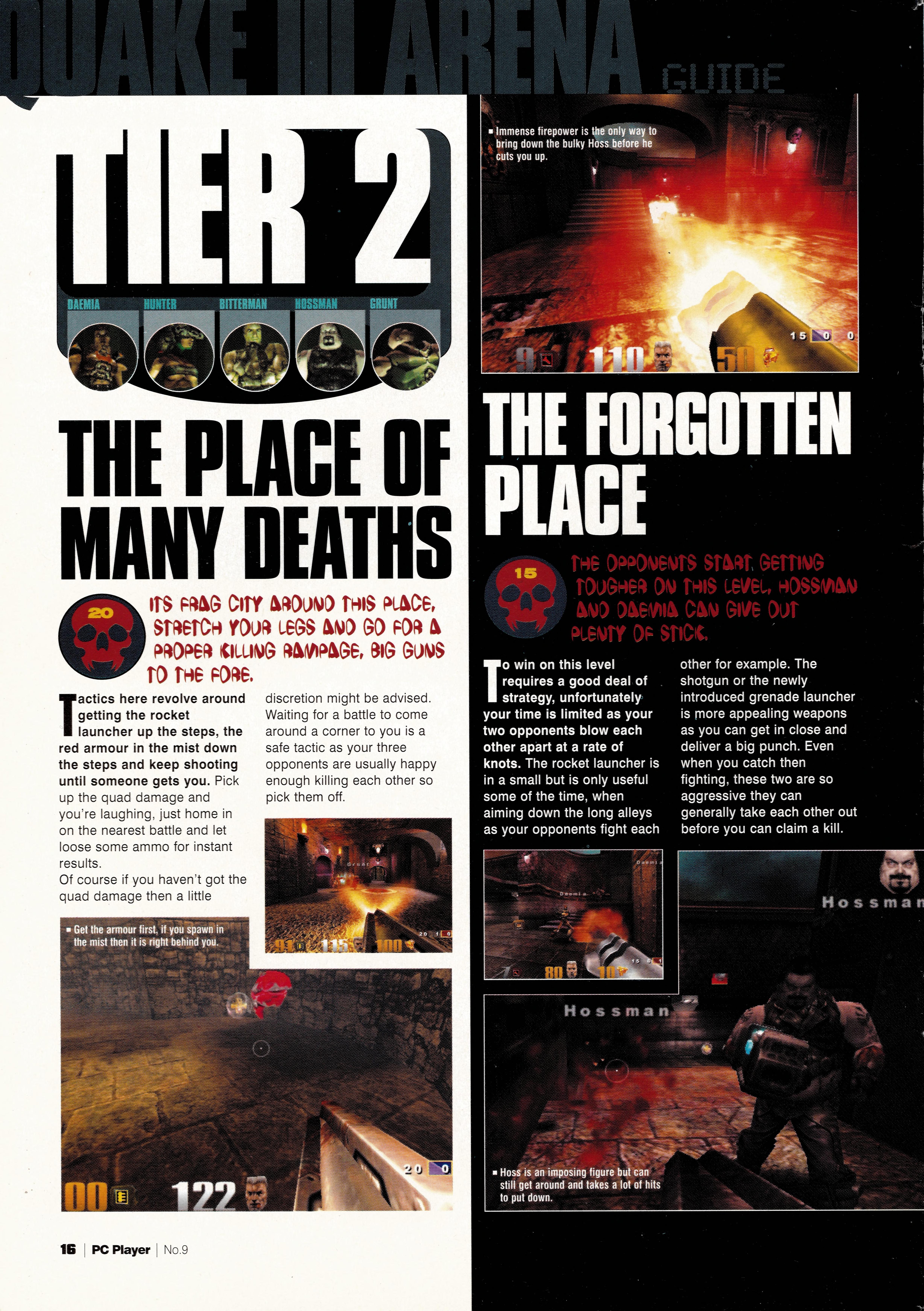 “The sound of footsteps, the smell of burning… you’d be a fool to fire a point blank rocket. Oh, you’re dead! Quake III Arena has been the most awaited game of the year and doesn’t disappoint those looking for the ultimate in deathmatch gaming. Load up, get online, and fight back with your very own BFG — that’s Big Fragging guide.”