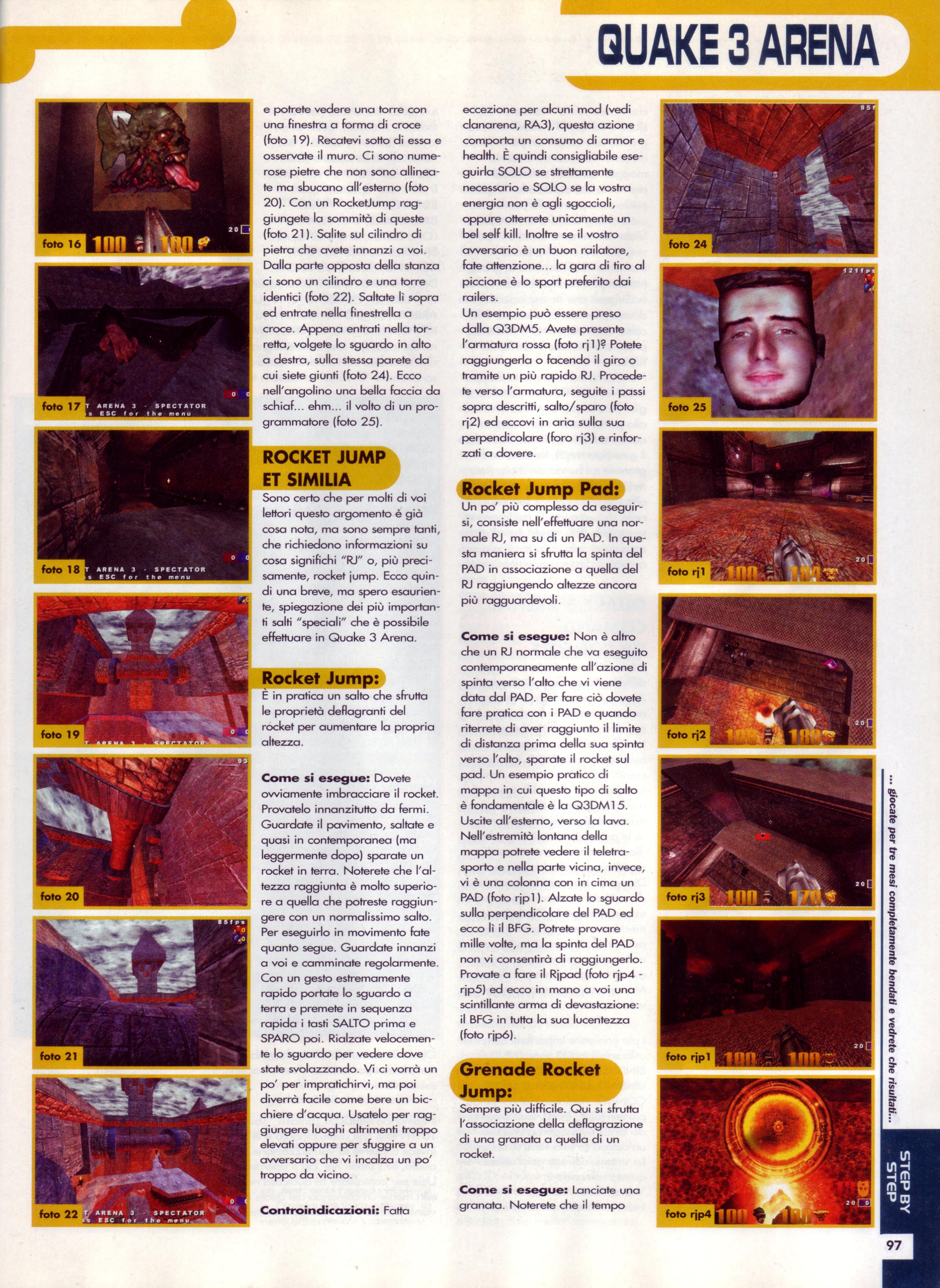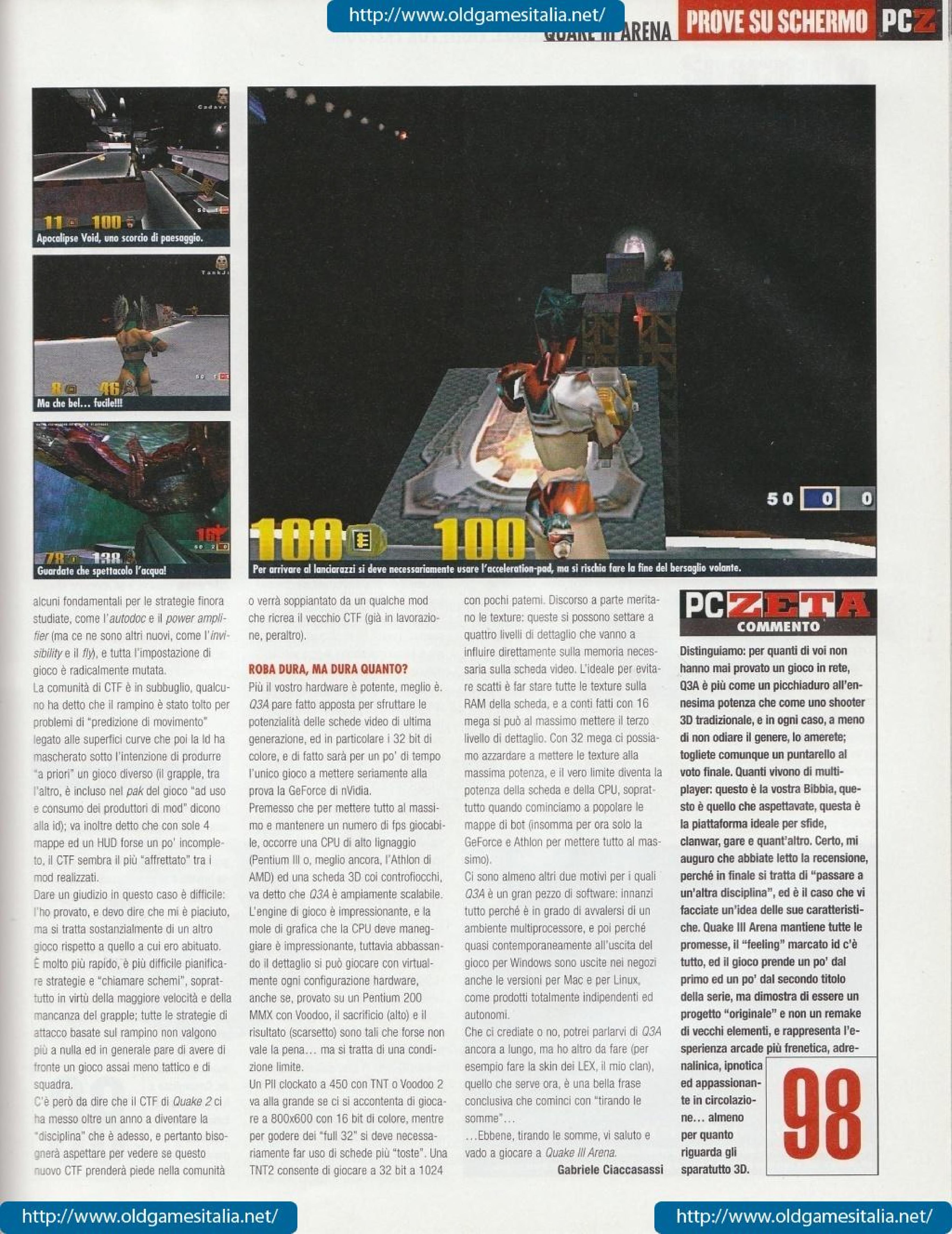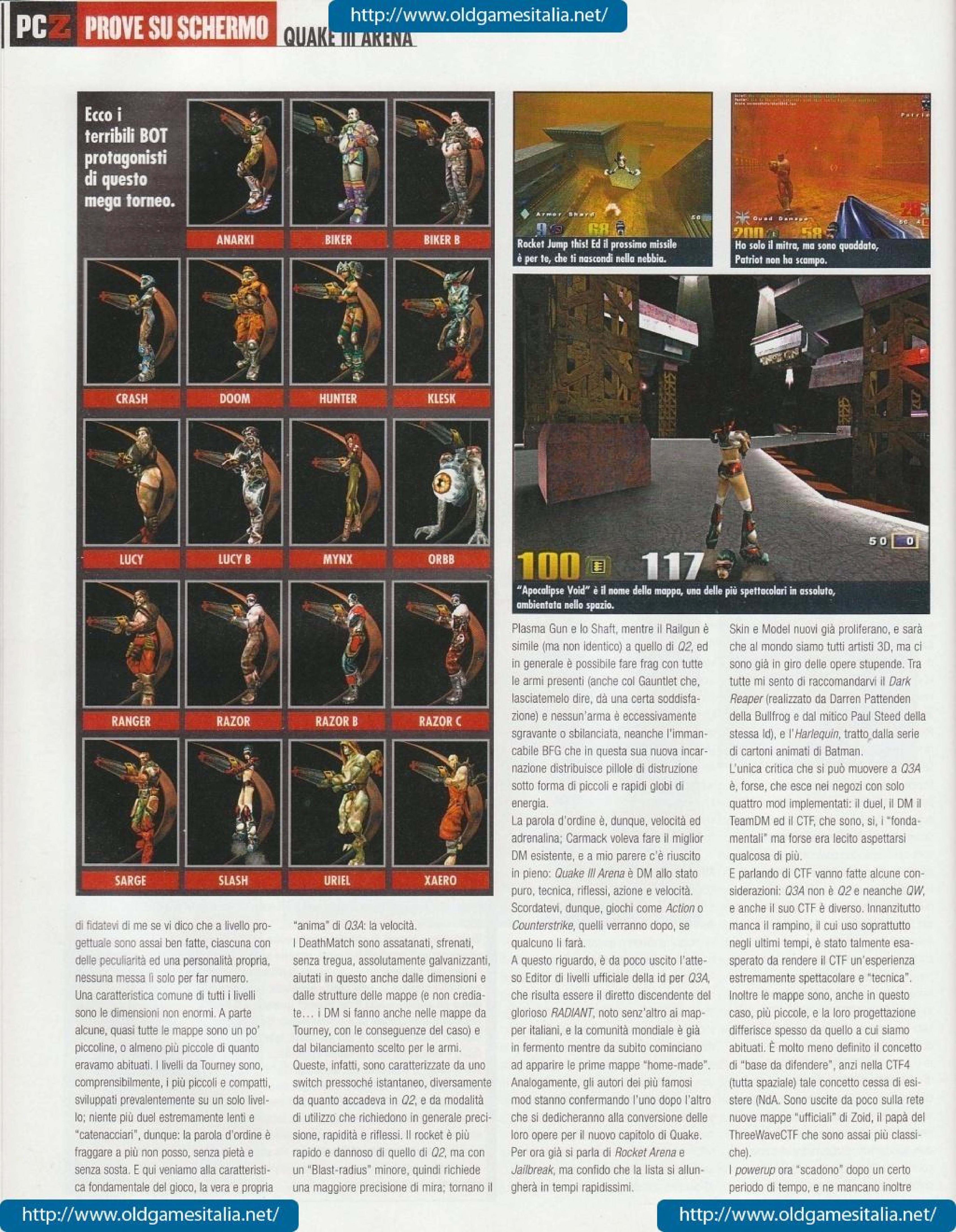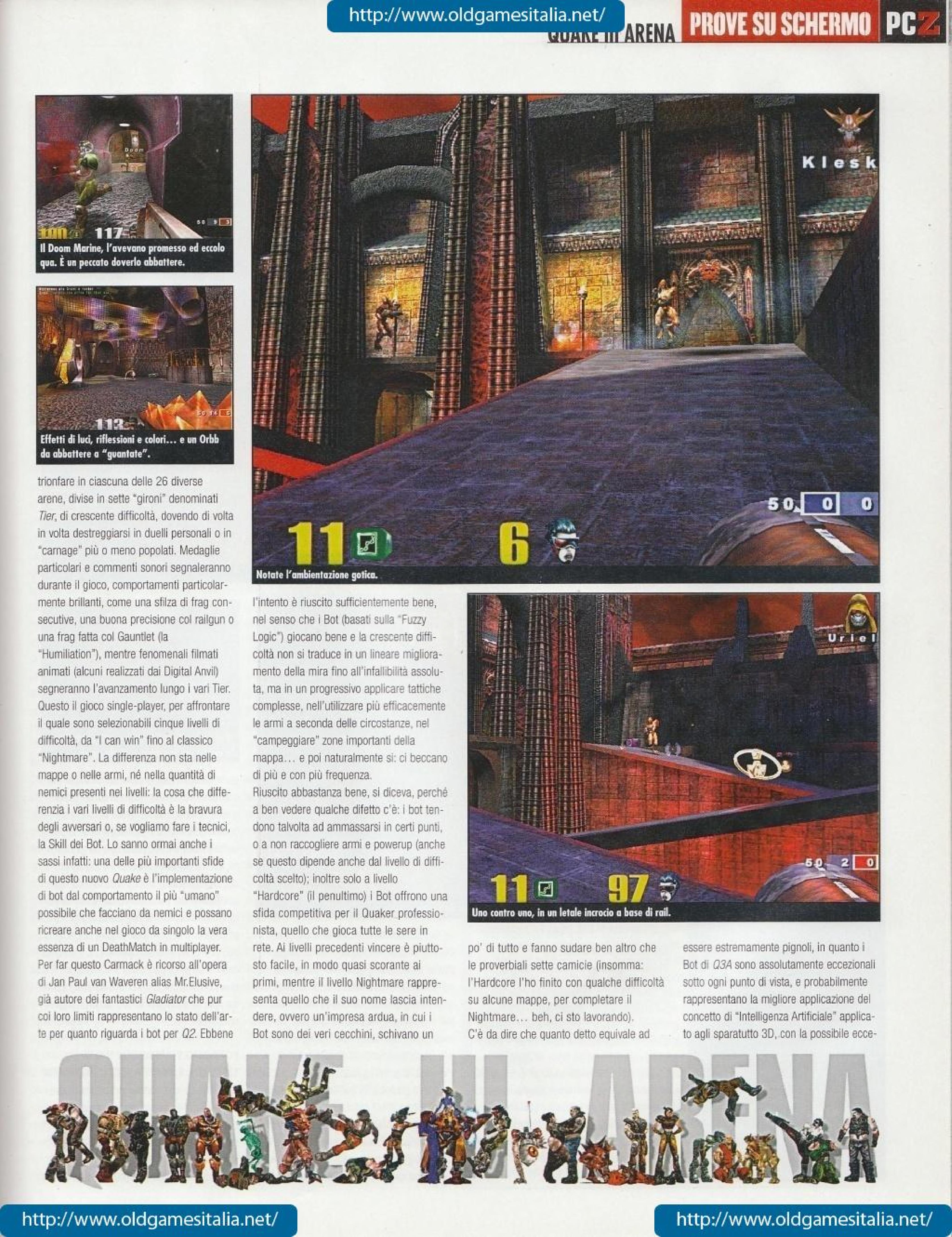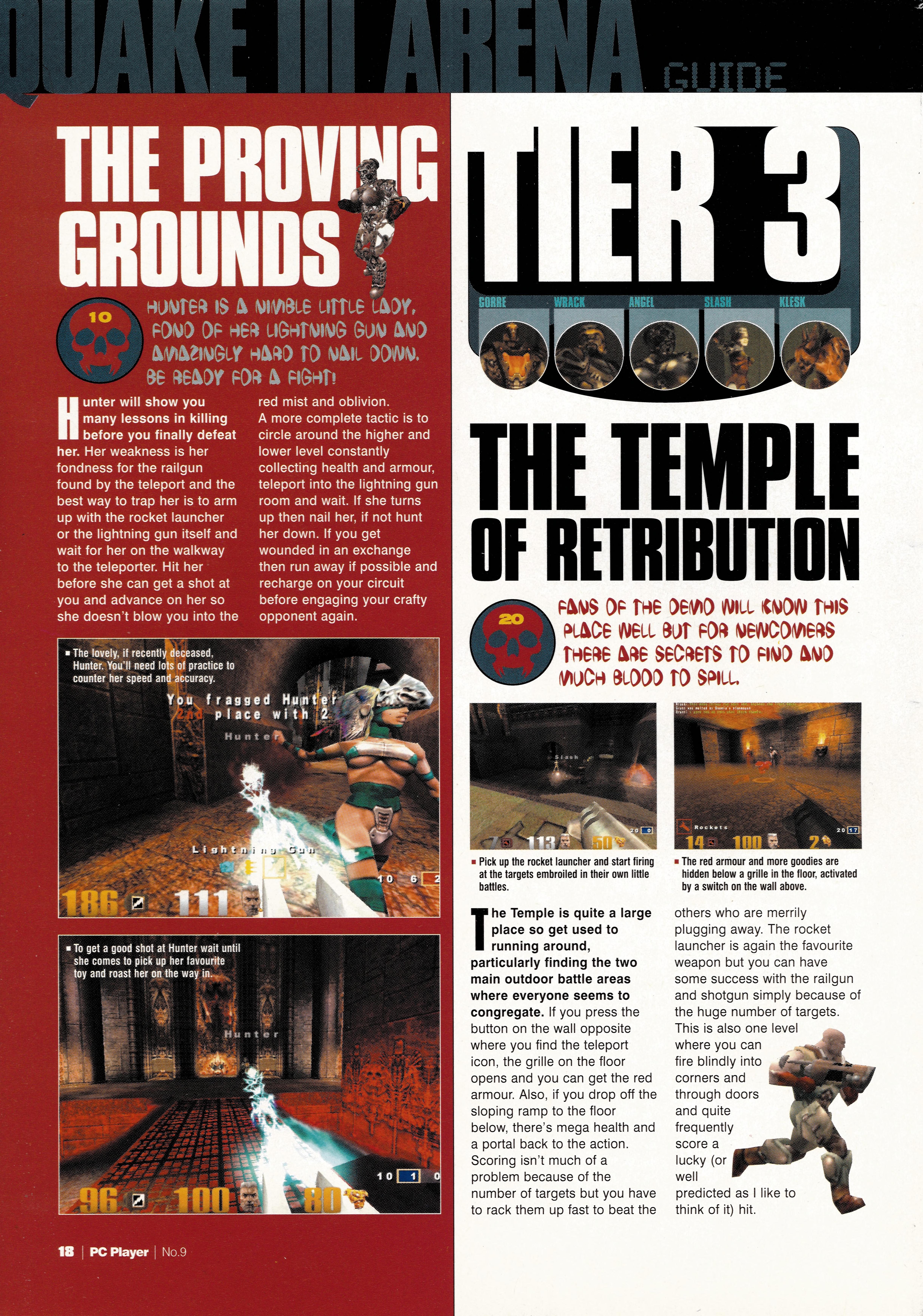 “The sound of footsteps, the smell of burning… you’d be a fool to fire a point blank rocket. Oh, you’re dead! Quake III Arena has been the most awaited game of the year and doesn’t disappoint those looking for the ultimate in deathmatch gaming. Load up, get online, and fight back with your very own BFG — that’s Big Fragging guide.”