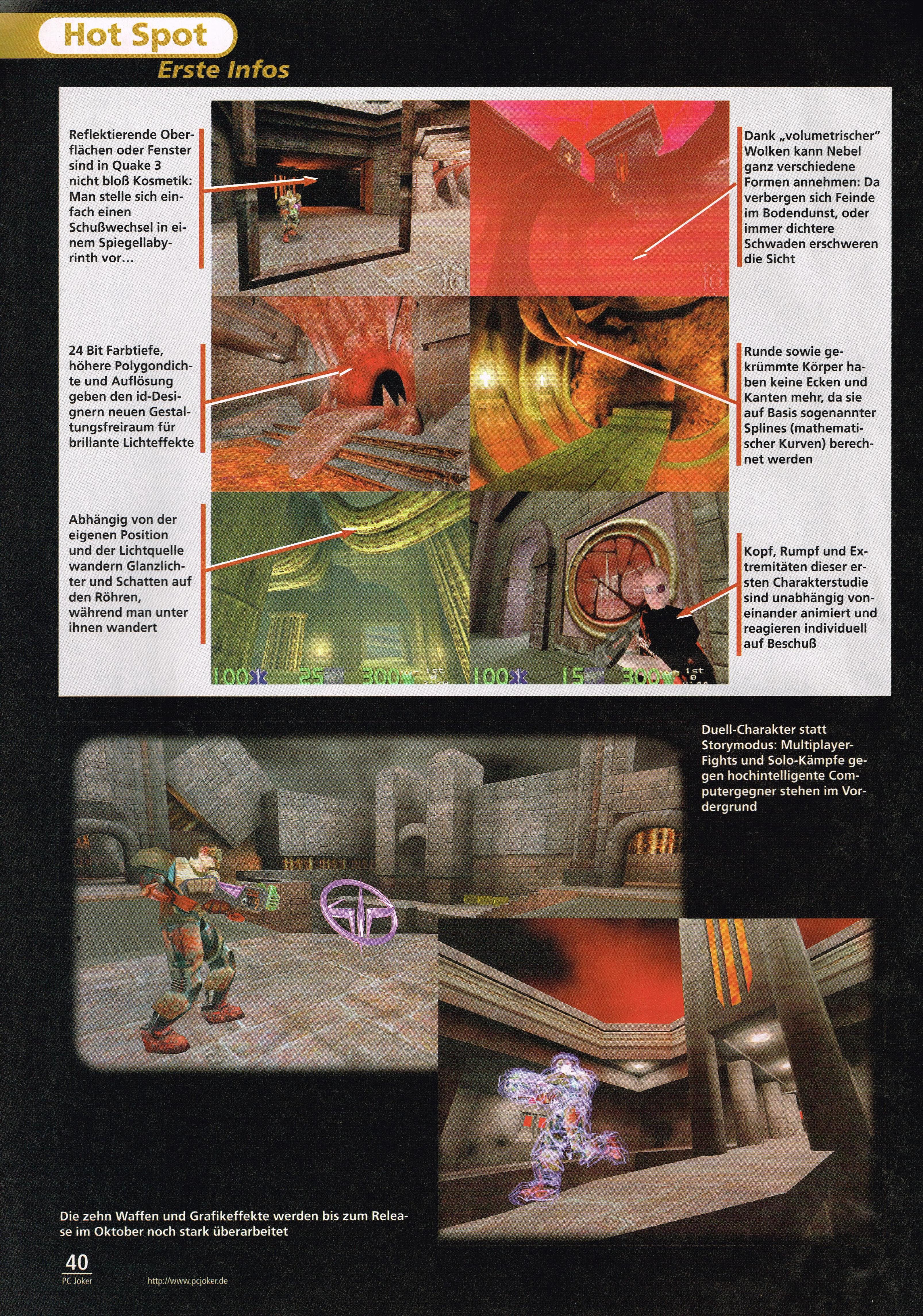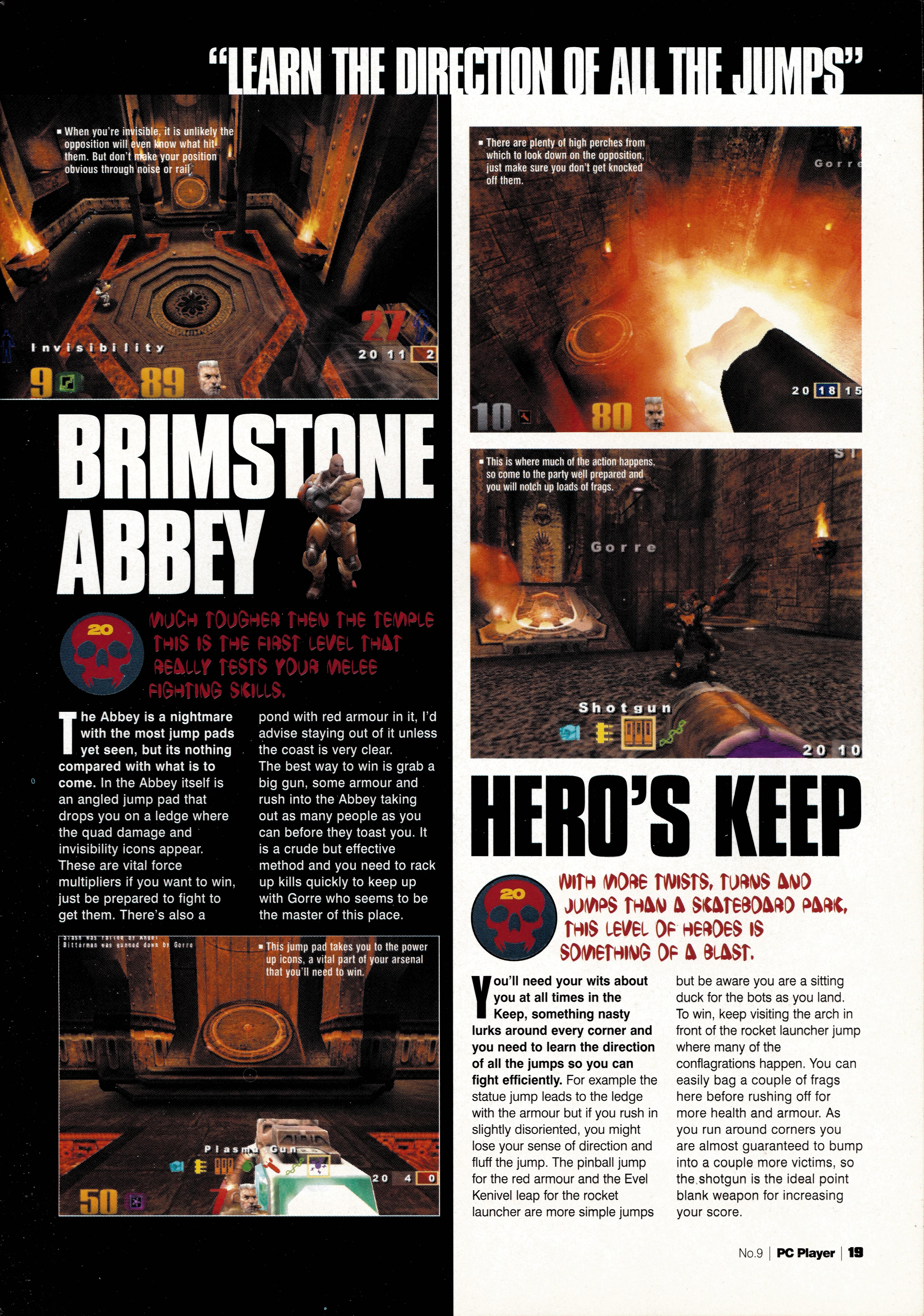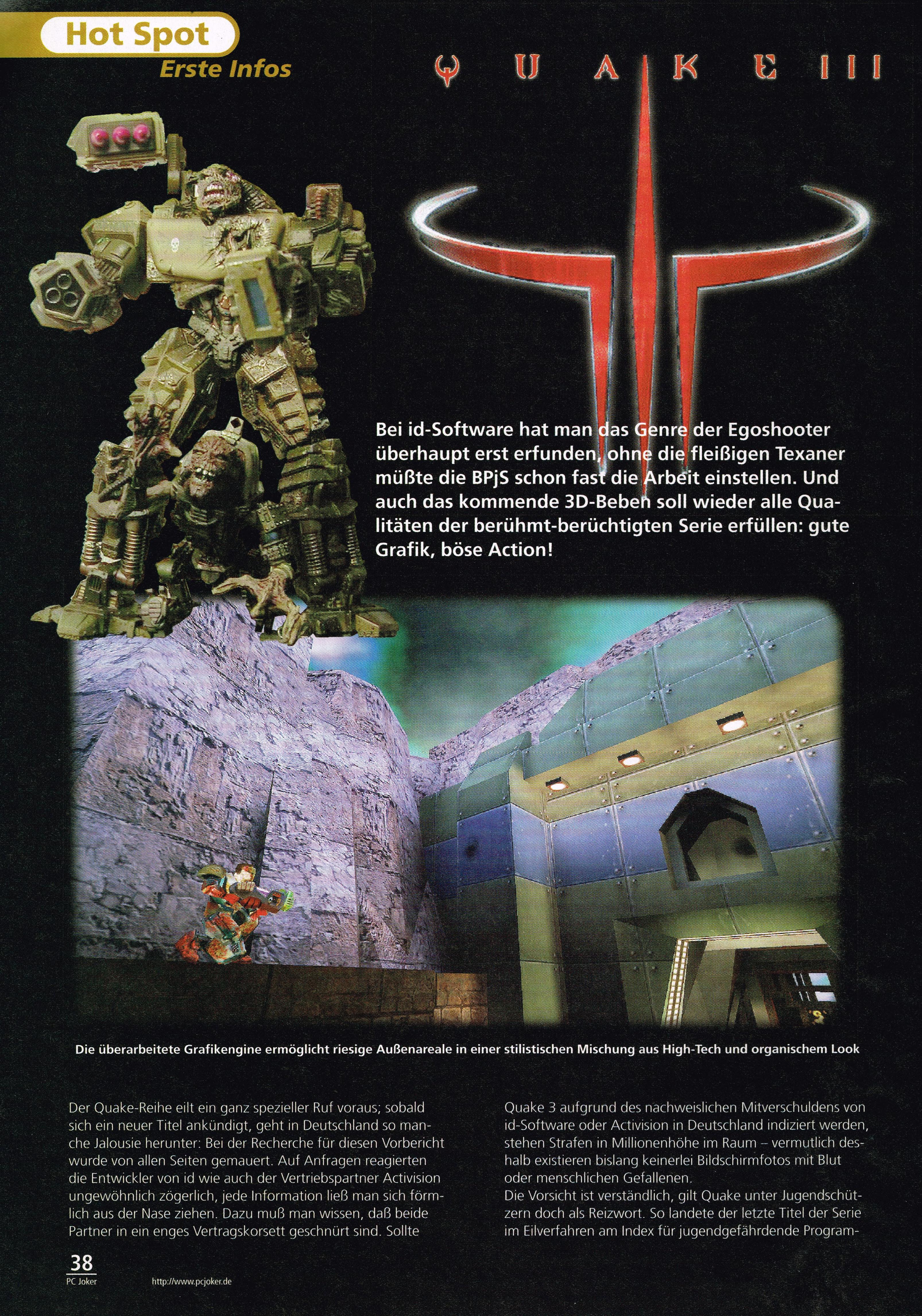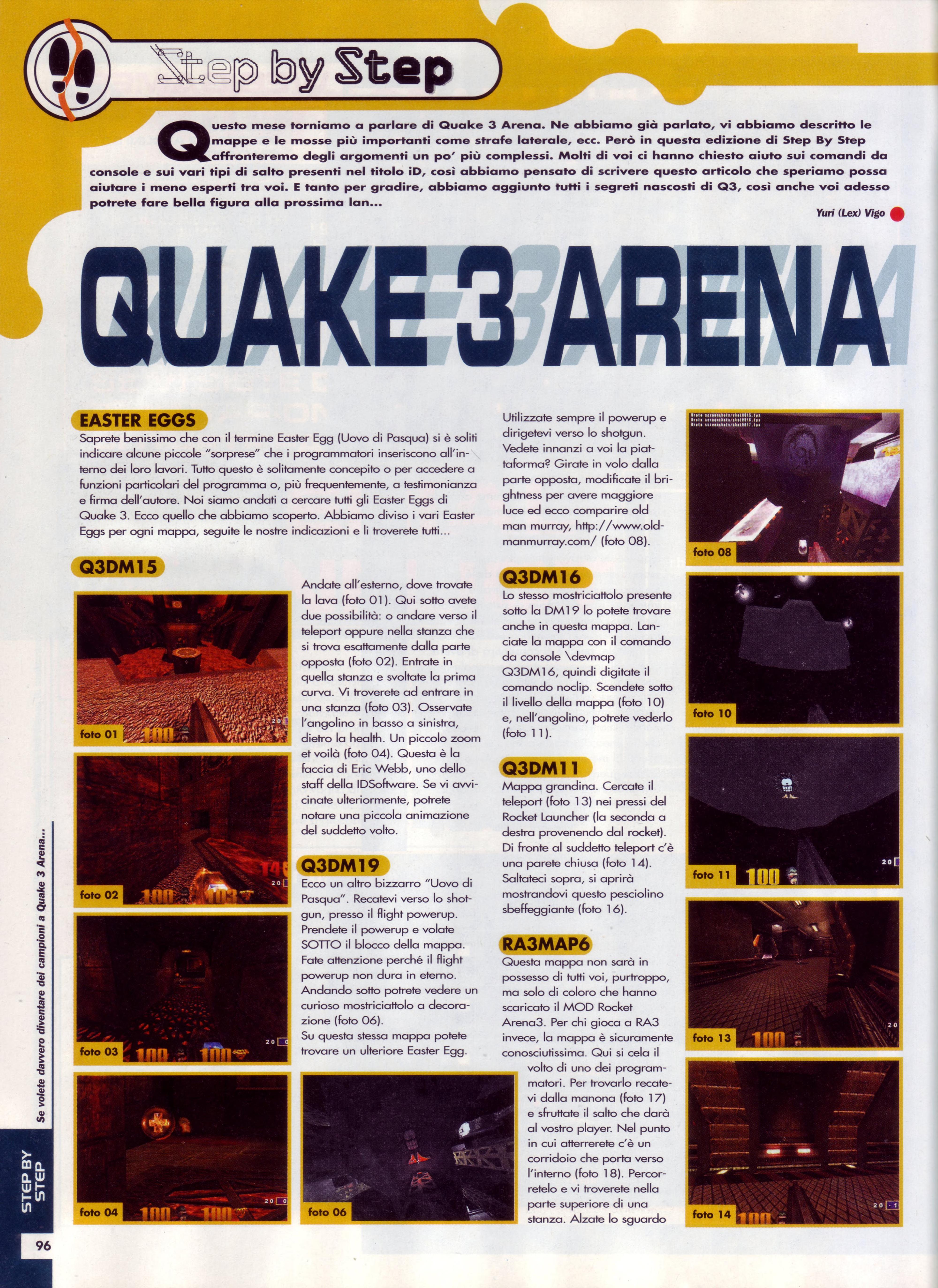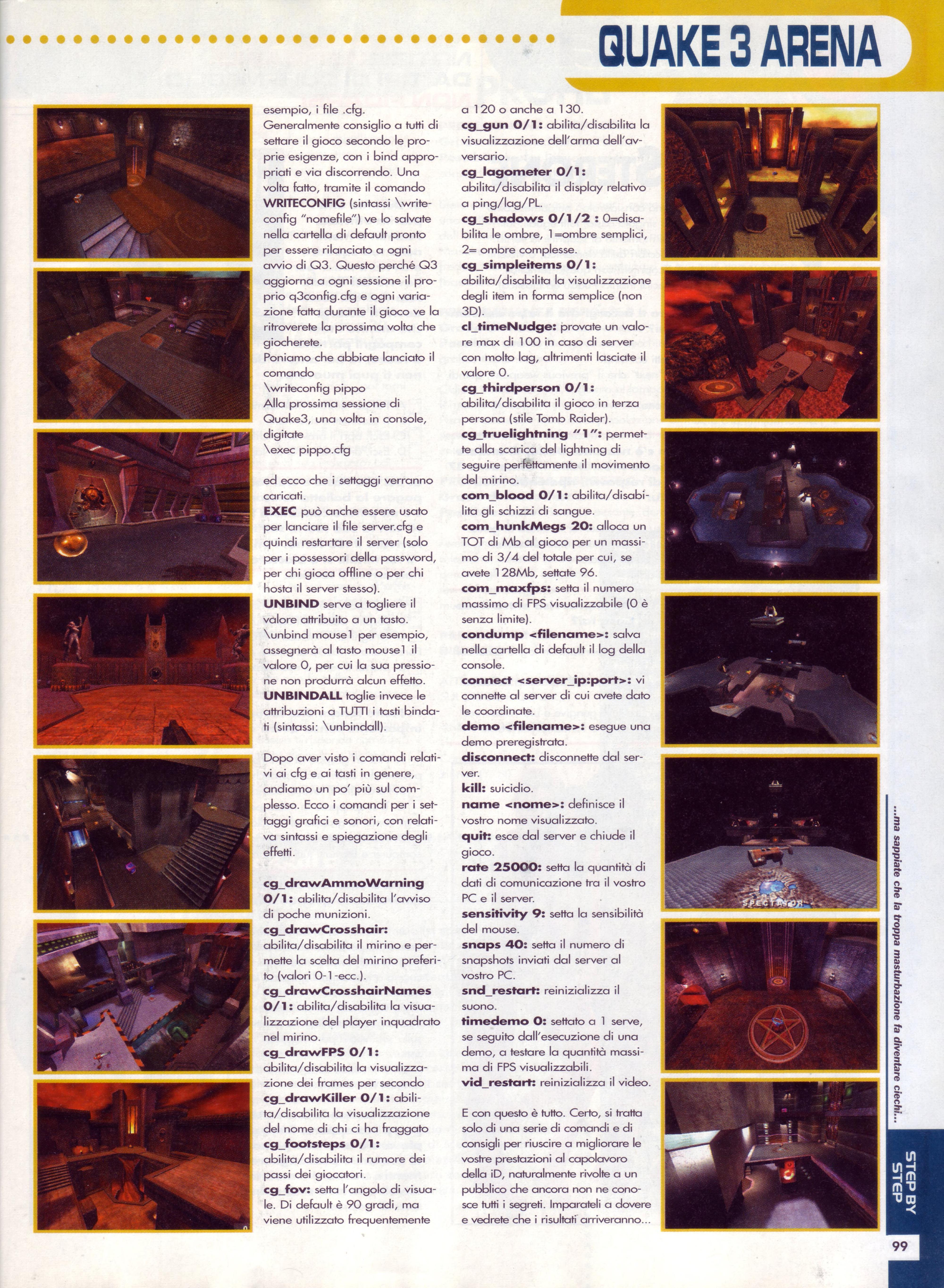 “The sound of footsteps, the smell of burning… you’d be a fool to fire a point blank rocket. Oh, you’re dead! Quake III Arena has been the most awaited game of the year and doesn’t disappoint those looking for the ultimate in deathmatch gaming. Load up, get online, and fight back with your very own BFG — that’s Big Fragging guide.”