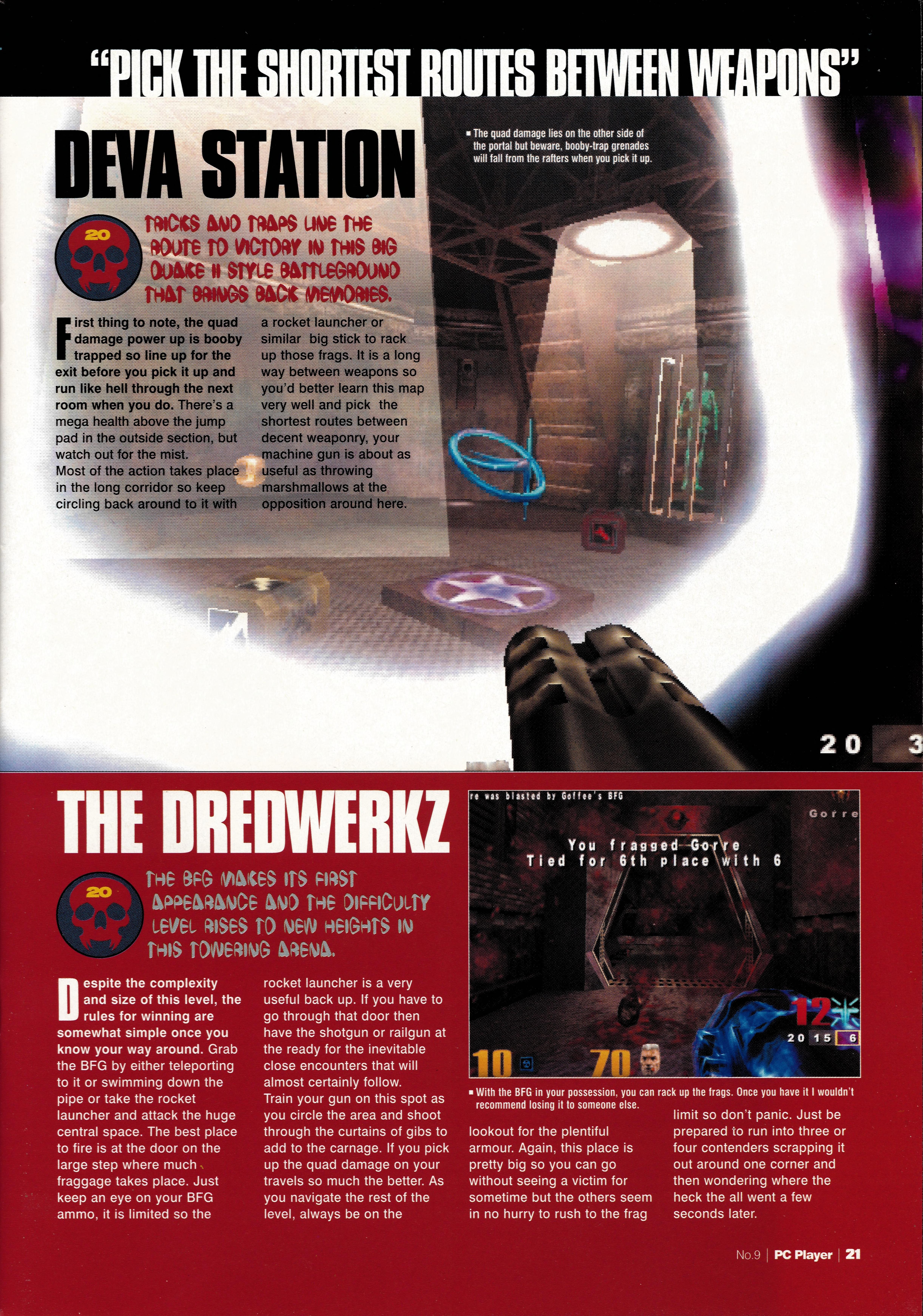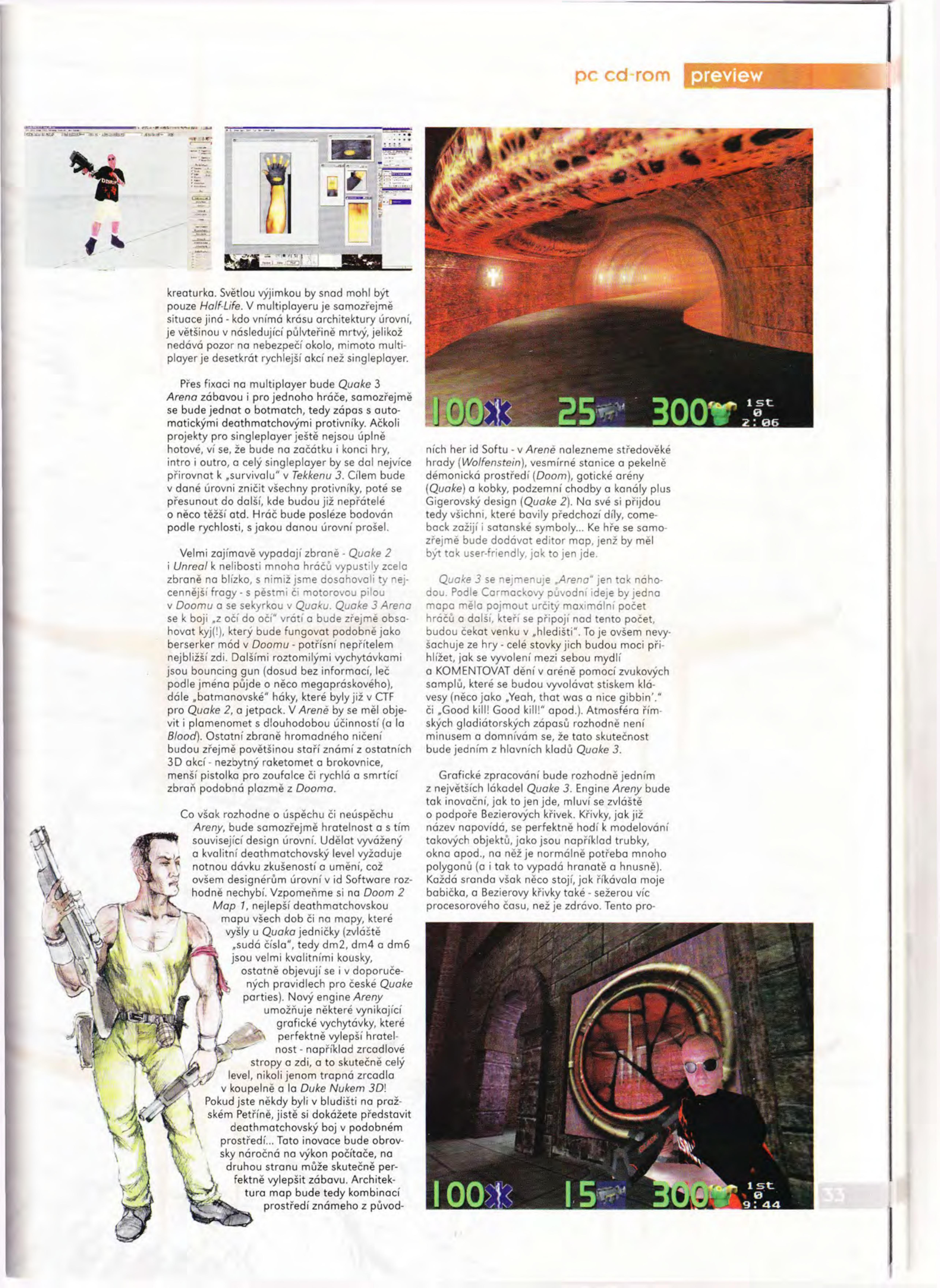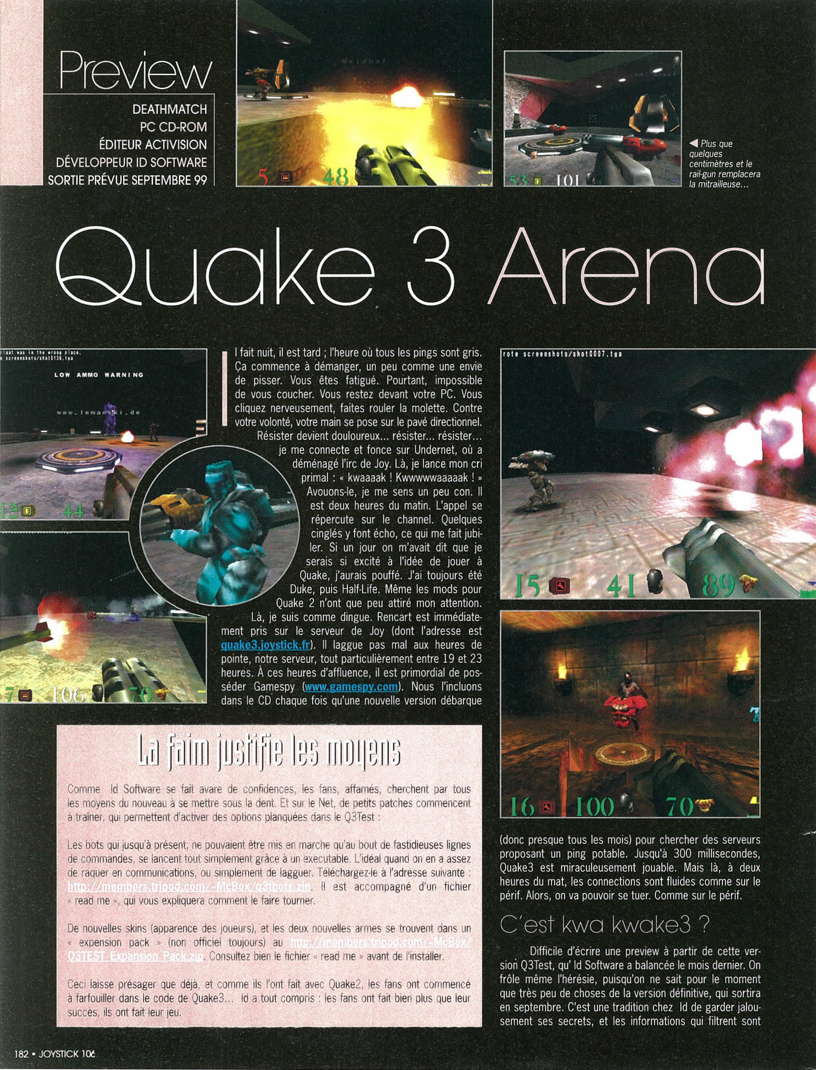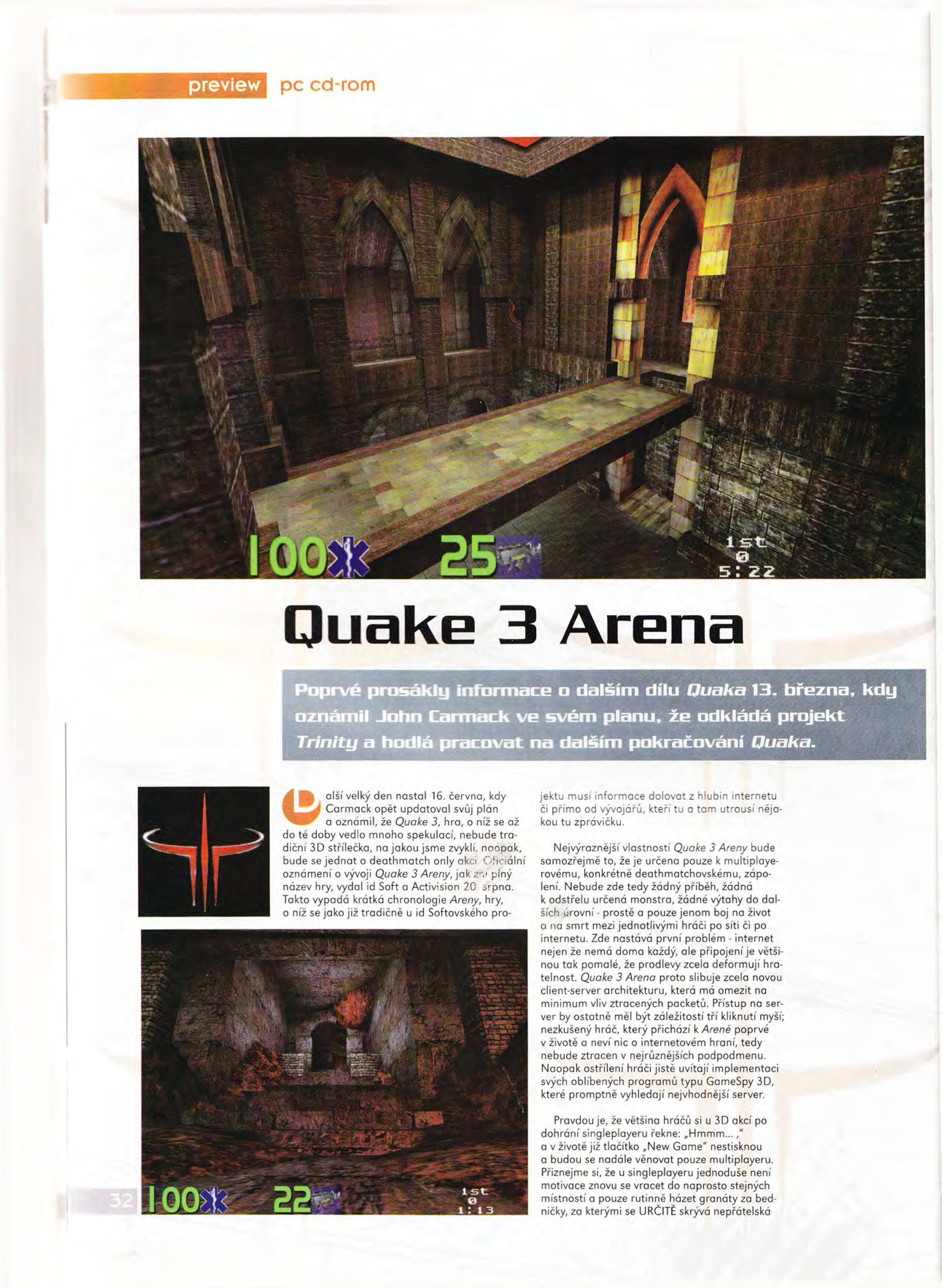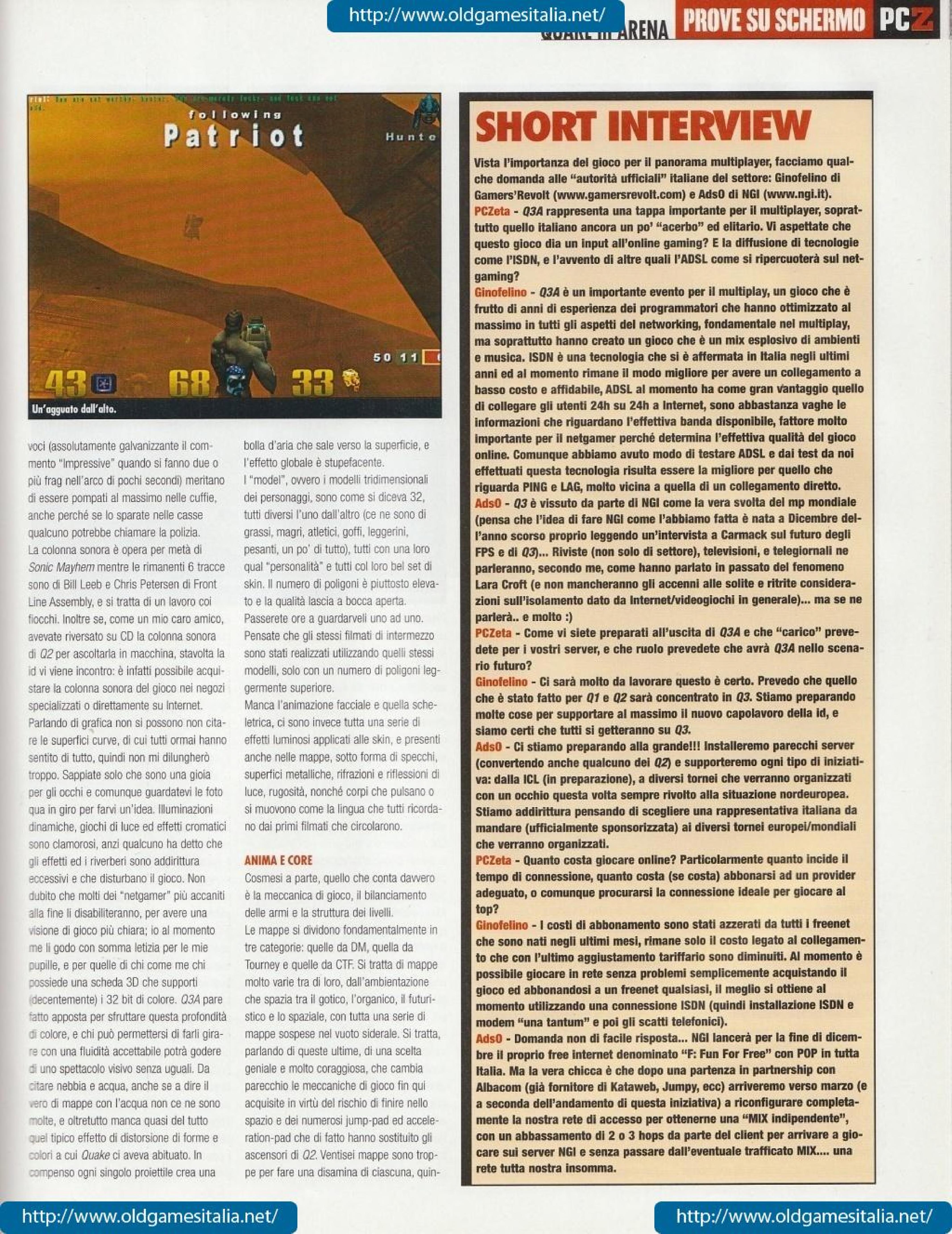 “The sound of footsteps, the smell of burning… you’d be a fool to fire a point blank rocket. Oh, you’re dead! Quake III Arena has been the most awaited game of the year and doesn’t disappoint those looking for the ultimate in deathmatch gaming. Load up, get online, and fight back with your very own BFG — that’s Big Fragging guide.”