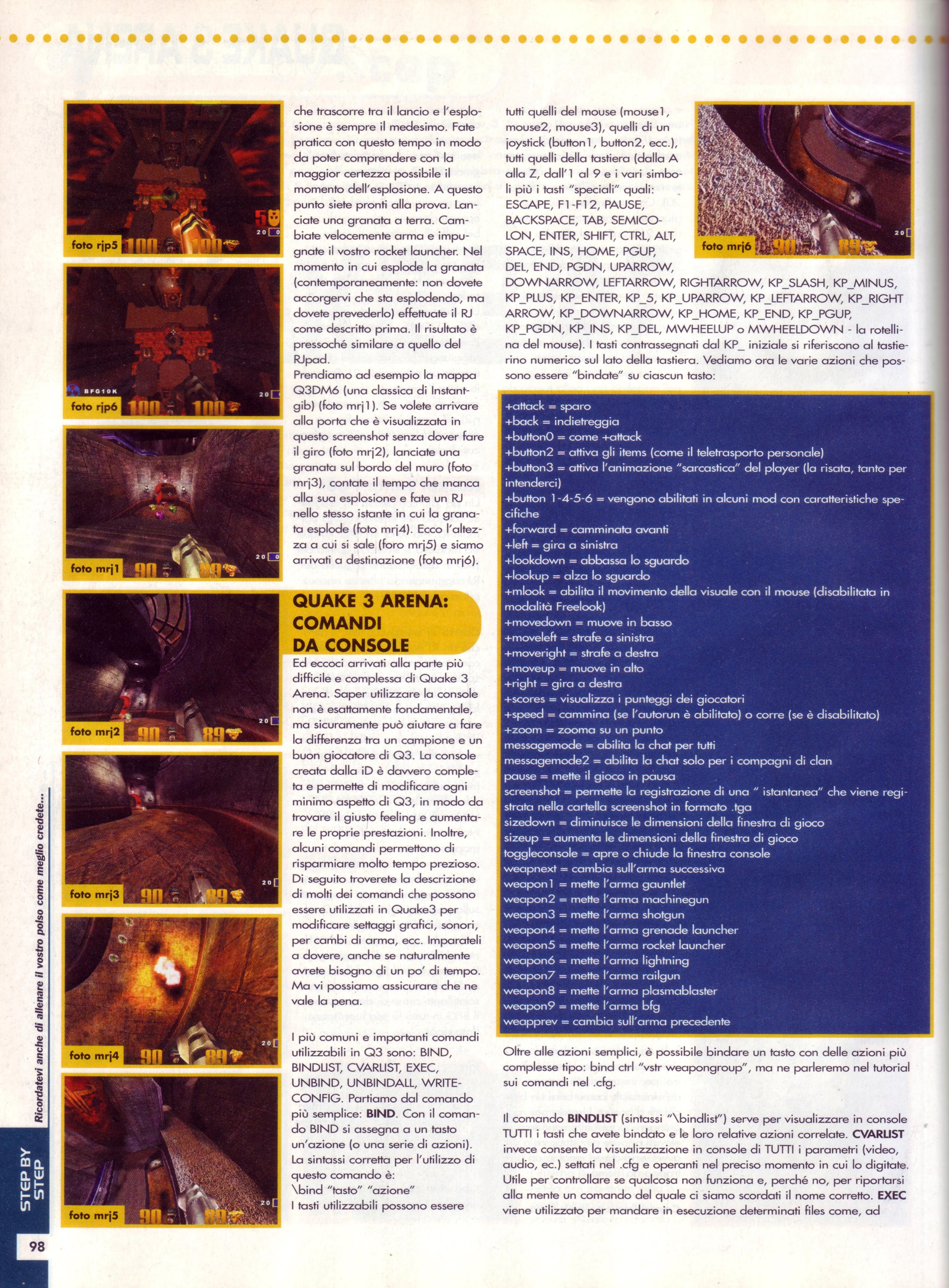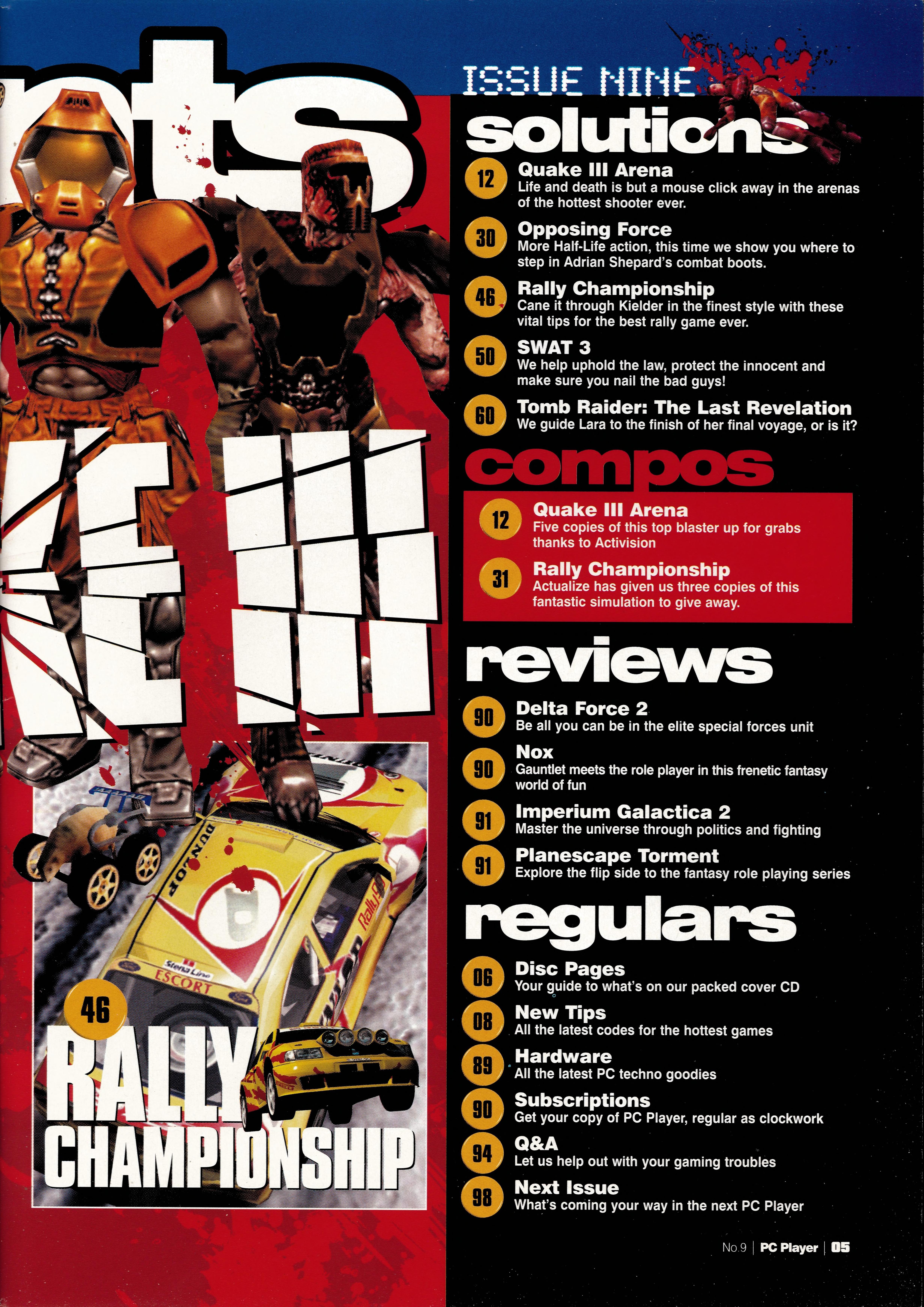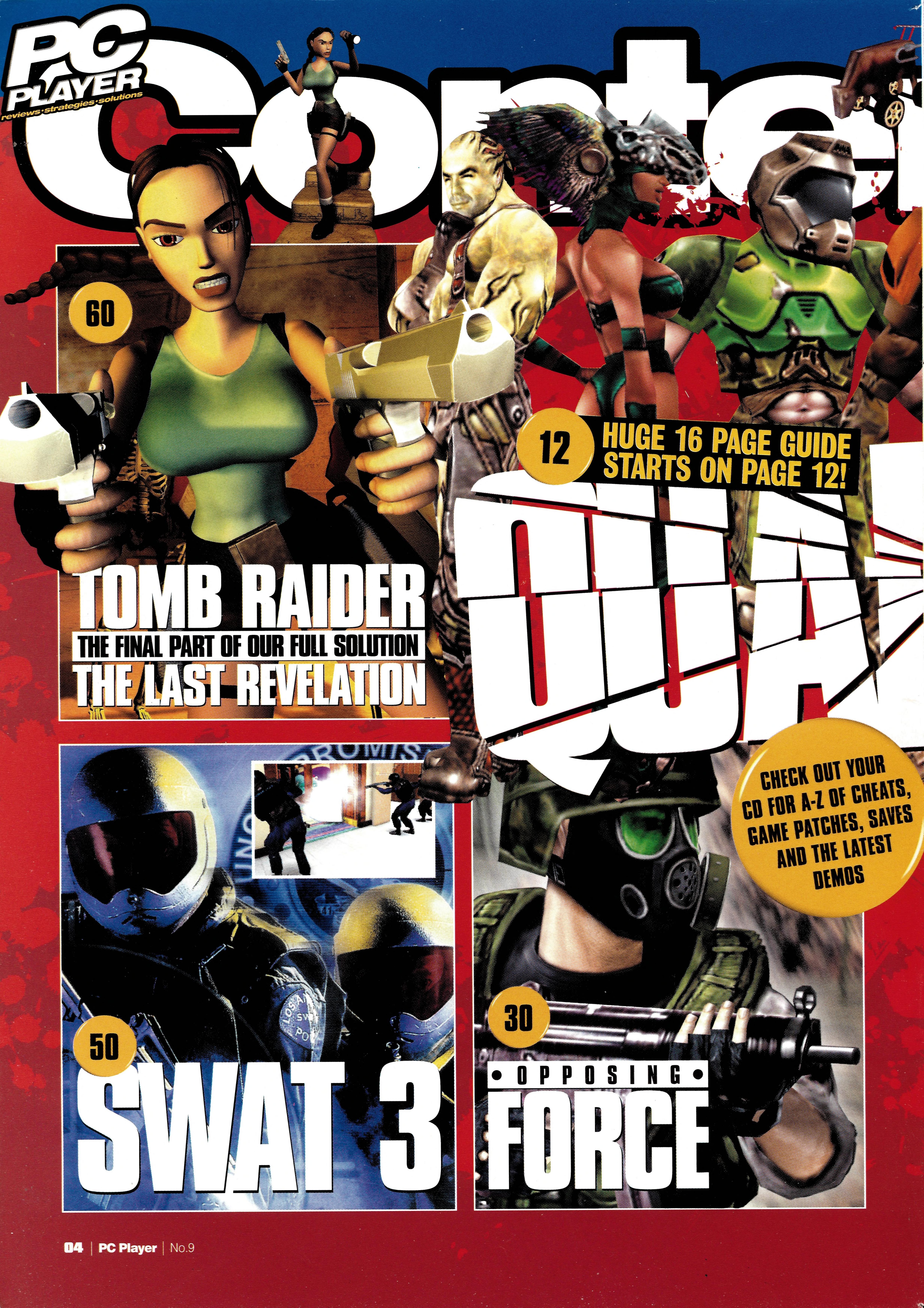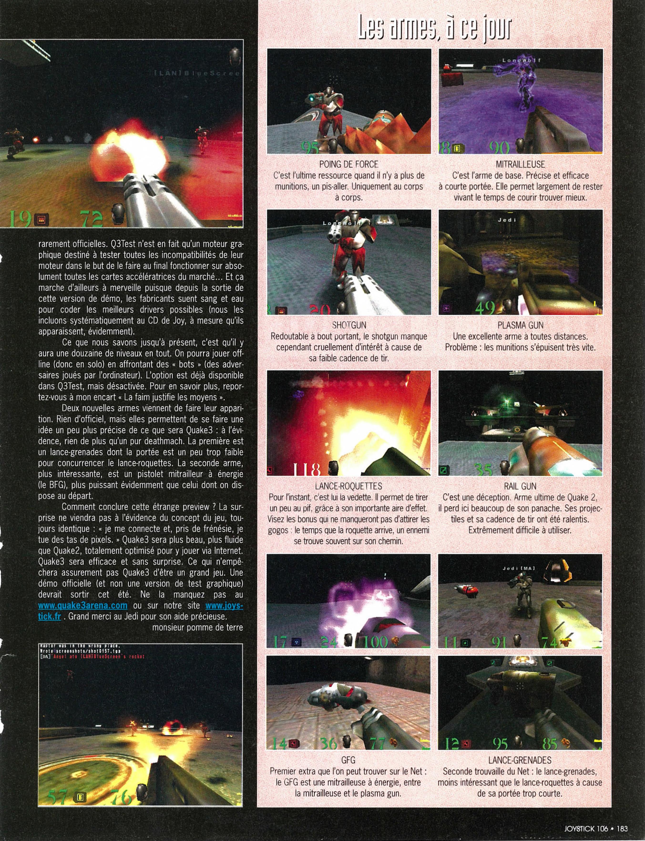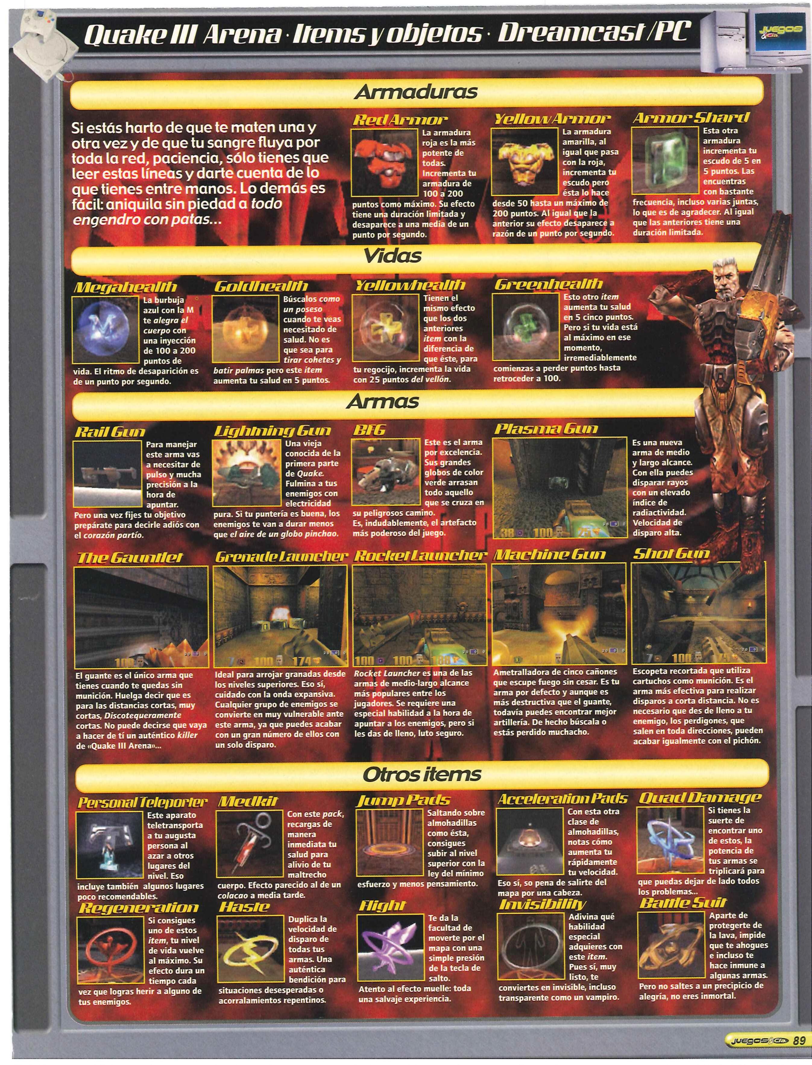 “The sound of footsteps, the smell of burning… you’d be a fool to fire a point blank rocket. Oh, you’re dead! Quake III Arena has been the most awaited game of the year and doesn’t disappoint those looking for the ultimate in deathmatch gaming. Load up, get online, and fight back with your very own BFG — that’s Big Fragging guide.”