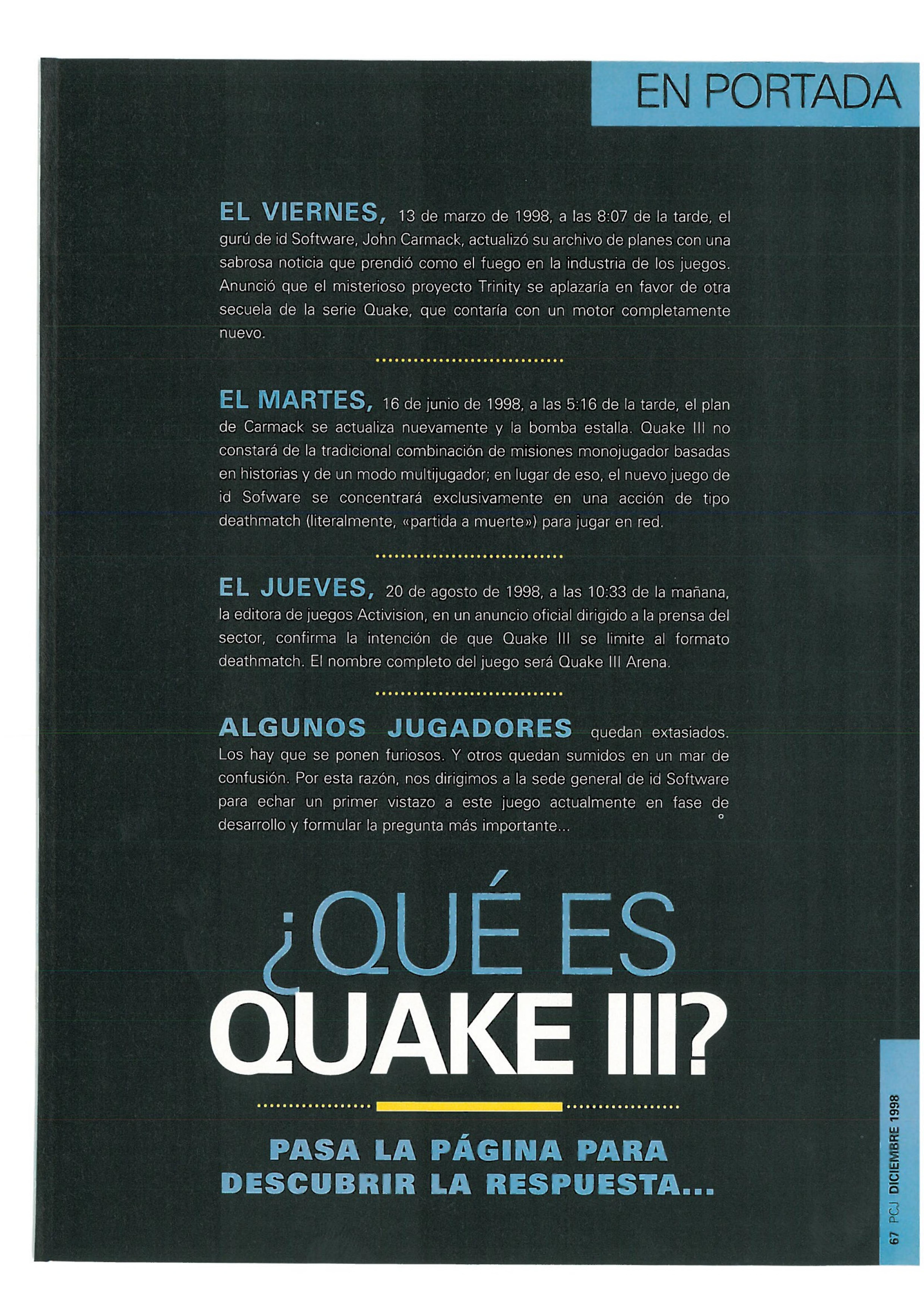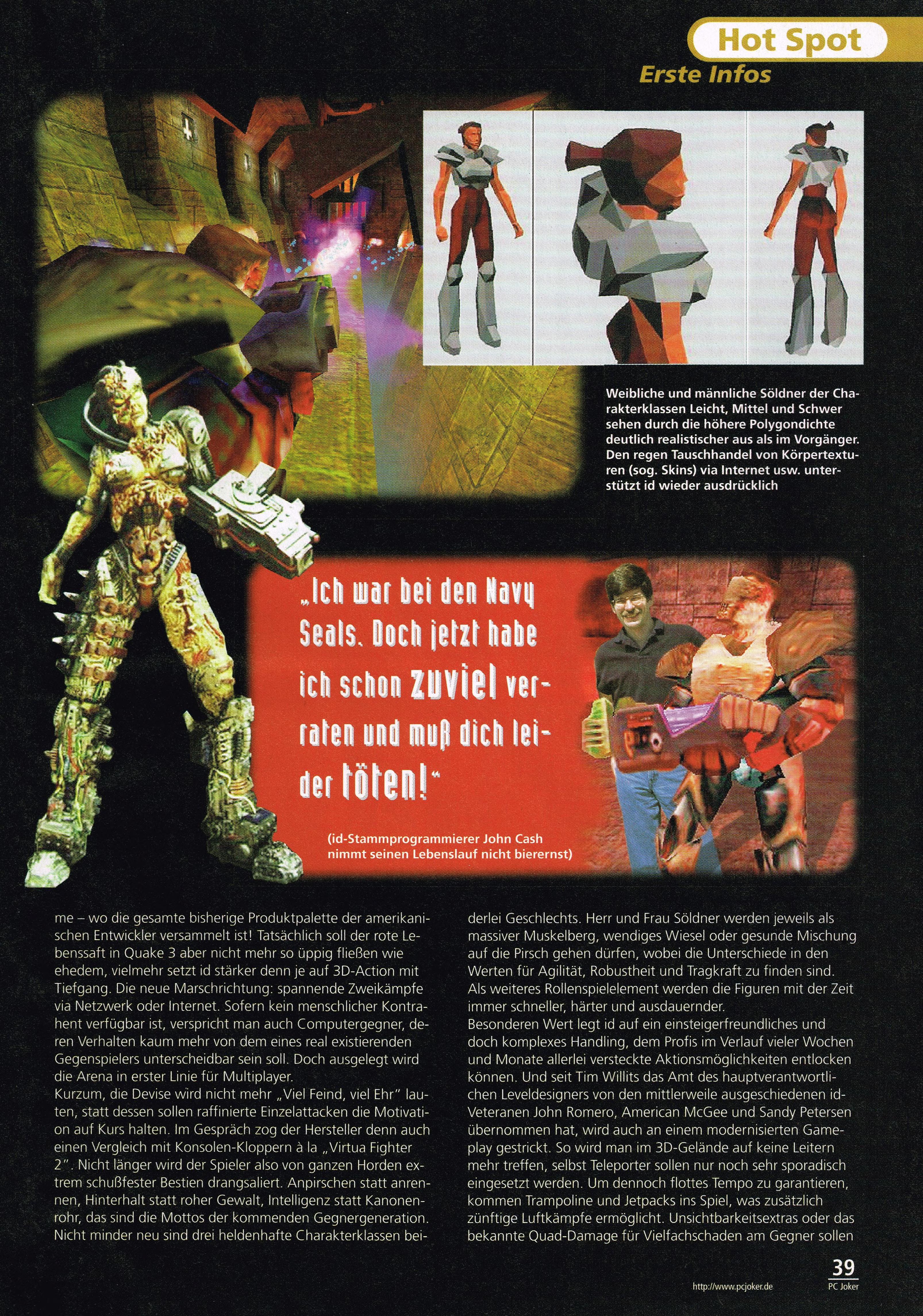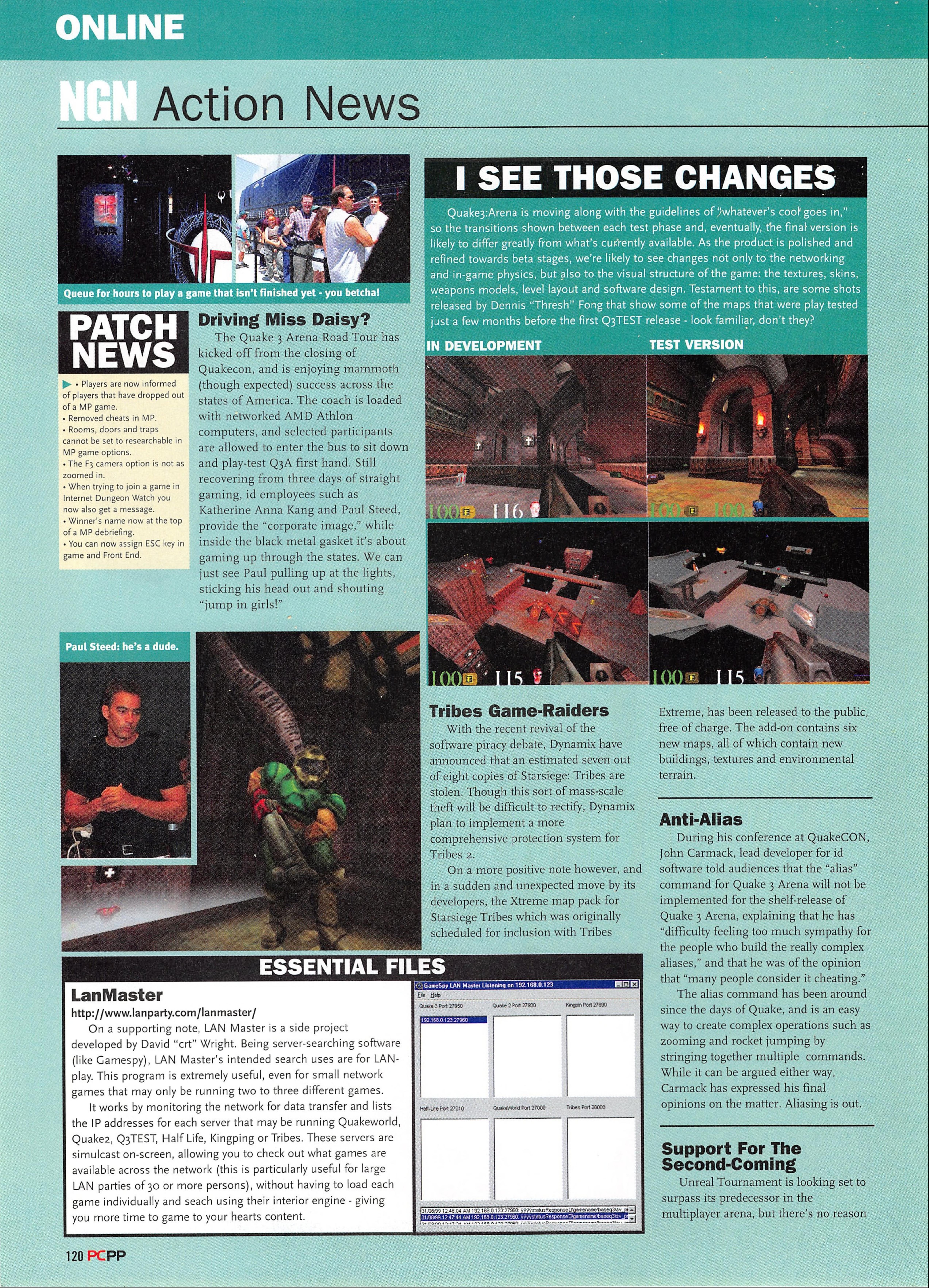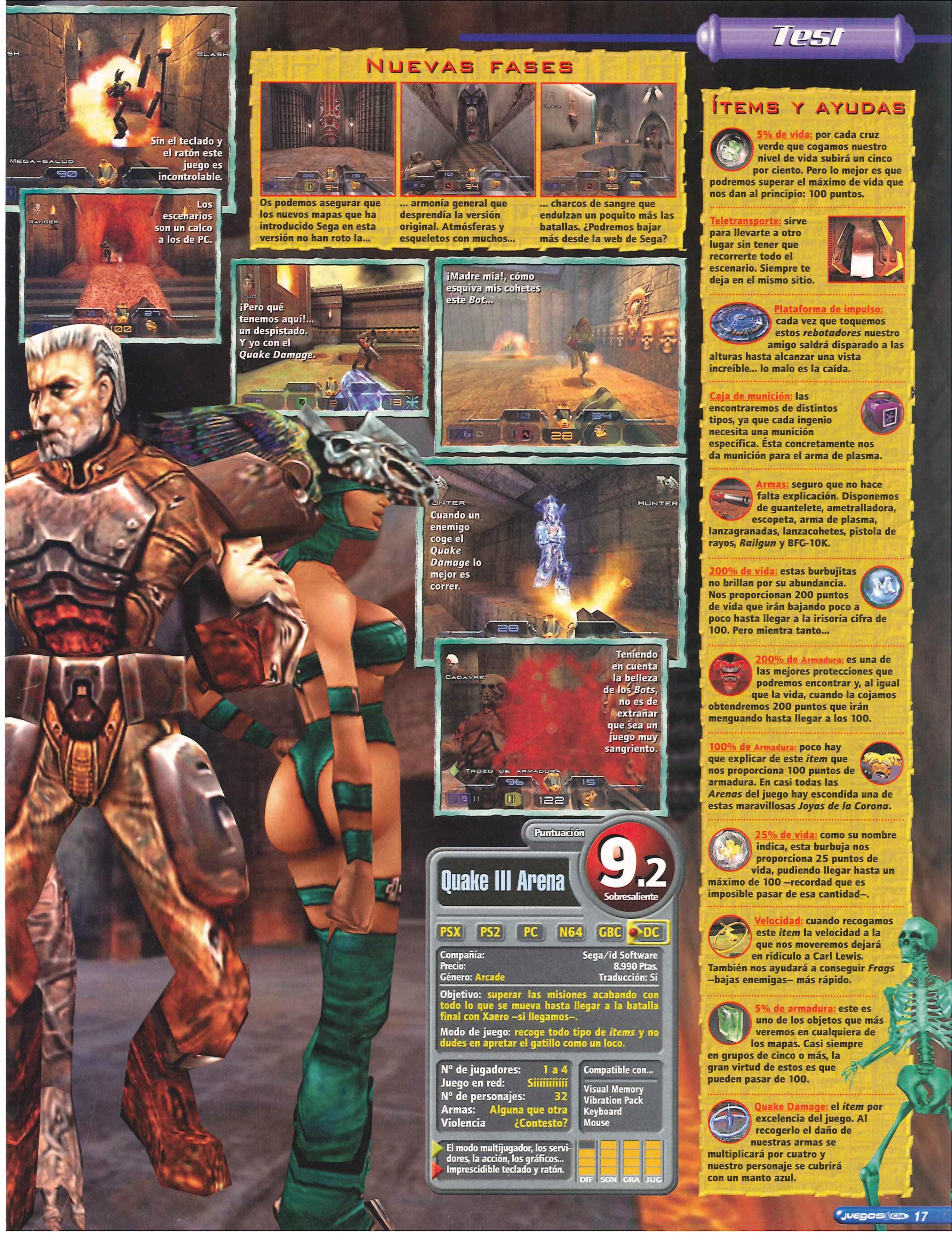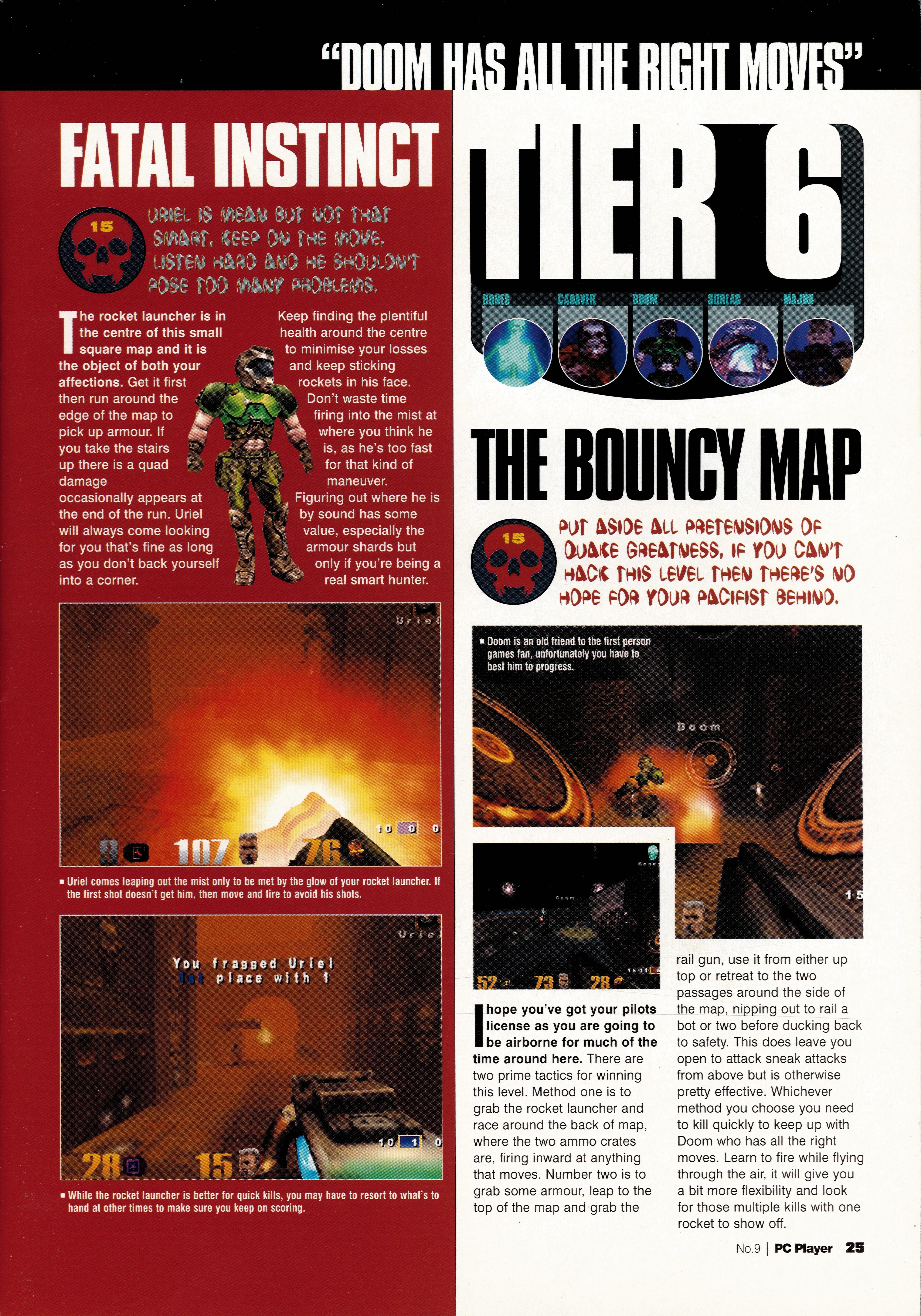 “The sound of footsteps, the smell of burning… you’d be a fool to fire a point blank rocket. Oh, you’re dead! Quake III Arena has been the most awaited game of the year and doesn’t disappoint those looking for the ultimate in deathmatch gaming. Load up, get online, and fight back with your very own BFG — that’s Big Fragging guide.”