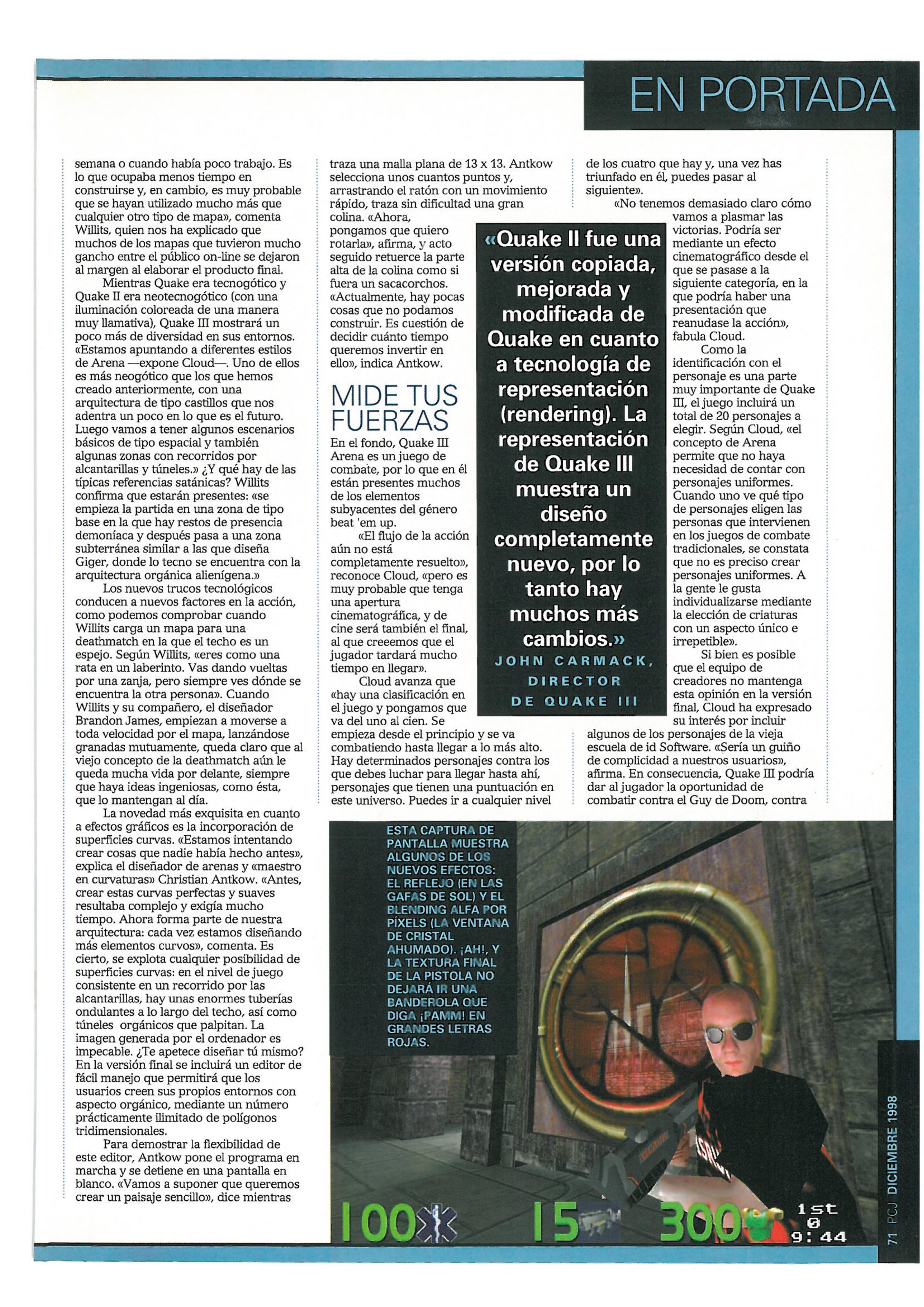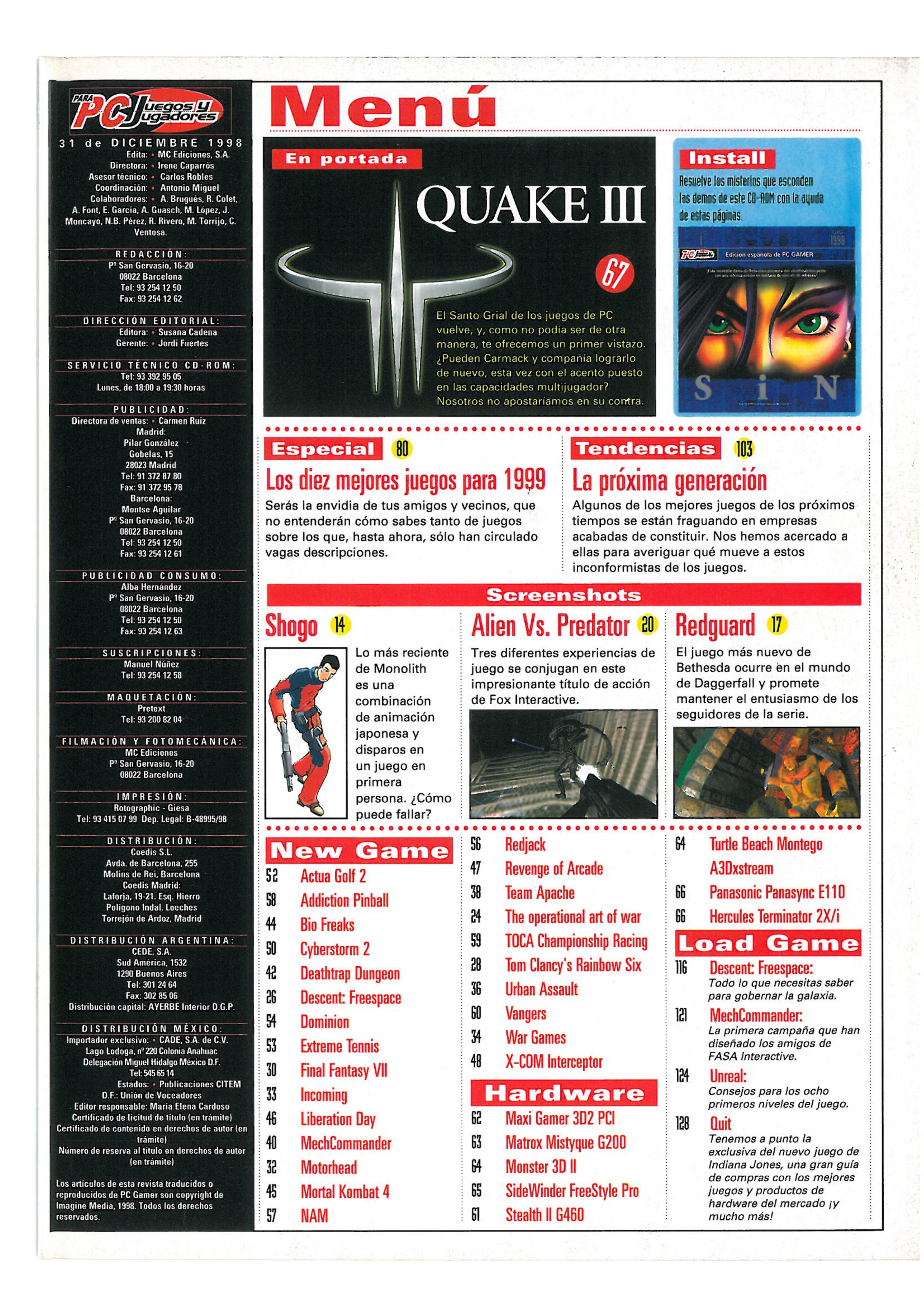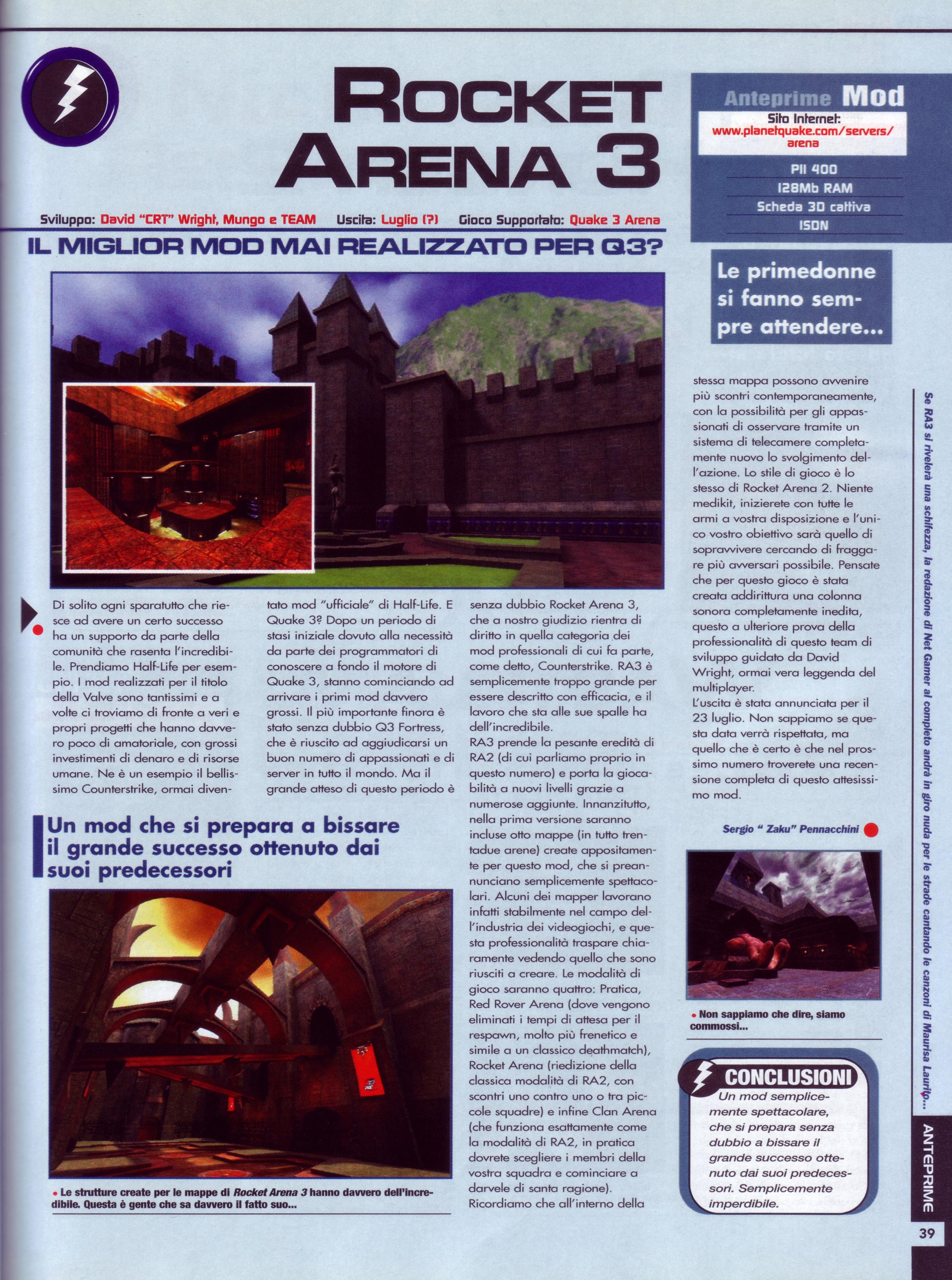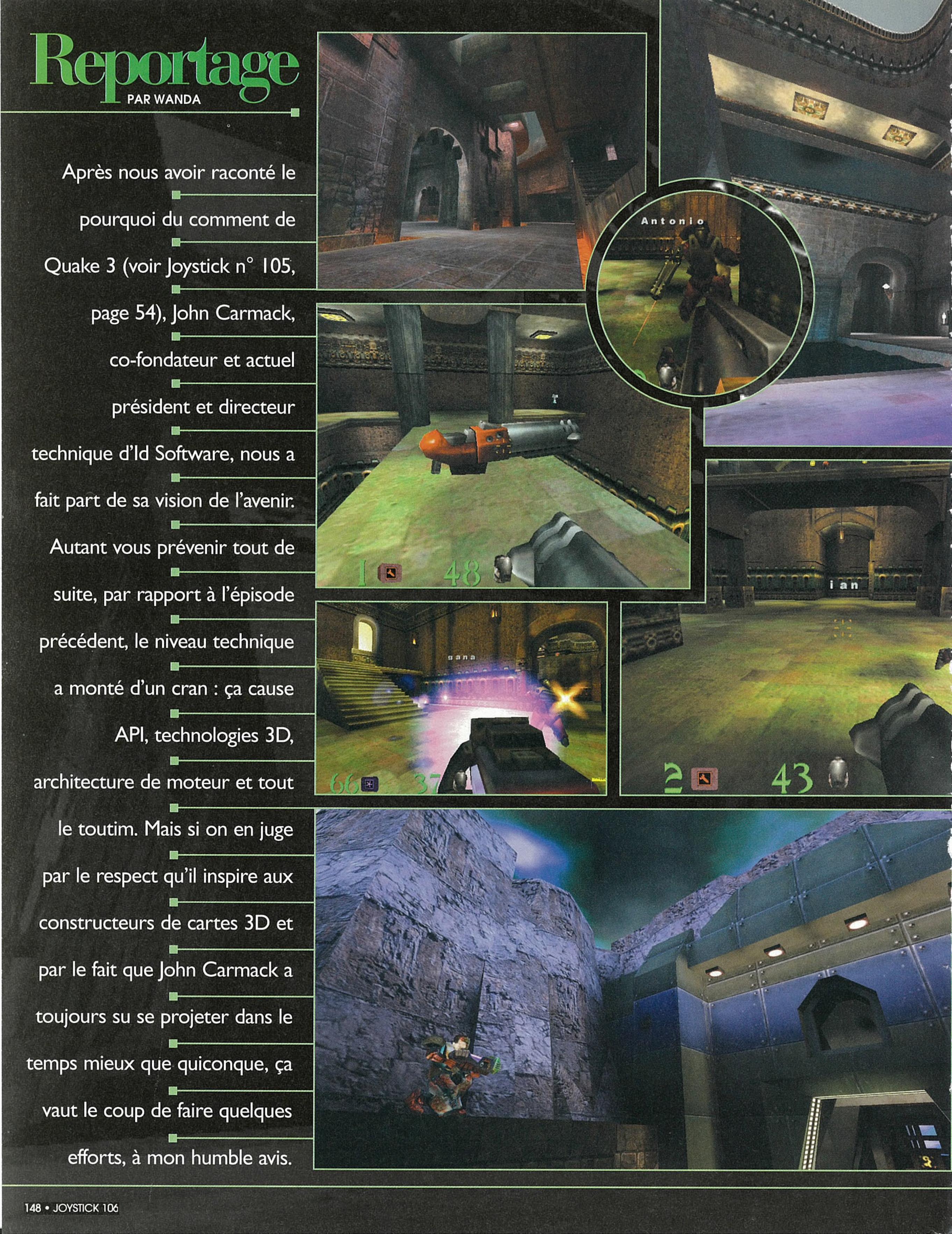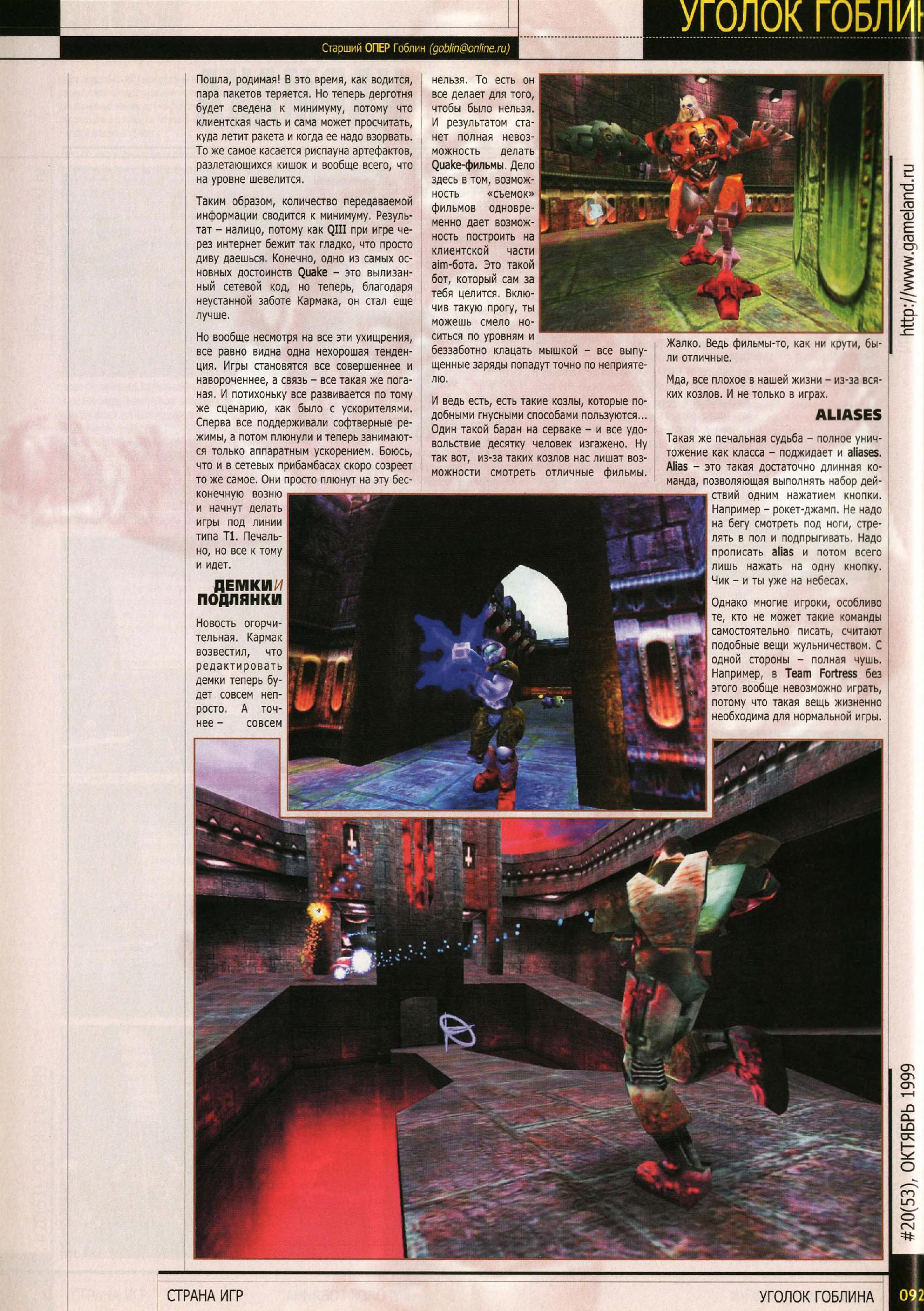 “The sound of footsteps, the smell of burning… you’d be a fool to fire a point blank rocket. Oh, you’re dead! Quake III Arena has been the most awaited game of the year and doesn’t disappoint those looking for the ultimate in deathmatch gaming. Load up, get online, and fight back with your very own BFG — that’s Big Fragging guide.”
