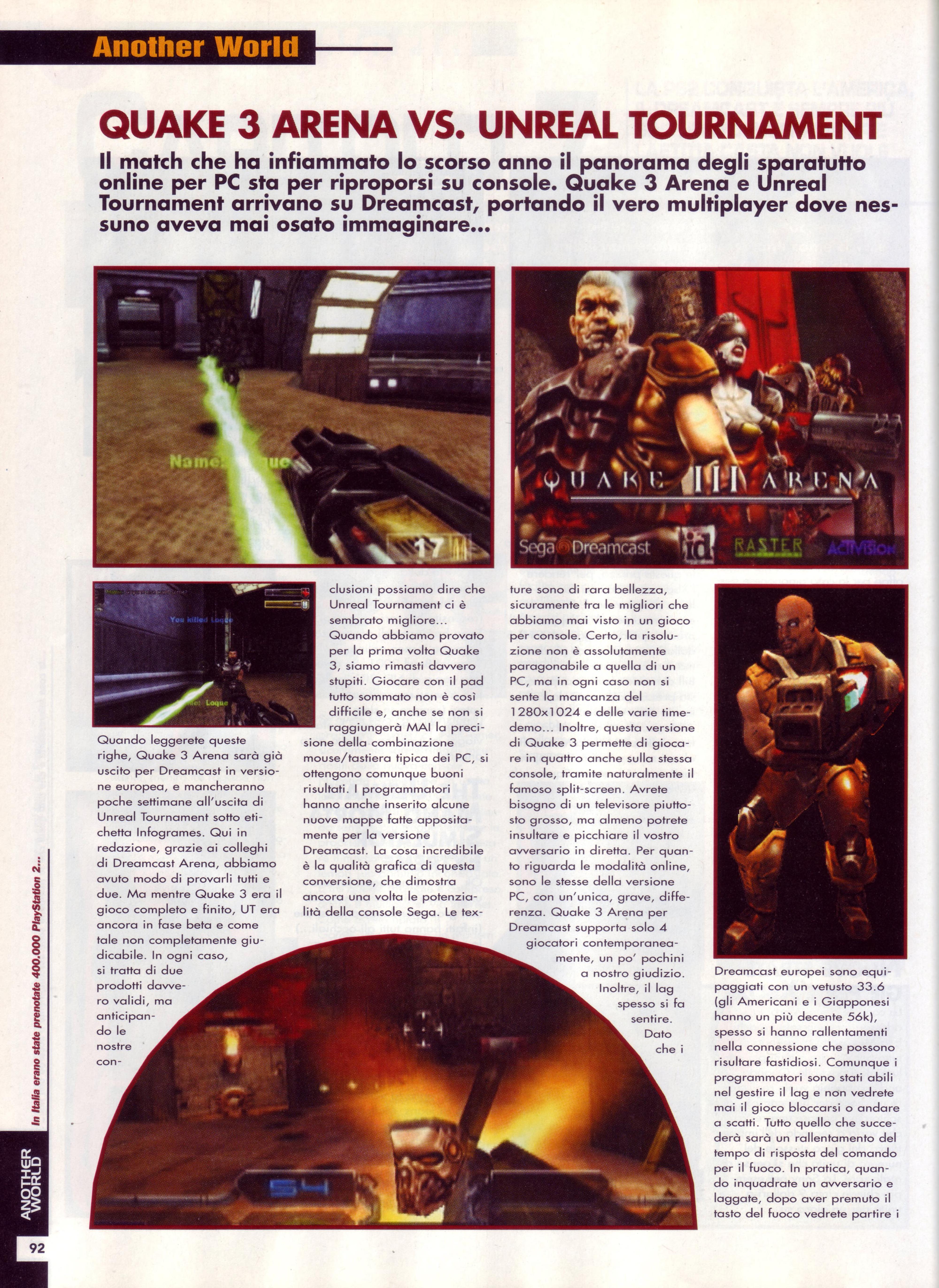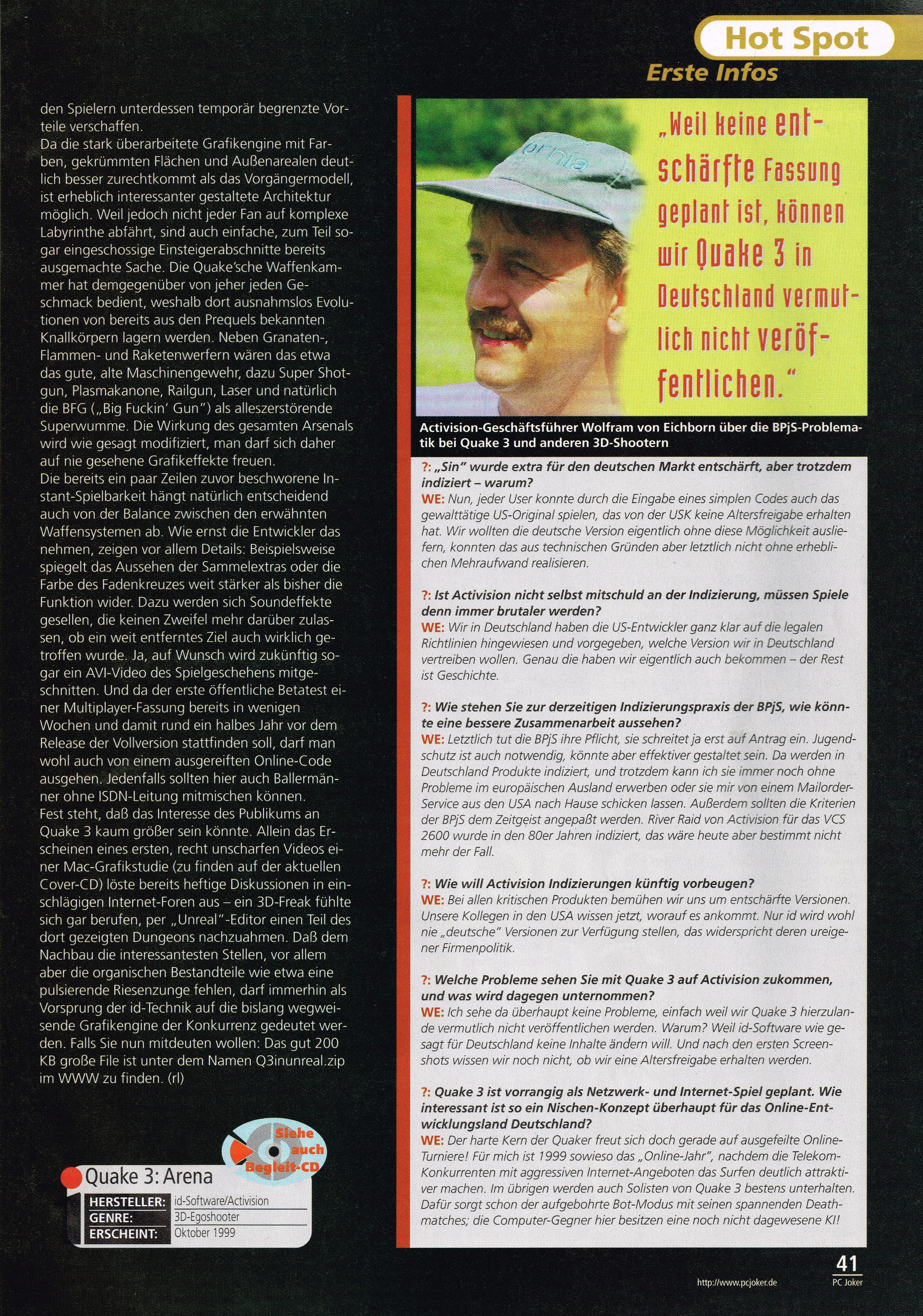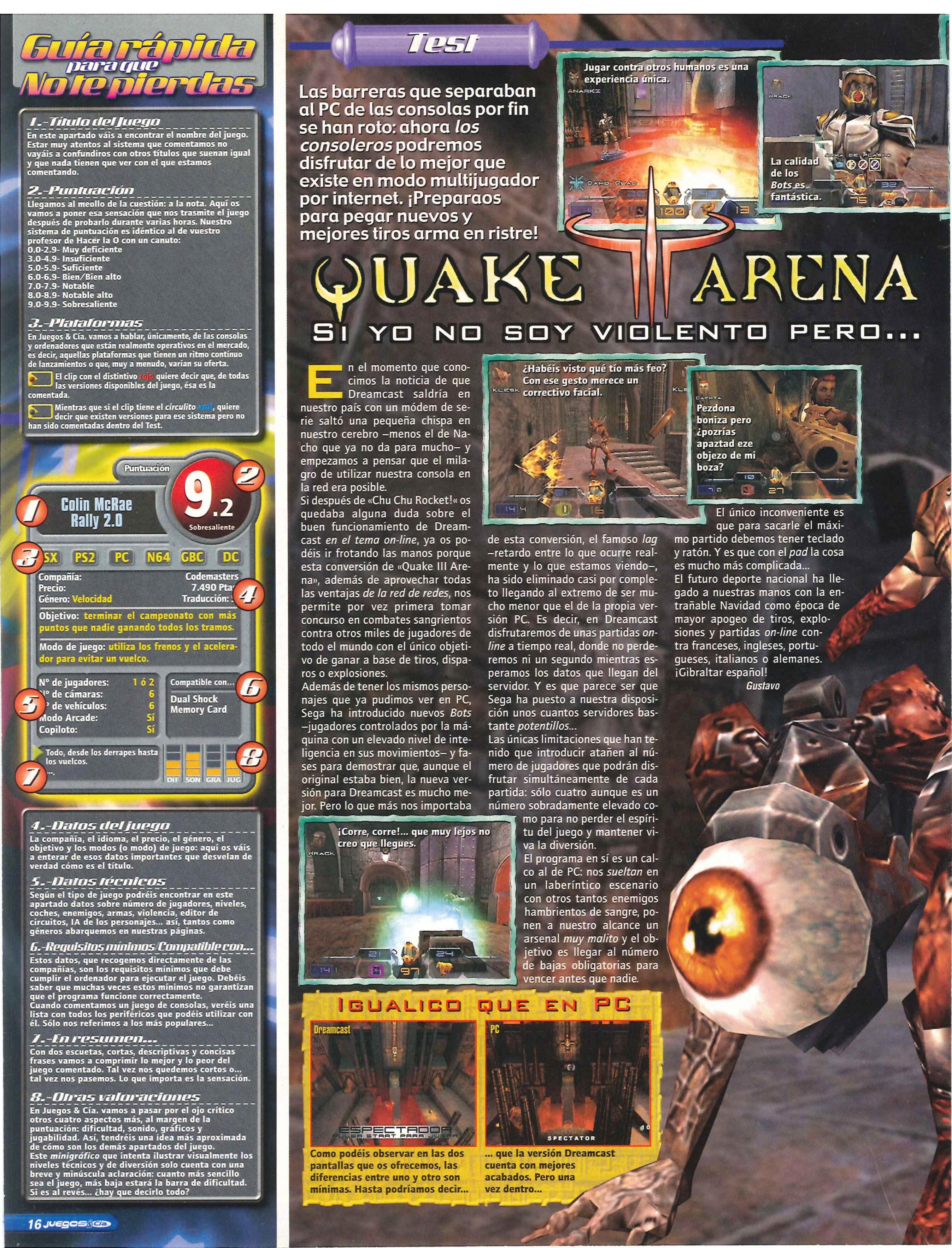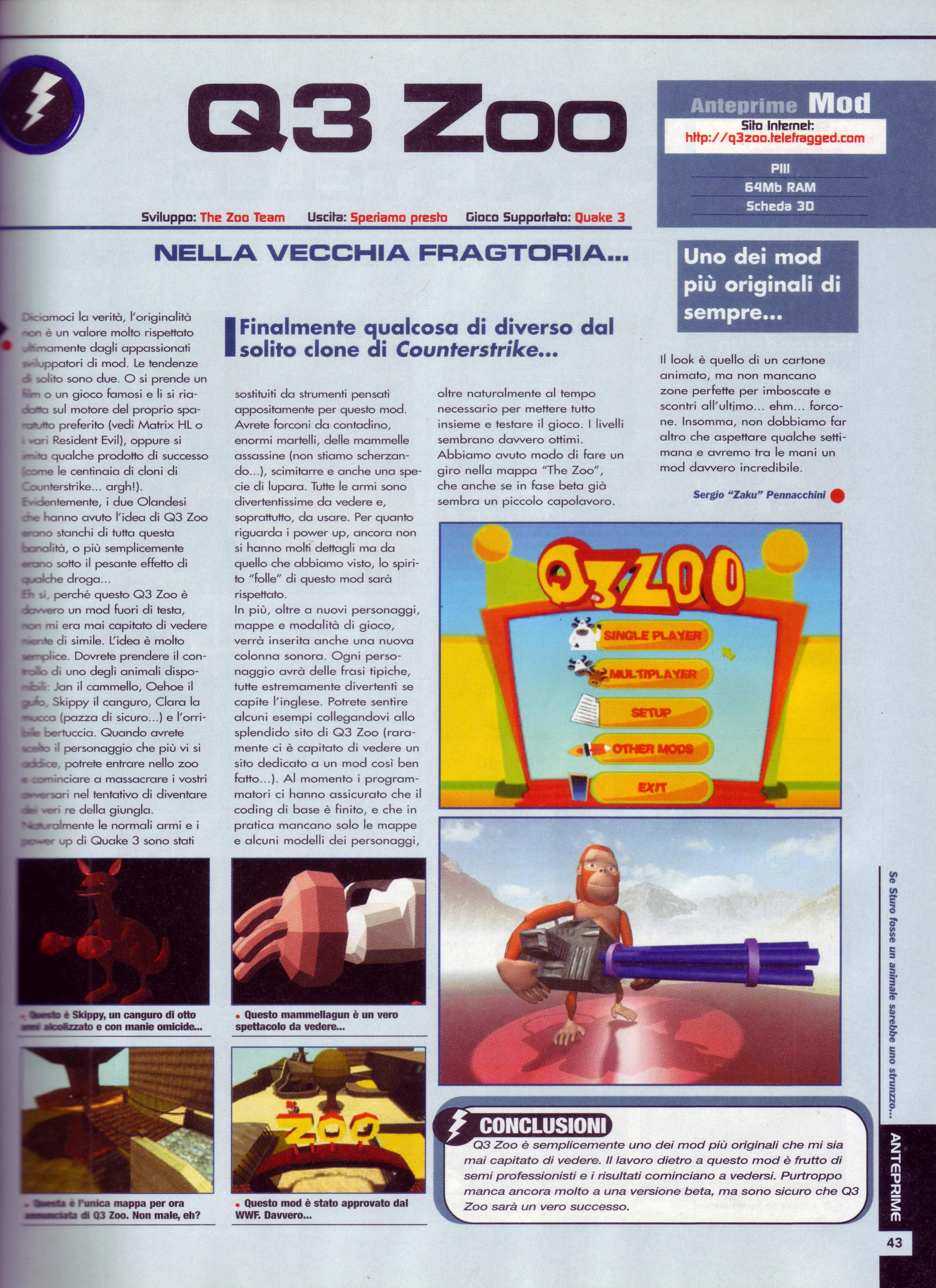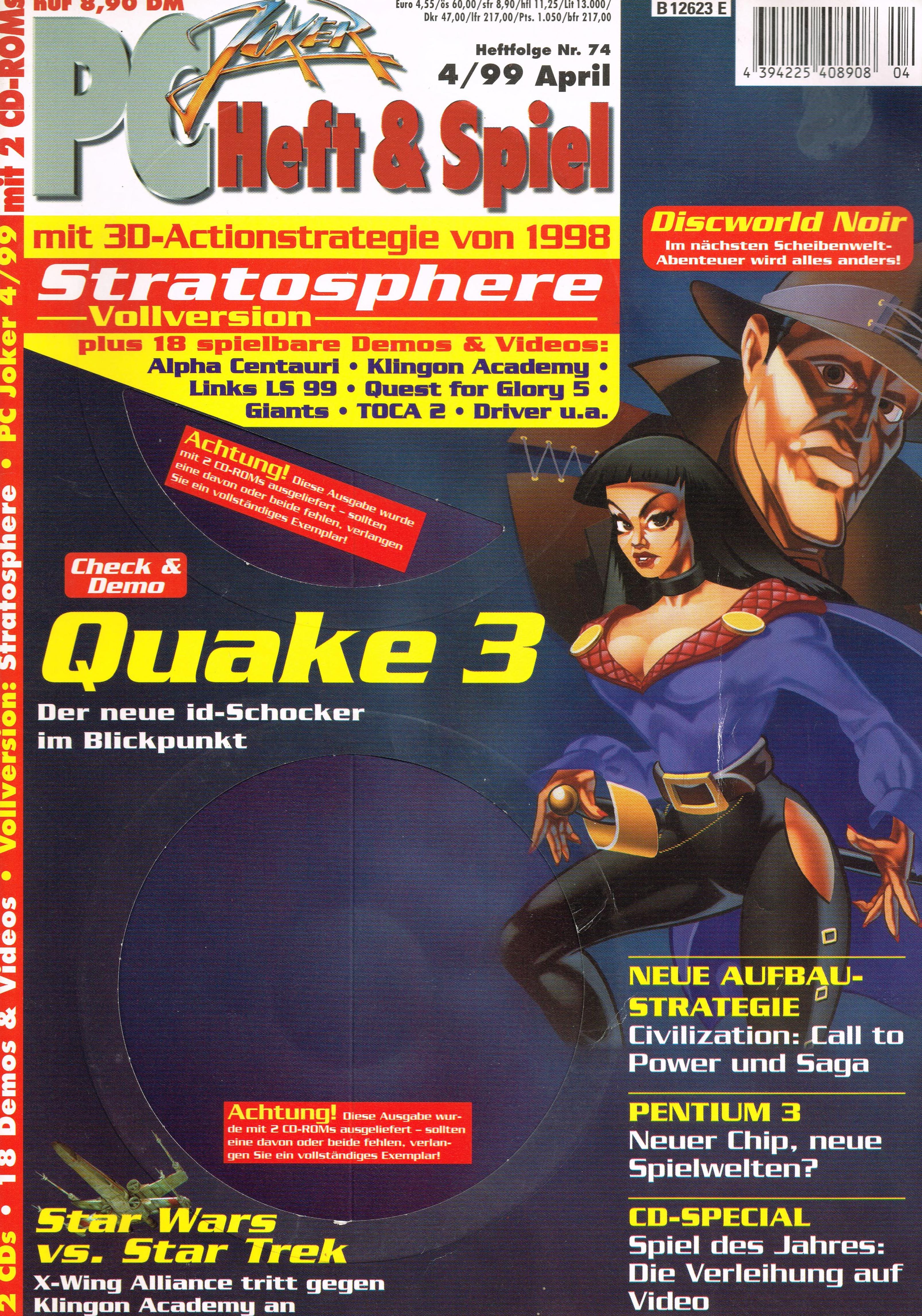 “The sound of footsteps, the smell of burning… you’d be a fool to fire a point blank rocket. Oh, you’re dead! Quake III Arena has been the most awaited game of the year and doesn’t disappoint those looking for the ultimate in deathmatch gaming. Load up, get online, and fight back with your very own BFG — that’s Big Fragging guide.”