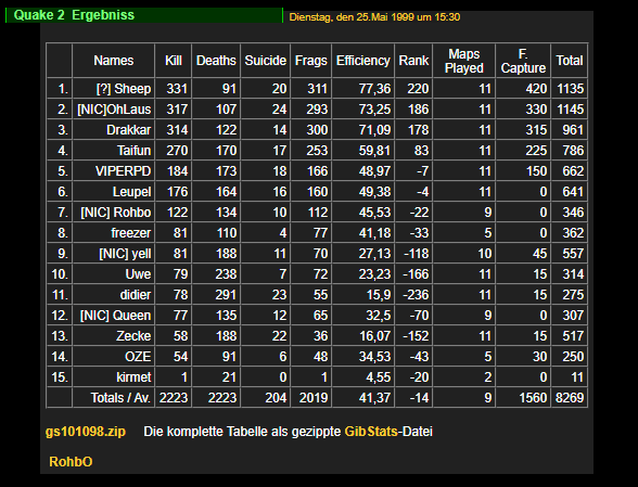 Wenn die Party gefeiert ist und das Fest zu Ende dann darf auch ein Kommentar nicht fehlen. Zu schnell vorbei, zu kurz die Zeit und zu vergänglich der Augenblick des Sieges , das waren nur einige Meinungen die ich, im Anschluß an unser Netzfest, aus dem Stimmen- gewirr der angereisten Teilnehmer entnahm. Nach 12 Stunden intensivsten Fraggen (wie wir Profi-Gamer so sagen) war alles vorbei und der gemeine Netzwerkspieler körperlich und geistig am Ende. Gewonnen und verloren, heulen vor Wut und weinen vor Glück, so dicht beieinander lagen die Gefühle. Ein Fest der Sinne und der Taten. So oder ähnlich kann man berichten, man kann aber auch nur über die geheimnisvolle Welt des Netzwerks und der verbundenen Computer erzählen oder die Momente des Triumphes und der Niederlage preisen. Anfänger und Profis, Onlinesüchtige und Netzbeginner alle kamen zusammen um einen kleinen Moment der Gemeinsamkeit zu feiern. Um nicht abzuschweifen : 12 Stunden Spaß und Leiden sollen nicht umsonst gewesen sein, das nächste Netzfest steht ins Haus also nichts wie angemeldet und im März’99 losgespielt.