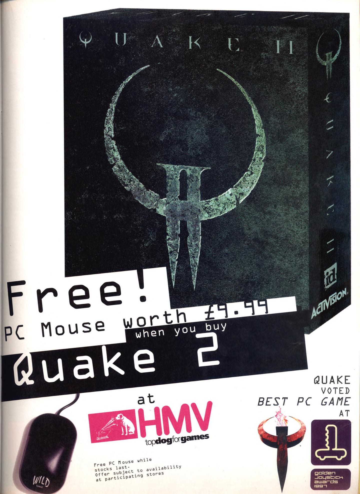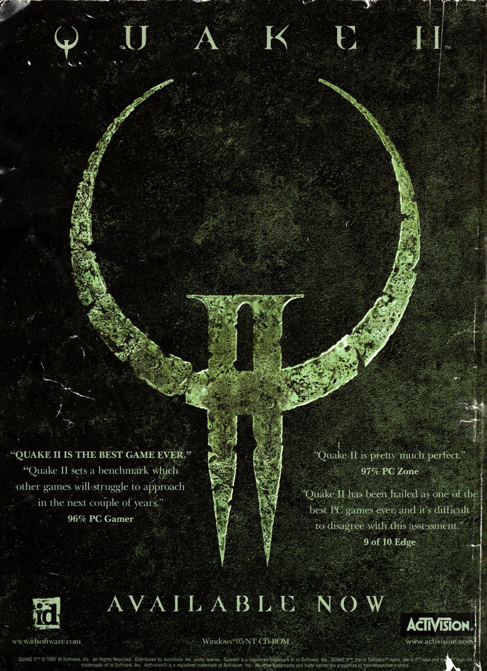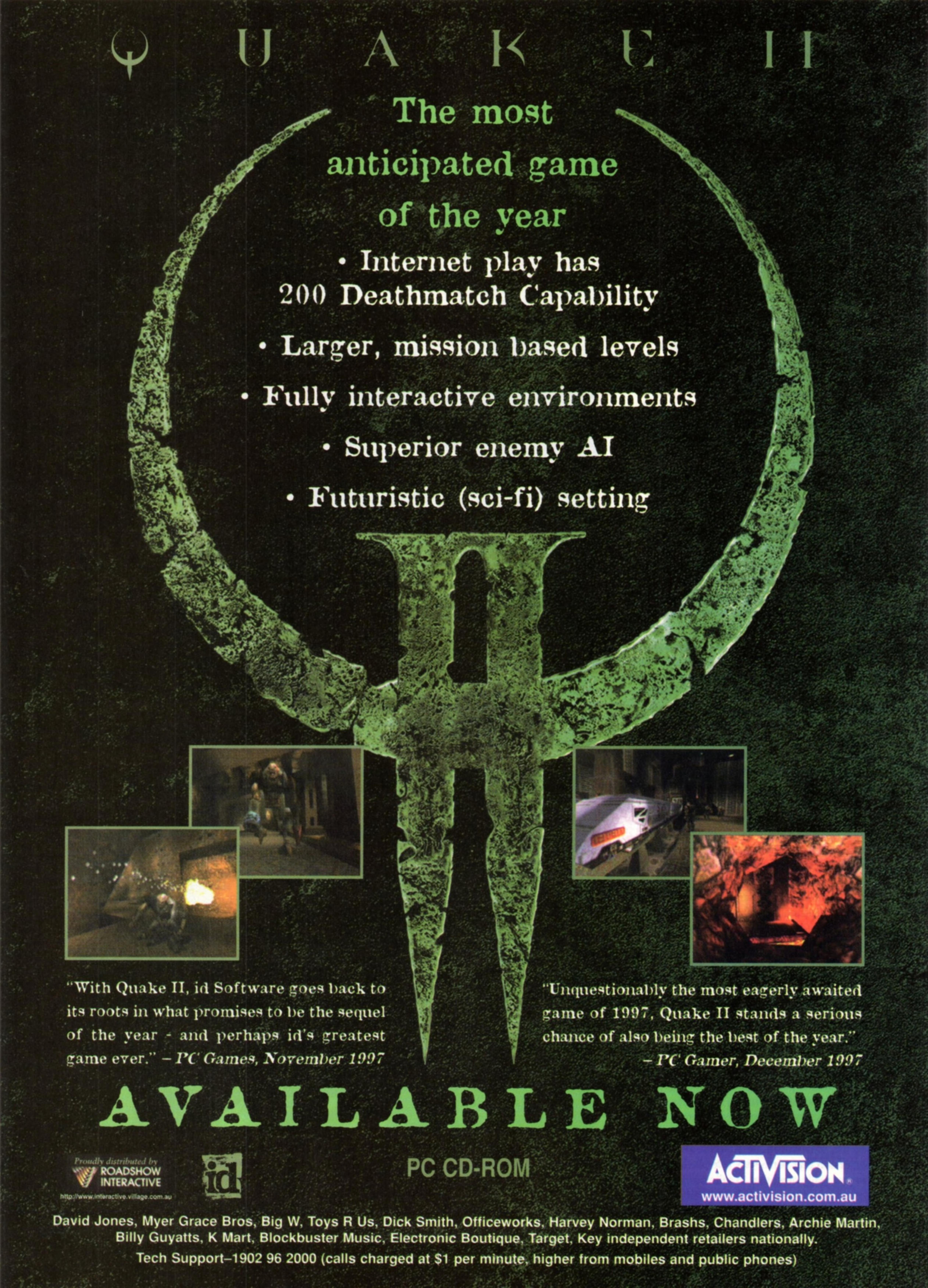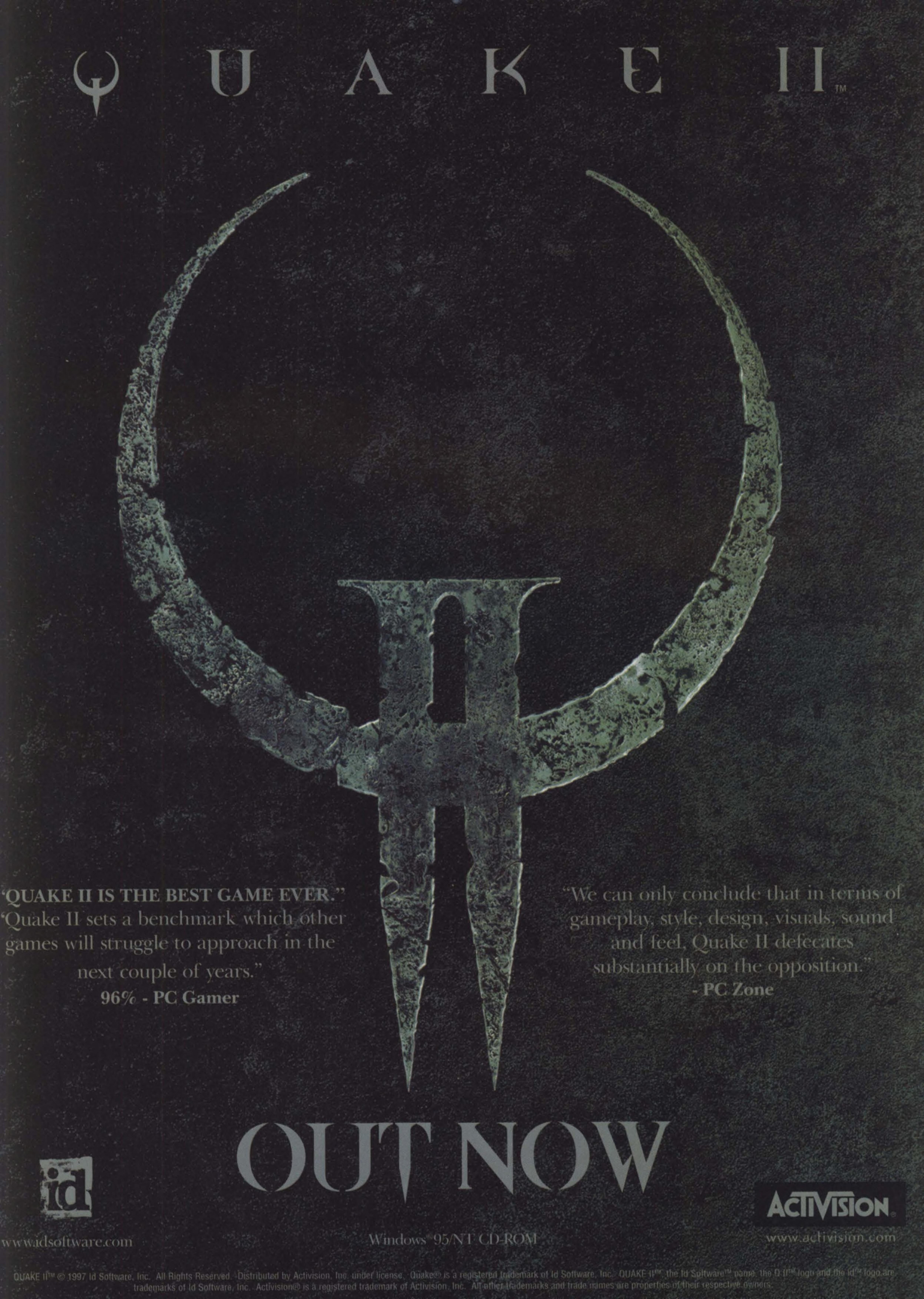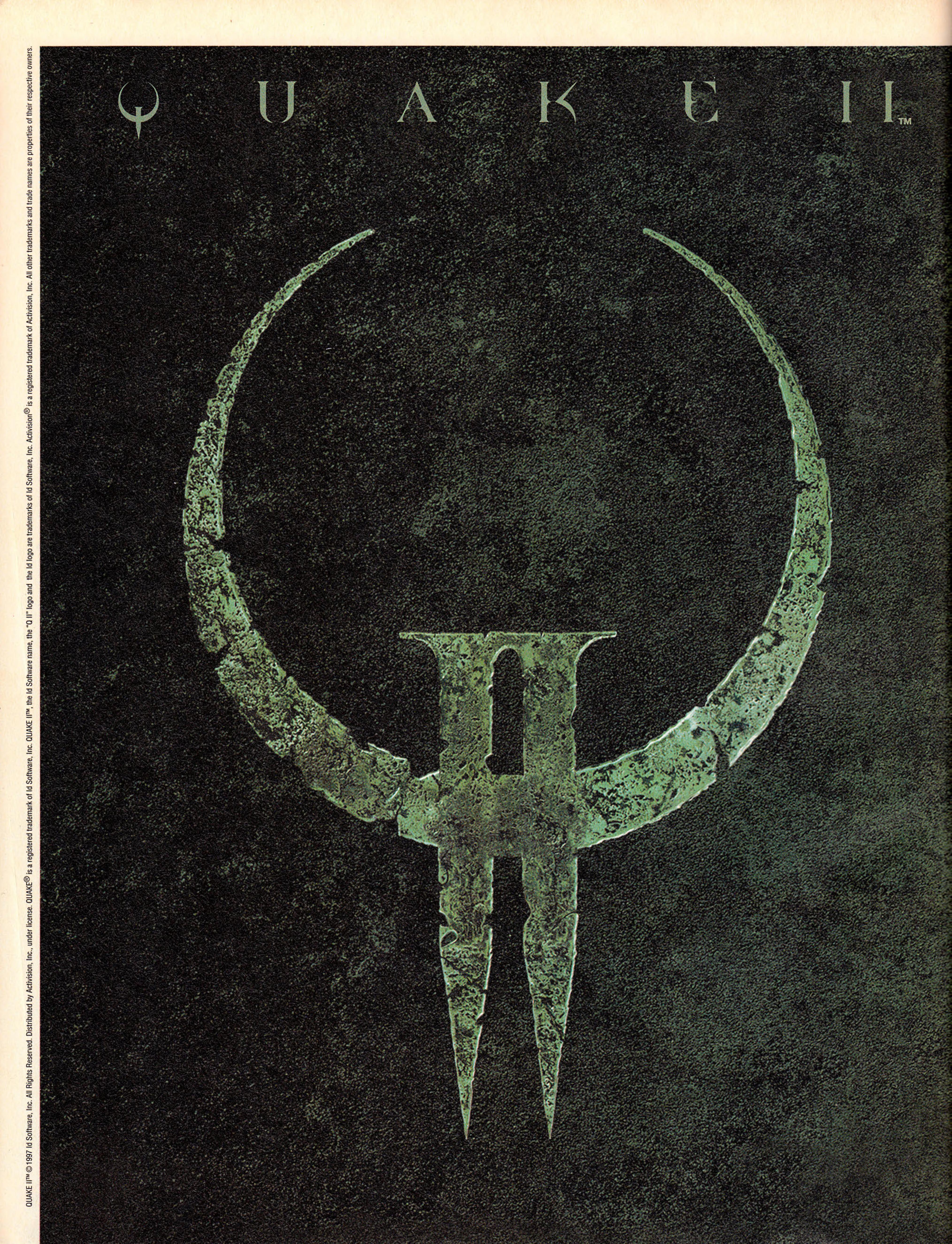 “QUAKE II — the most anticipated game of the year. Internet play has 200 Deathmatch Capability. Larger, mission based levels. Fully interactive environments. Superior enemy AI. Futuristic (sci-fi) setting. AVAILABLE NOW.“