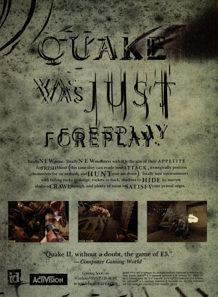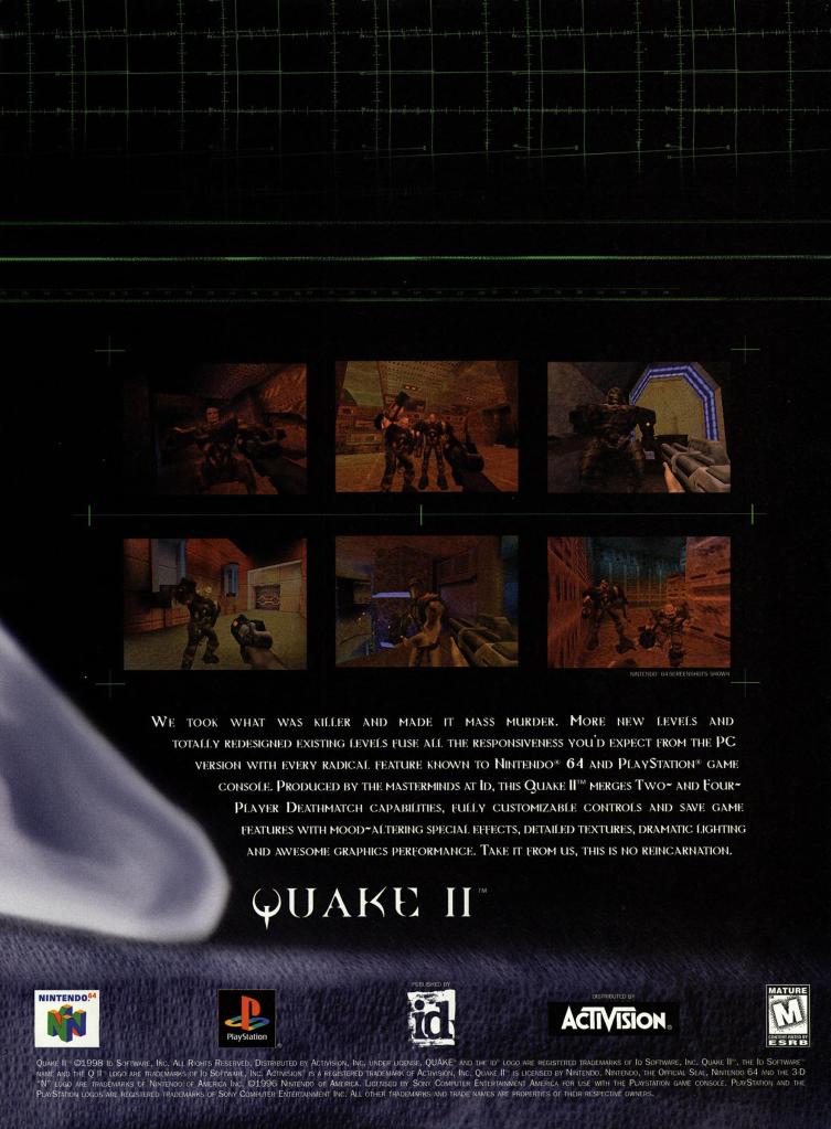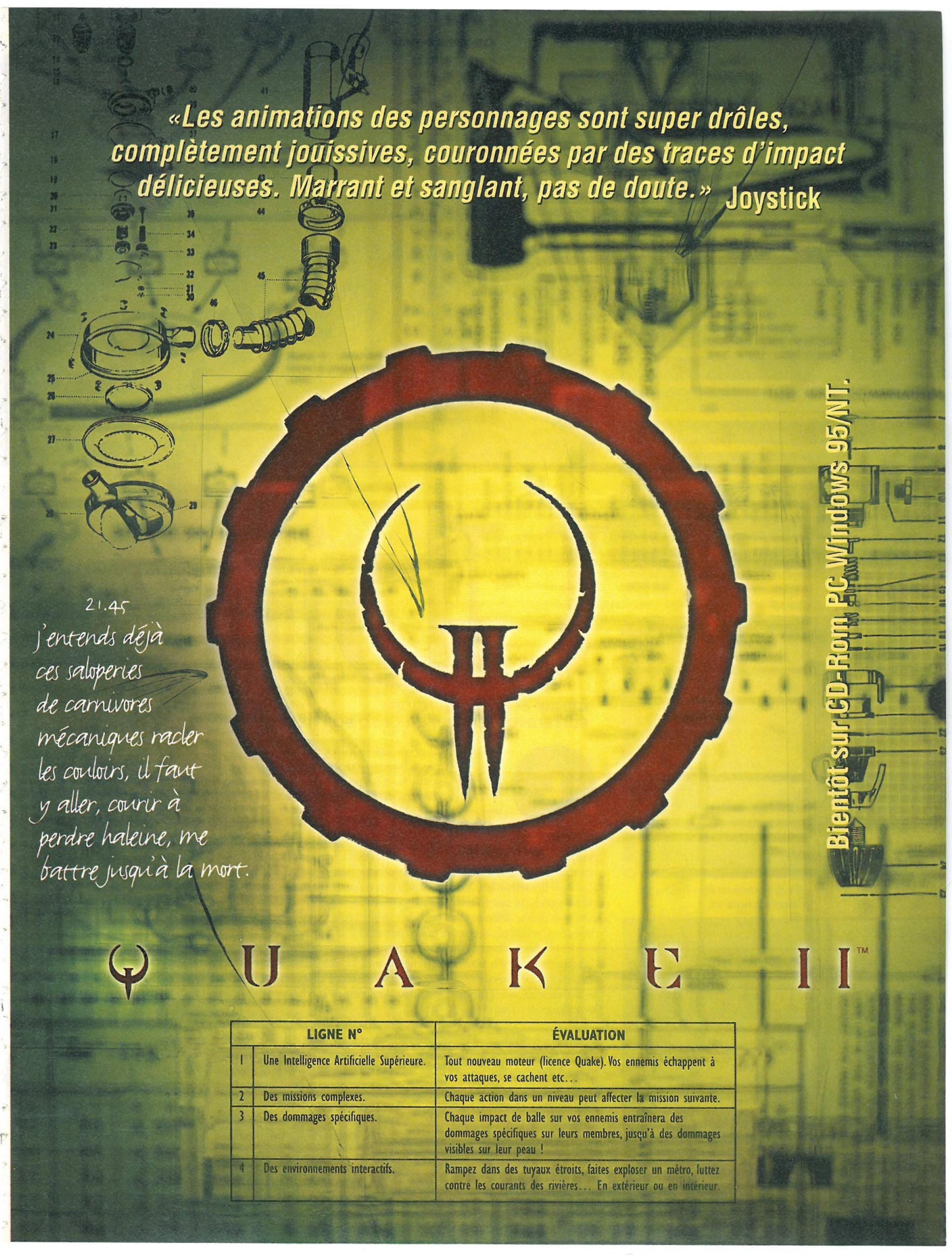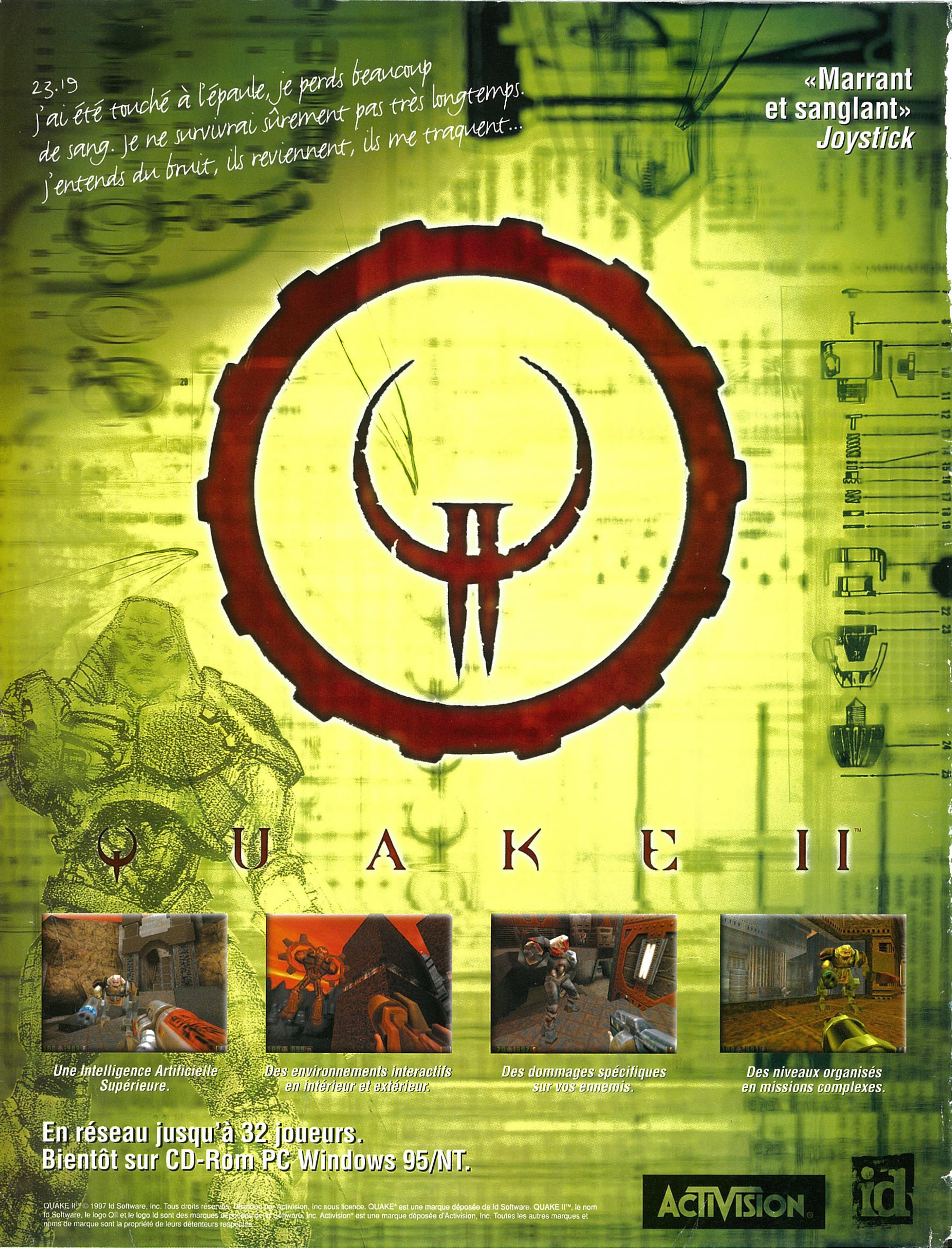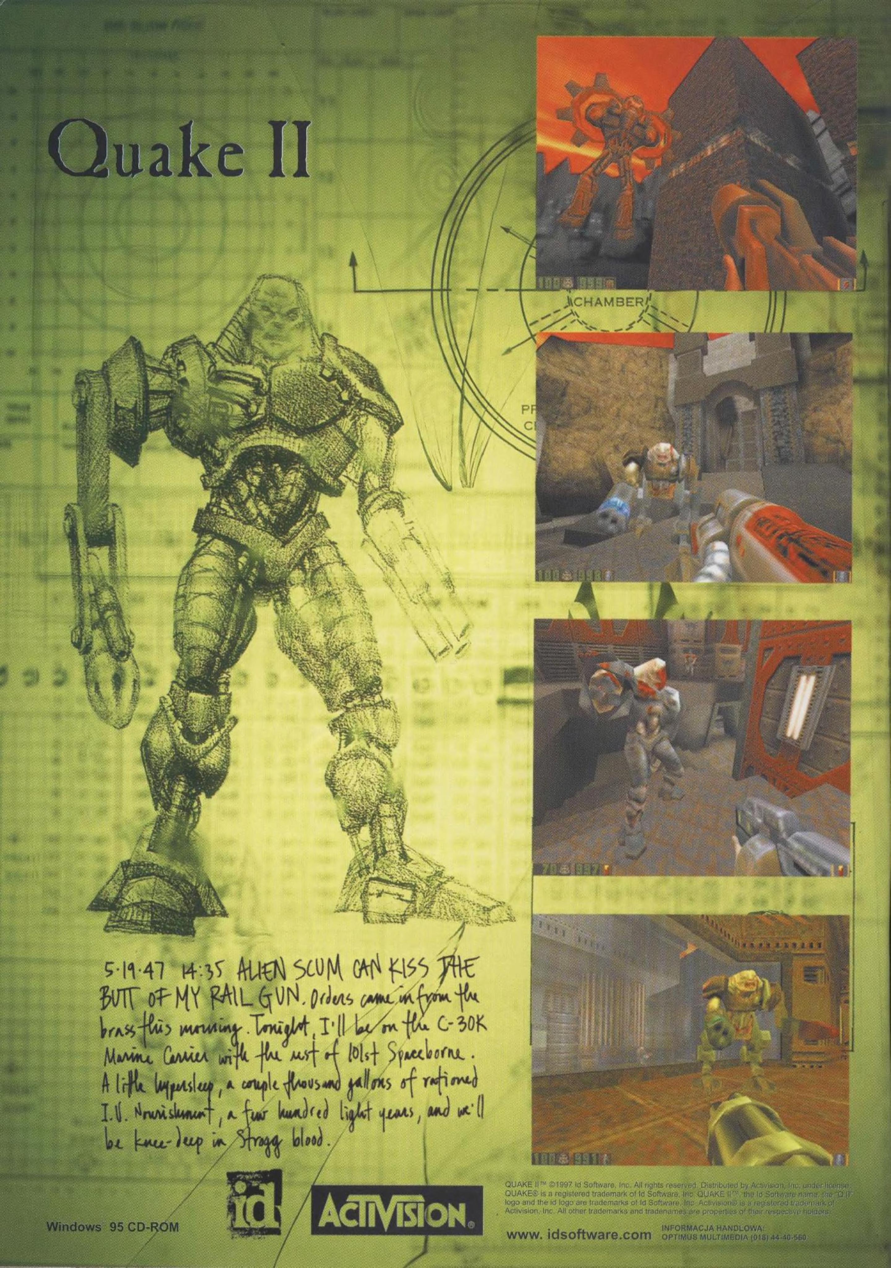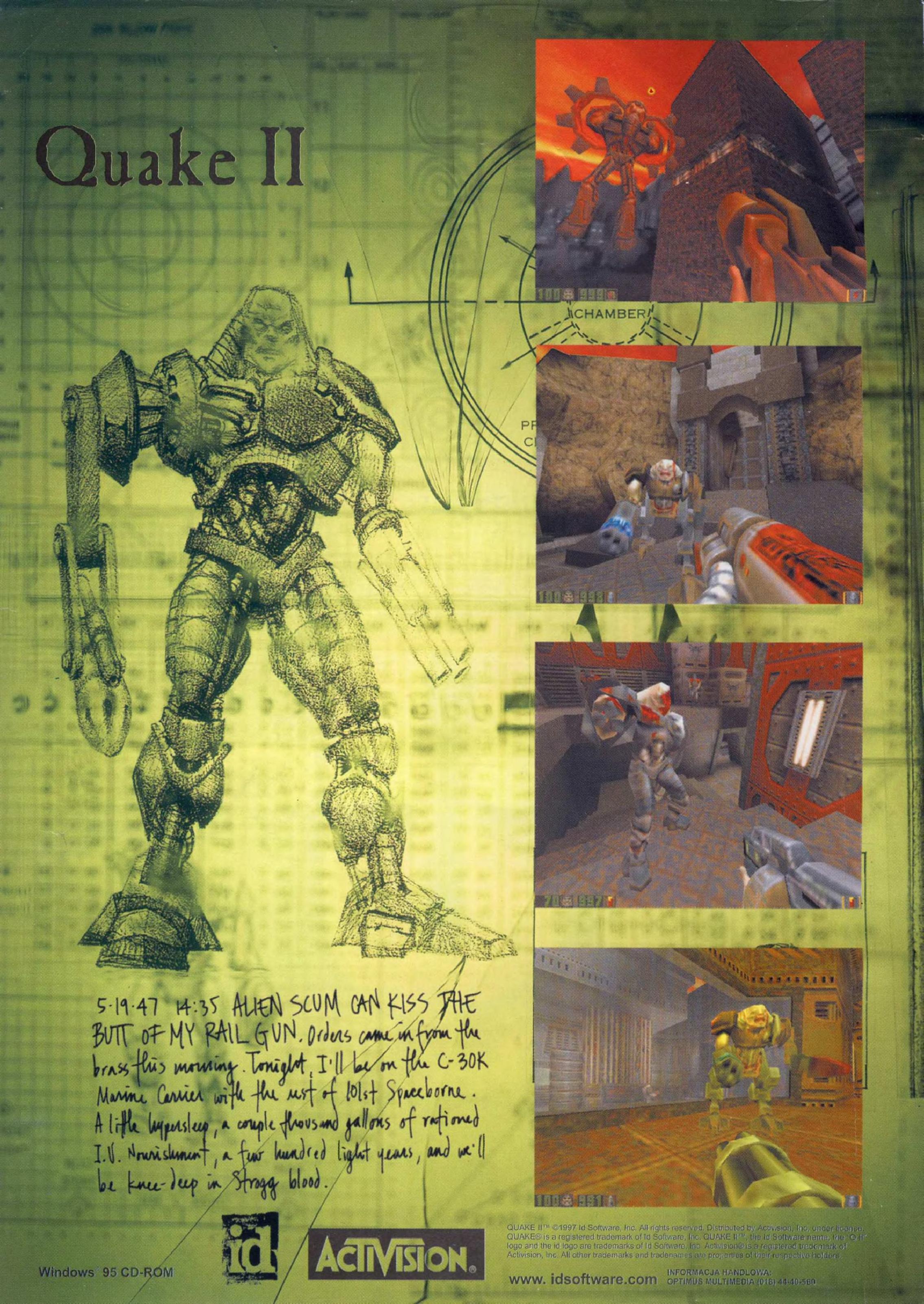 “QUAKE II — the most anticipated game of the year. Internet play has 200 Deathmatch Capability. Larger, mission based levels. Fully interactive environments. Superior enemy AI. Futuristic (sci-fi) setting. AVAILABLE NOW.“