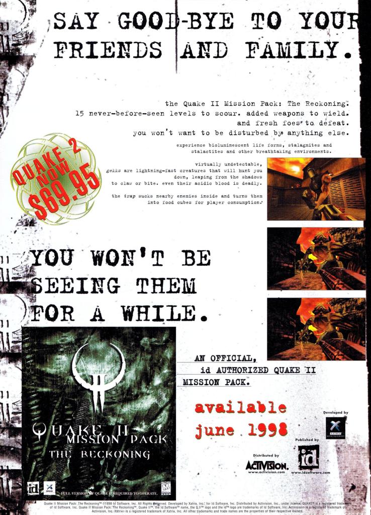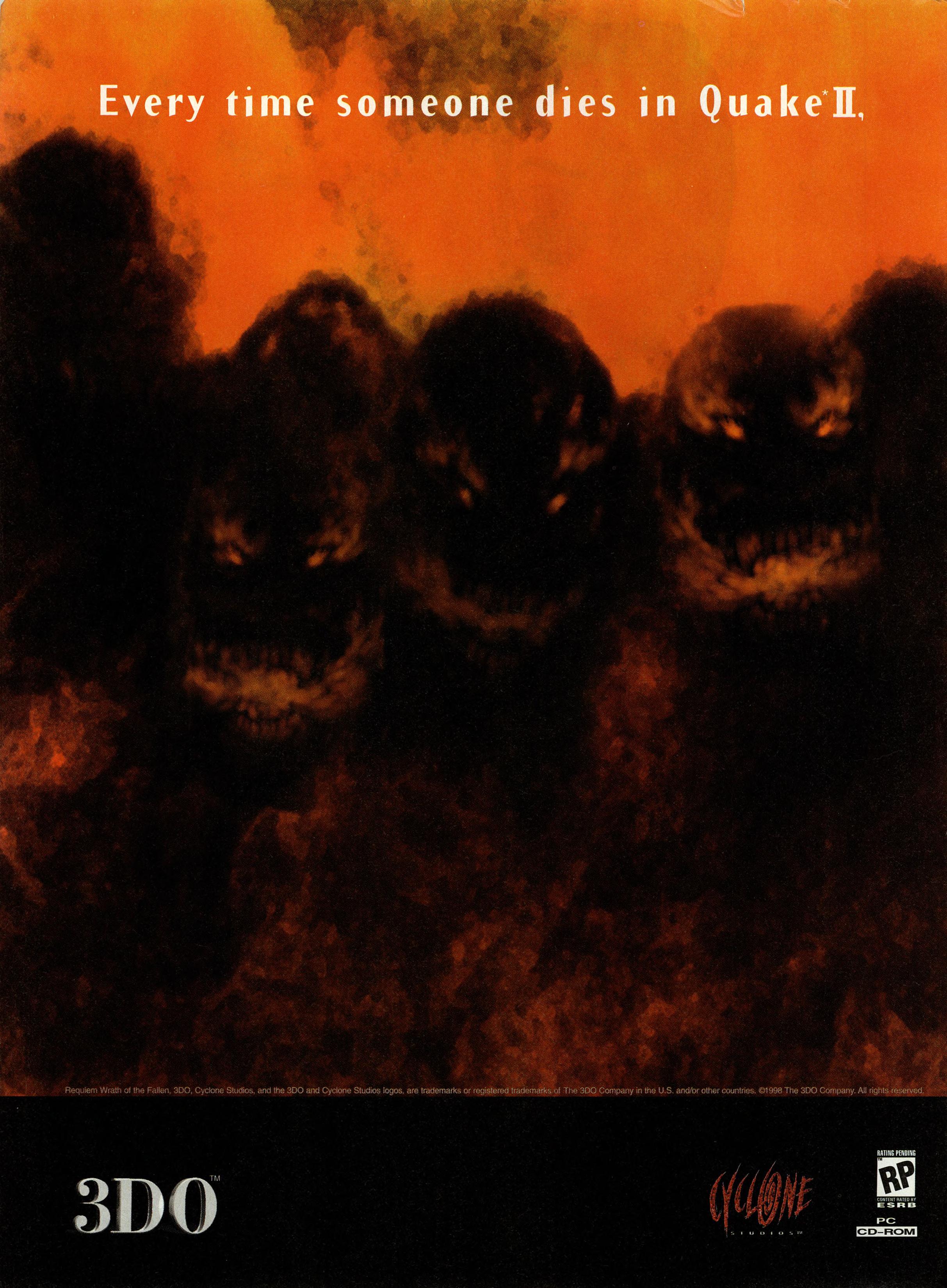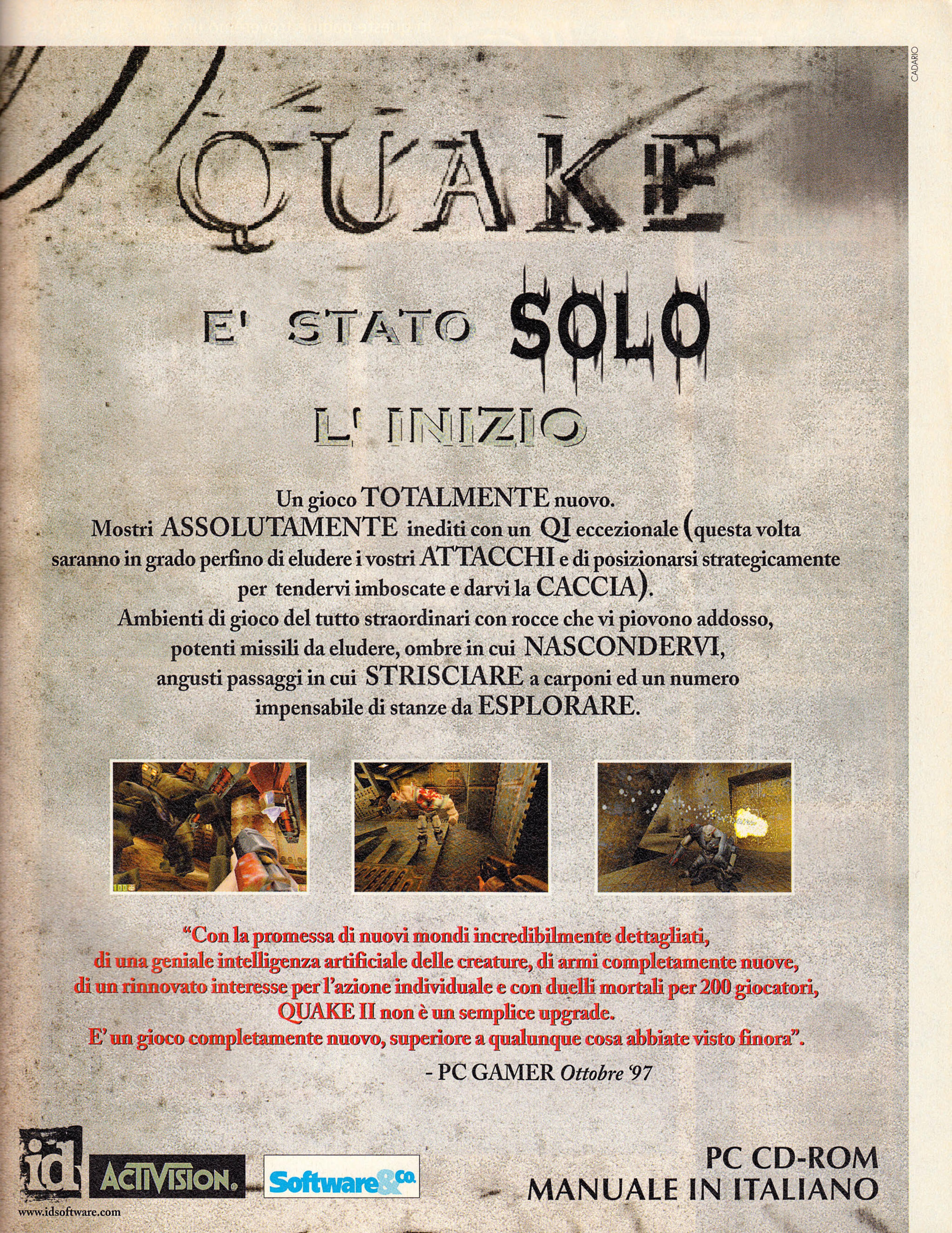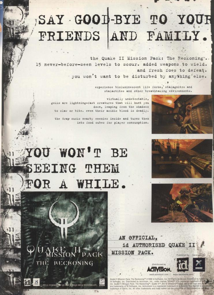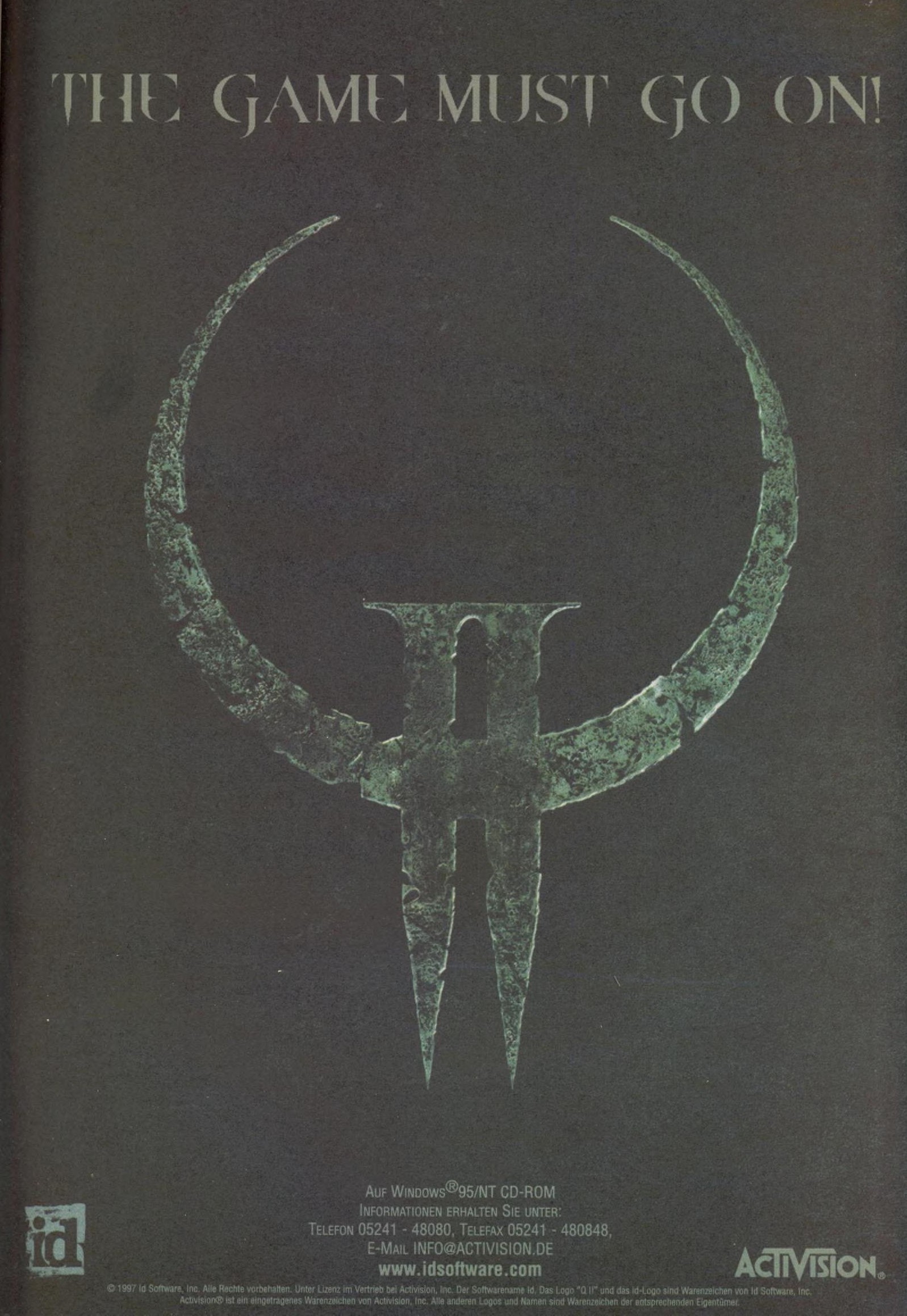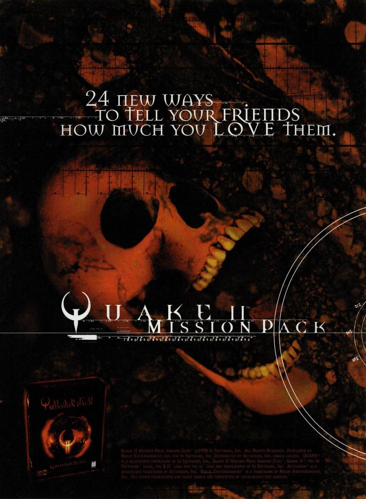 “QUAKE II — the most anticipated game of the year. Internet play has 200 Deathmatch Capability. Larger, mission based levels. Fully interactive environments. Superior enemy AI. Futuristic (sci-fi) setting. AVAILABLE NOW.“