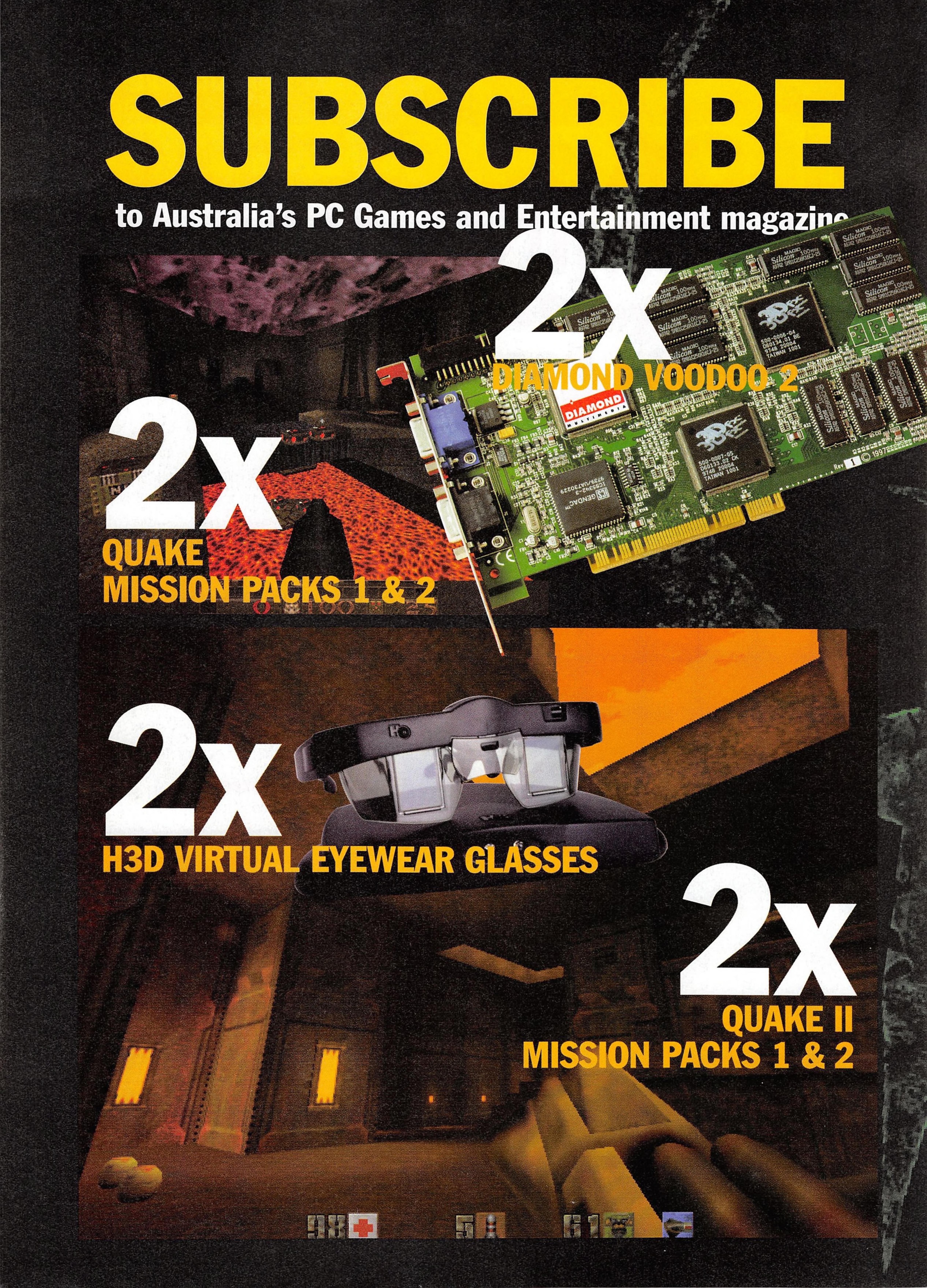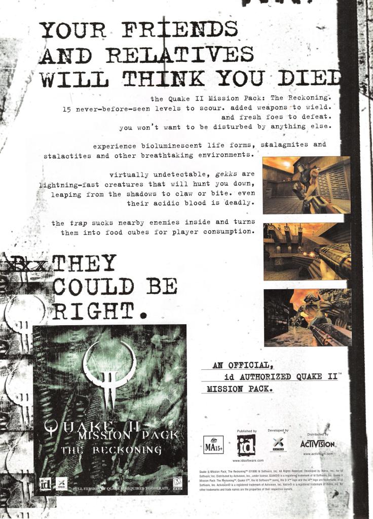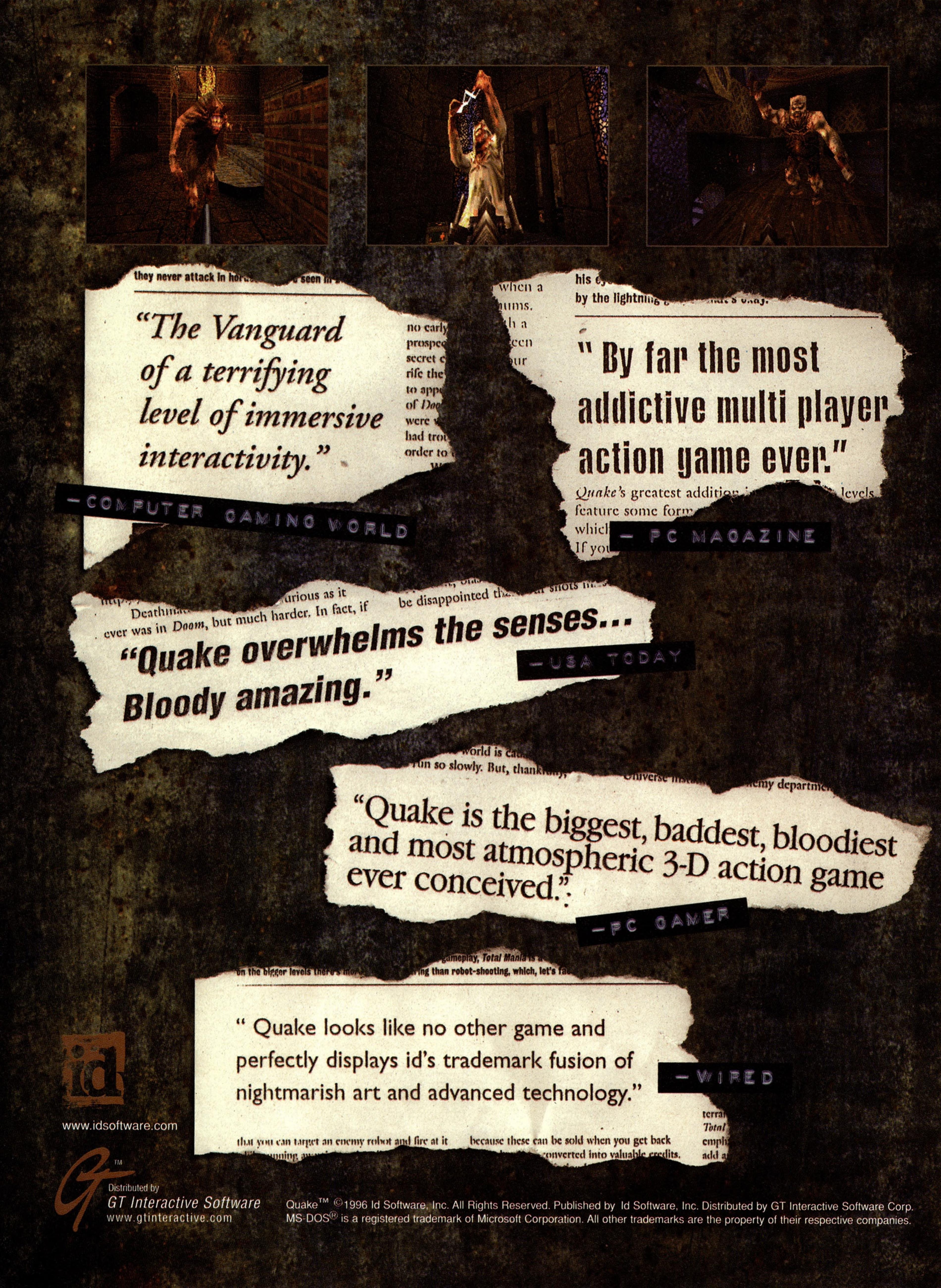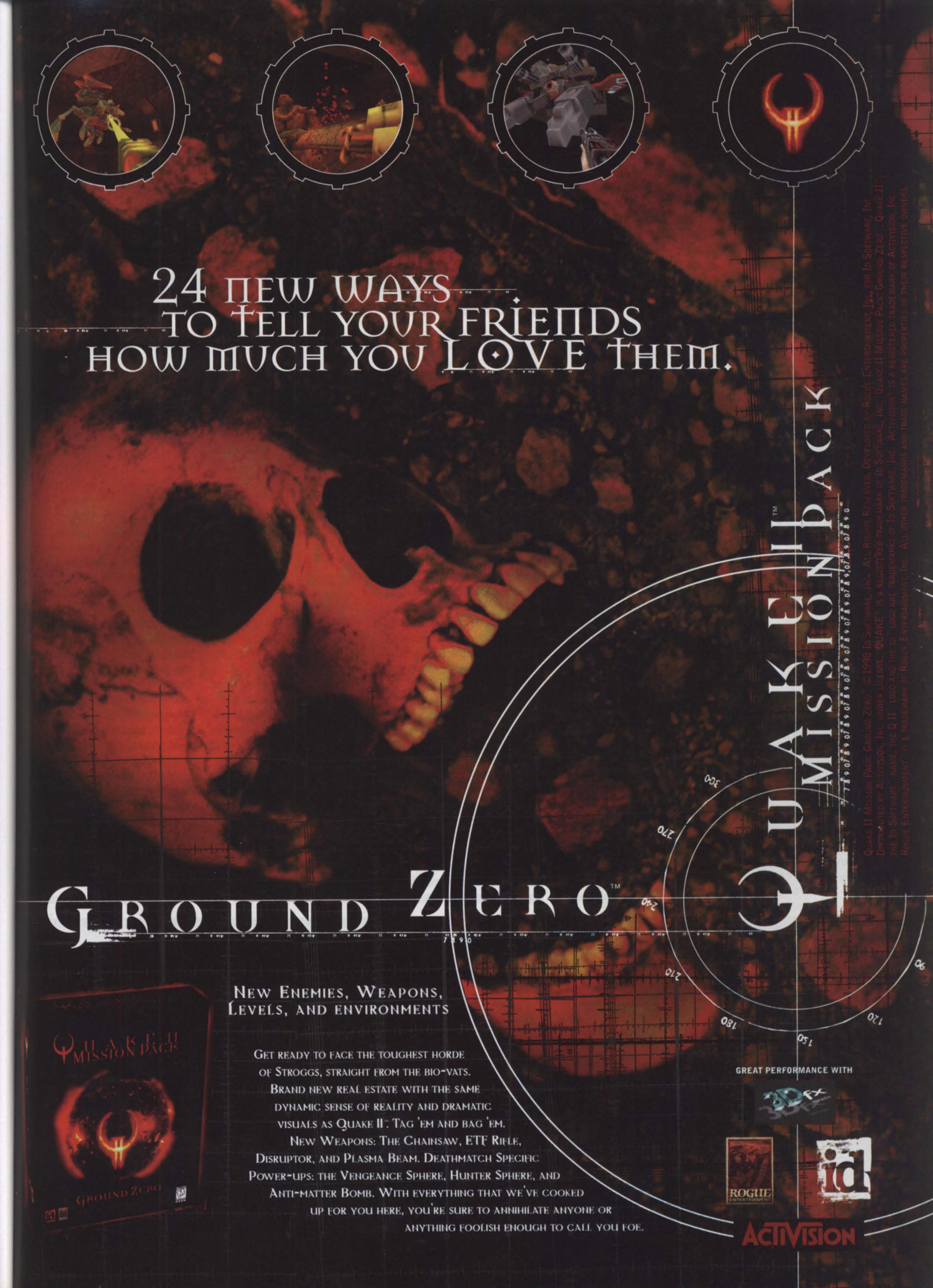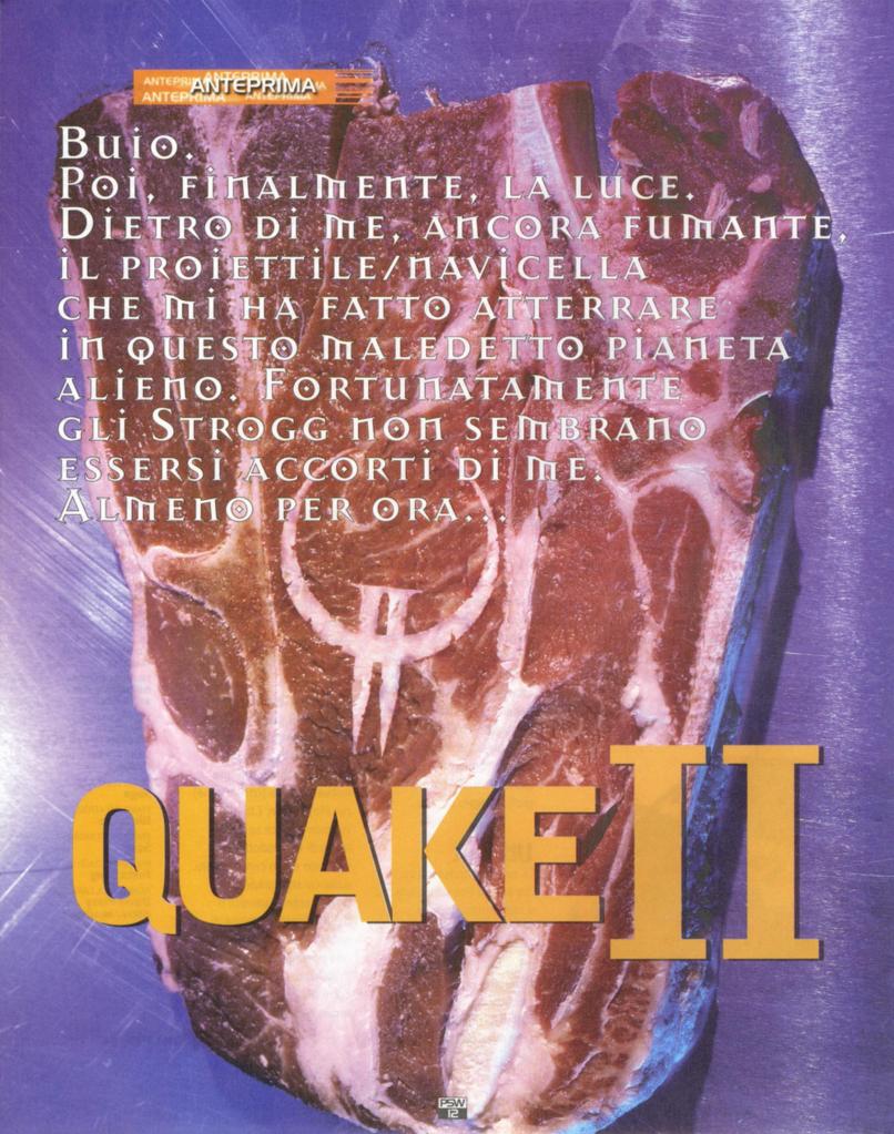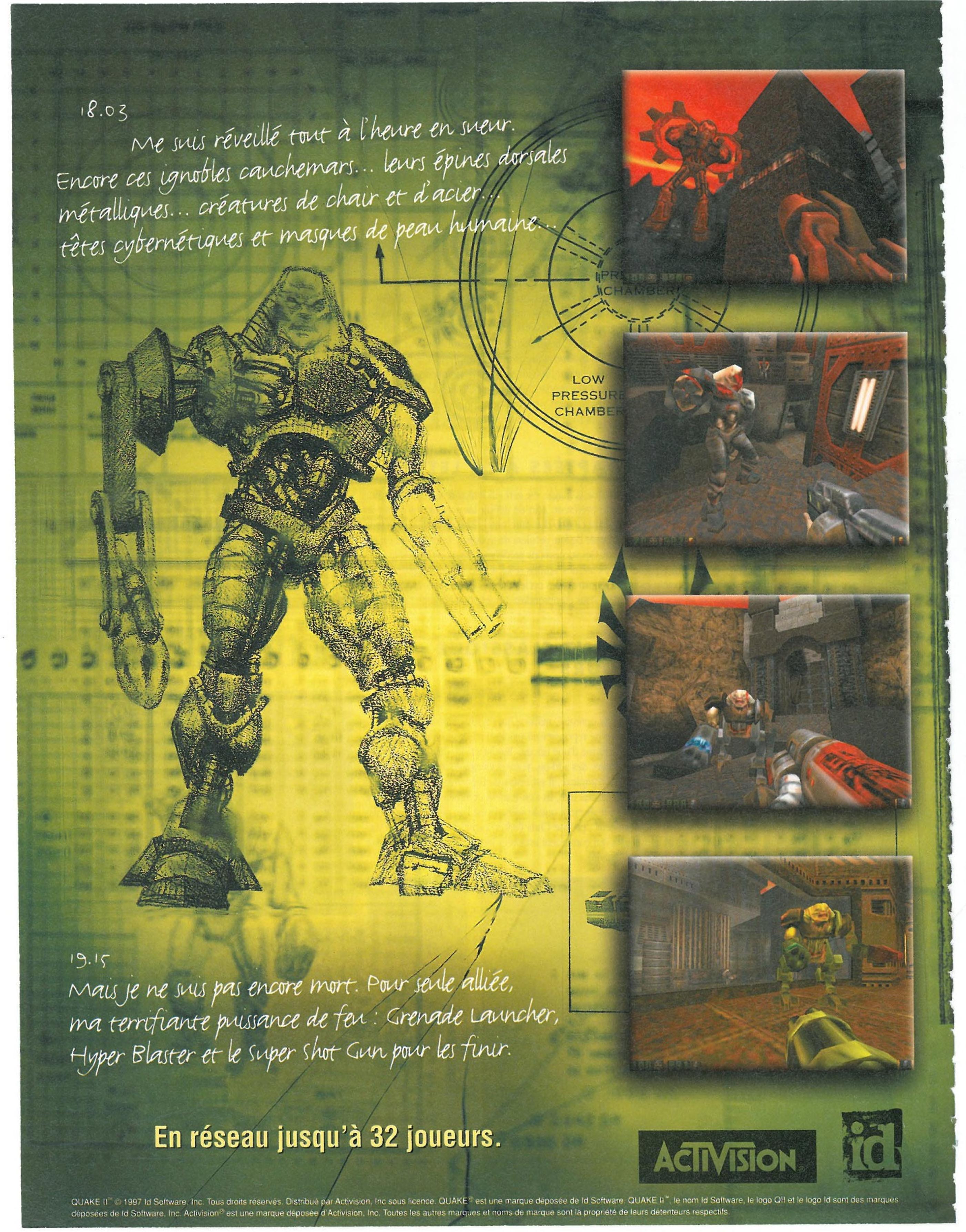 “QUAKE II — the most anticipated game of the year. Internet play has 200 Deathmatch Capability. Larger, mission based levels. Fully interactive environments. Superior enemy AI. Futuristic (sci-fi) setting. AVAILABLE NOW.“