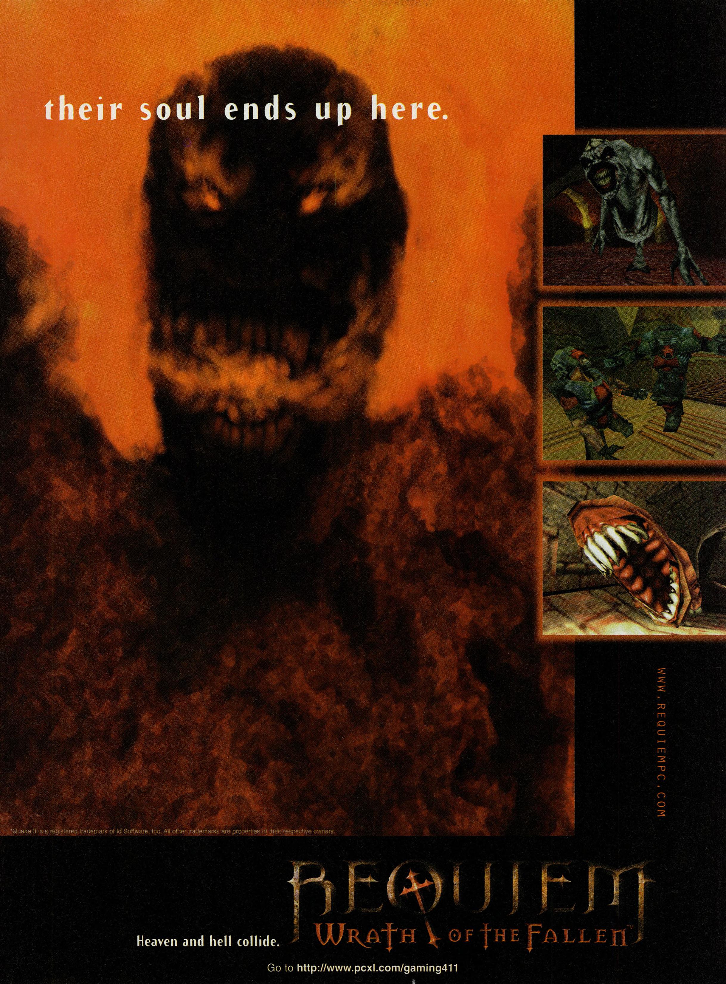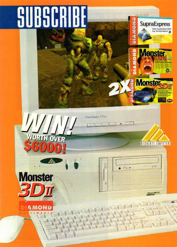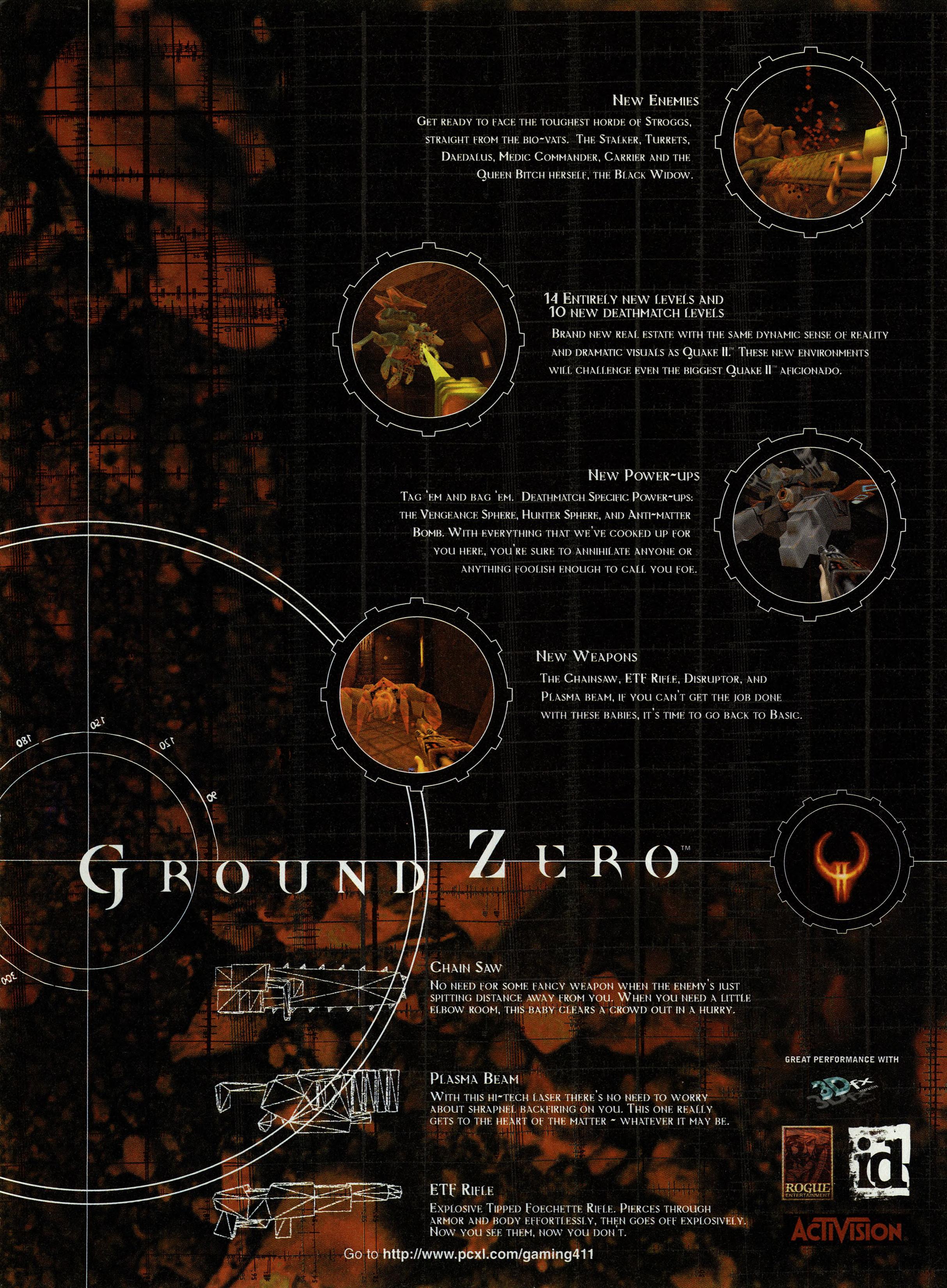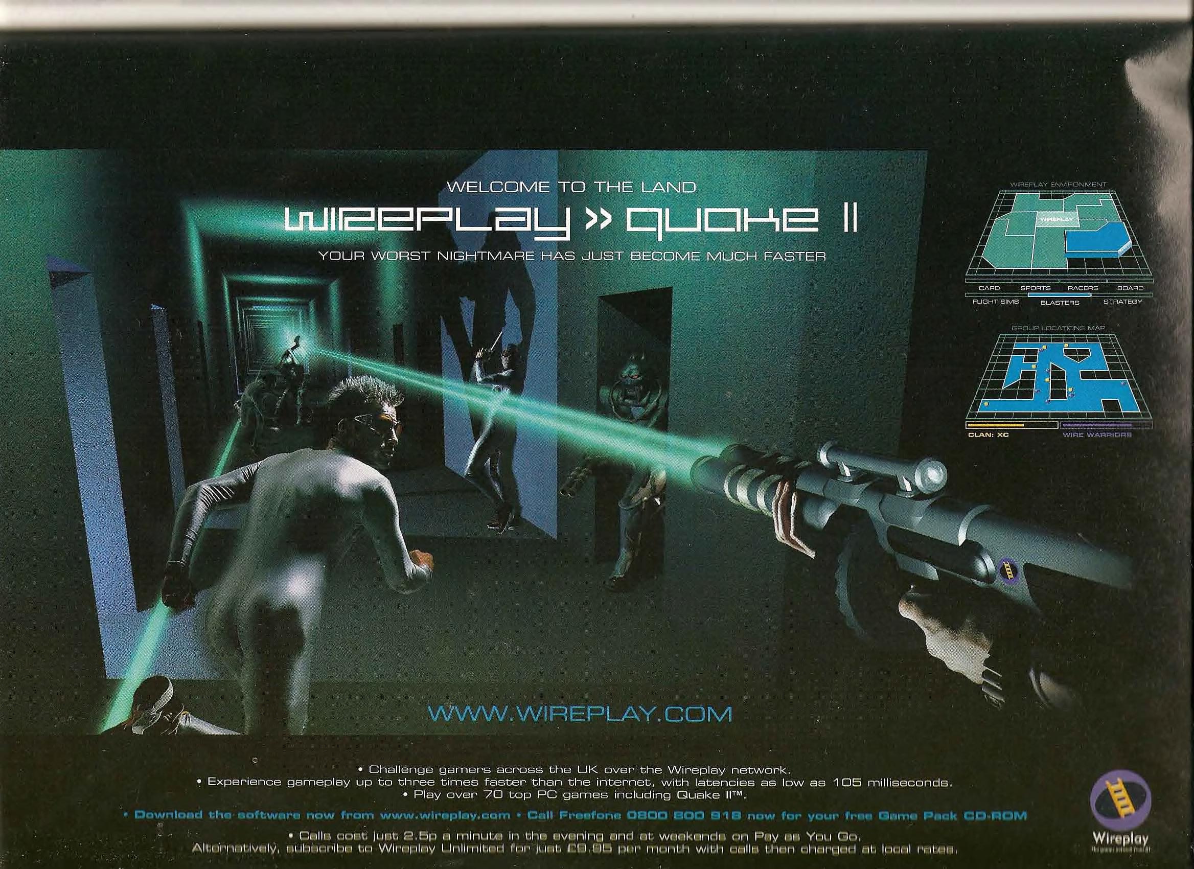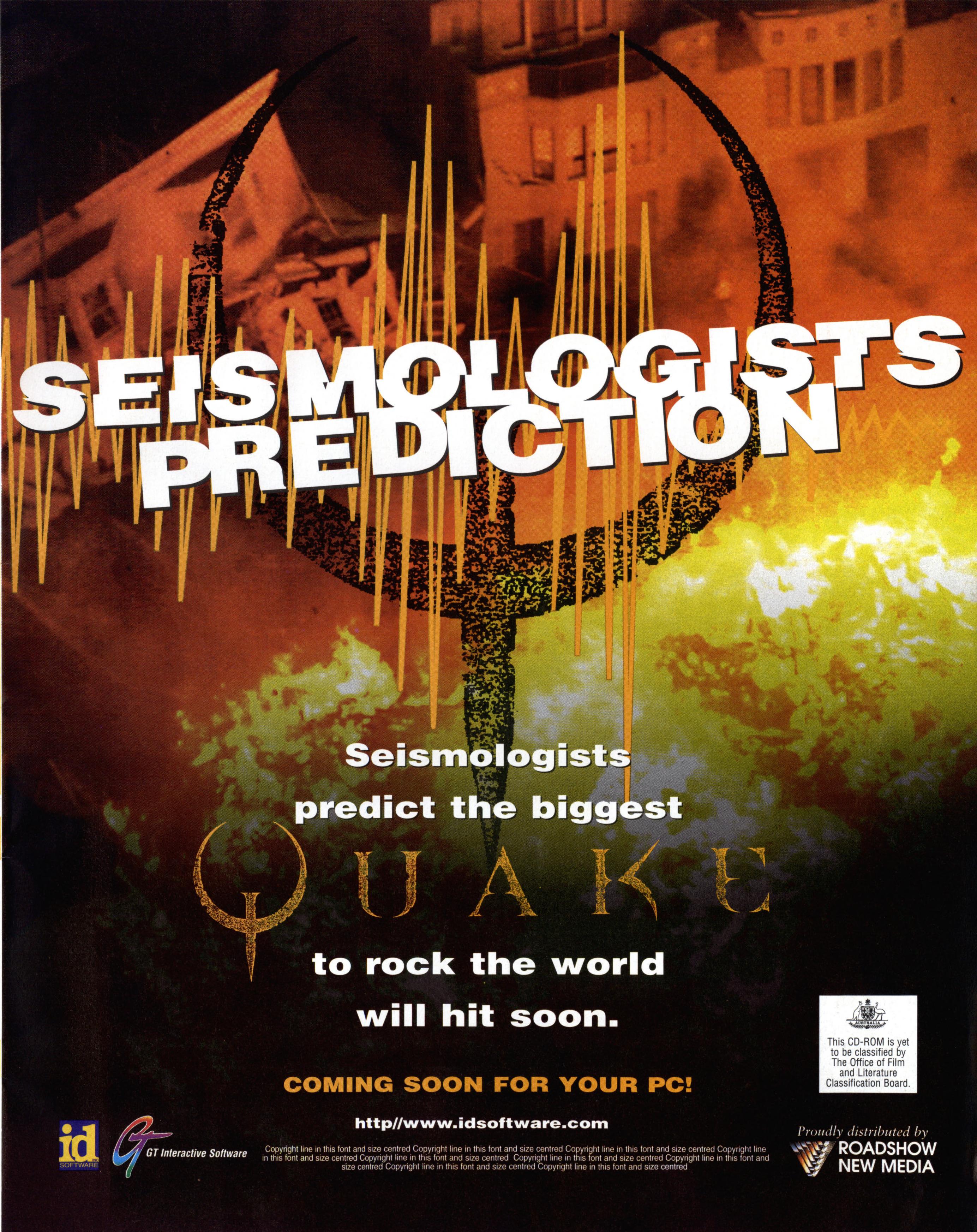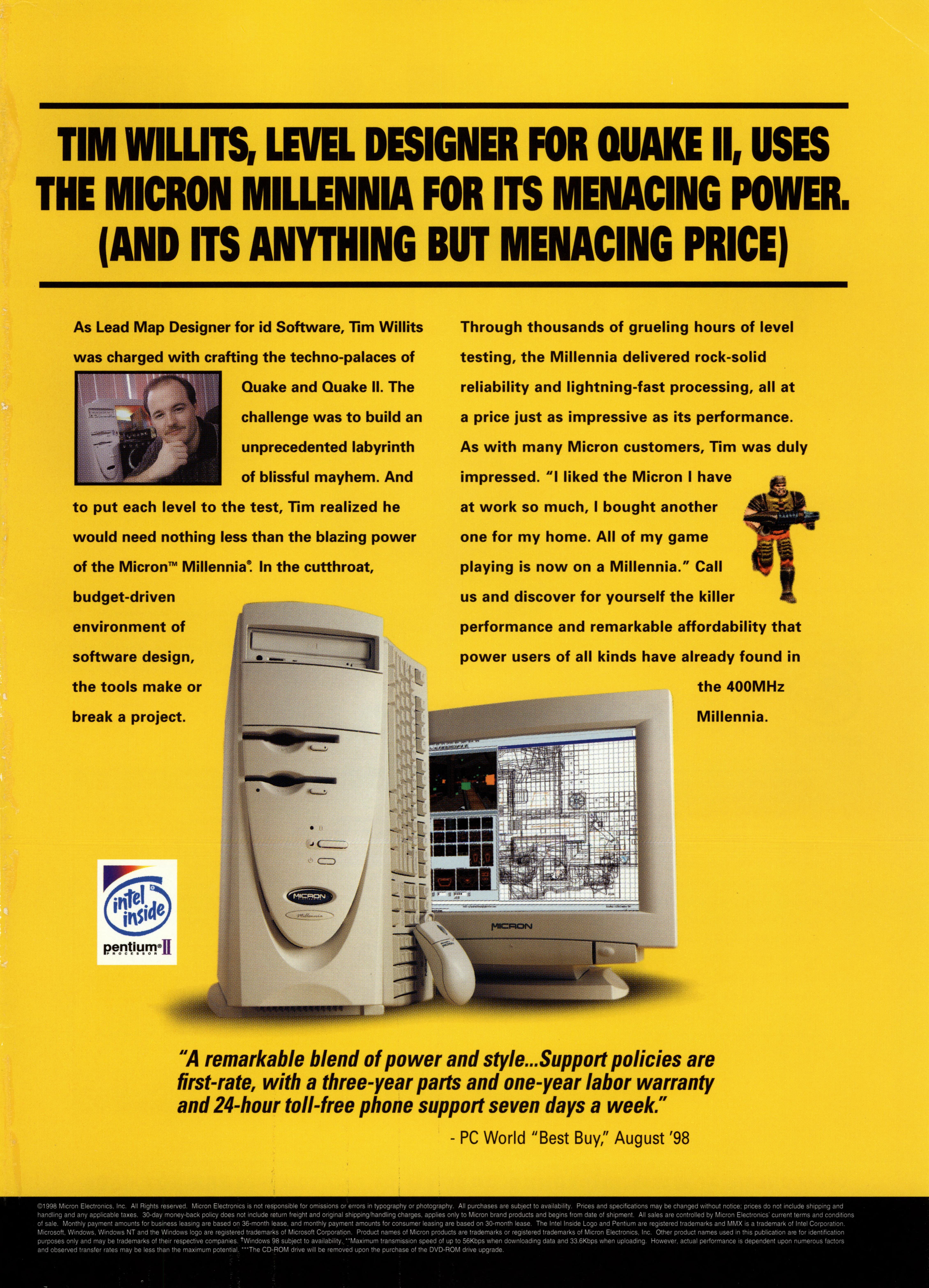 “QUAKE II — the most anticipated game of the year. Internet play has 200 Deathmatch Capability. Larger, mission based levels. Fully interactive environments. Superior enemy AI. Futuristic (sci-fi) setting. AVAILABLE NOW.“