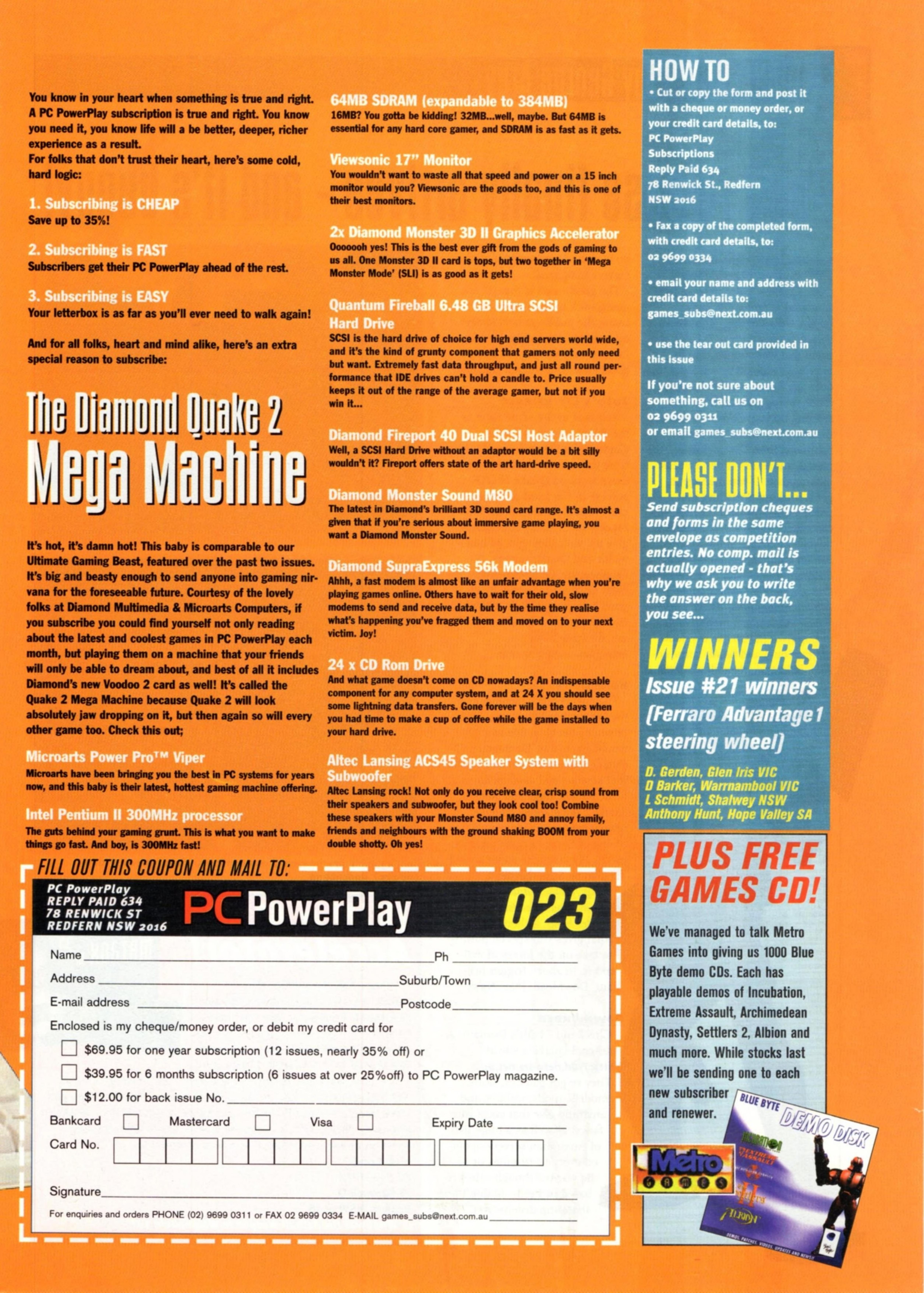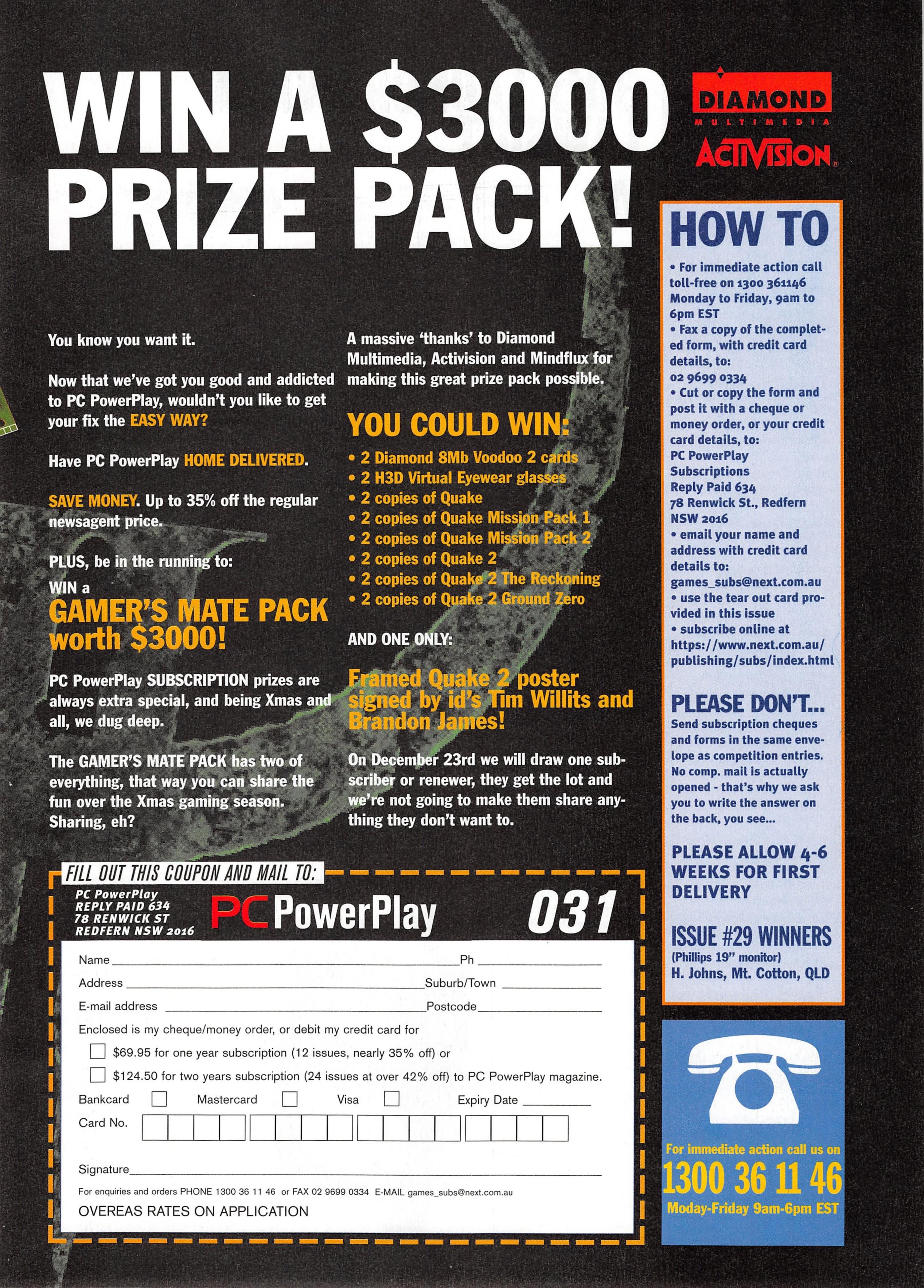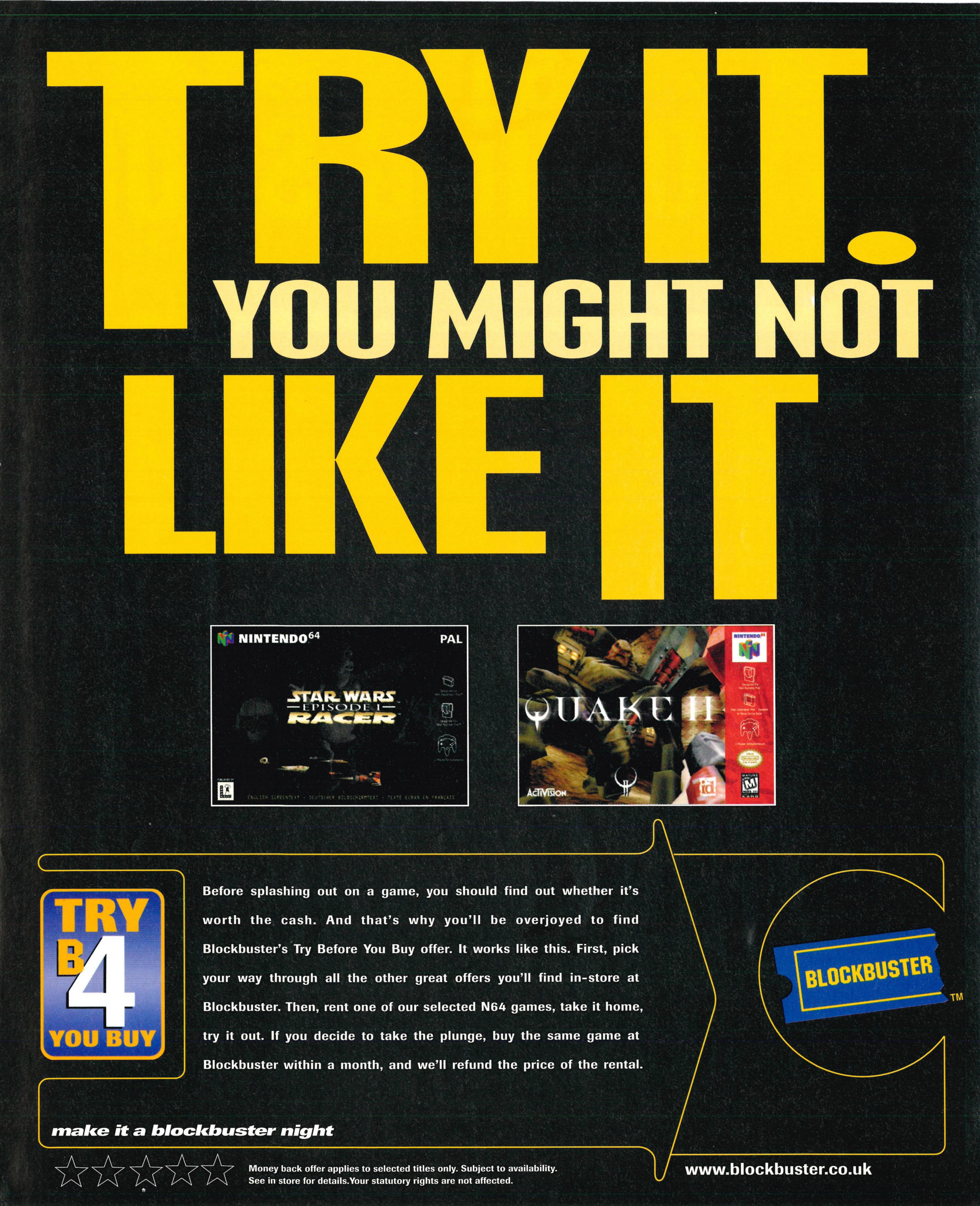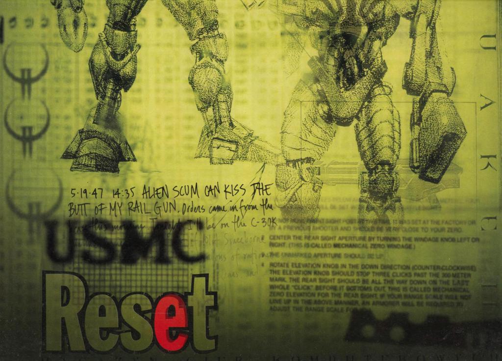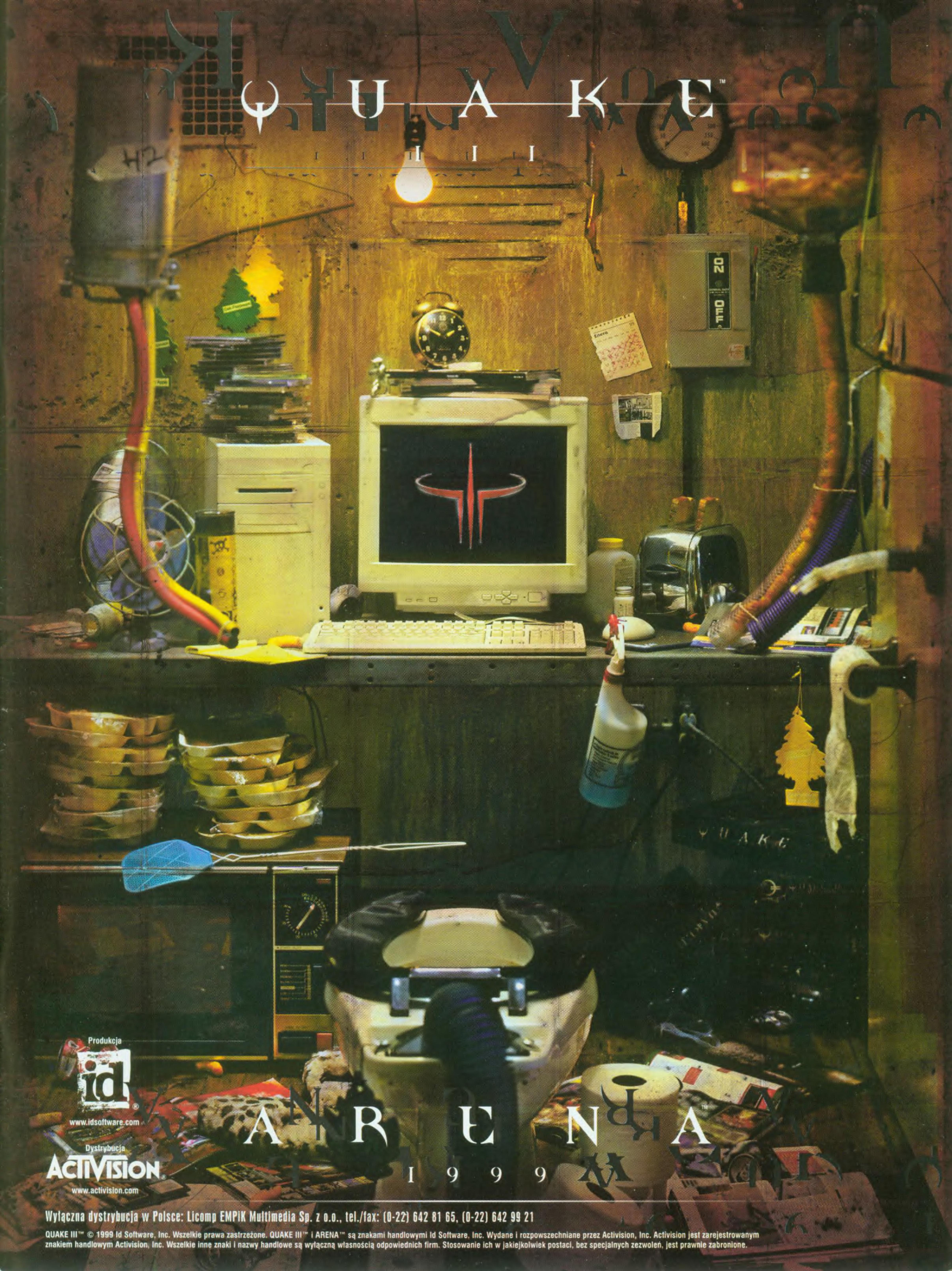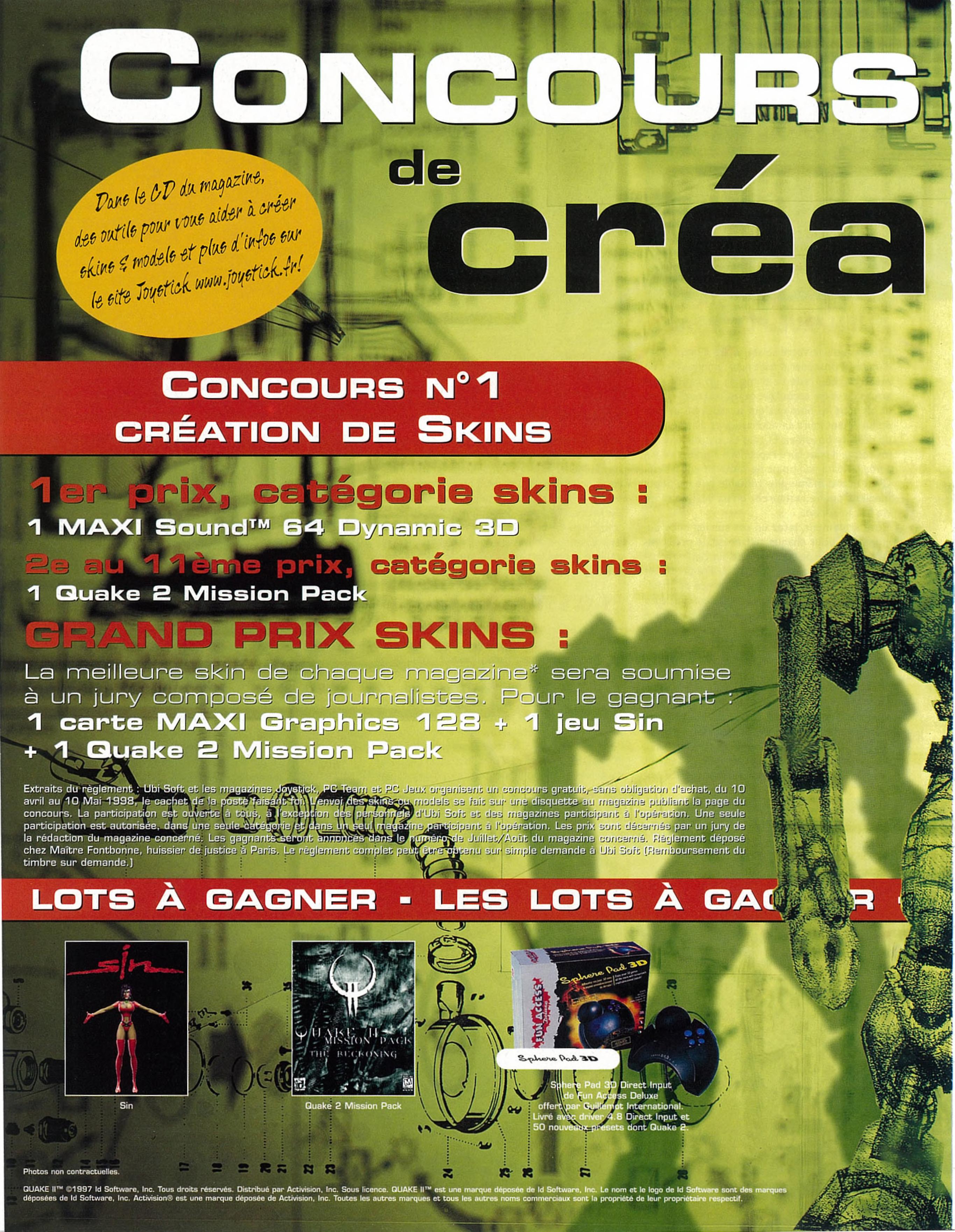 “QUAKE II — the most anticipated game of the year. Internet play has 200 Deathmatch Capability. Larger, mission based levels. Fully interactive environments. Superior enemy AI. Futuristic (sci-fi) setting. AVAILABLE NOW.“