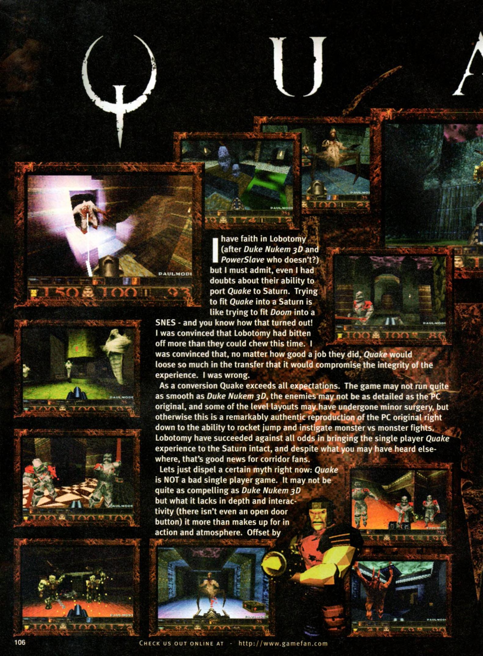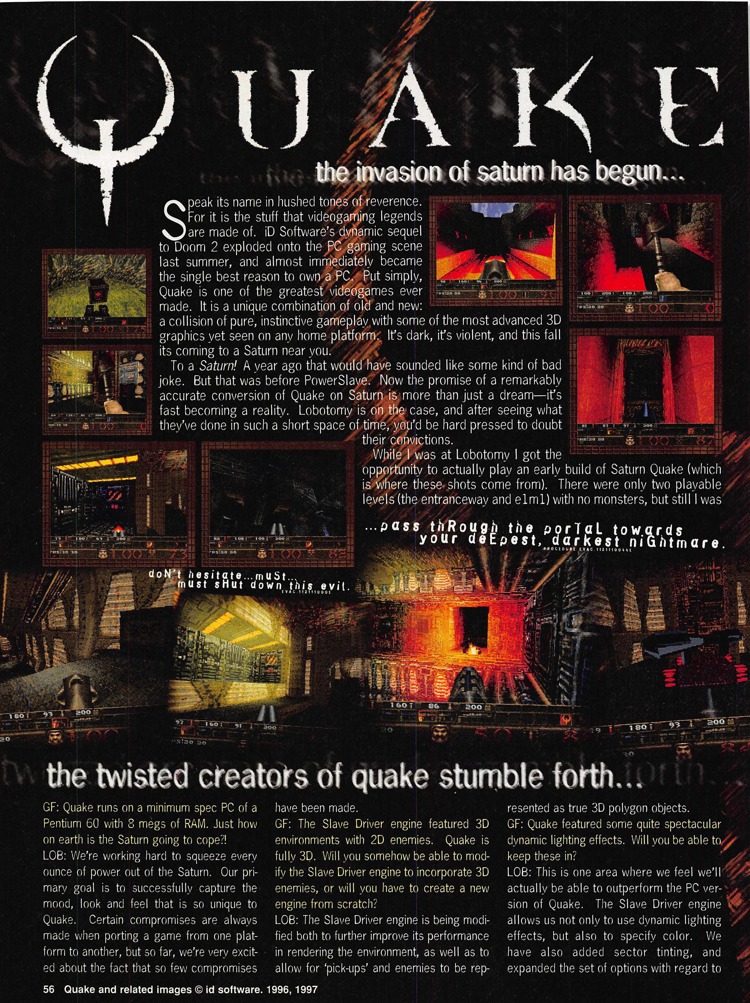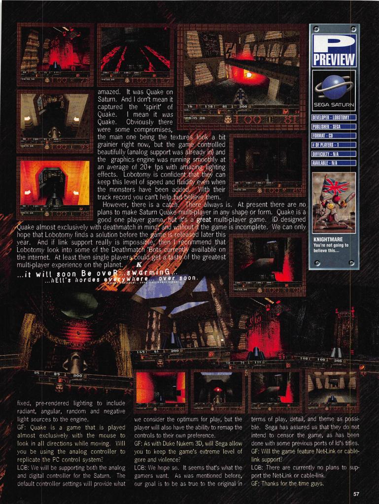 “GameFan: Quake runs on a minimum spec PC of a Pentium 60 with 8 megs of RAM. Just how on earth is the Sega Saturn going to cope?!