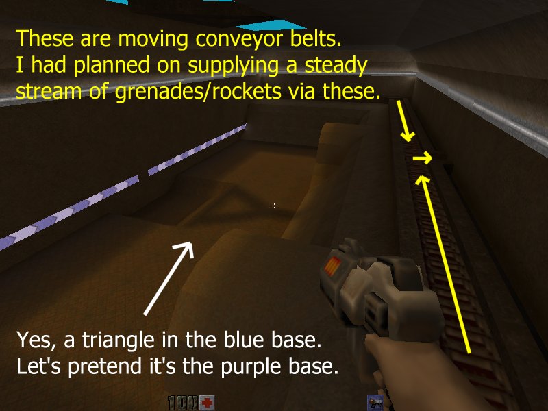 “These are moving conveyor belts. I had planned on supplying a steady stream of grenades / rockets via these. Yes, a triangle in the blue base. Let’s pretend it’s the purple base.”