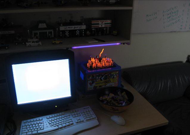 “Here it is, as set up in my office. I mounted a blacklight on the underside of the bookshelf. To boost the light’s effectiveness, I used a Lego tub to bring the display closer.”