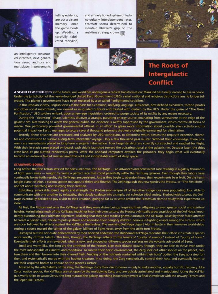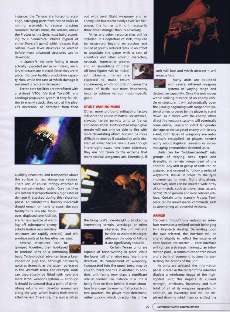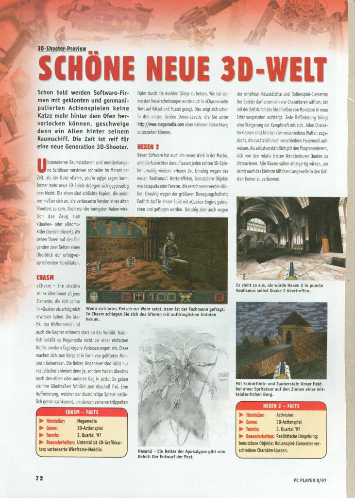 “PC Zone spies, however, report that Quake II levels will be two to three times bigger than the original’s maps, and that more diverse weapons will be on hand for less rocket-launcher oriented gameplay. Also, coloured lighting and real-time shadows will only be available in the 3D accelerated version.”