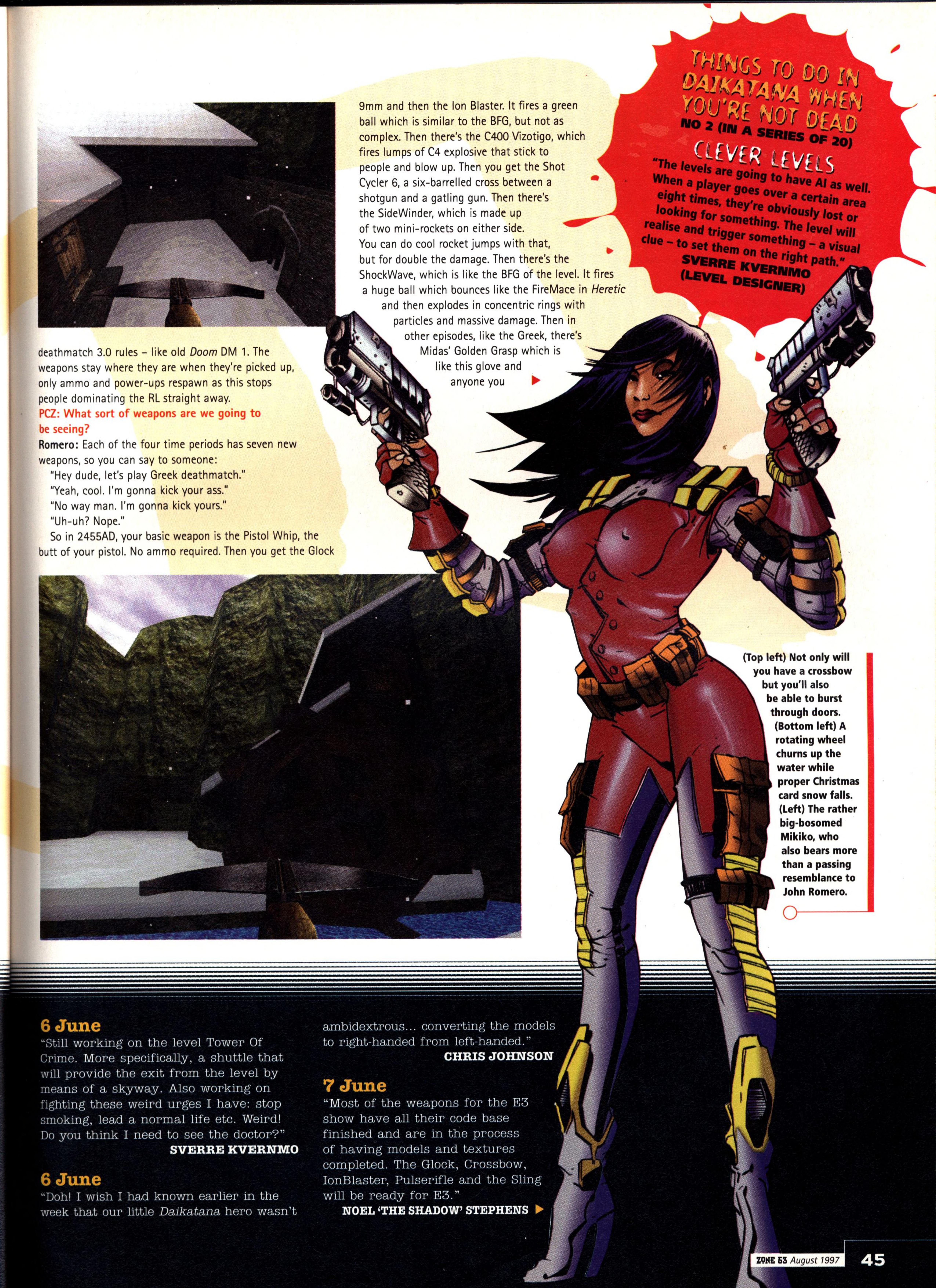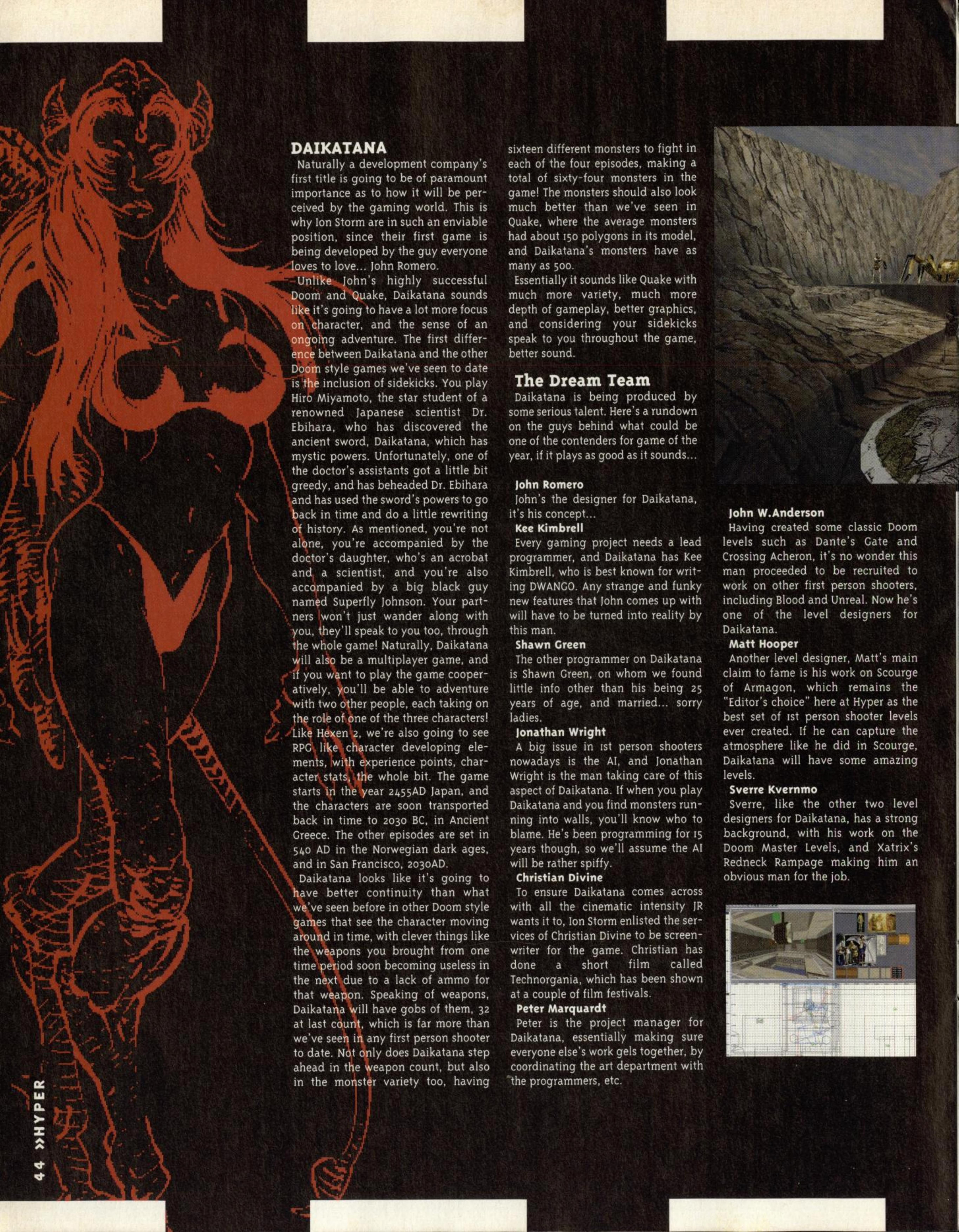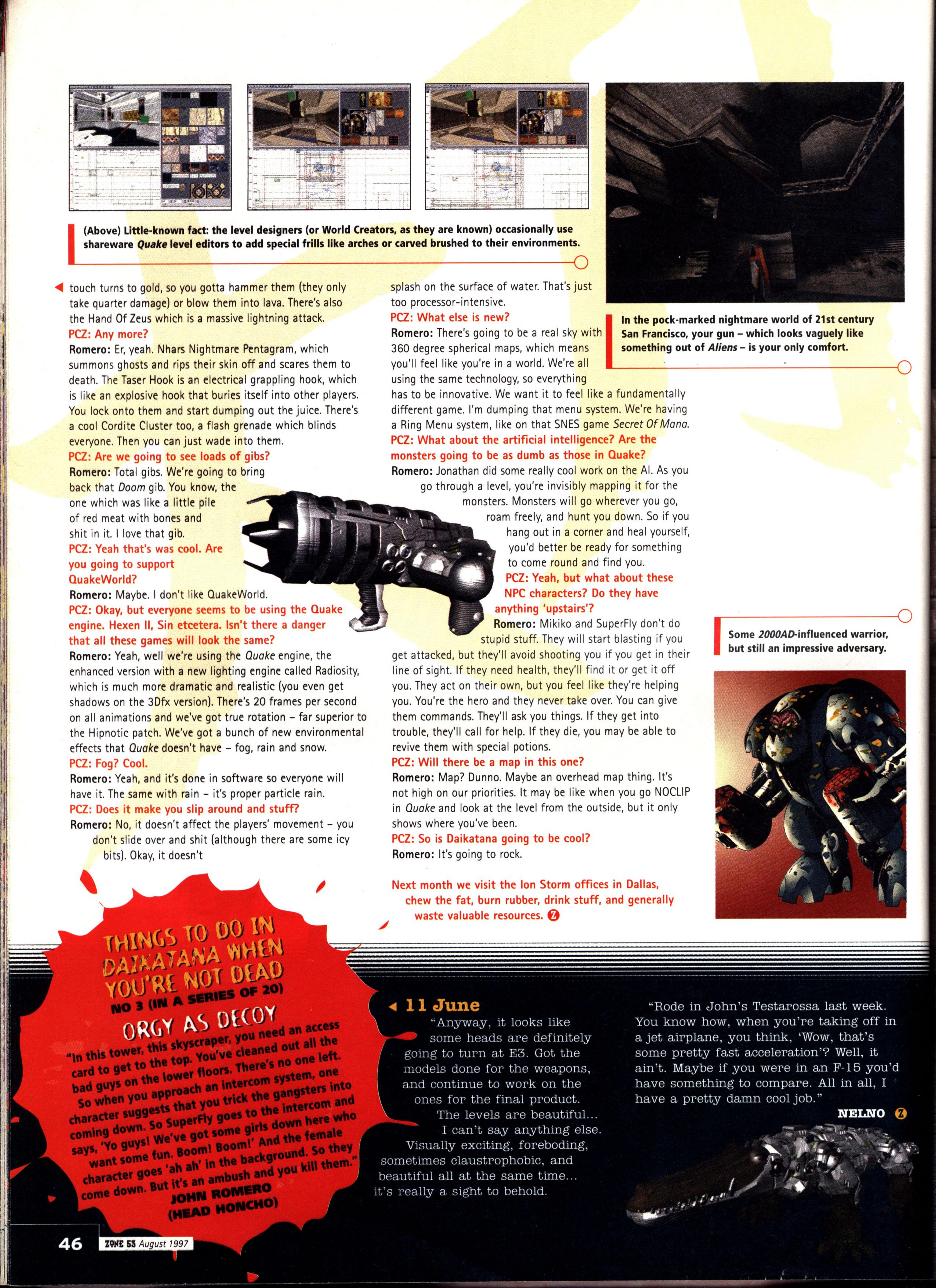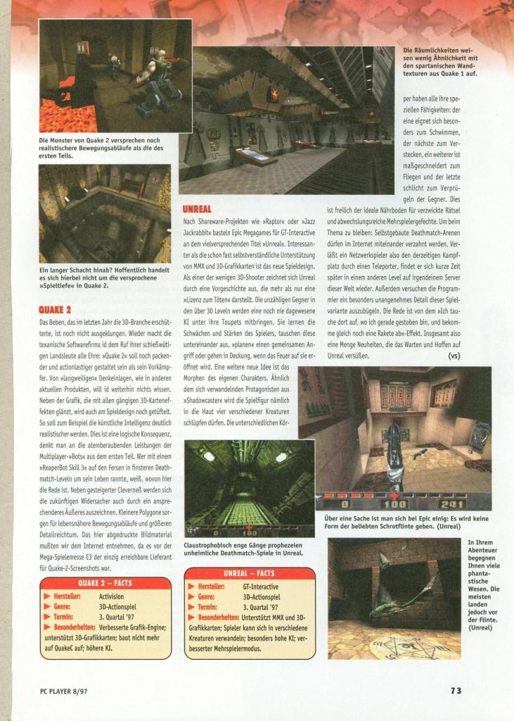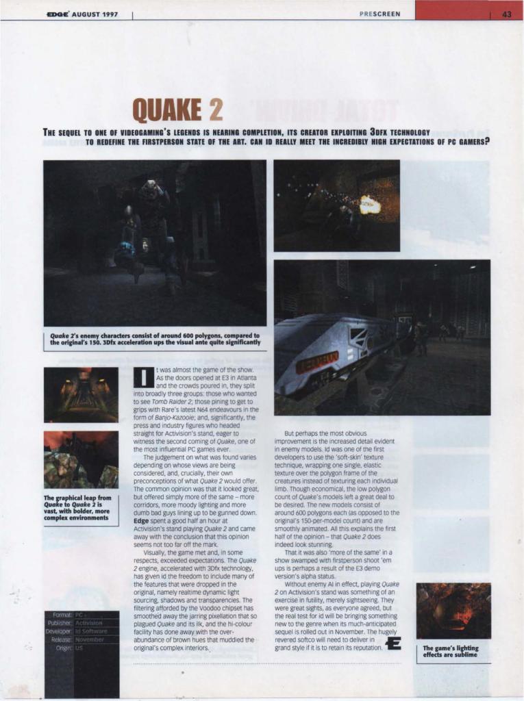 “Few new details about the game were forthcoming, bar a reiteration that Quake II is a complete redesign with nothing carried over from the original game concept except for the Quake Unified Engine (a new version which integrates 3D accelerator support, Windows 95/NT and Internet gameplay all in one bite-sized EXE). So total is the redesign, in fact, that the name ‘Quake‘ may even be dropped.”