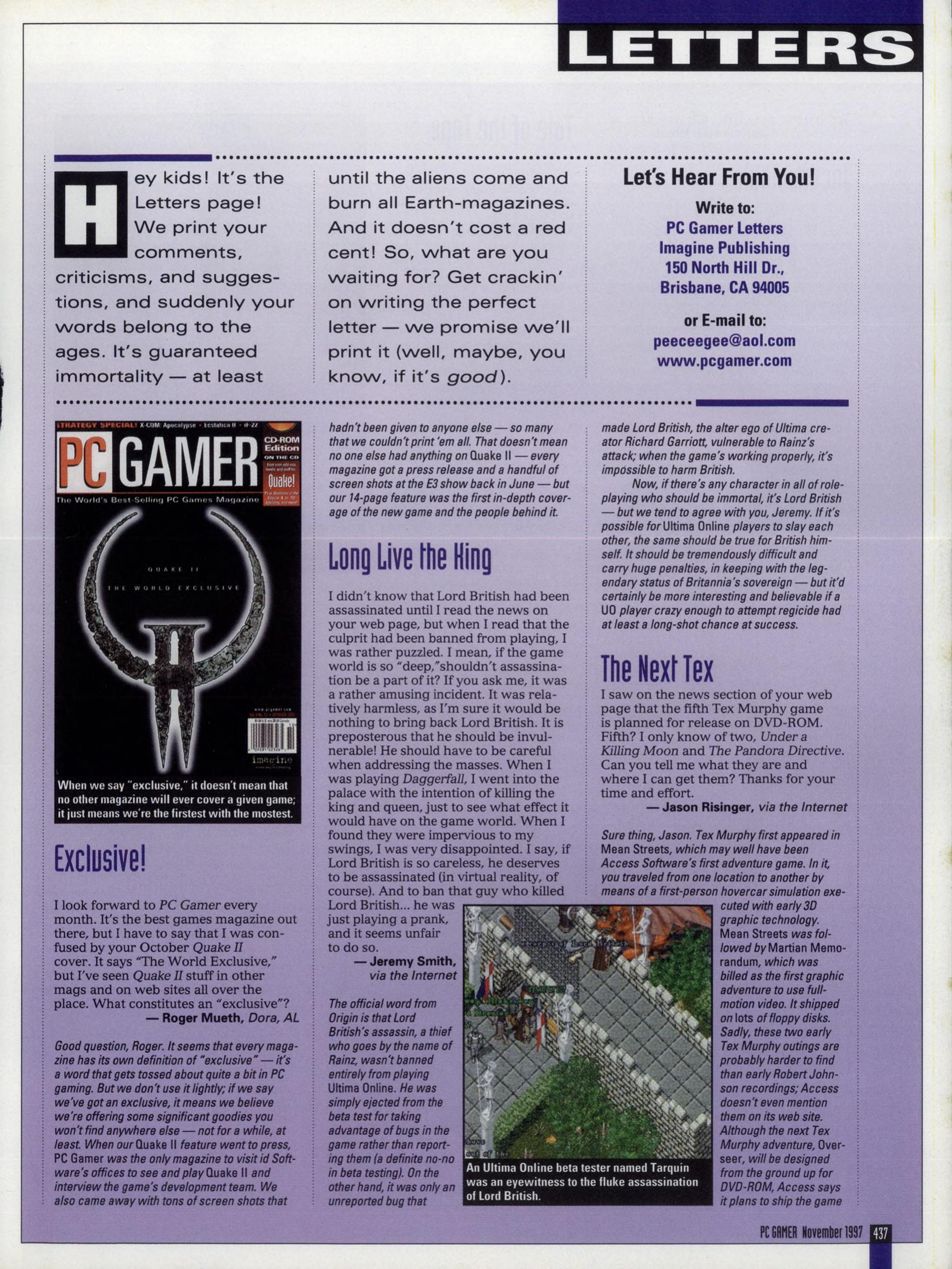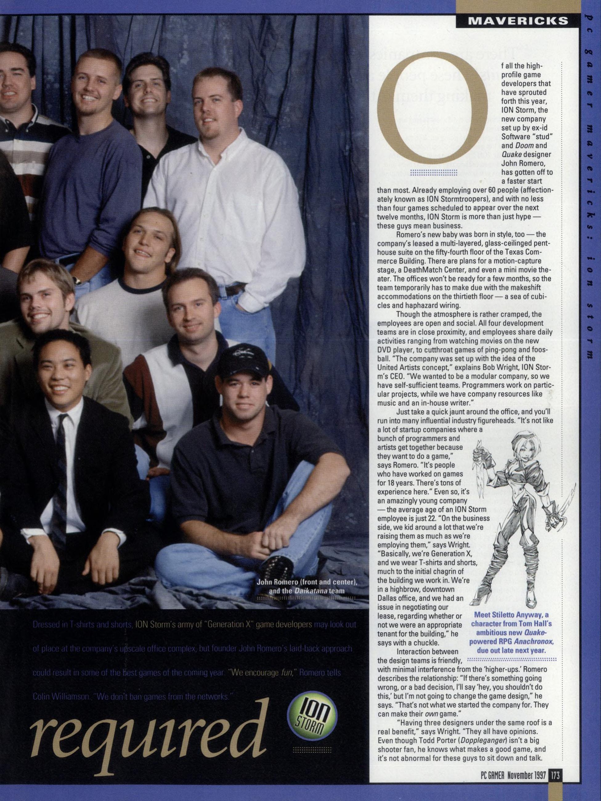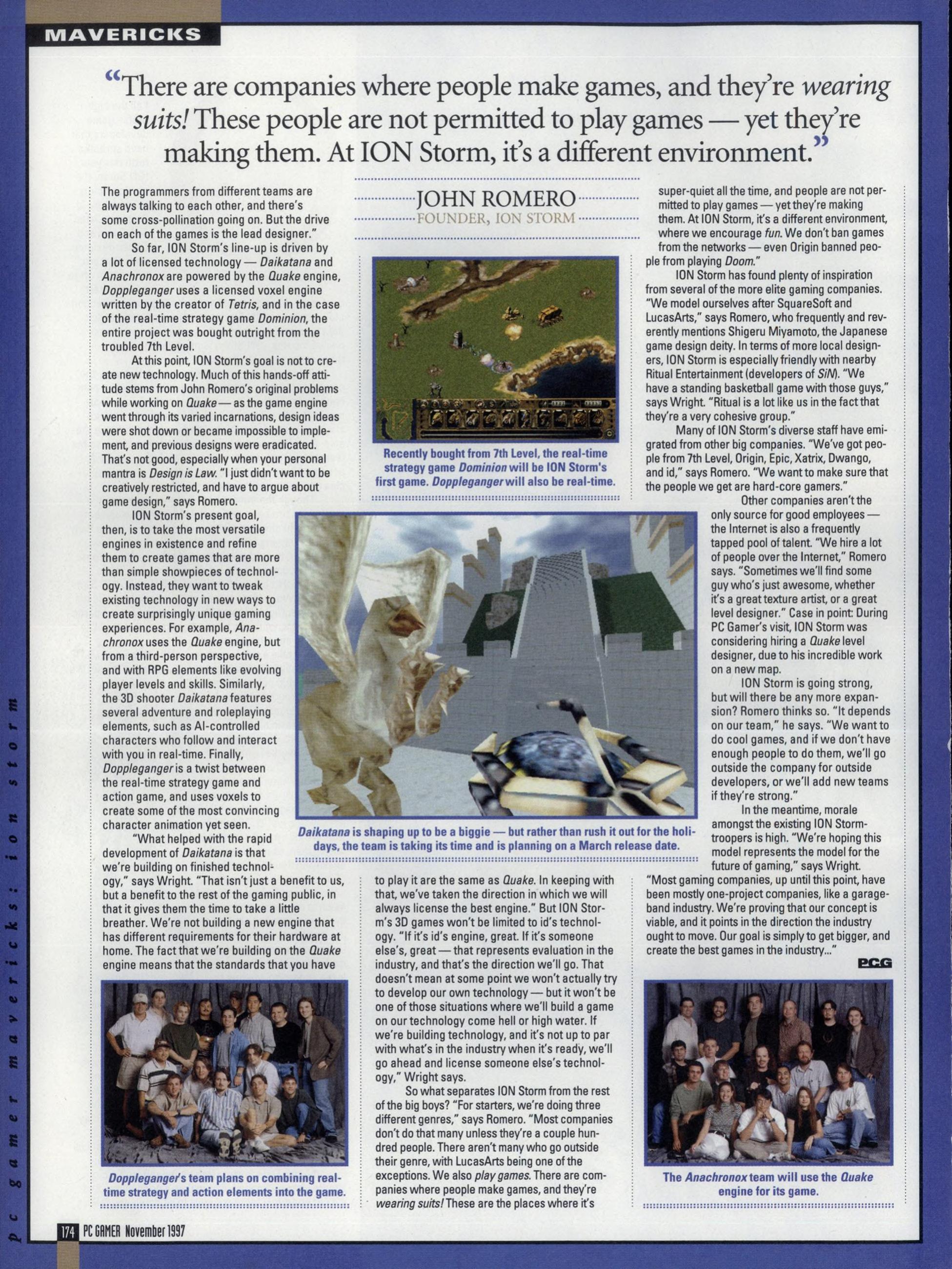 “Not very long ago, a choice set of PC Zone envoys travelled to sunny Texas, redneck capital of the cosmos. There we ate plate after plate of Tex-Mex cuisine and breadcrumbed goujons and drank the cats’ urine that they call ‘beer’. We also visited the office of iD Software, a curious black obelisk like something out of 2001, which is on a freeway 20 minutes outside of Dallas.”