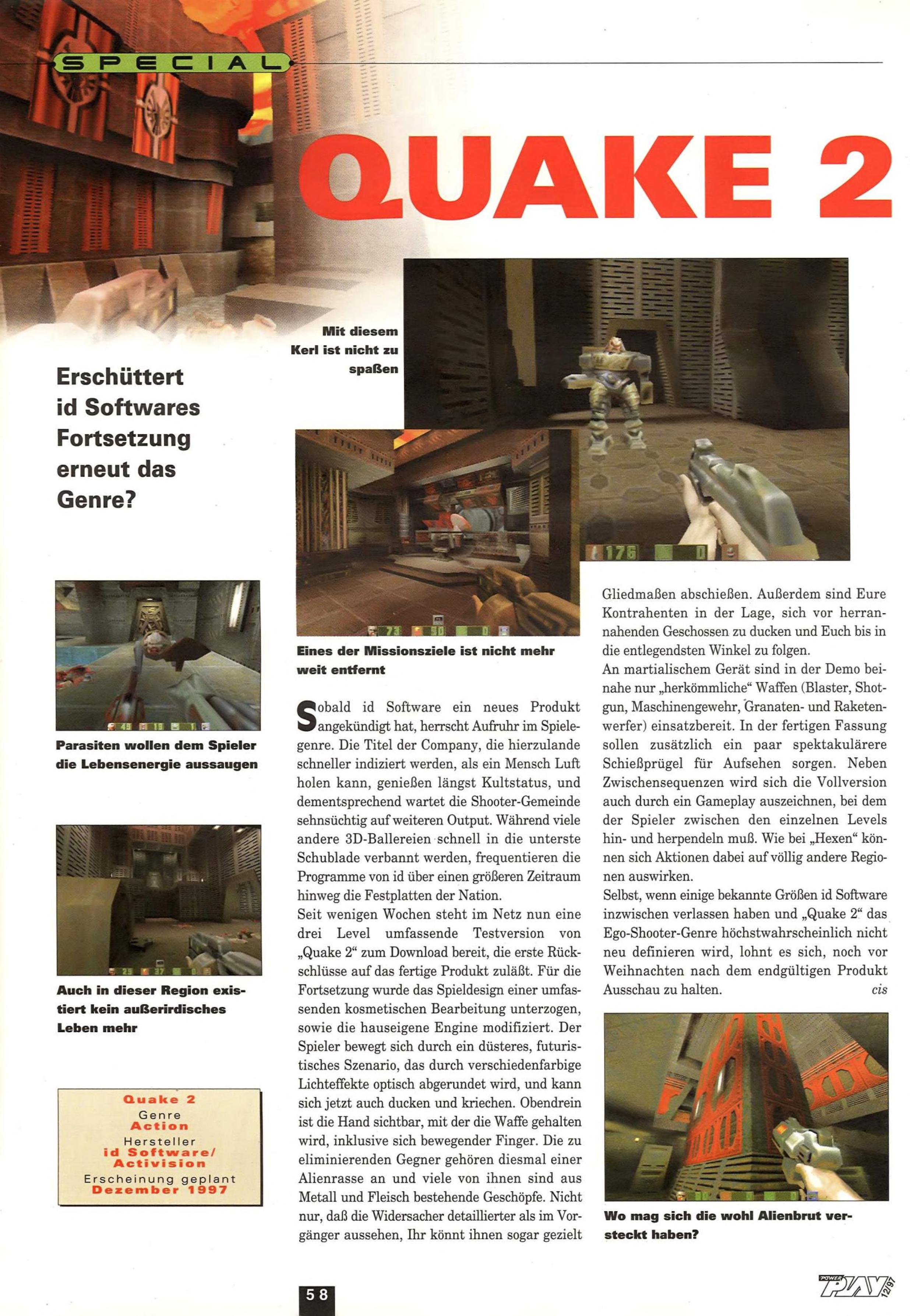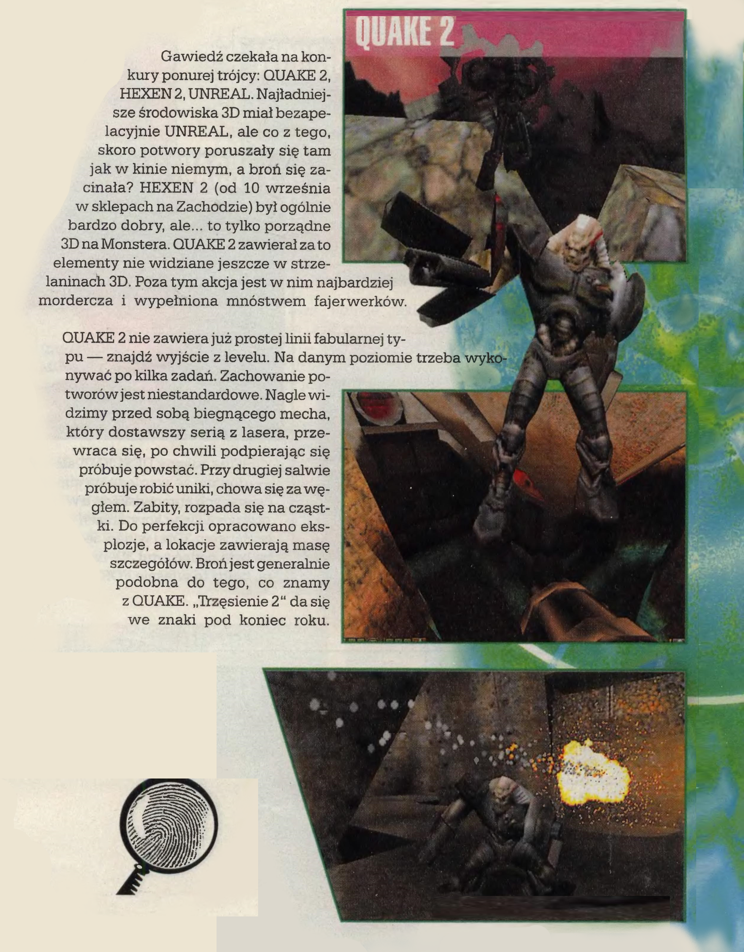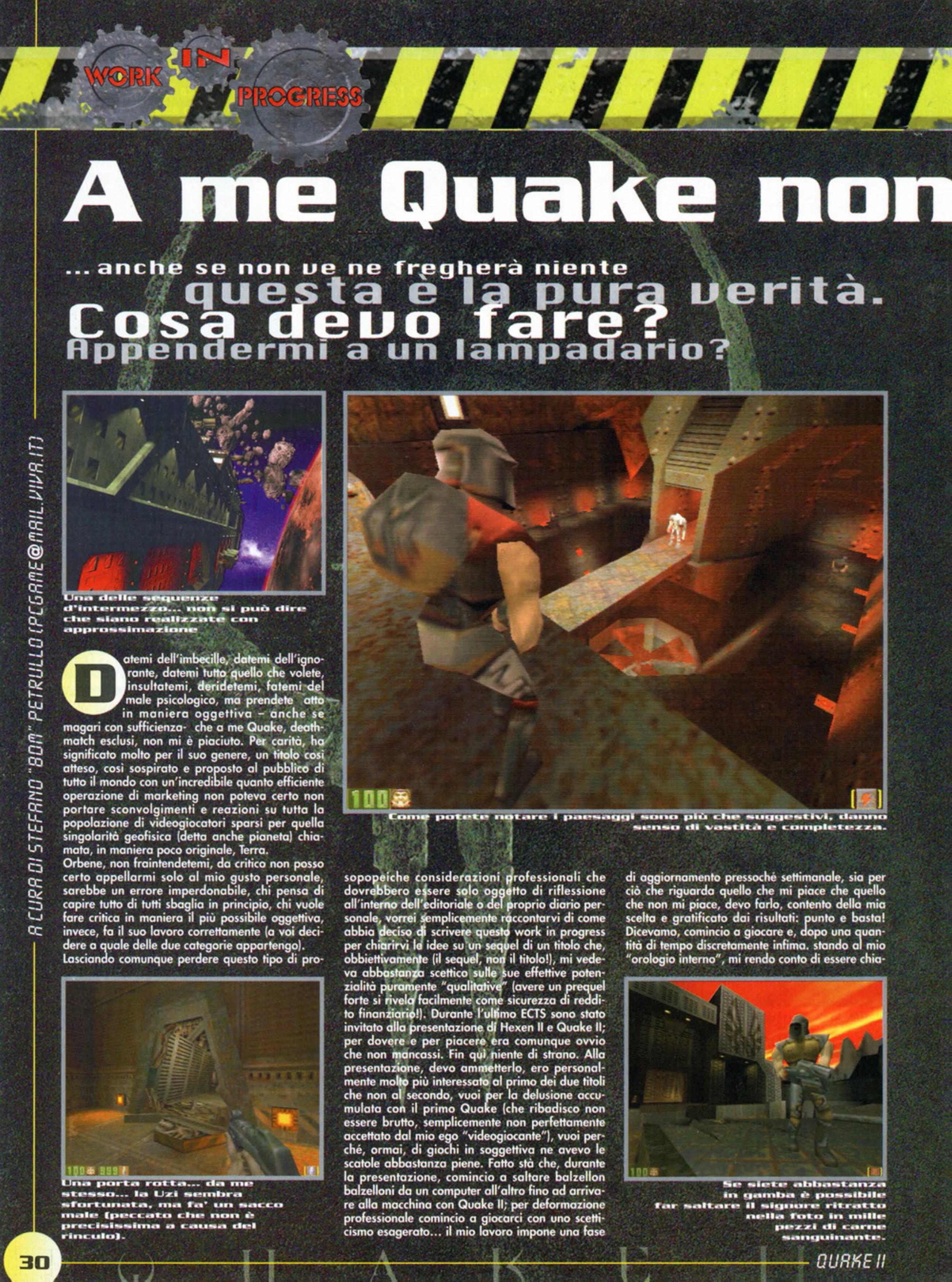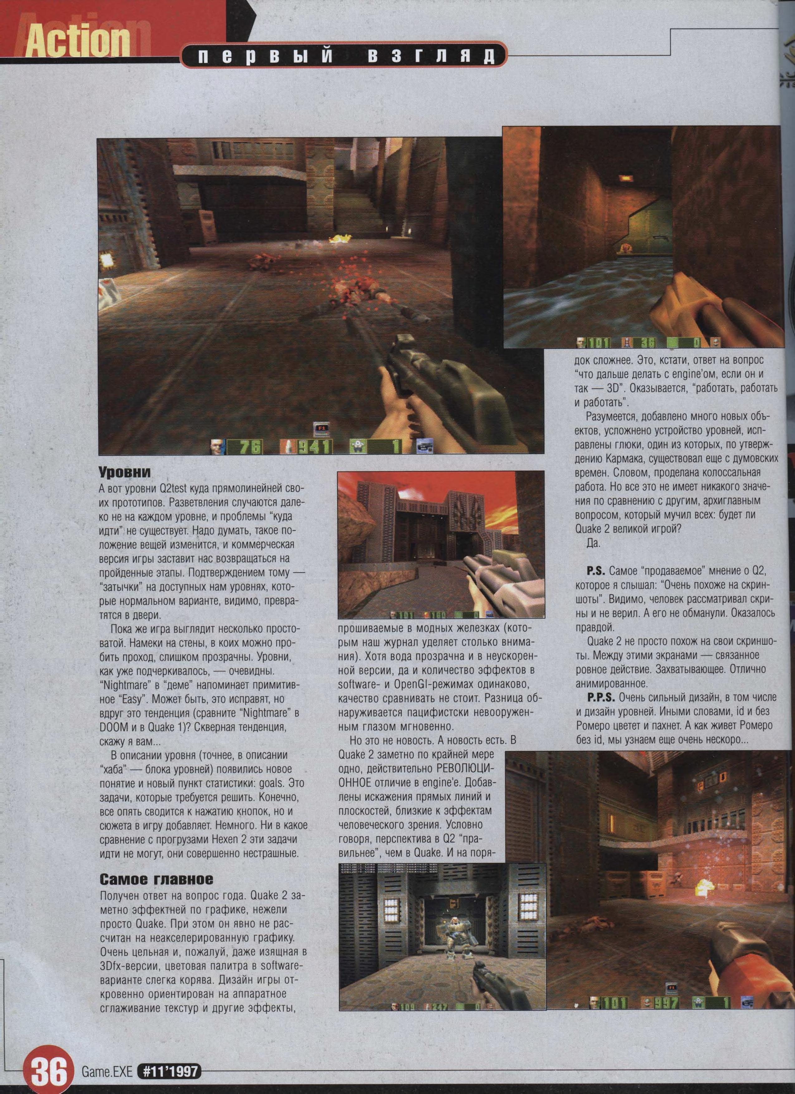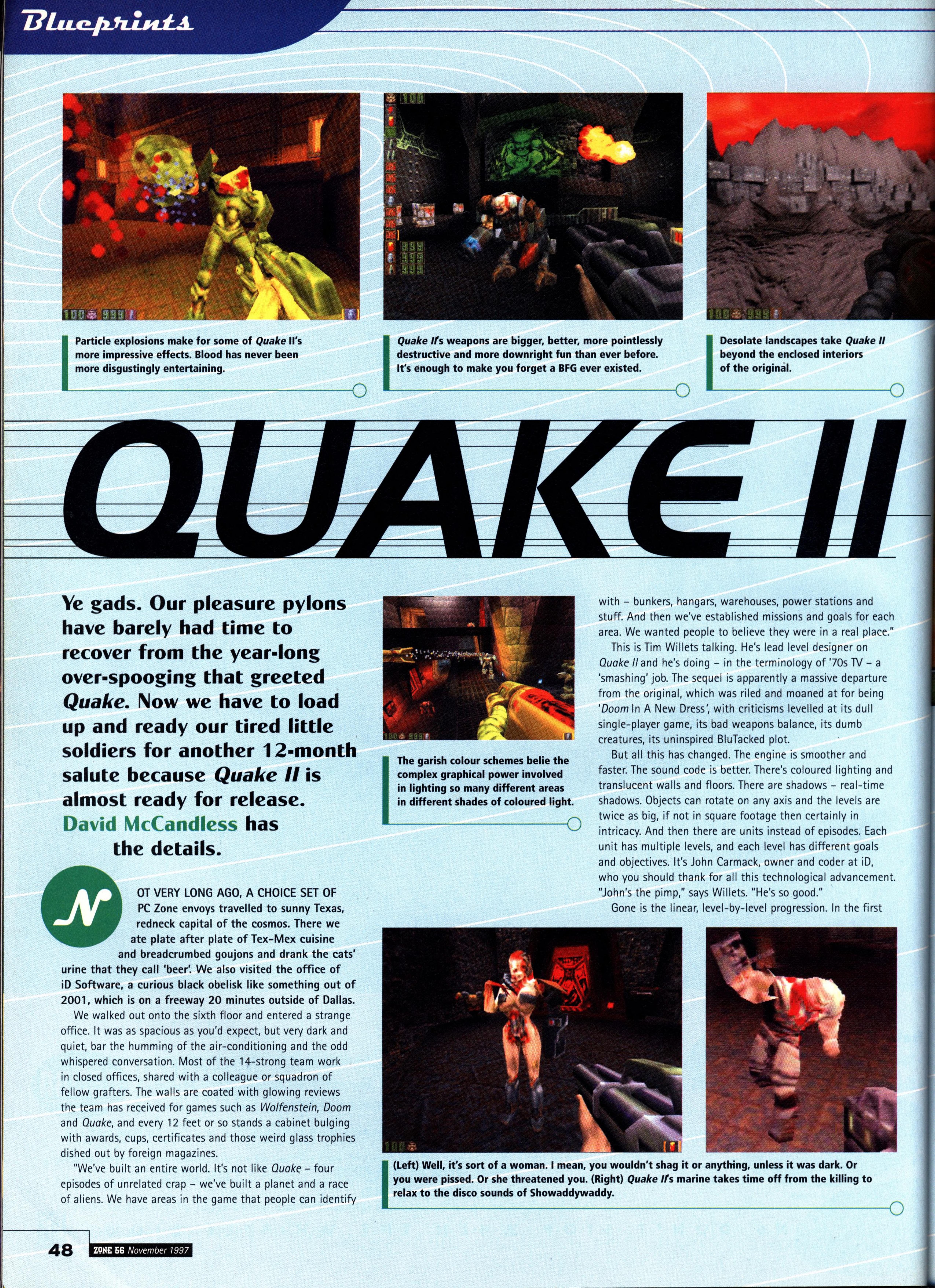 “This is Tim Willets [editorial note — it’s Mr. Tim Willits, to anybody who spells the last name wrong,] talking. He’s lead level designer on Quake II and he’s doing — in the terminology of ’70s TV — a ‘smashing’ job. The sequel is apparently a massive departure from the original, which was riled and moaned at for being ‘Doom In A New Dress’, with criticisms levelled at its dull single-player game, its bad weapons balance, its dumb creatures, its uninspired BluTacked plot.”