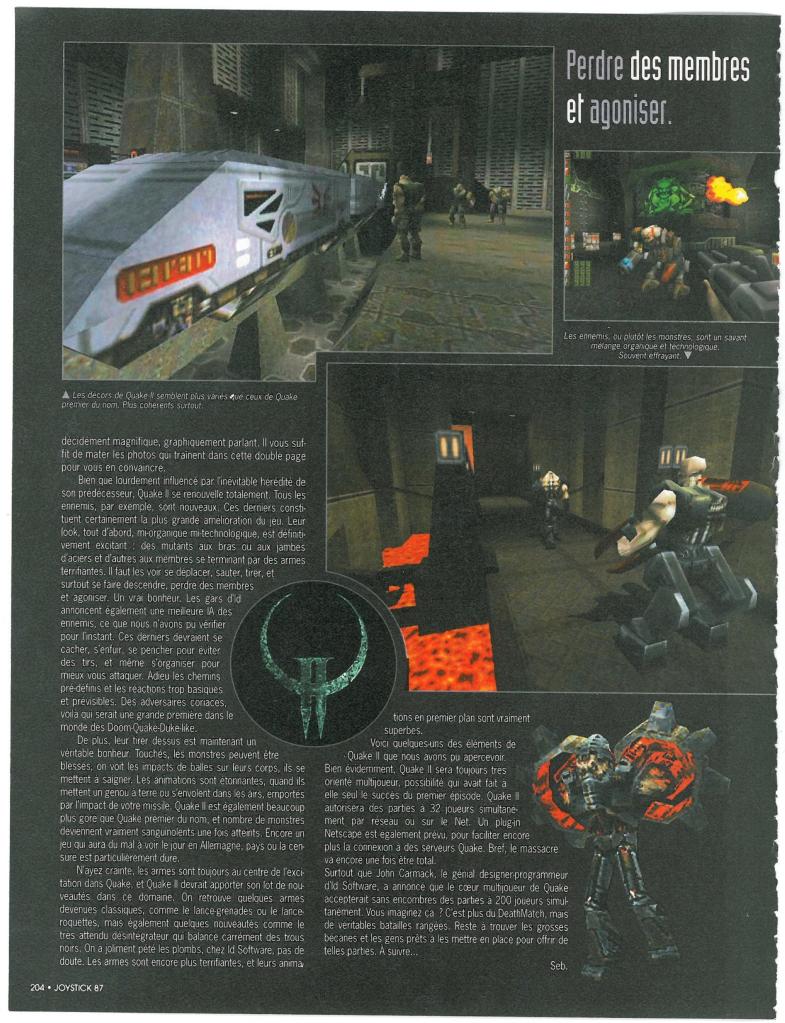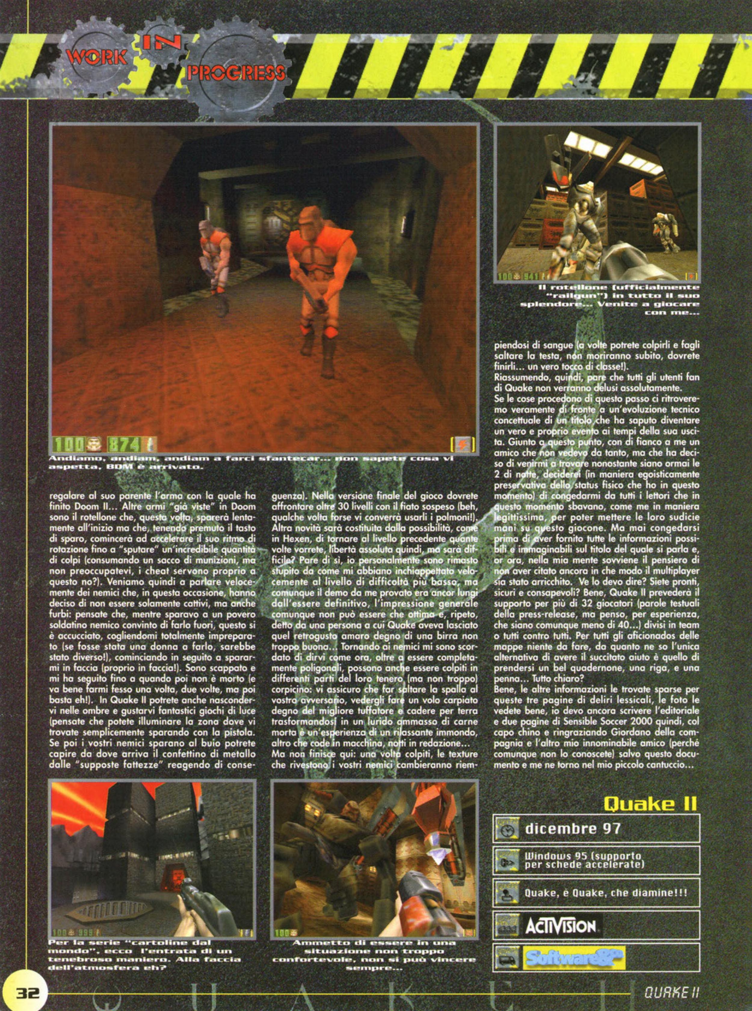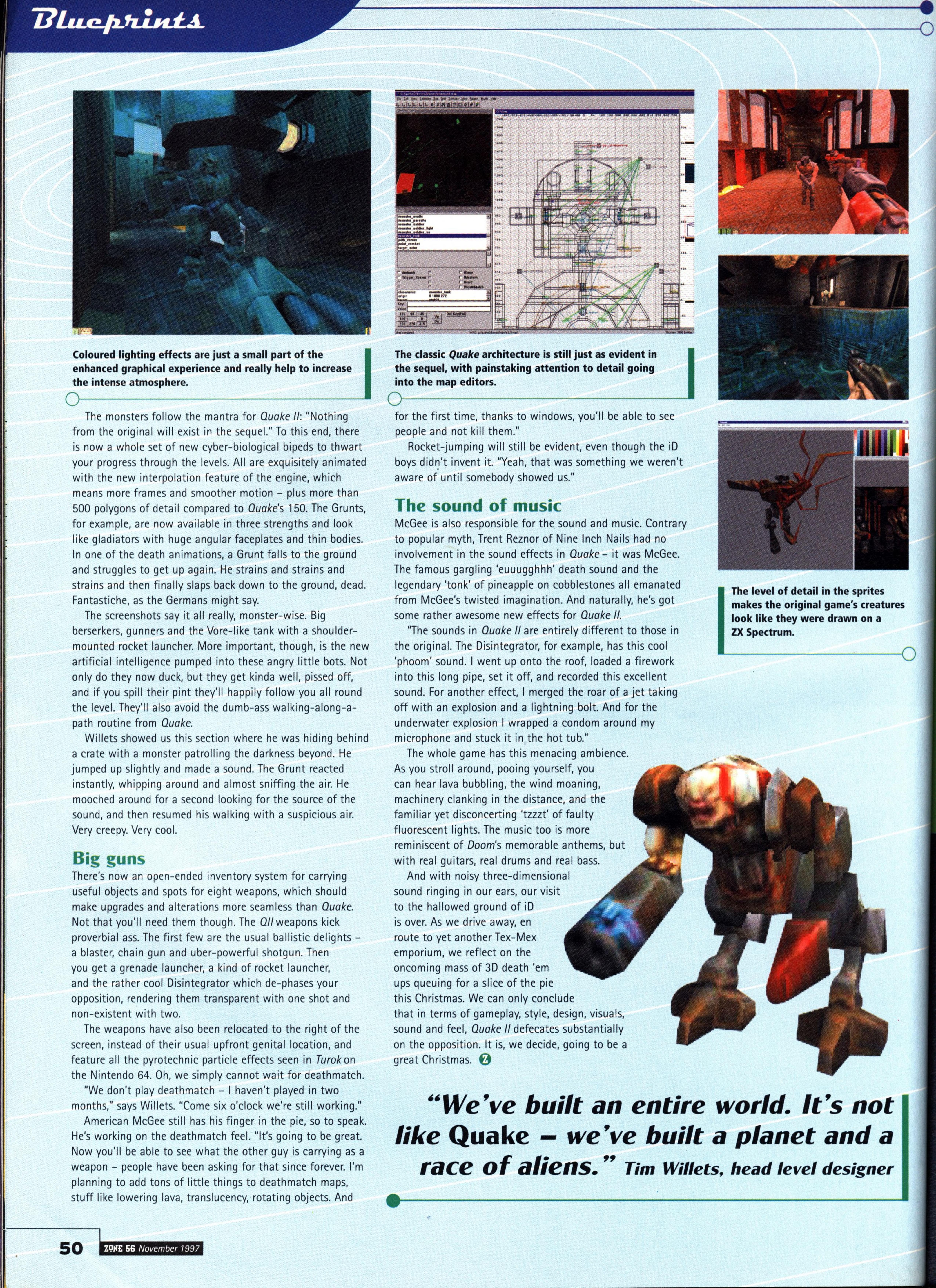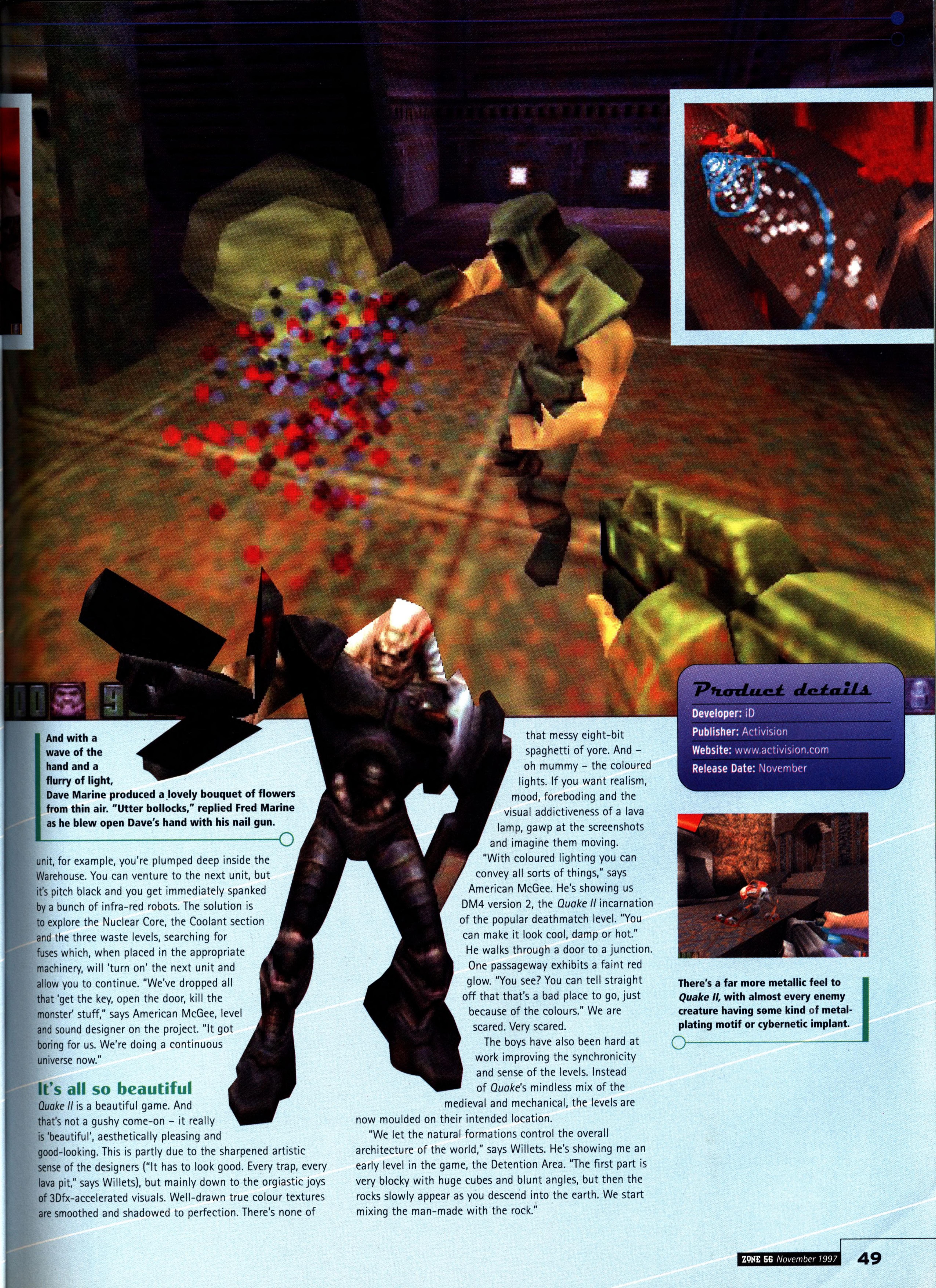 “But all this has changed. The engine is smoother and faster. The sound code is better. There’s coloured lighting and translucent walls and floors. There are shadows — real-time shadows. Objects can rotate on any axis and the levels are twice as big, if not in square footage then certainly in intricacy. And then there are units instead of episodes. Each unit has multiple levels, and each level has different goals and objectives. It’s John Carmack, owner and coder at iD, who you should thank for all this technological advancement. ‘John’s the pimp,’ says Willets. ‘He’s so good.'”